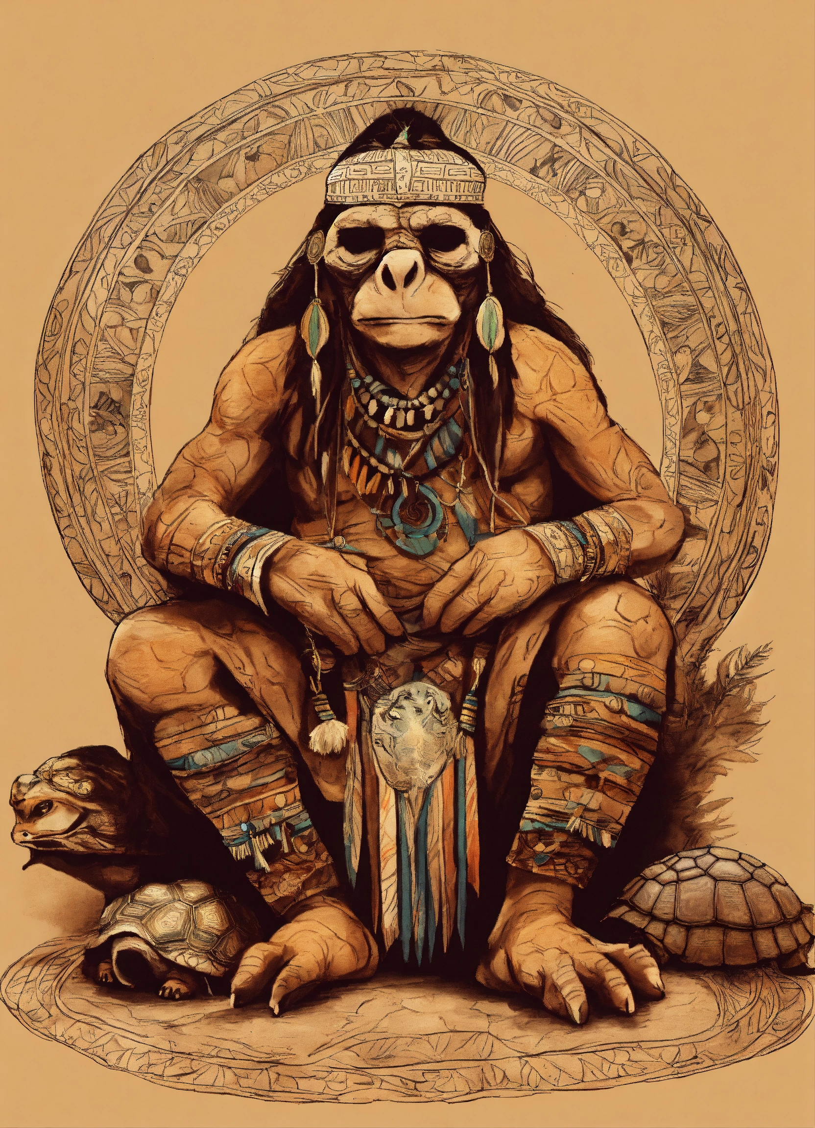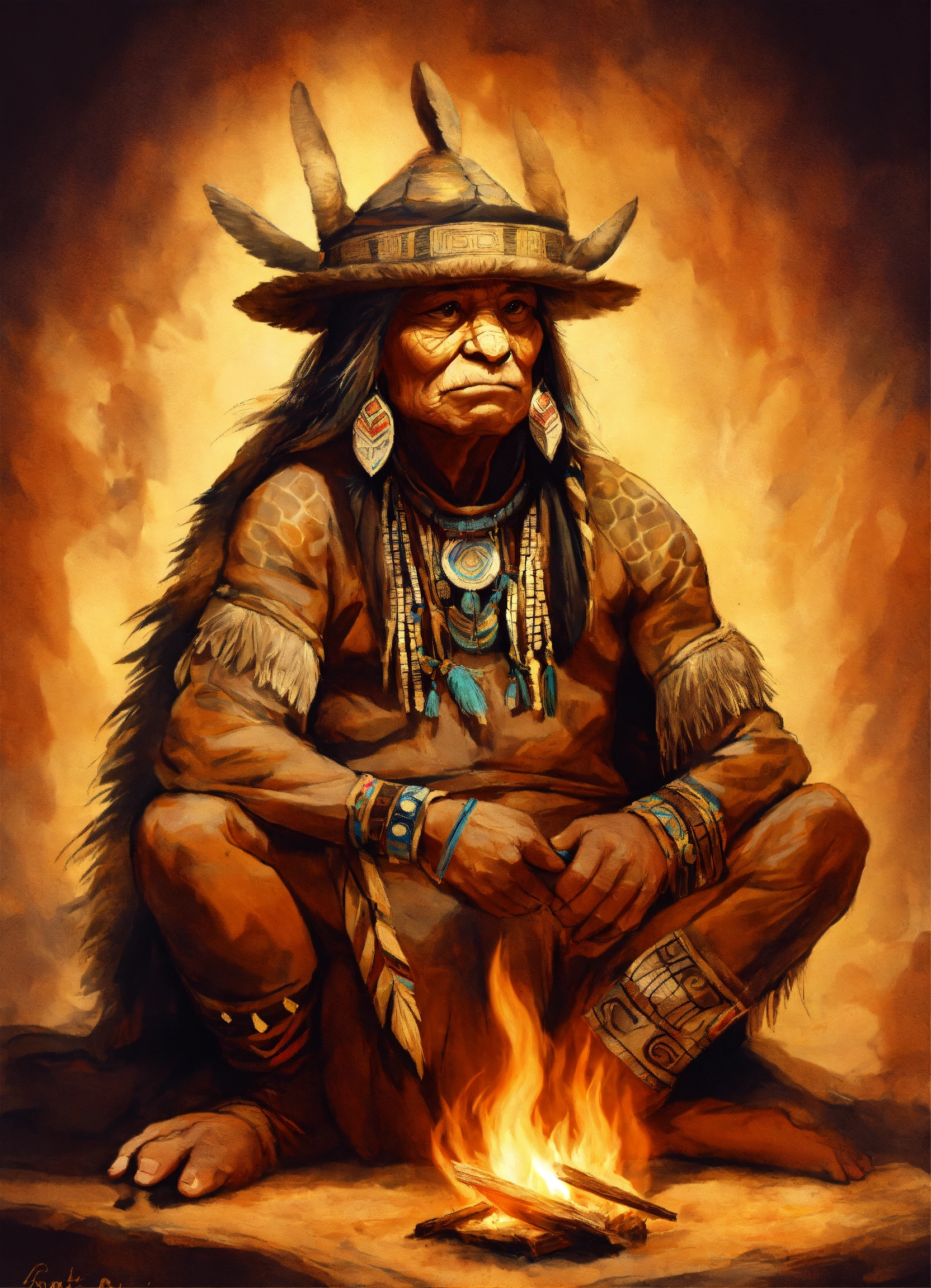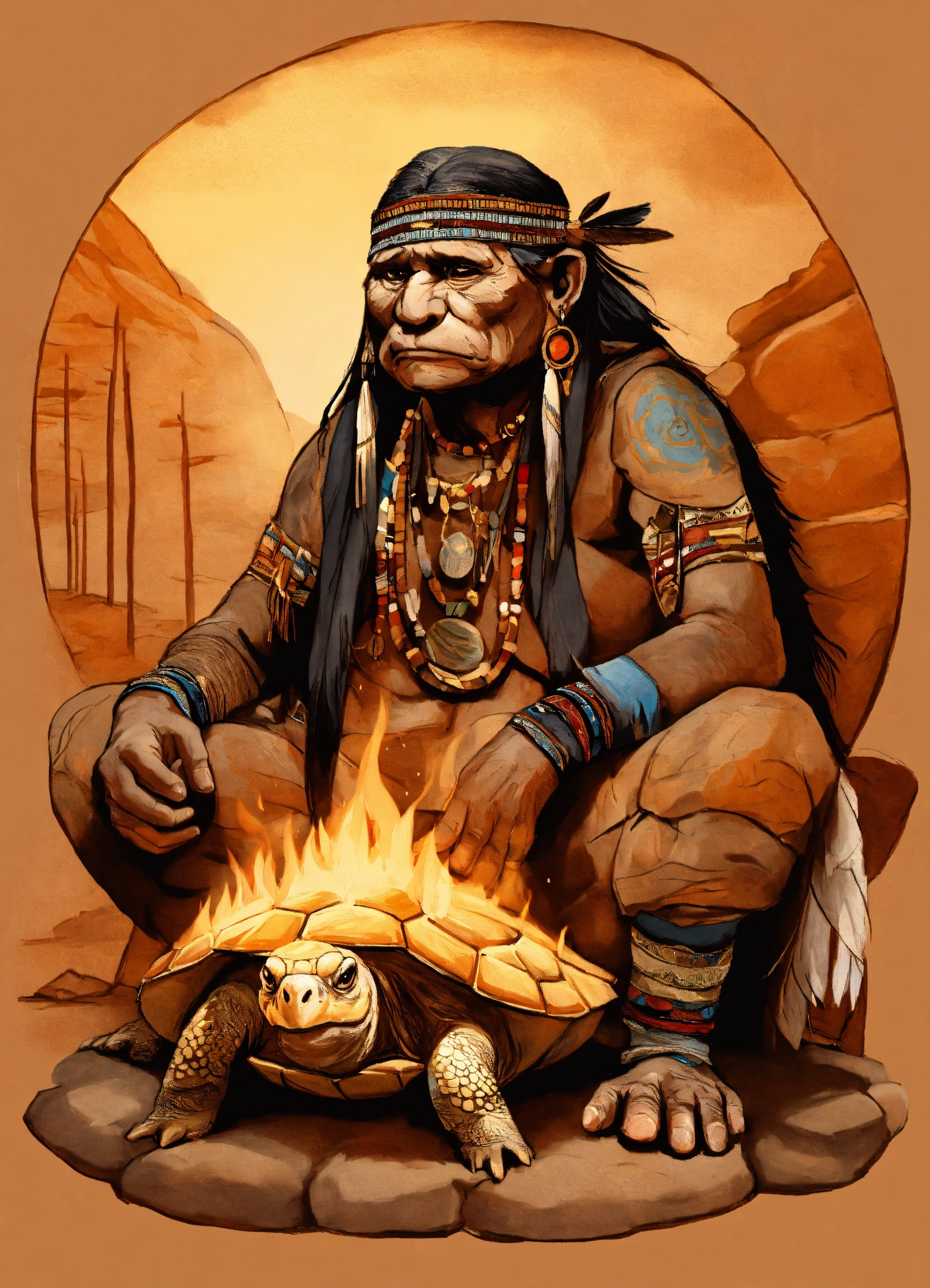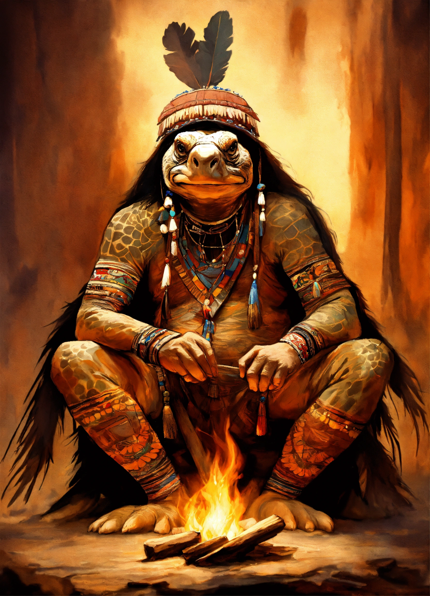 An old tortoise shaman, animal, sitting by the fire, beautiful drawing, native american style drawing, wise