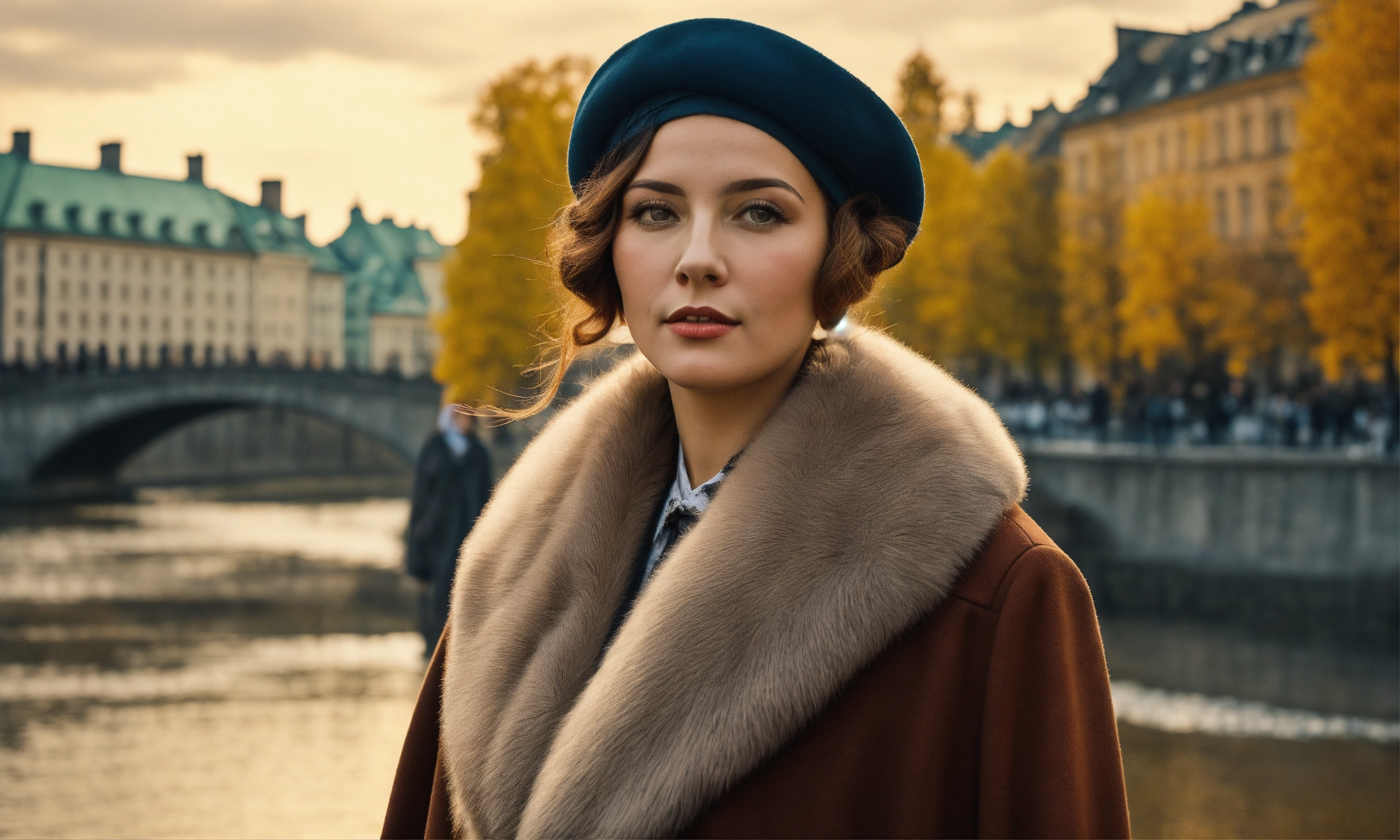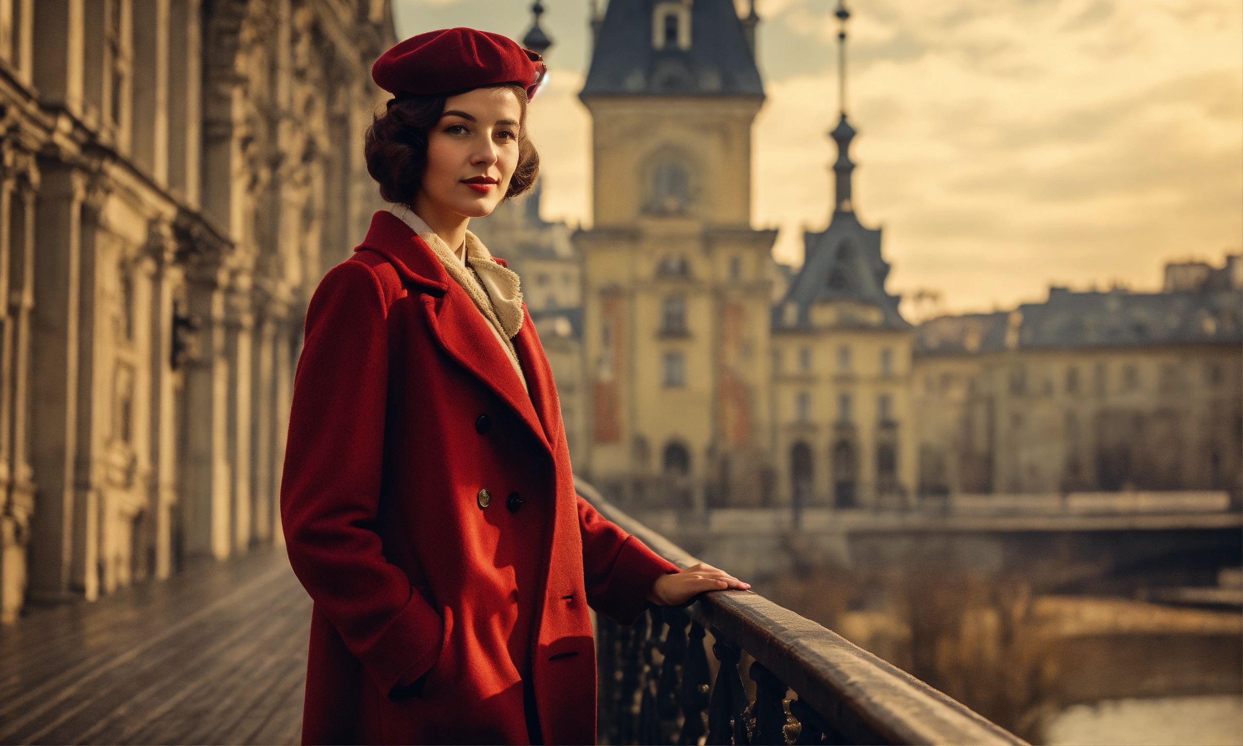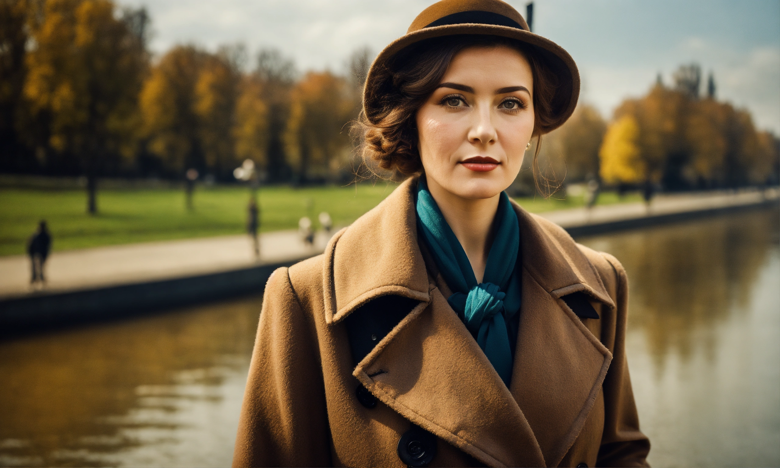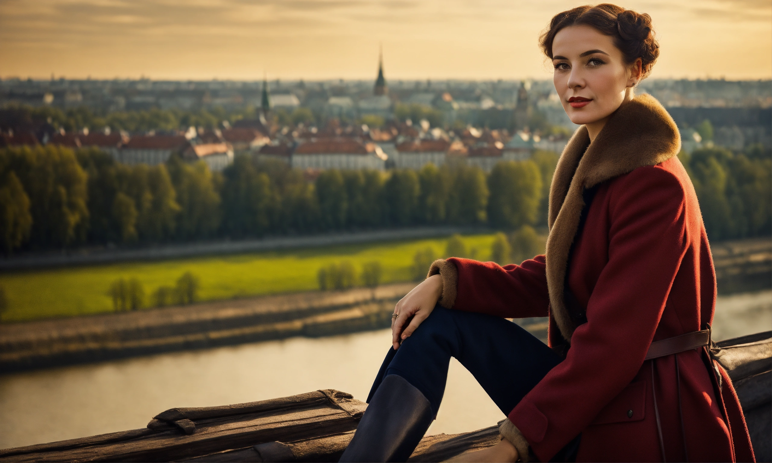 Retro warszawa 1920-1930, сute europian woman, on top of a rievier, looks at the camera at half height, retro style clothing long coat, the woman exudes kindness, calmness and ambition. she has a beard.