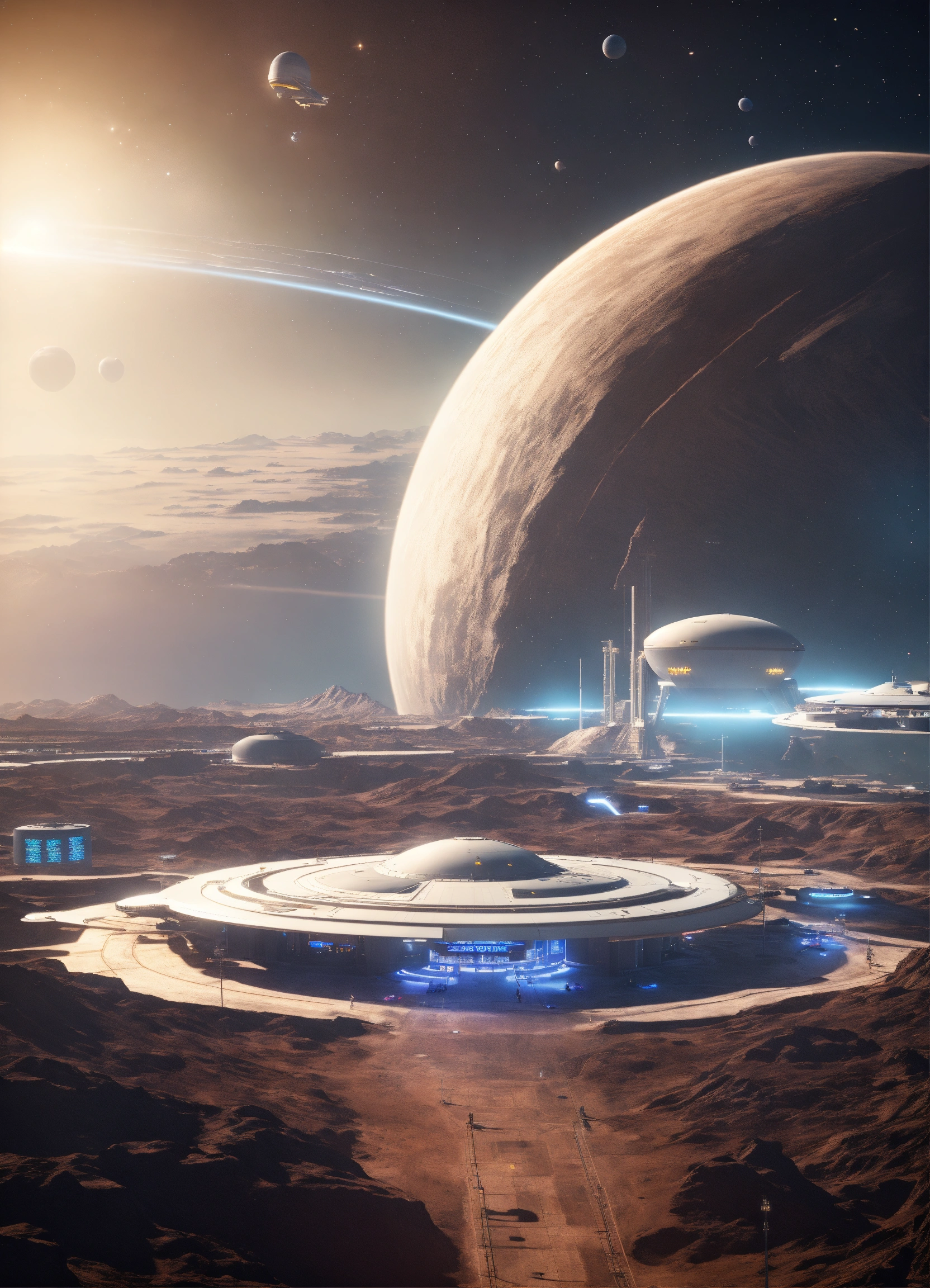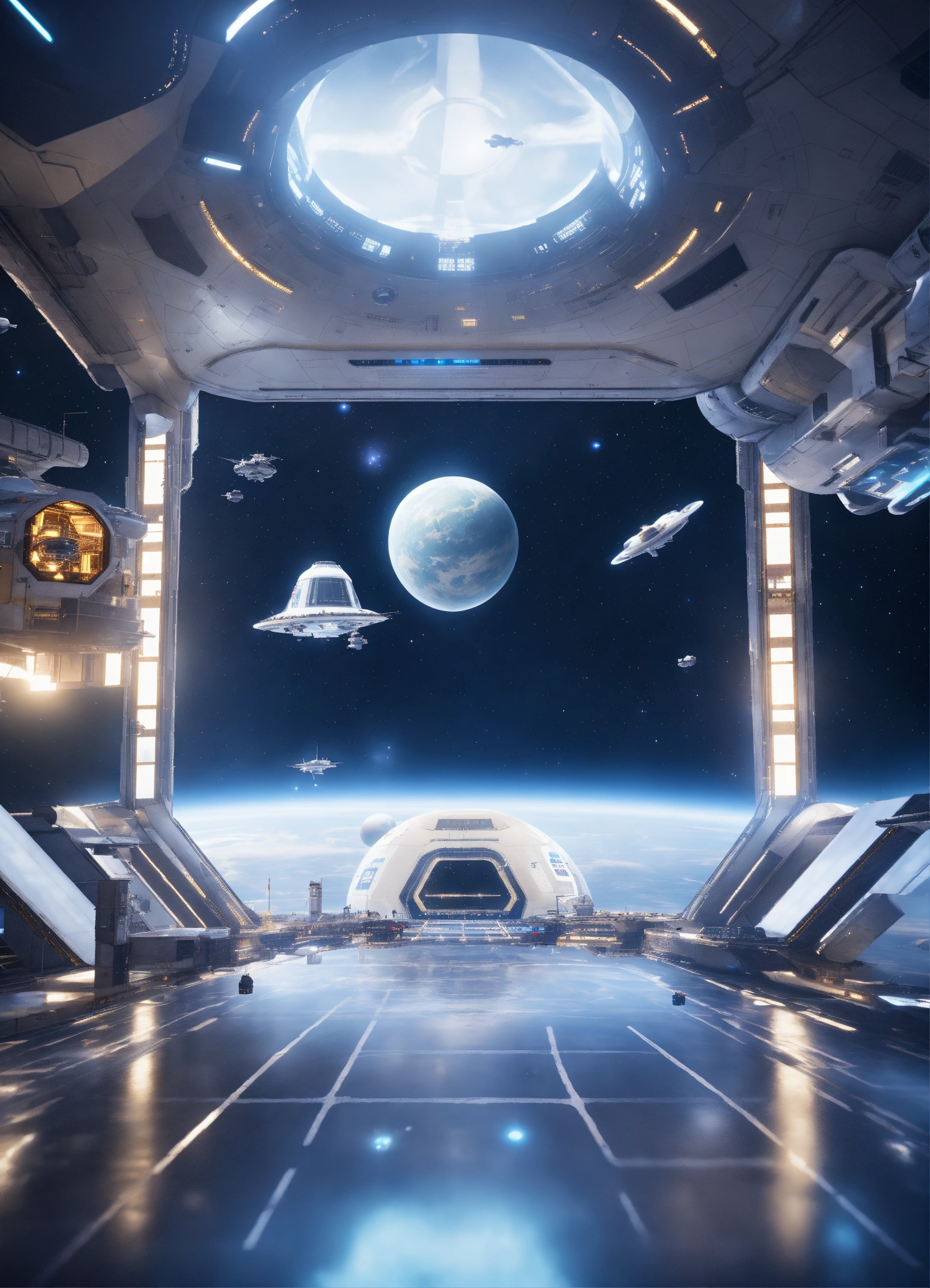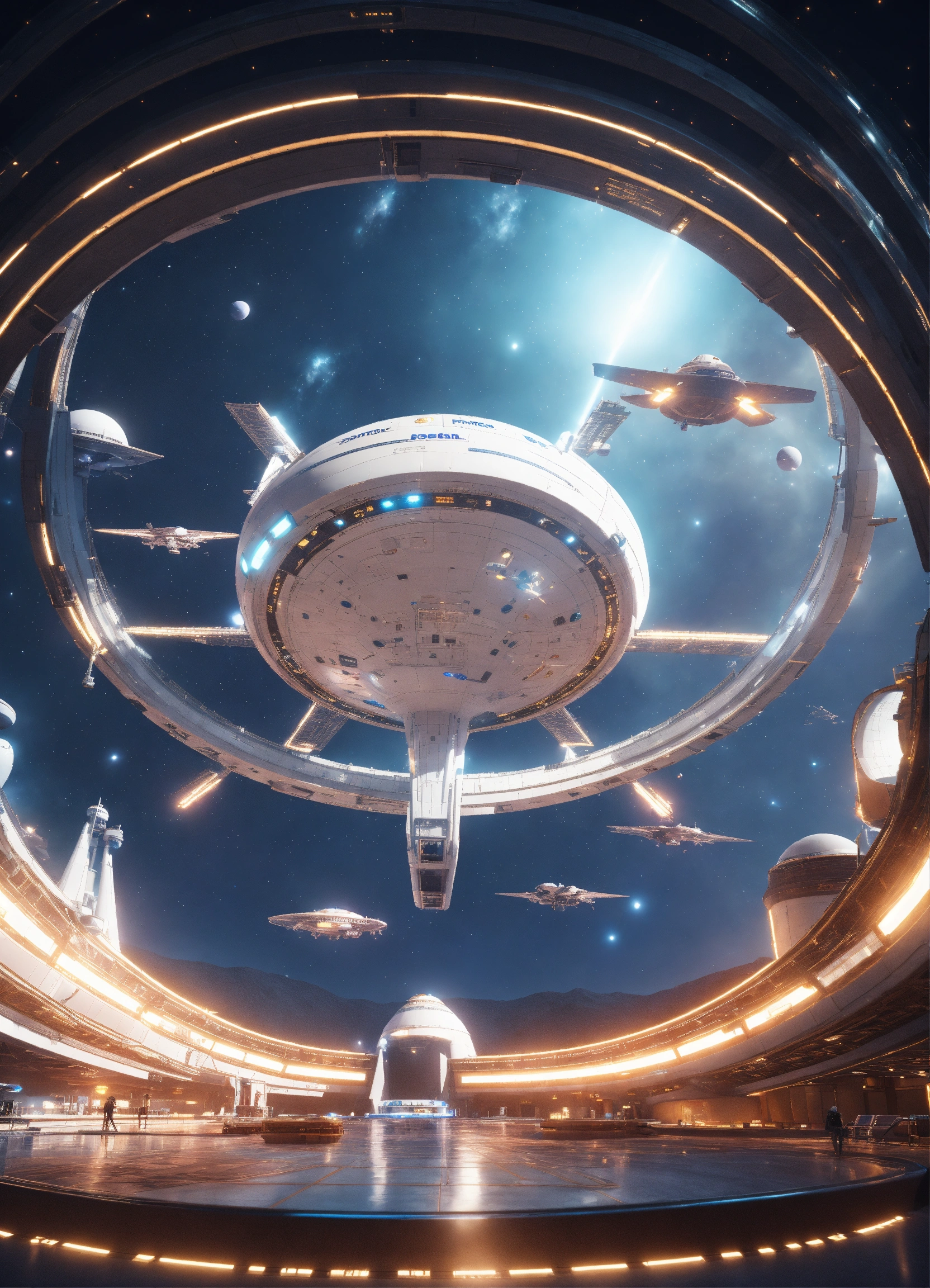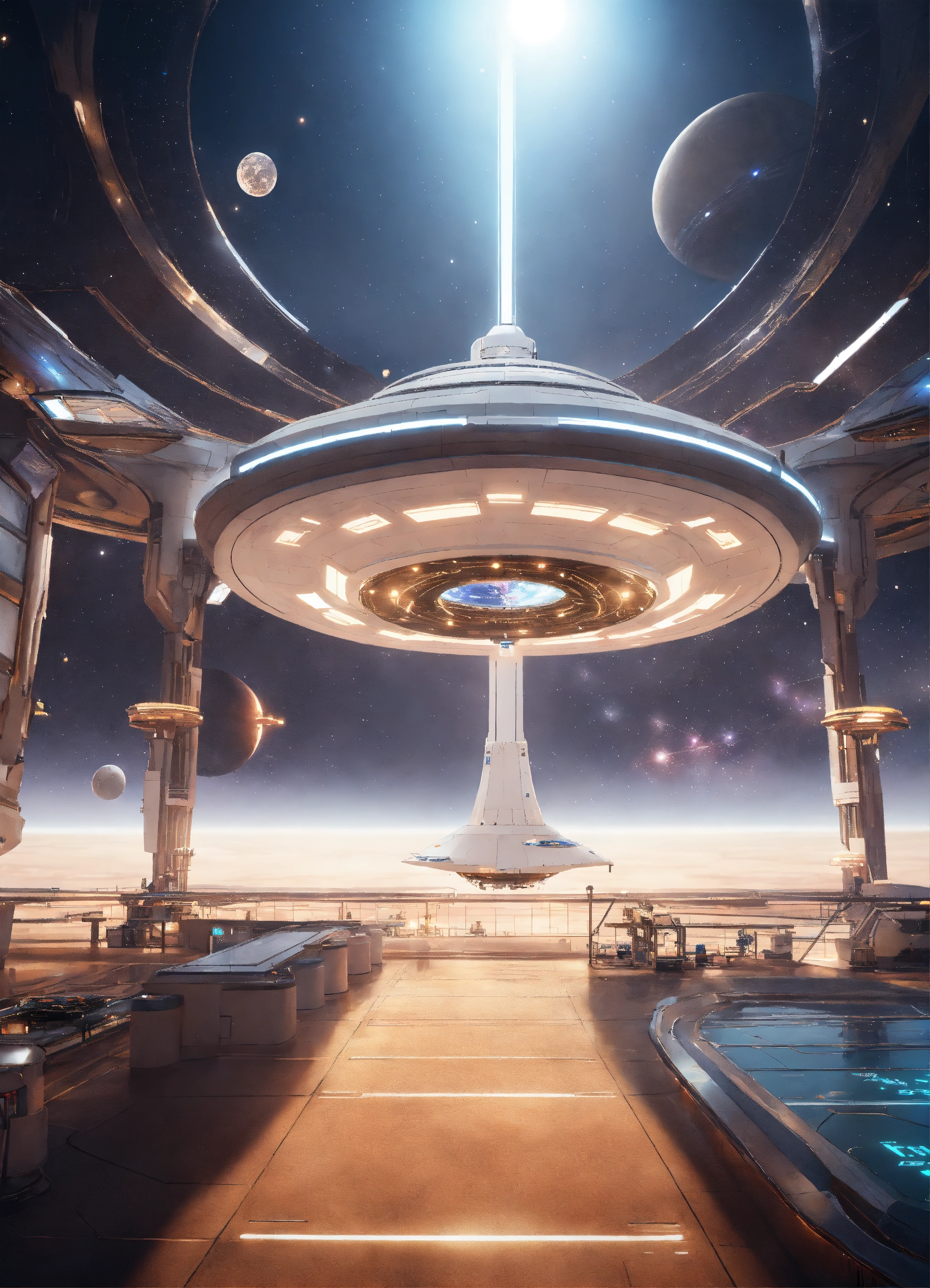 Beautiful white spaceport flying floating in deep space, artificial star, hotel, casino, intergalactic pit stop, futuristic, sci-fi, 8k, unreal engine, pixar