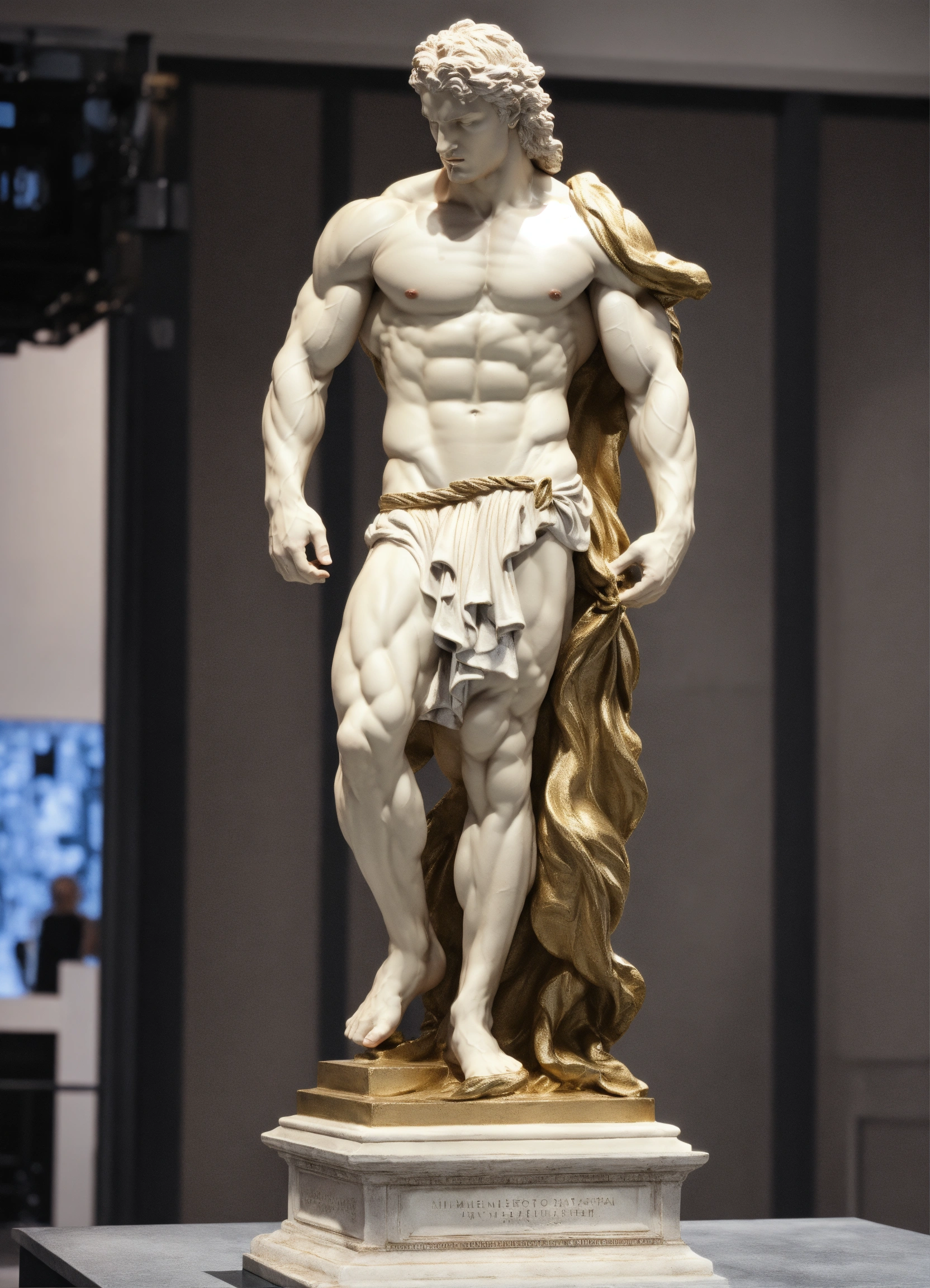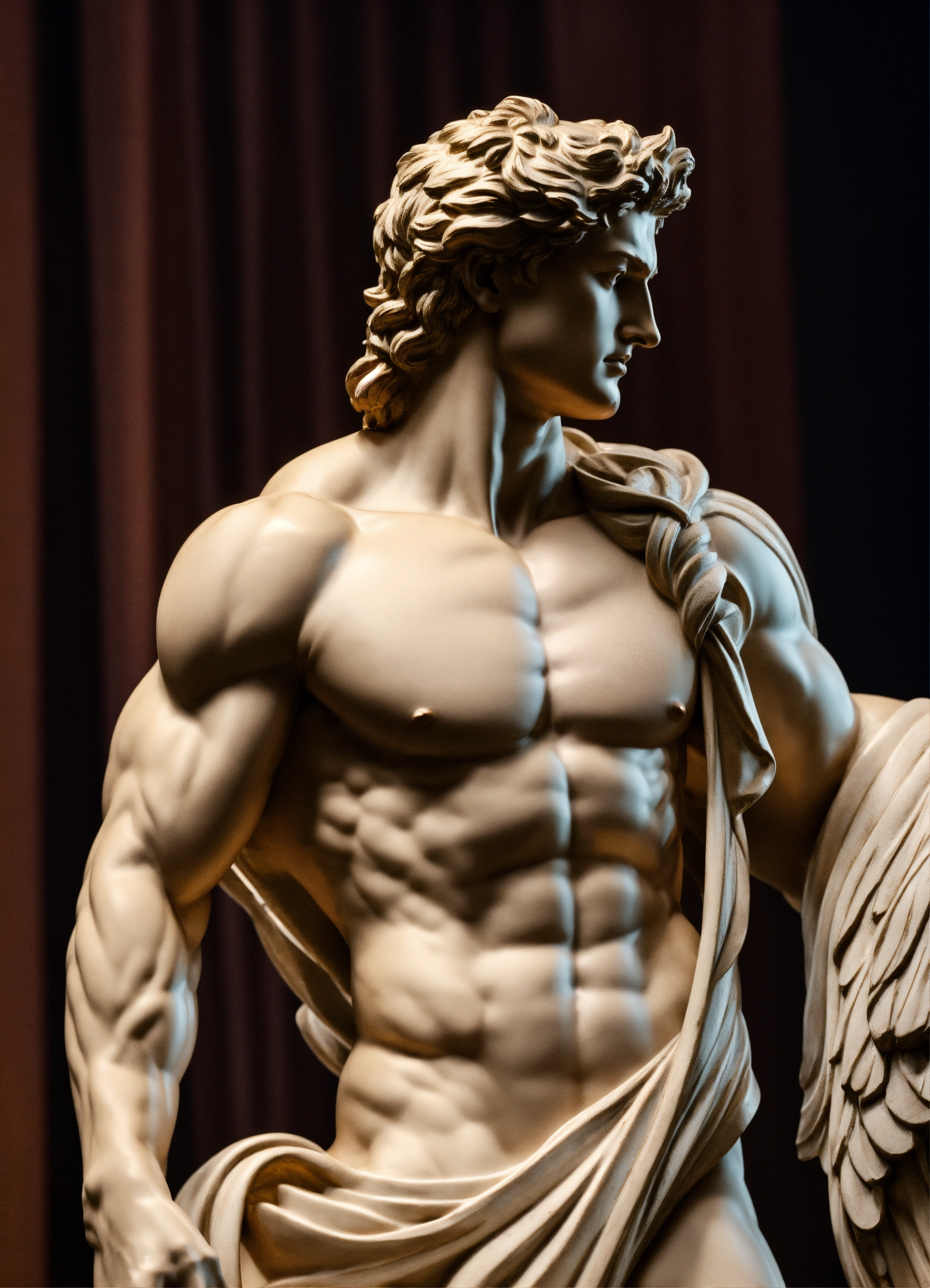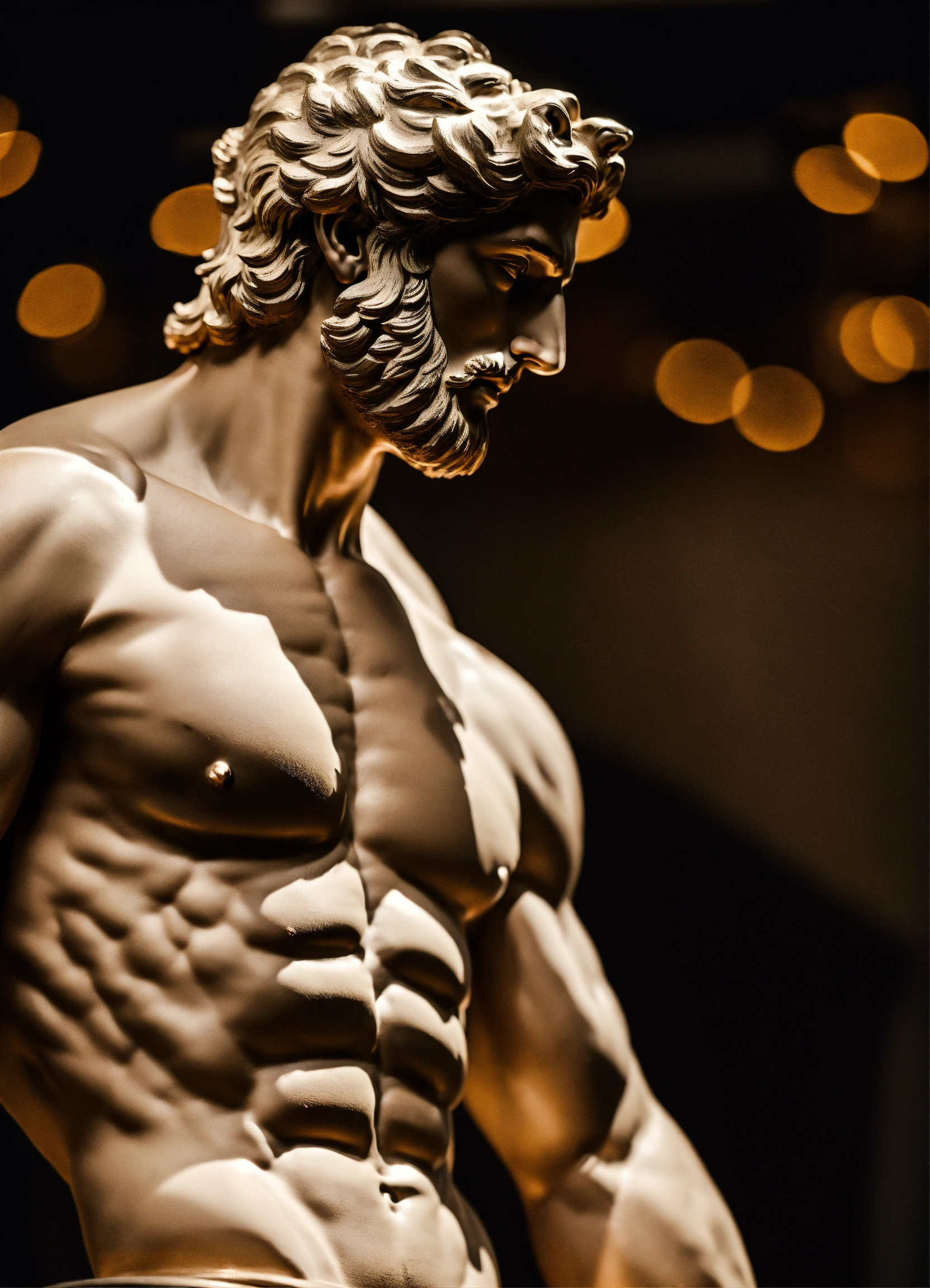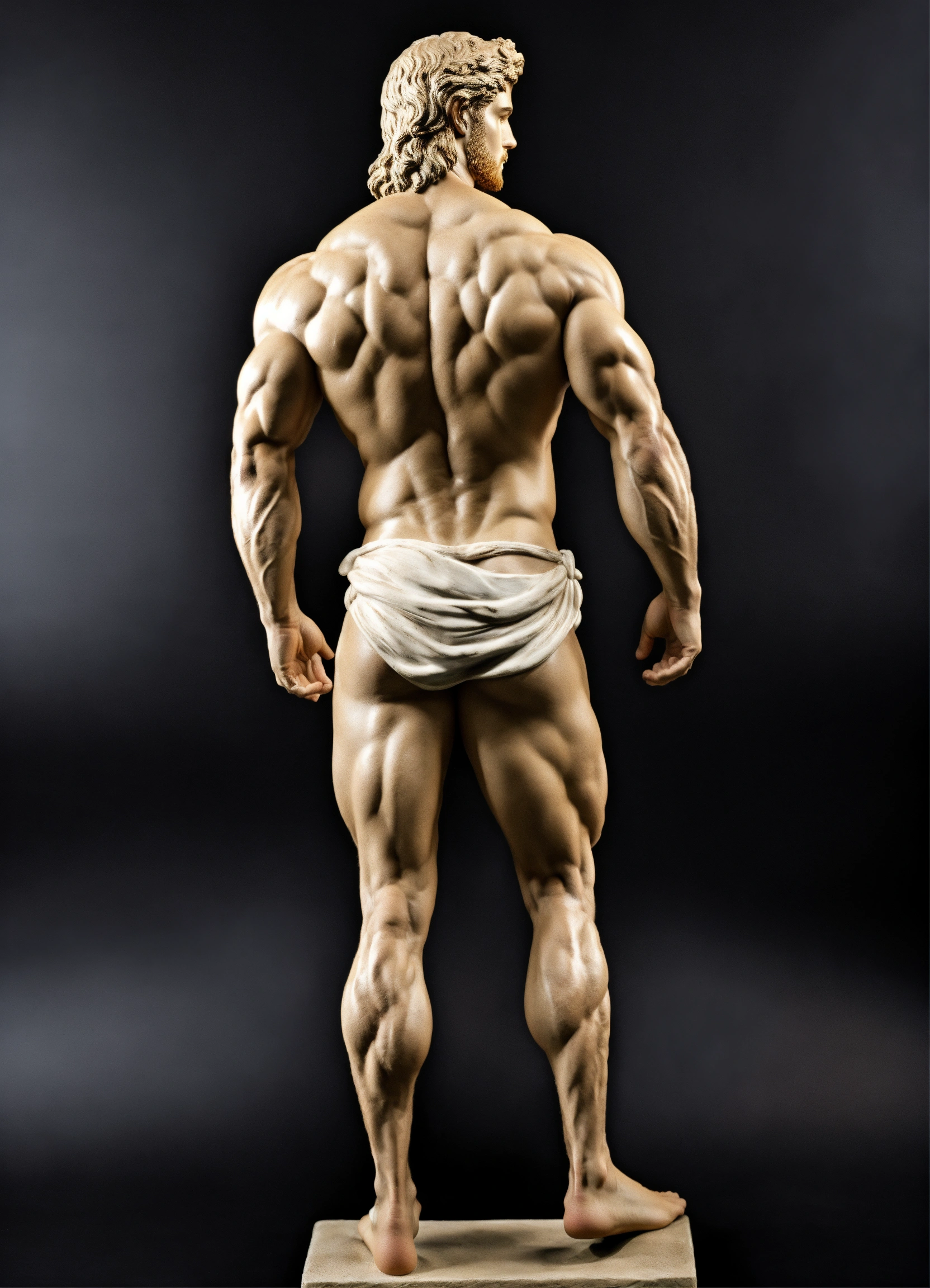 Modern muscular greek god statue with middelparting hair with white boddy with dark backround back position