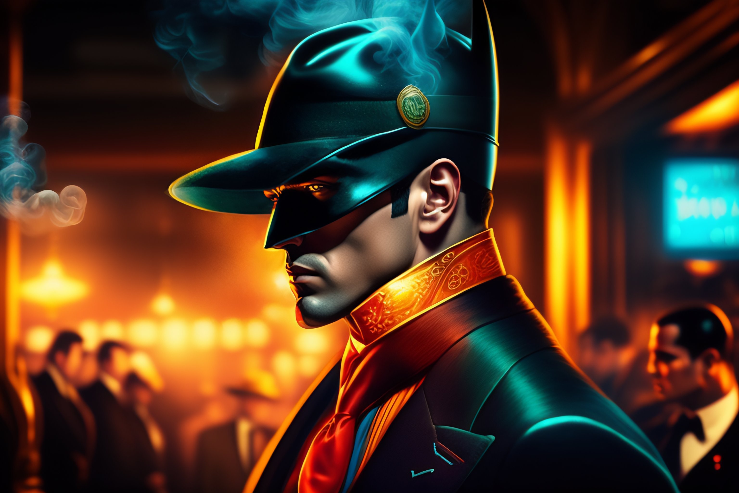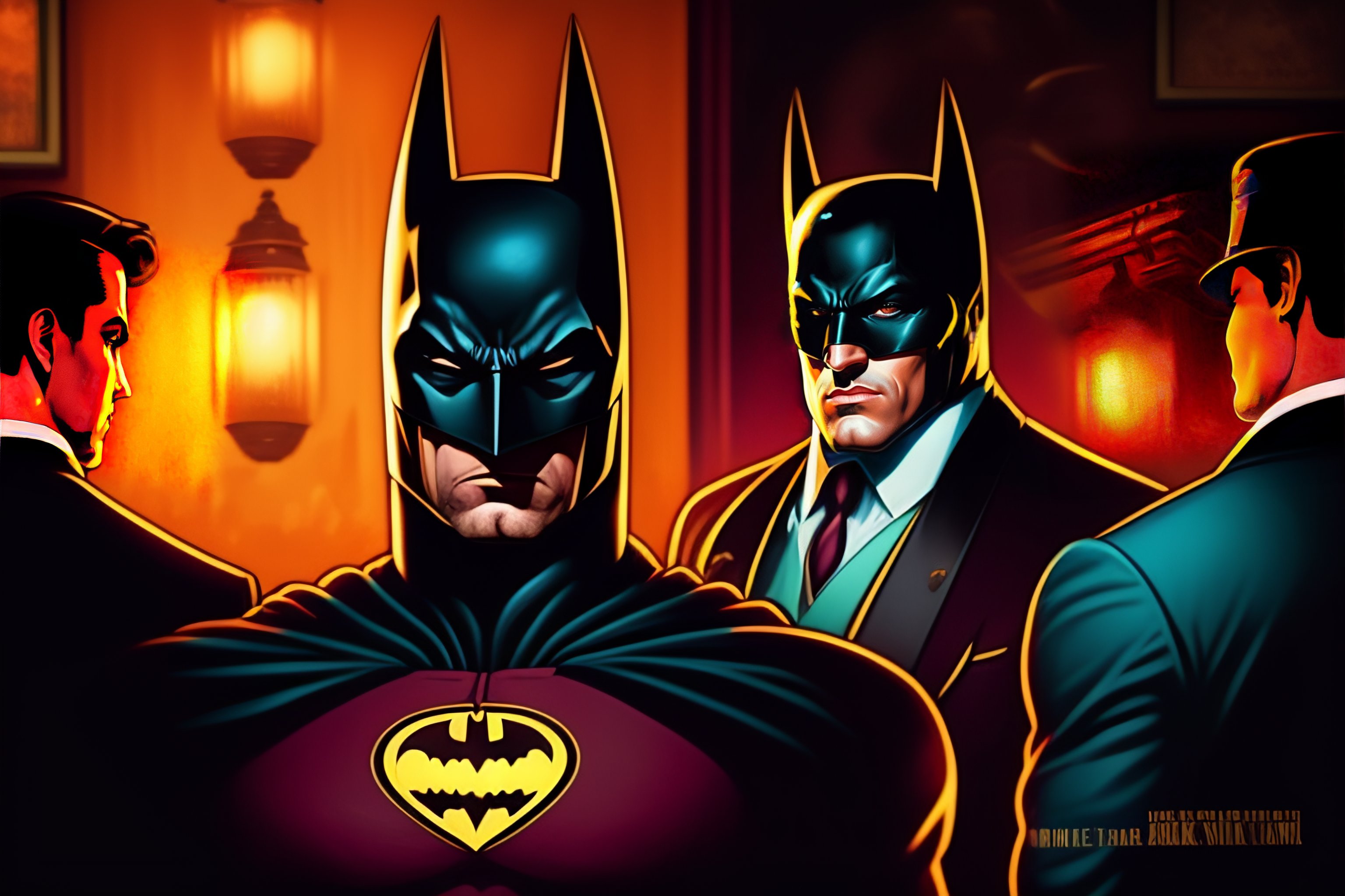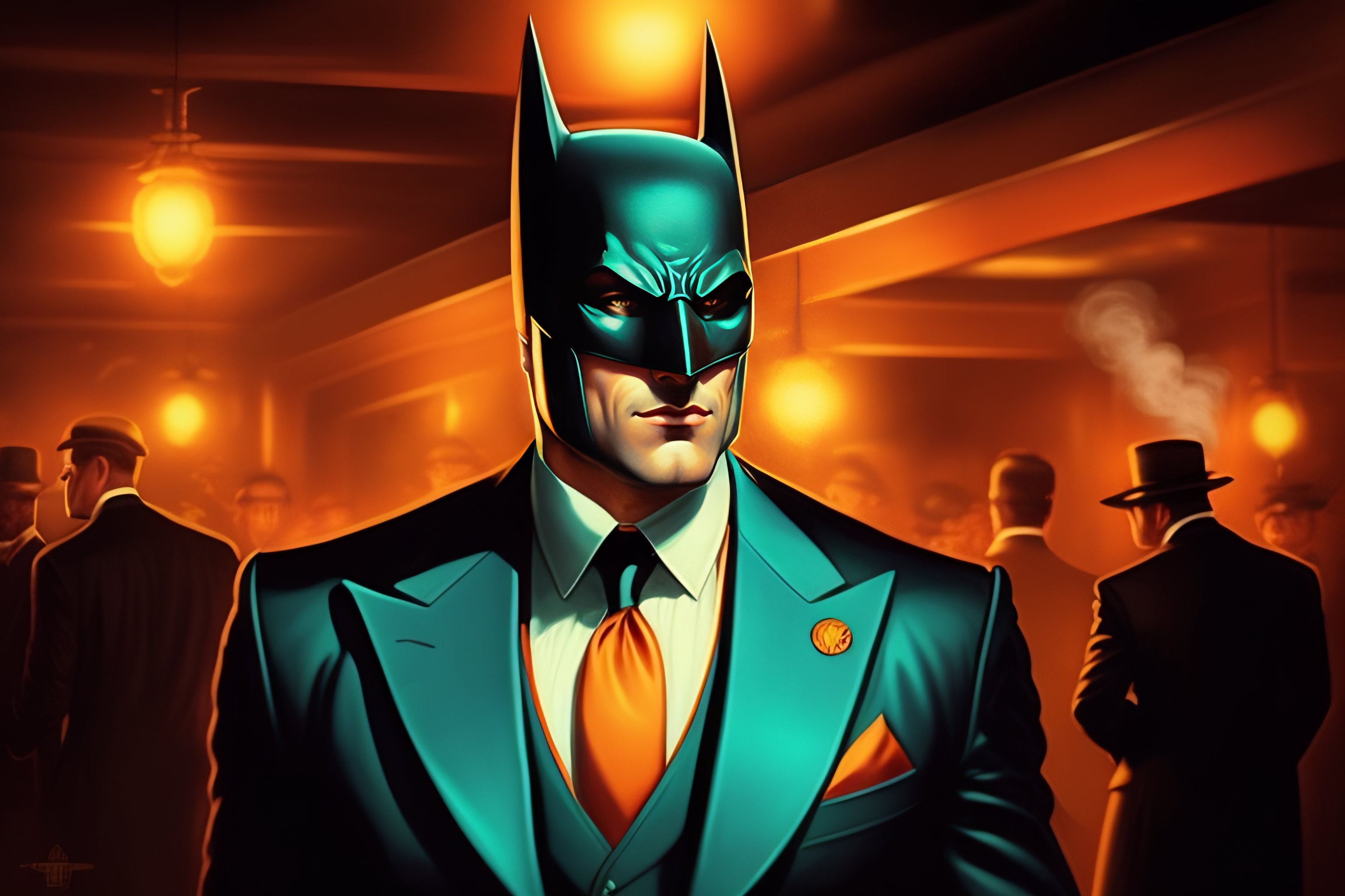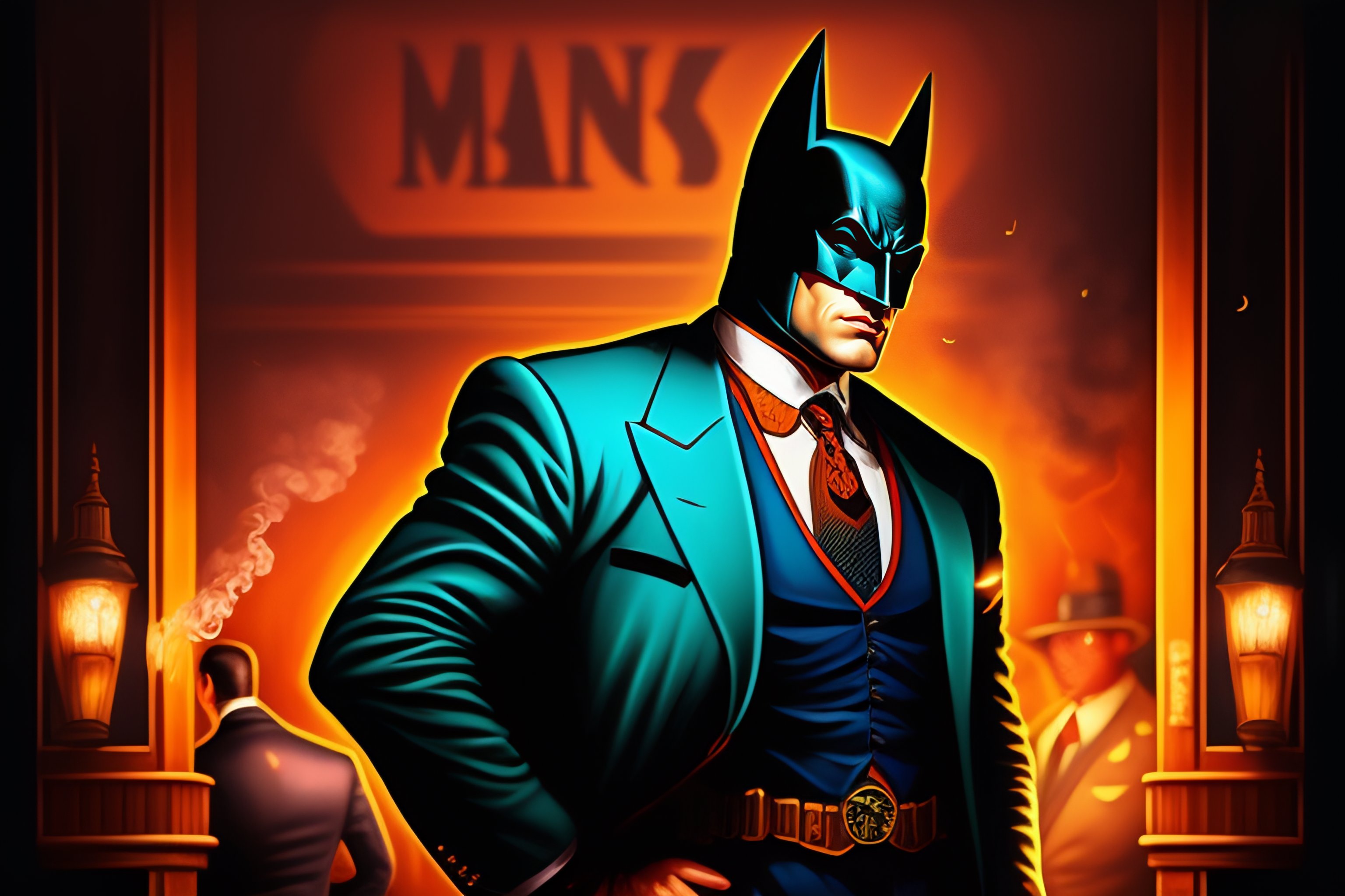 Batman inside a vintage bar in 1920s, black batman suit, mafia boss, smoke, surrounded by mob, marvel art style, digital art, teal and orange