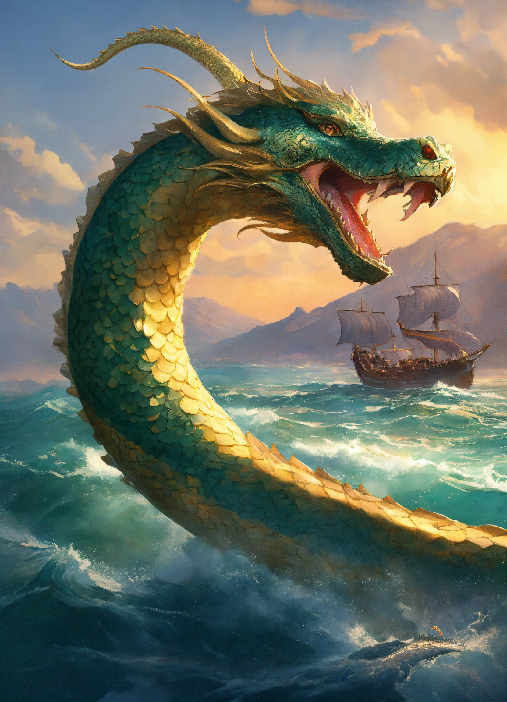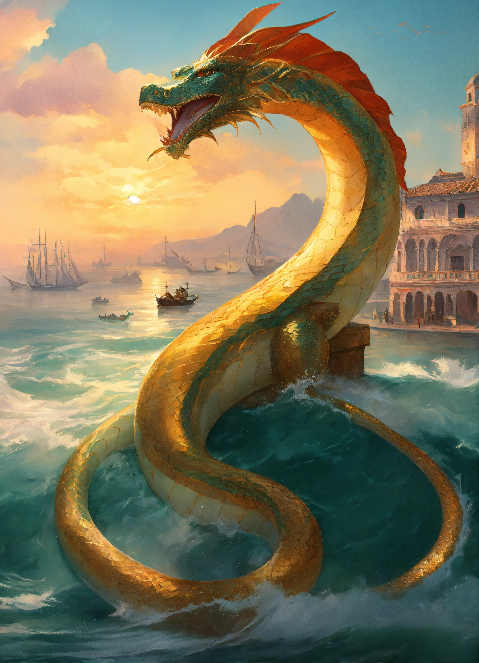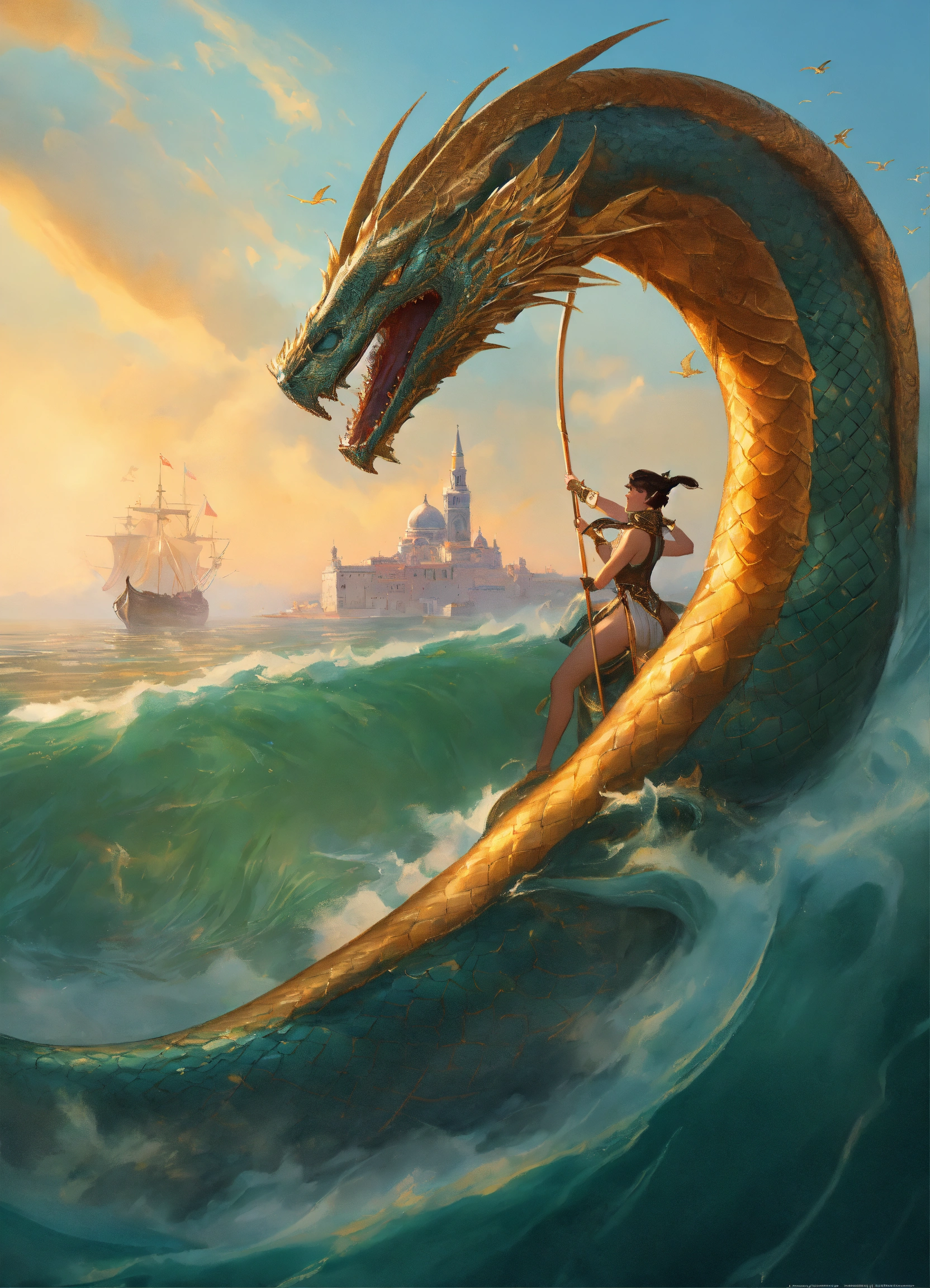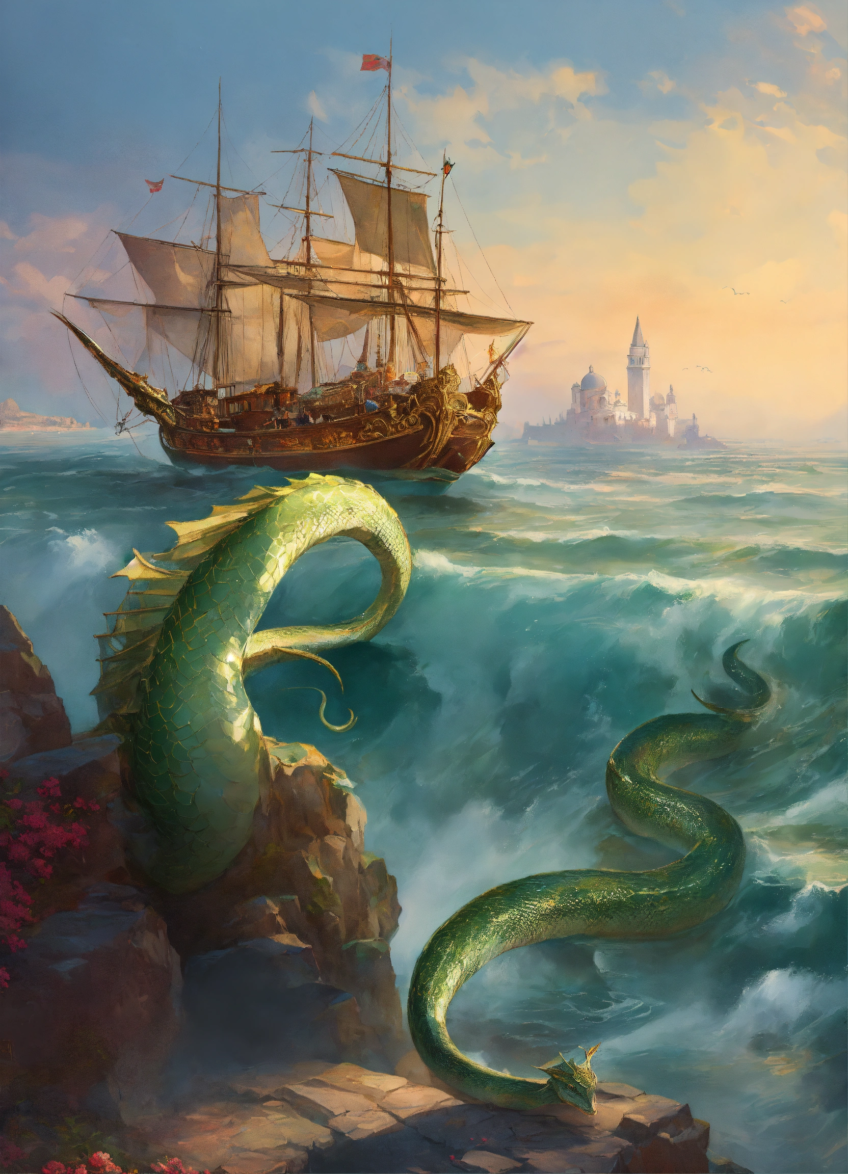 A sea serpent fighting a venetian galeass, background sea plains, elegant, highly detailed, digital painting, artstation, concept art, smooth, sharp focus, illustration, art by artgerm and greg rutkowski and alphonse mucha, erte, 8k