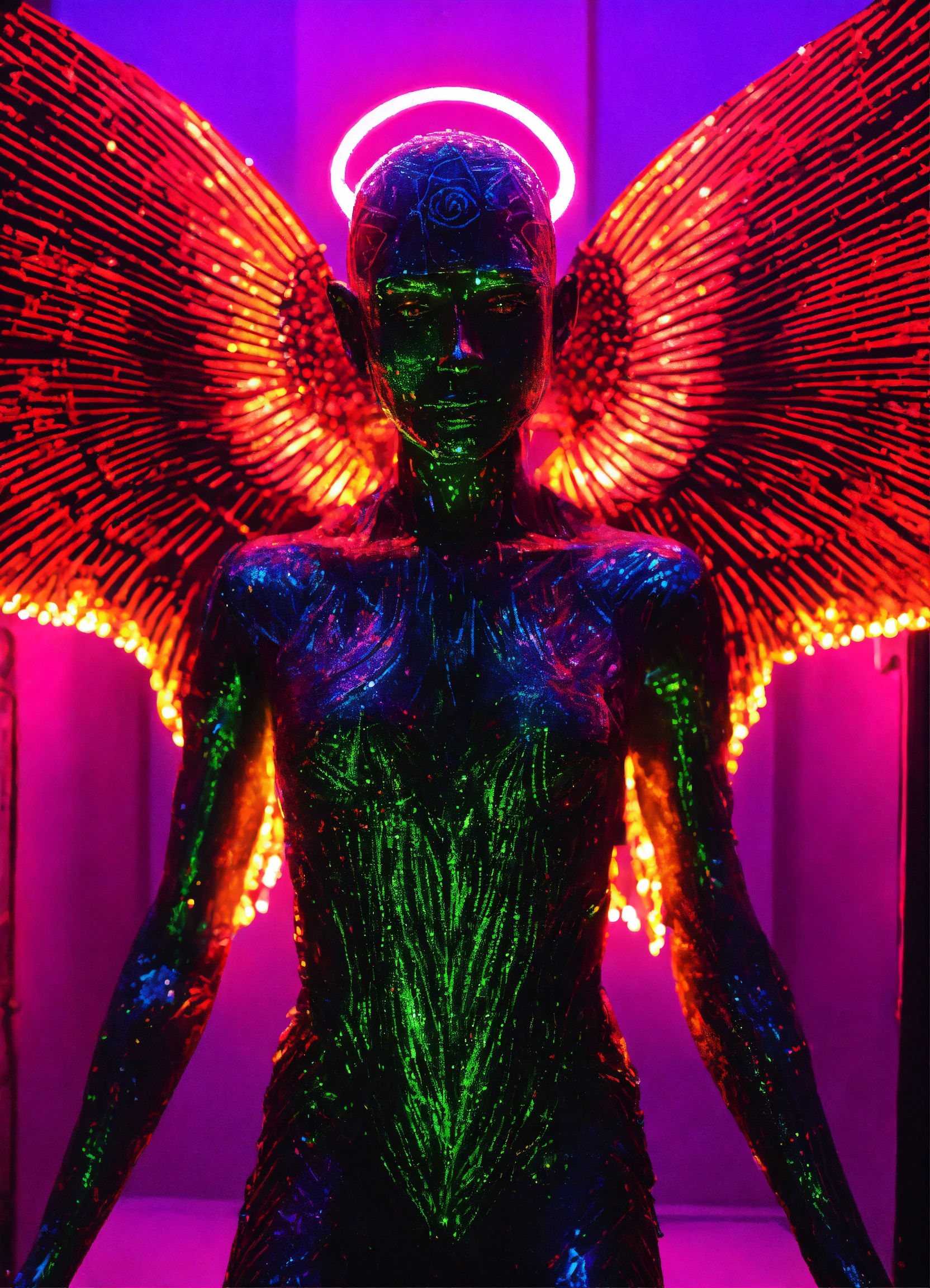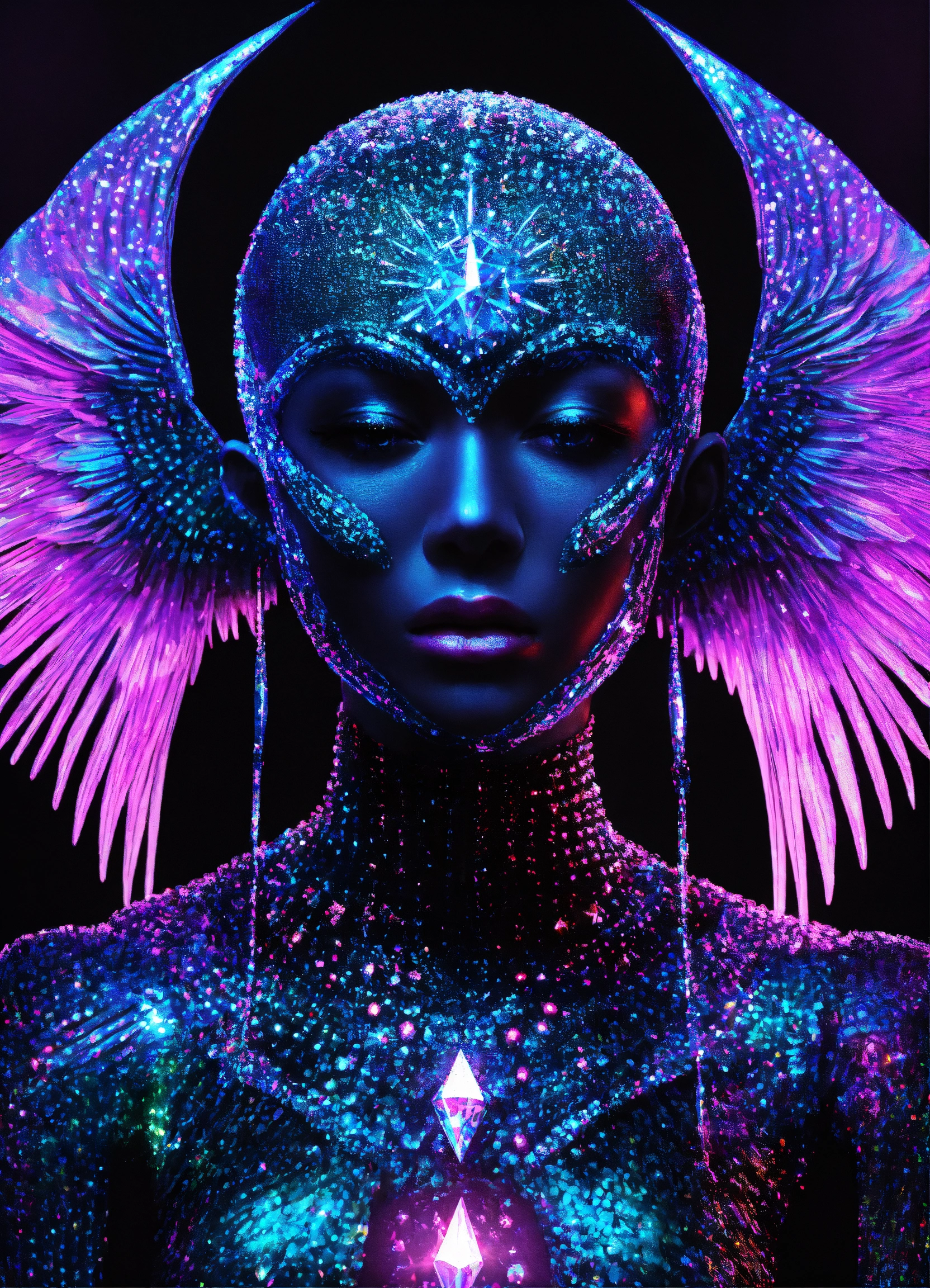 Ultra realistic pinhead with diamond angel wings in a diamond neon black light dmt demon glitter room