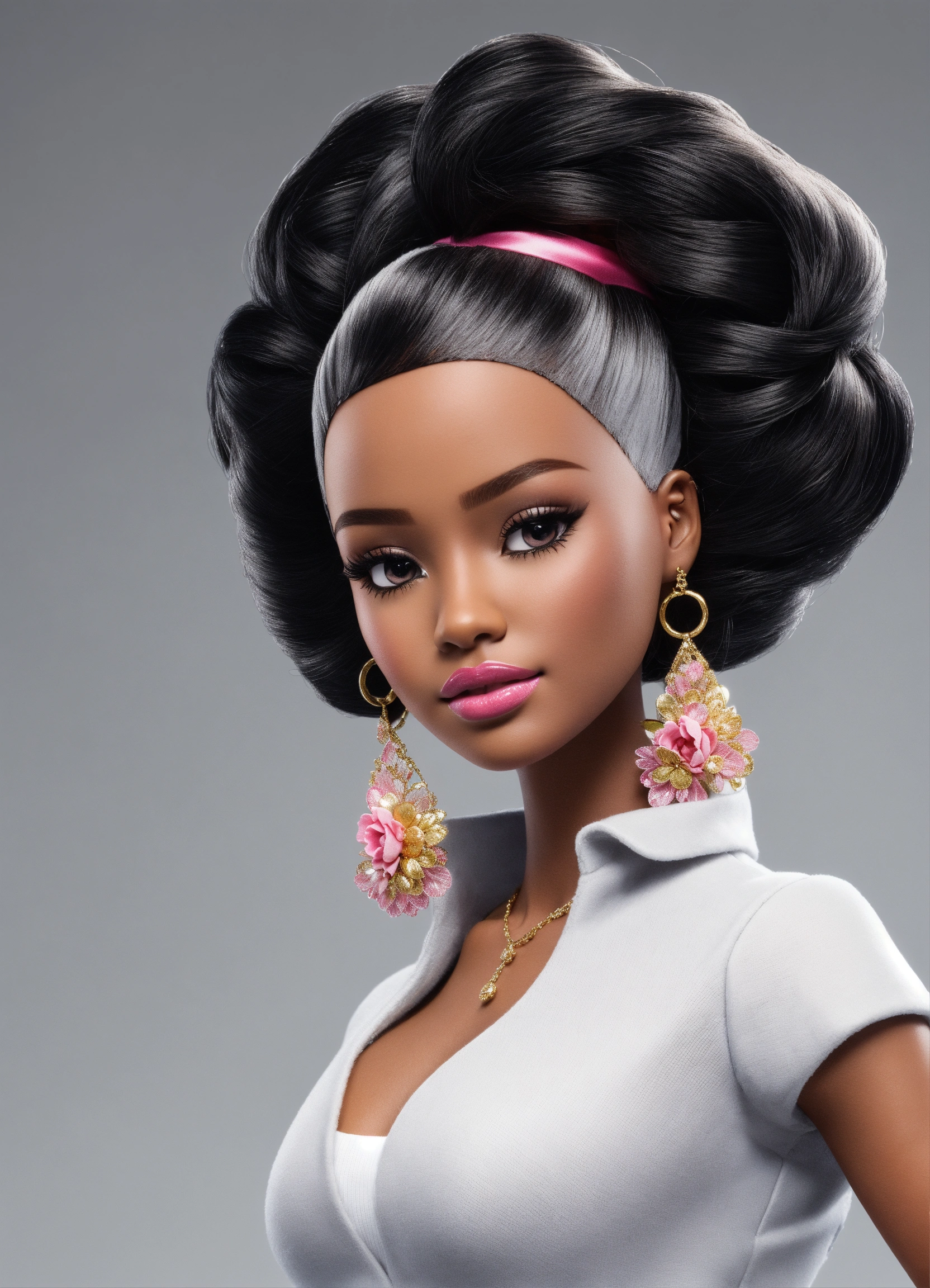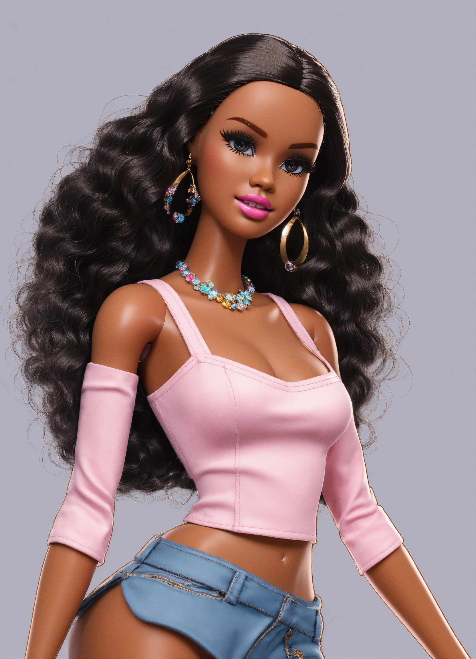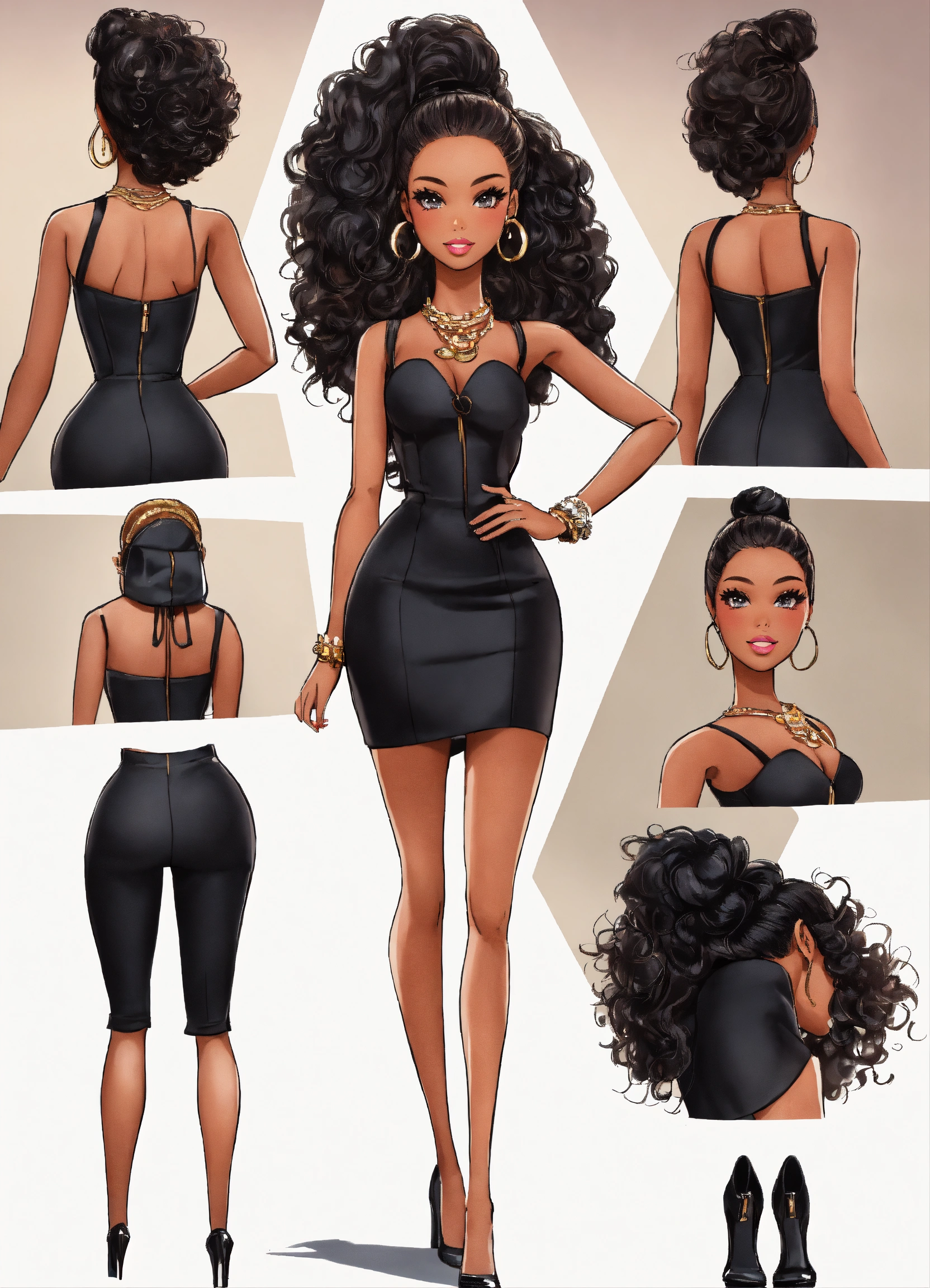 Cartoon black, barbie doll, center, head to toe fine details, no background, full body view, top of hair, top of head to toe, center, solid white background