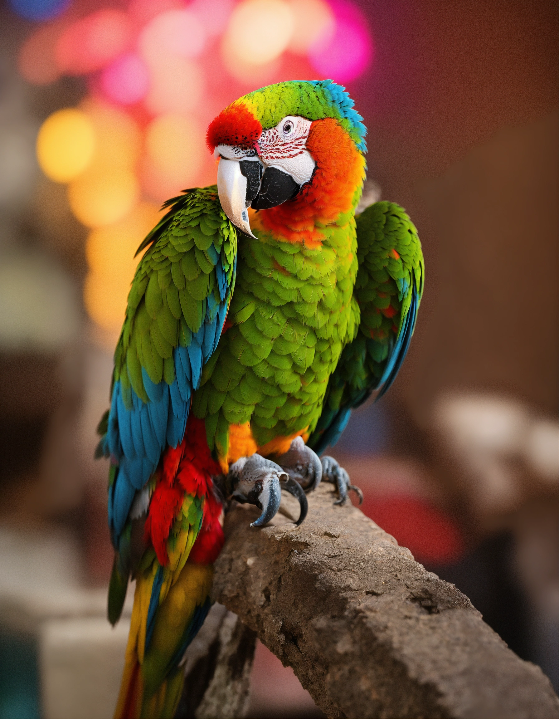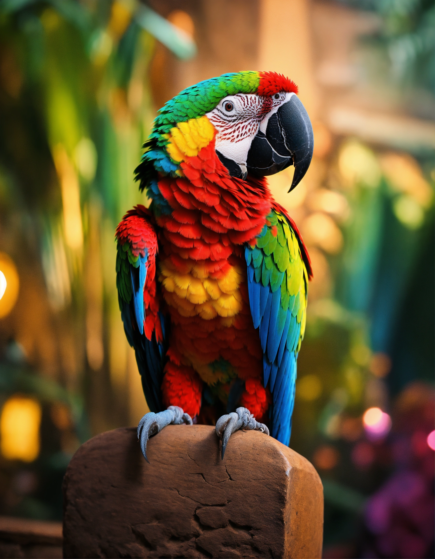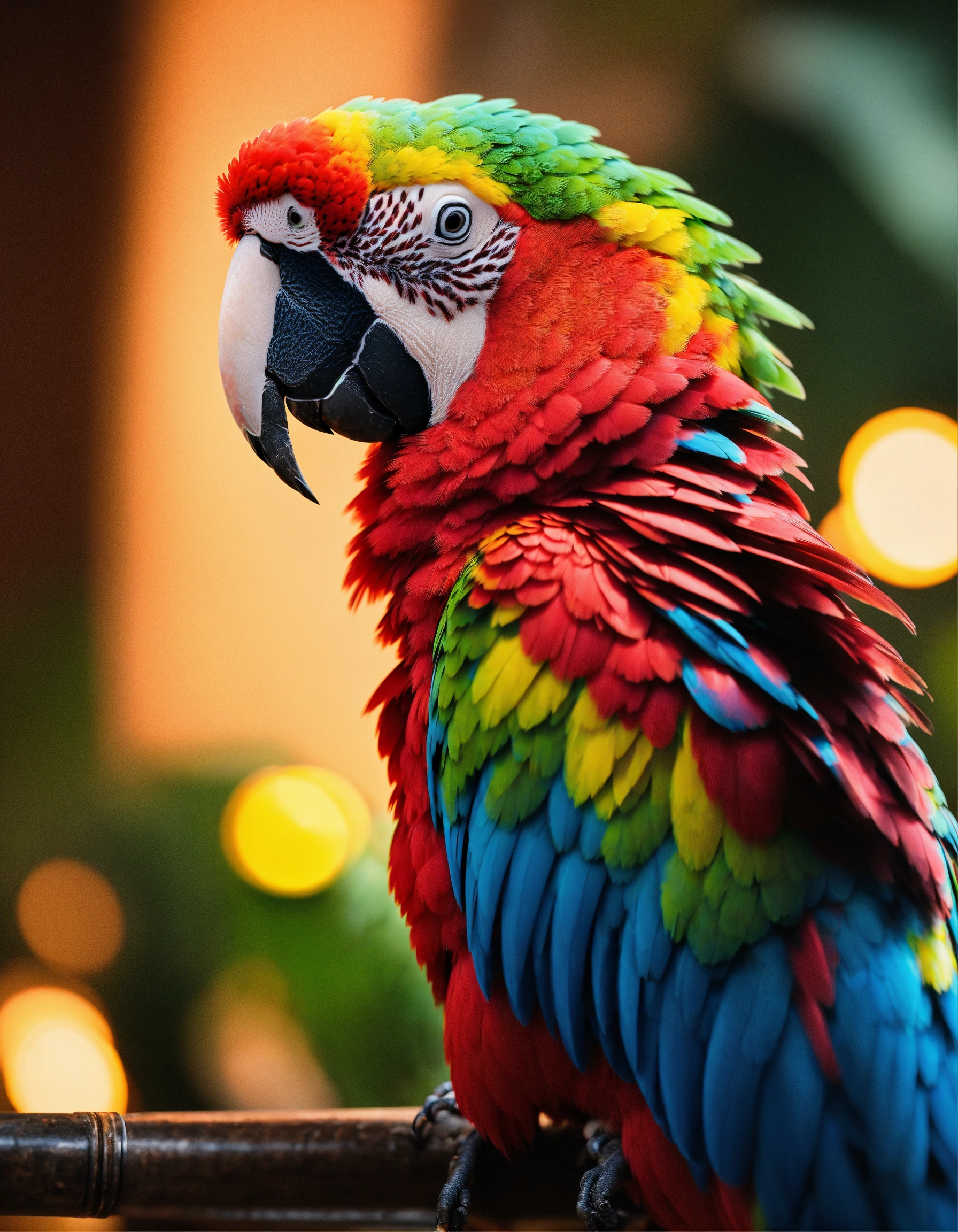 Medium shot, (colorful parrot1.2), beautiful, highly detailed, sharp focus, studio photography, xf iq 4, 150 mp, 50 mm, iso 200, 1/1 60 s, realistic, colorful disco lights, octane render, adobe lightroom, rule of thirds, symmetrical balance, depth layering, polarizing filter, sense of depth, ai enhanced