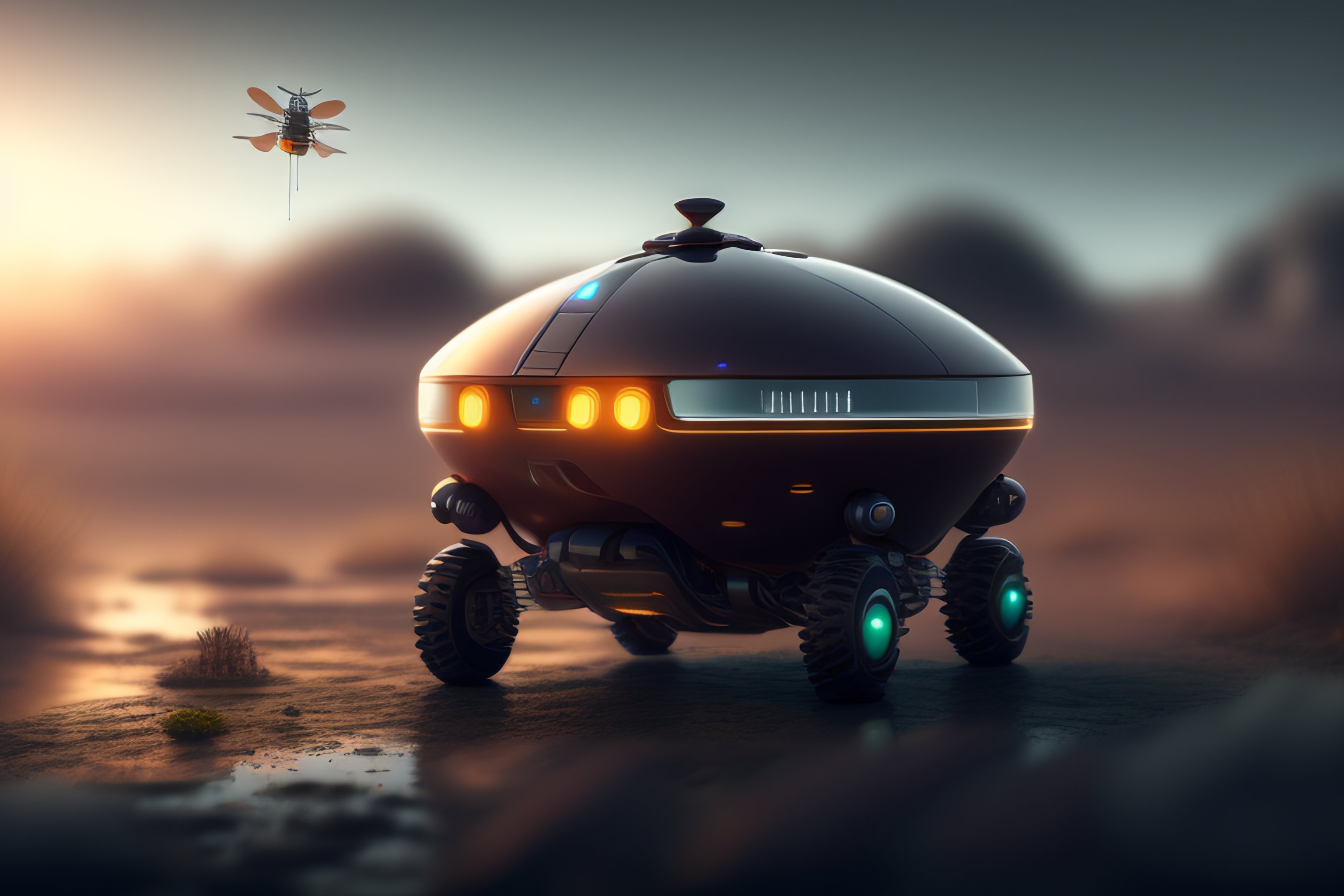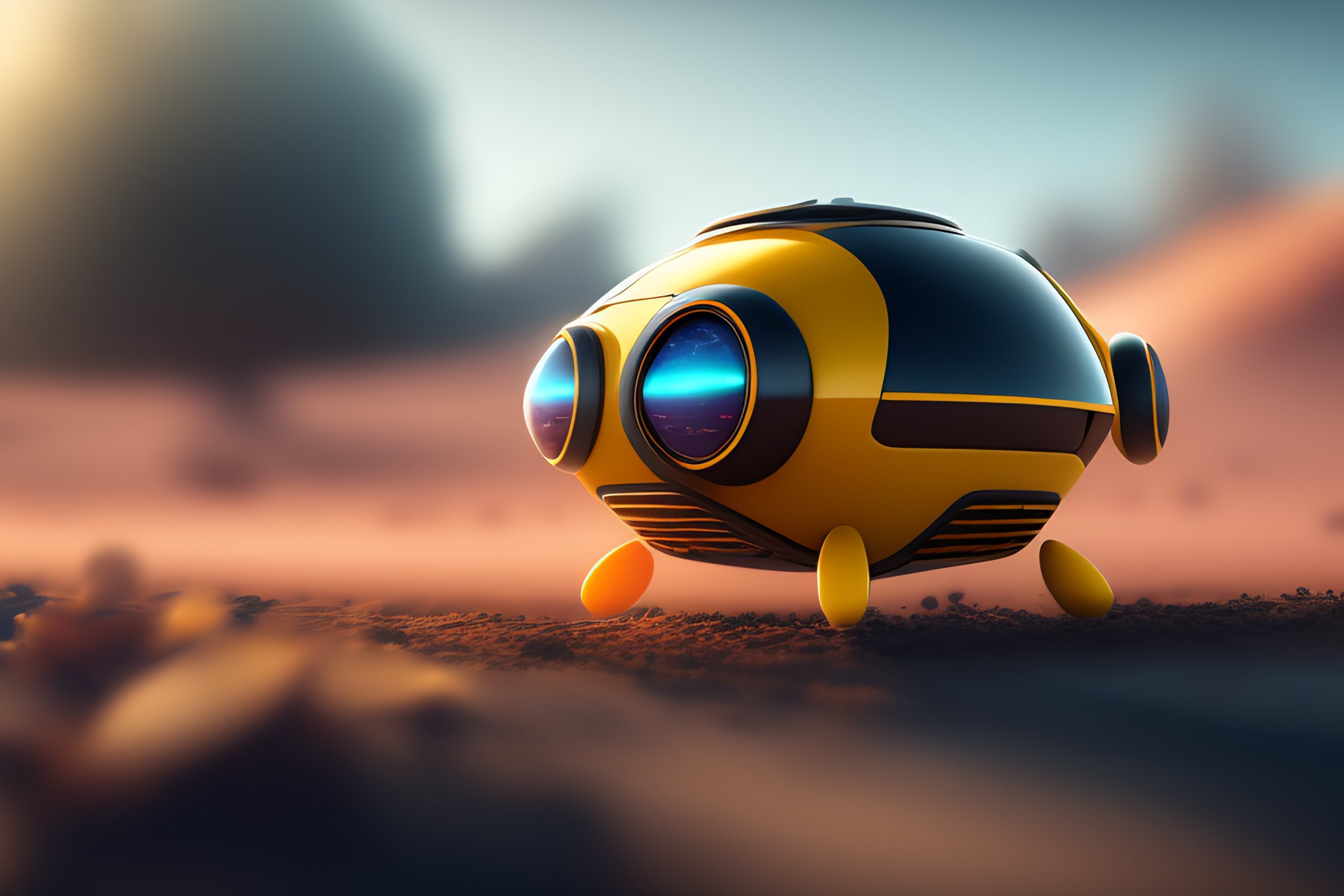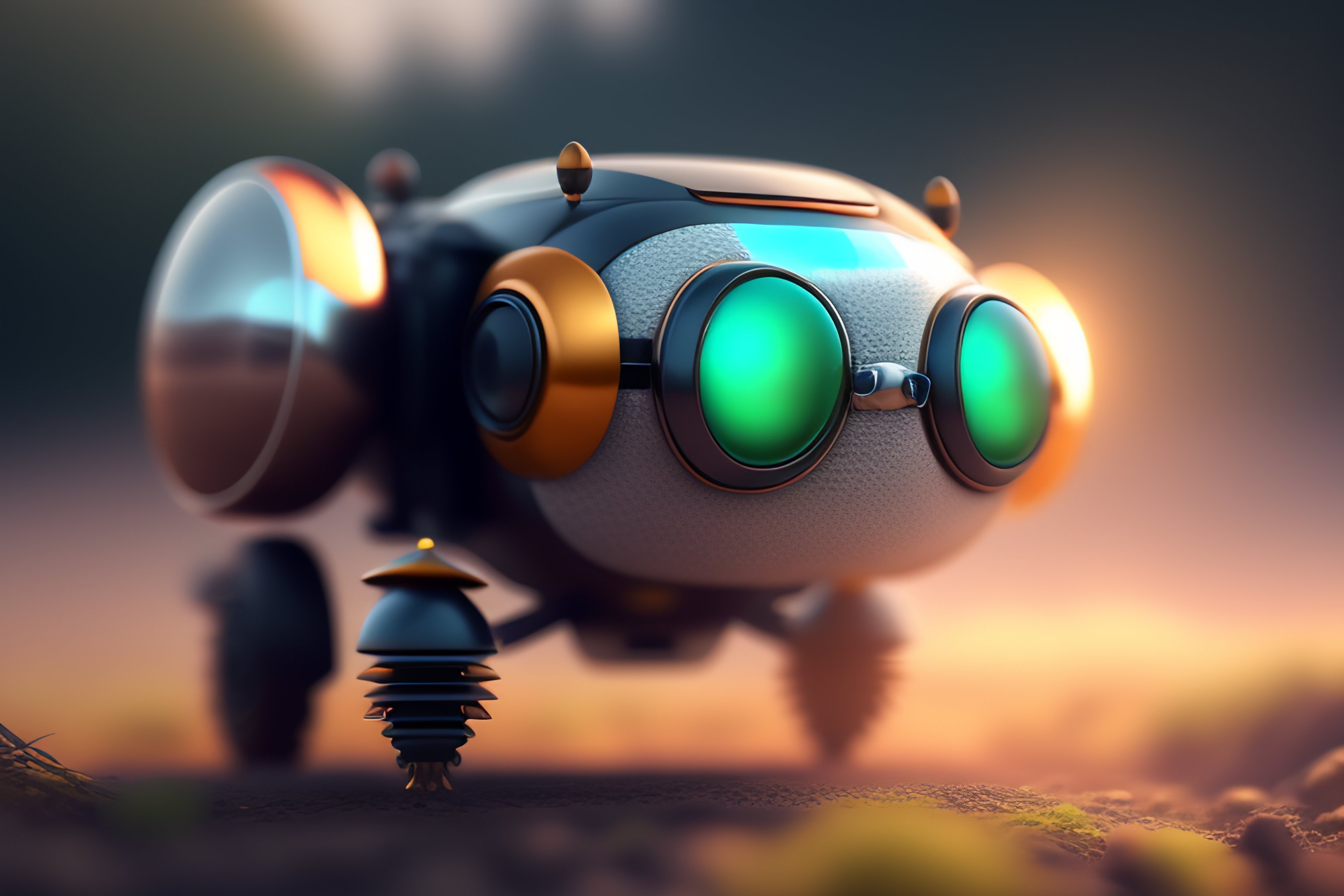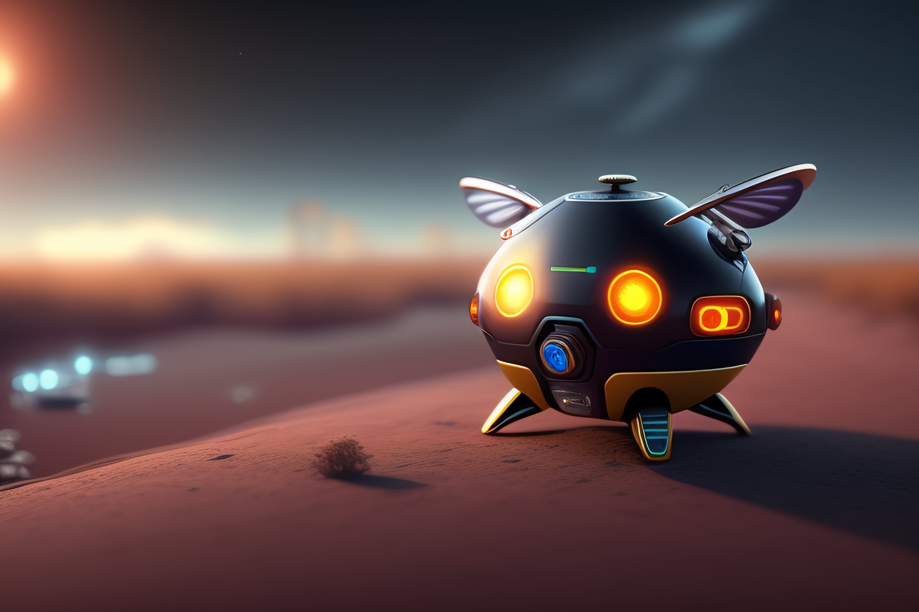 A tiny flying robot with big cute eyes wearing glasses in a dirty ditch with a power cable, scifi, published concept art, illustration, realistic, 8k