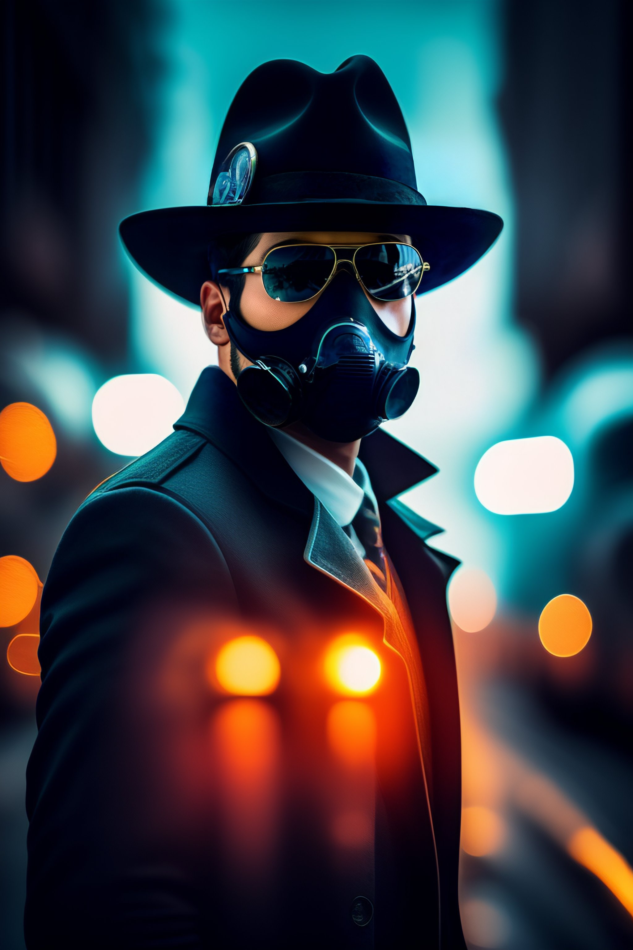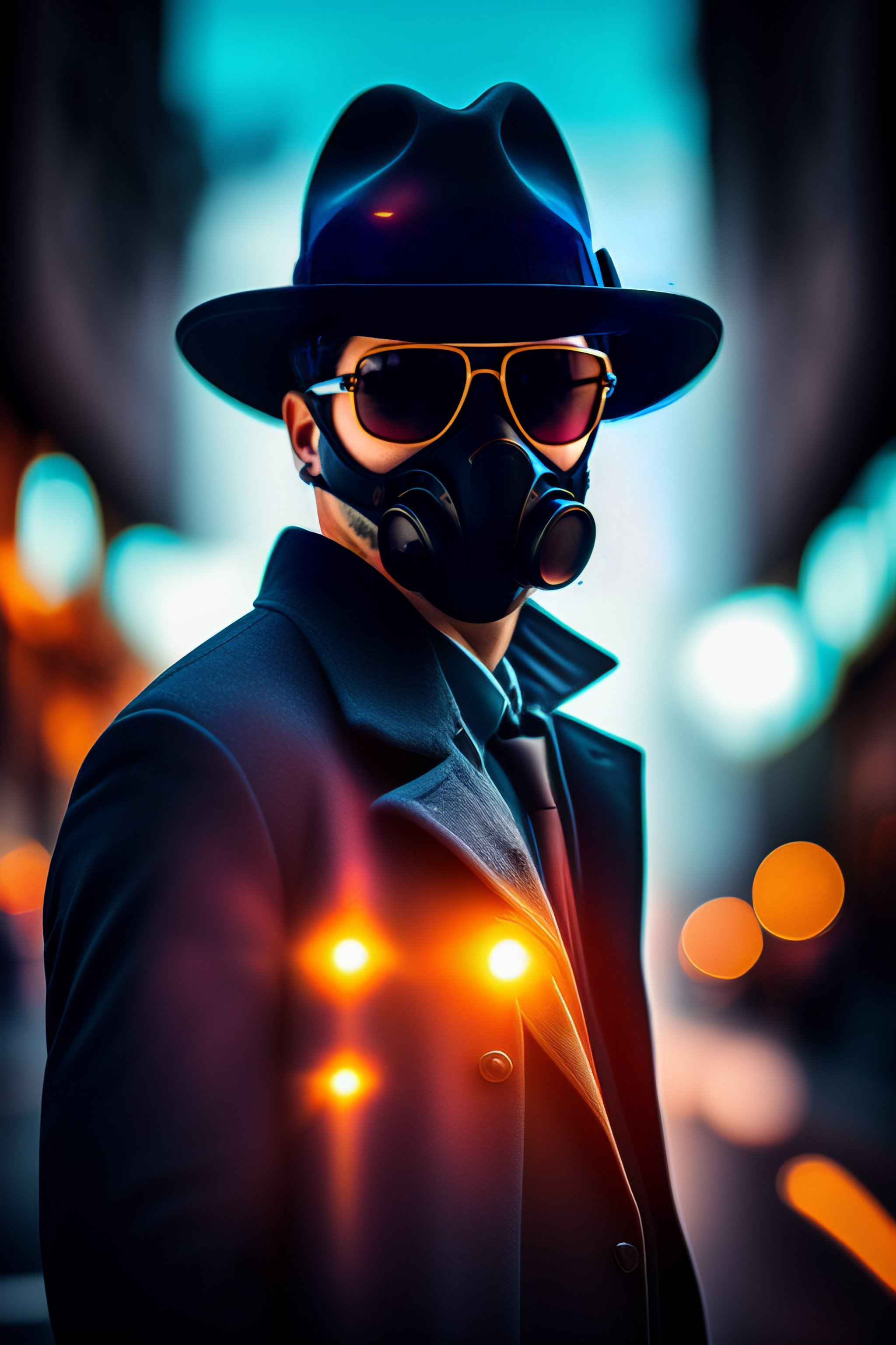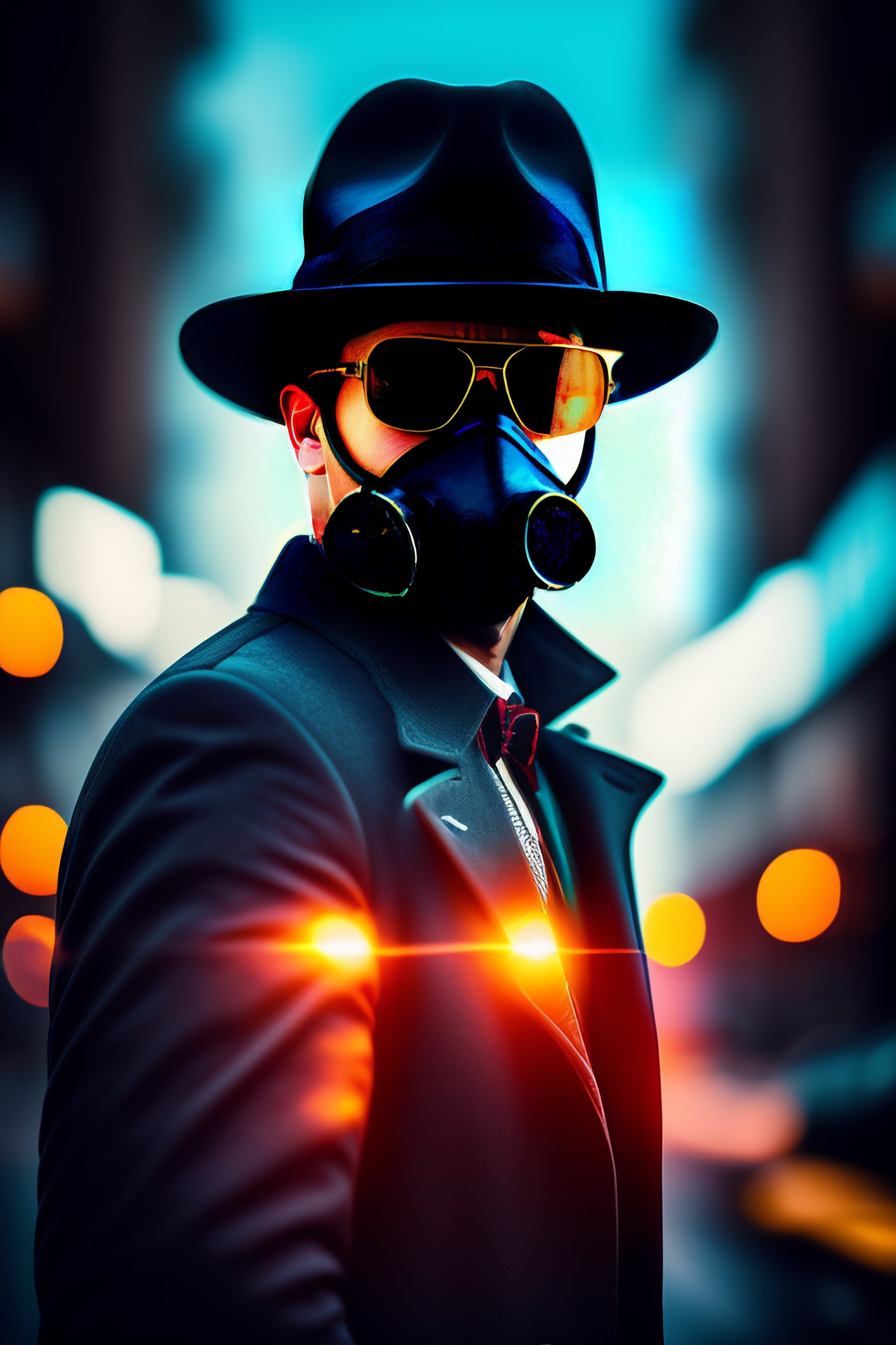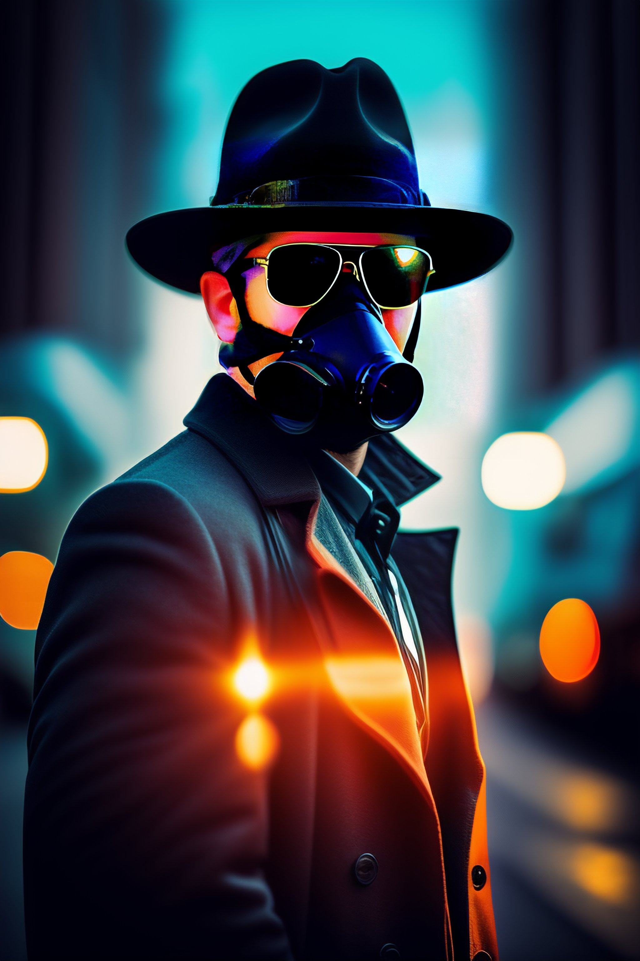 A man wearing a fedora hat, sunglasses, trenchcoat and a gas mask, a character portrait by fred a. precht, reddit contest winner, neoism, darksynth, sabattier filter, anamorphic lens flare