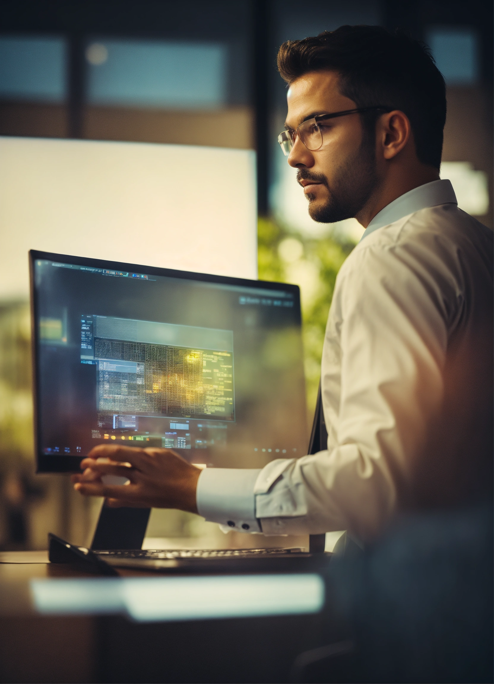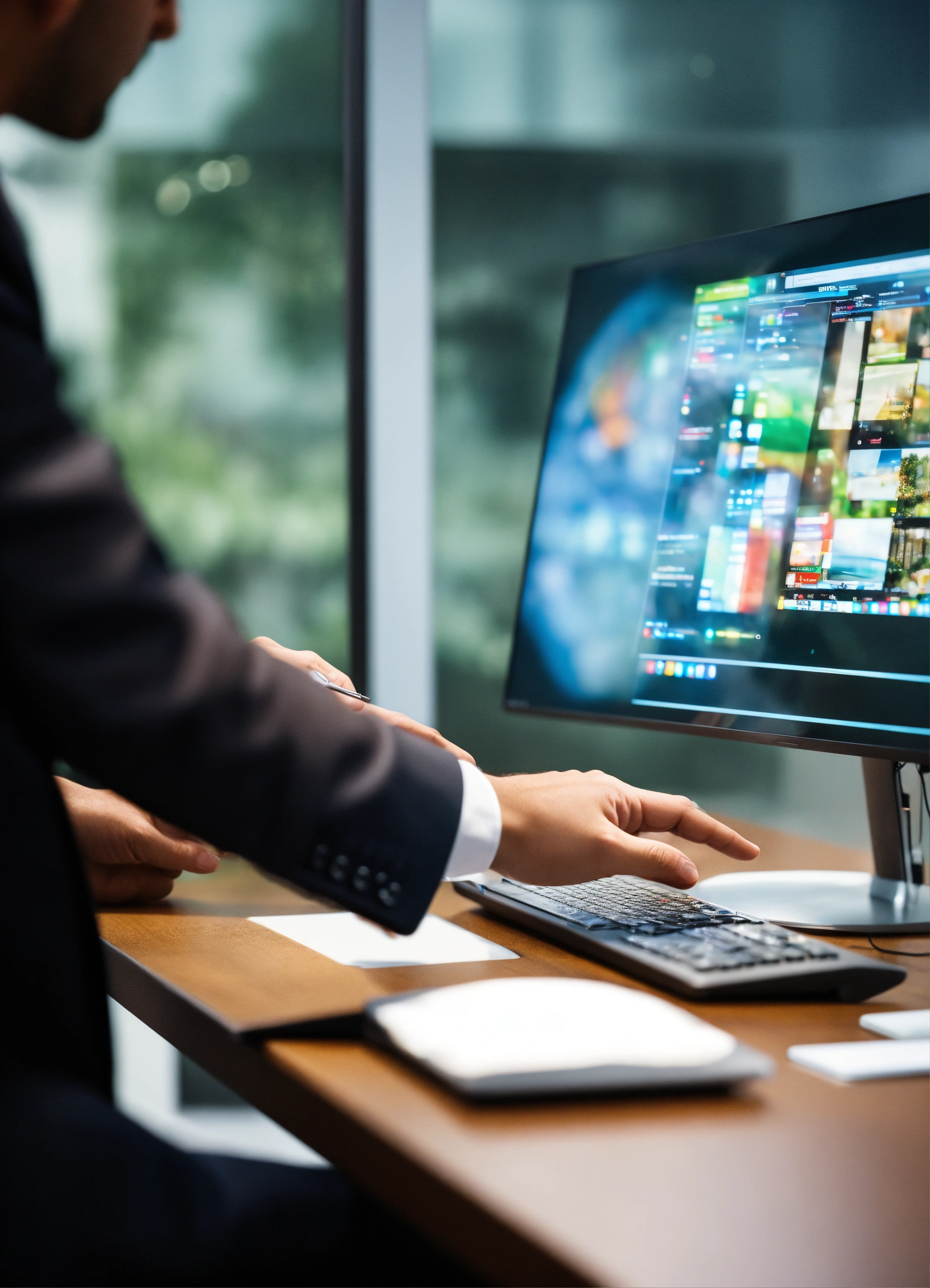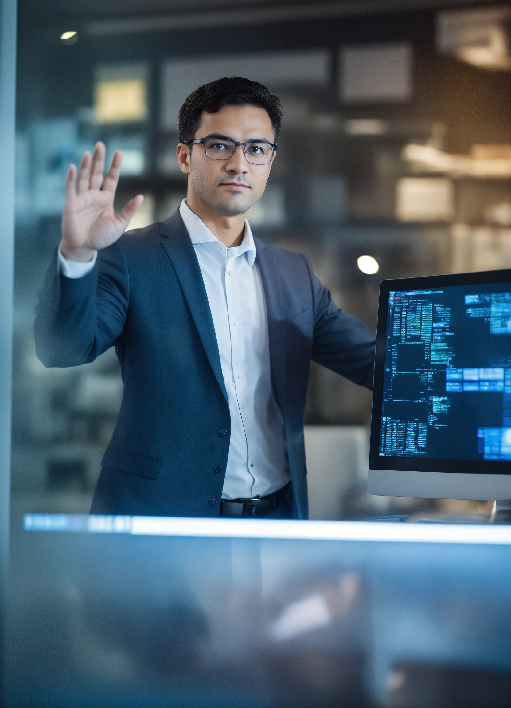 A business man, defocus - standing behind a transparent full computer screen and show with the right hand to the computer screen something