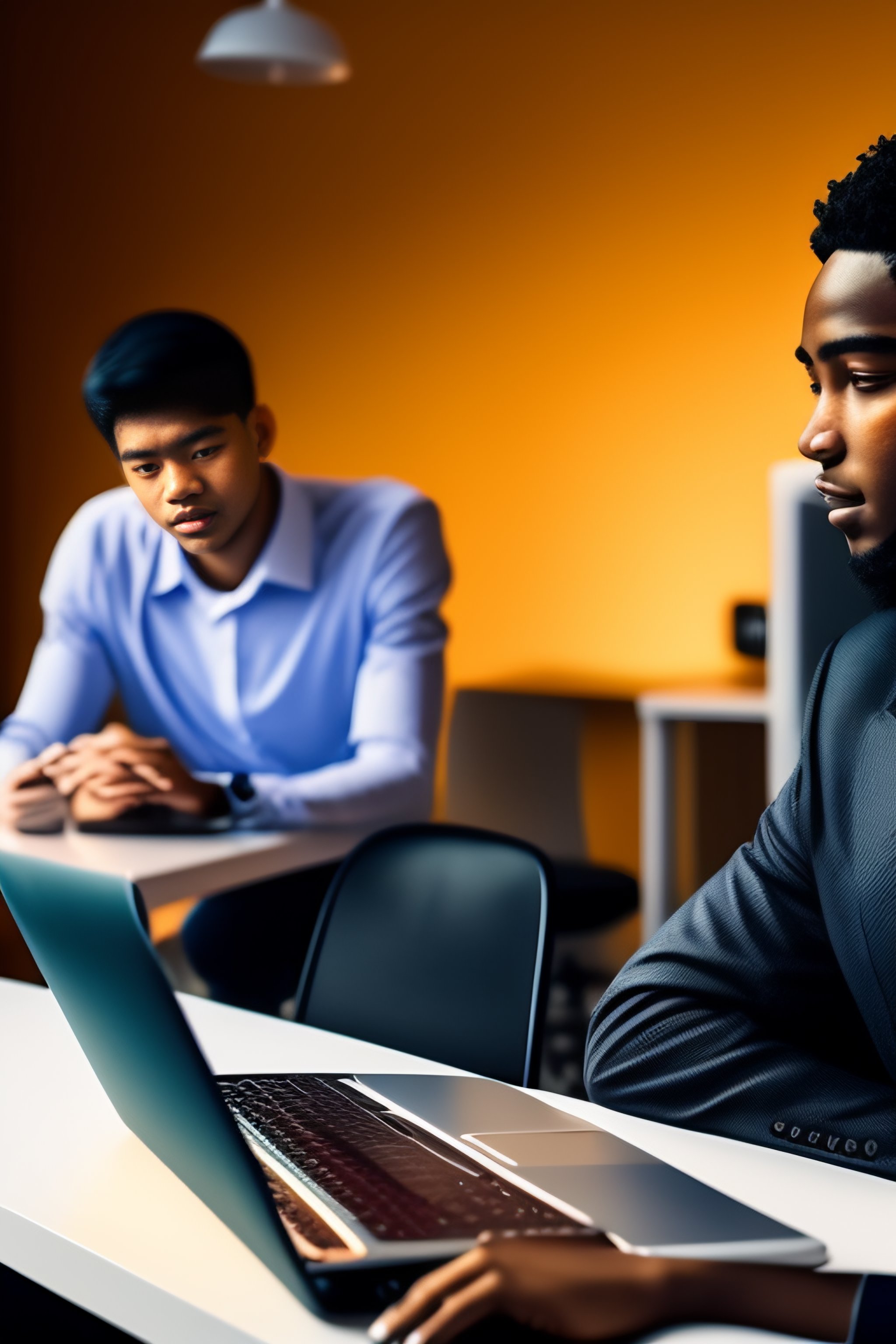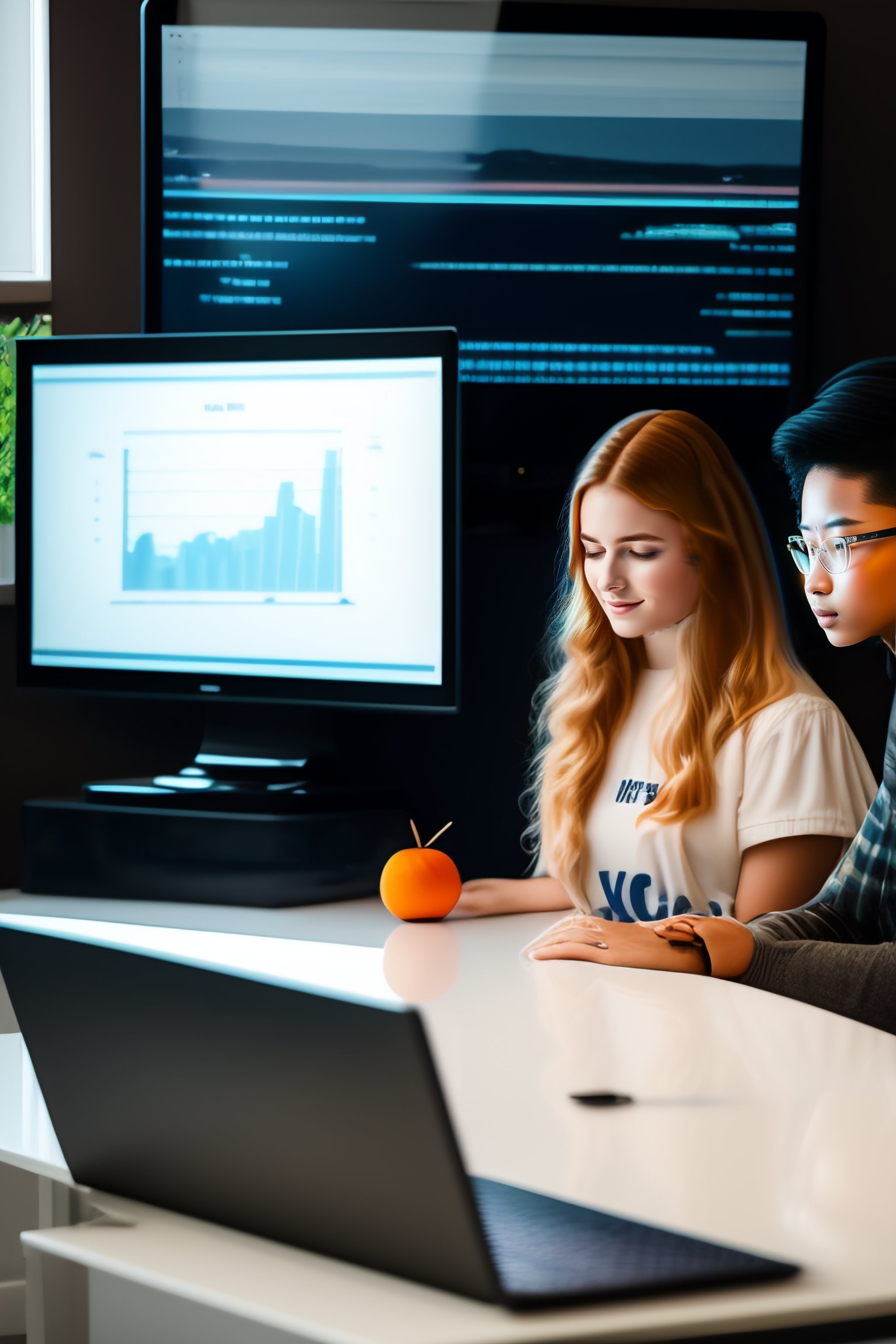 Two sick and misrable computer science students working with on a white table with 3 screen and a golden globe
