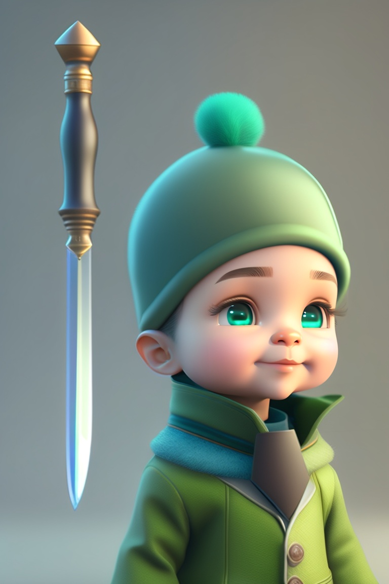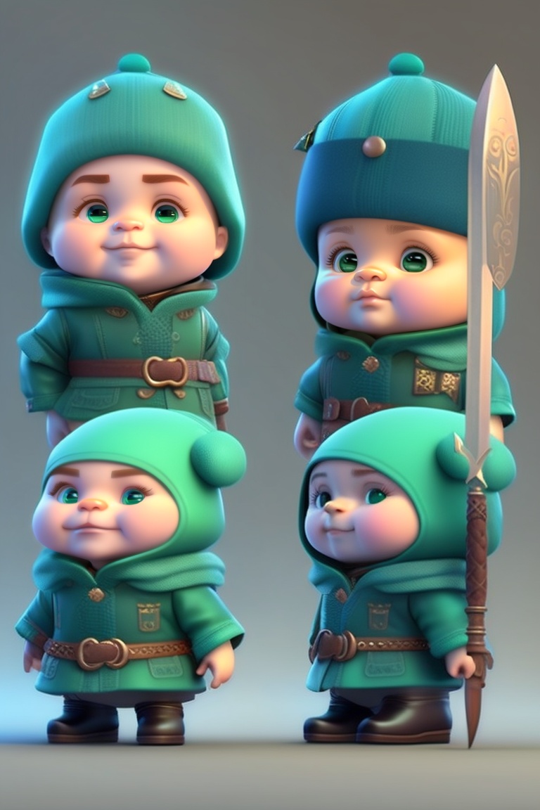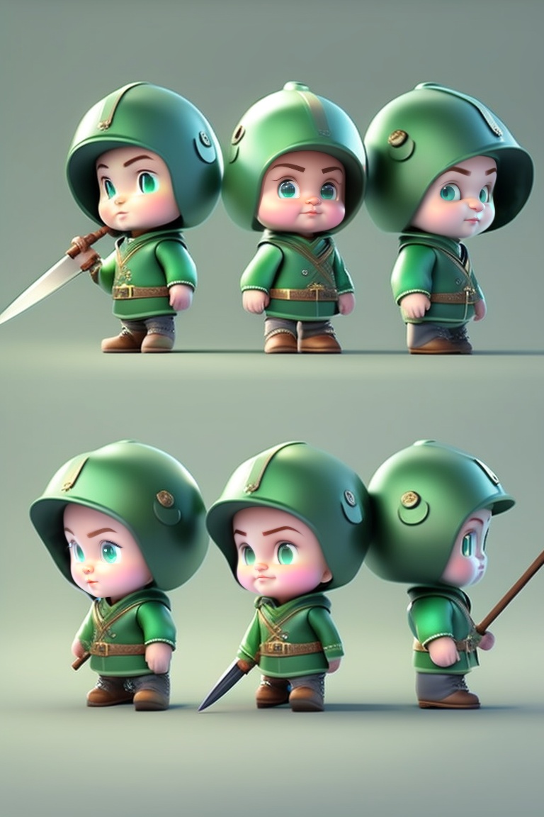Cute humanoid little character, wareing green clothes, wareing hat, wareing sword, pixar style, facial expressions, 3d character reference