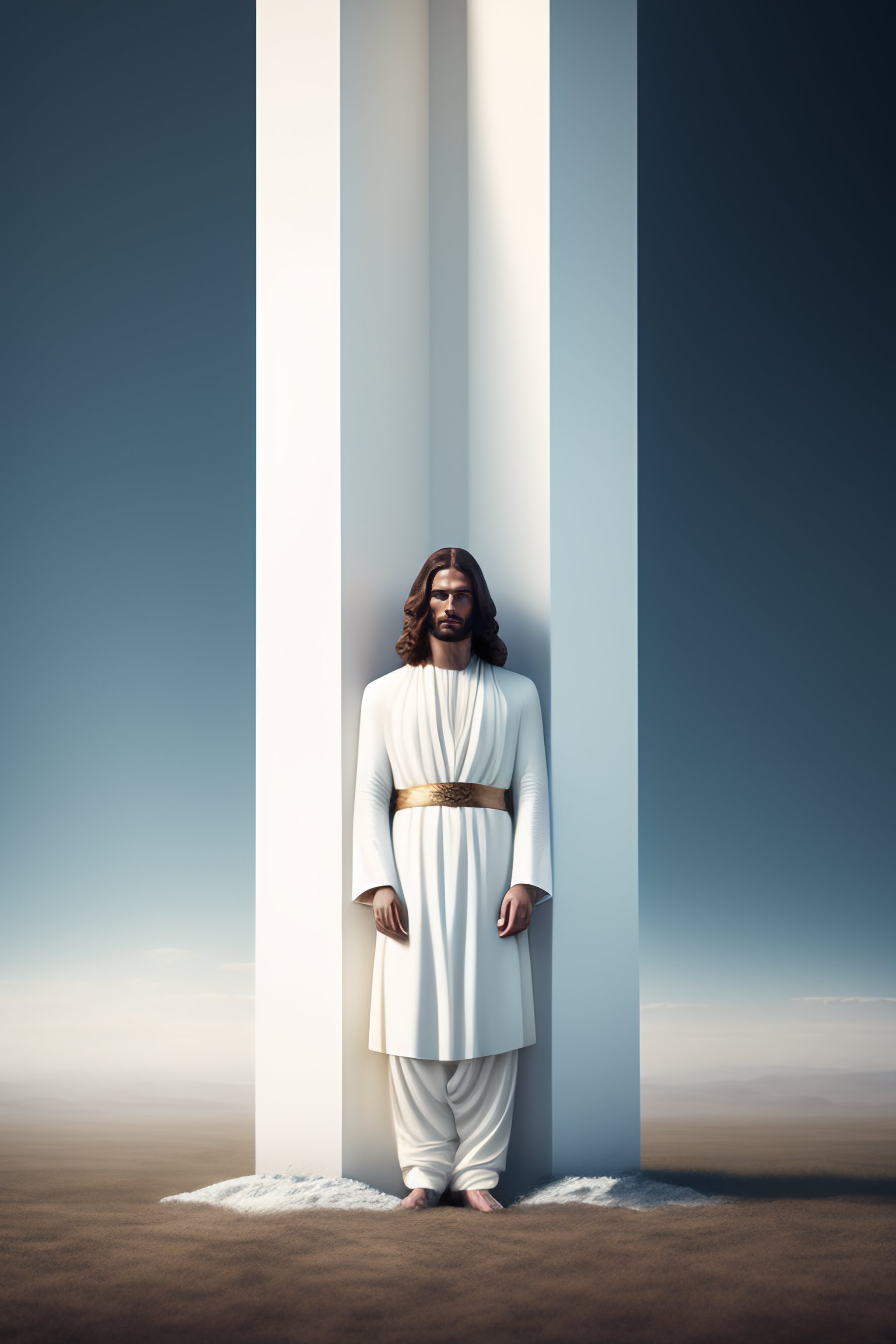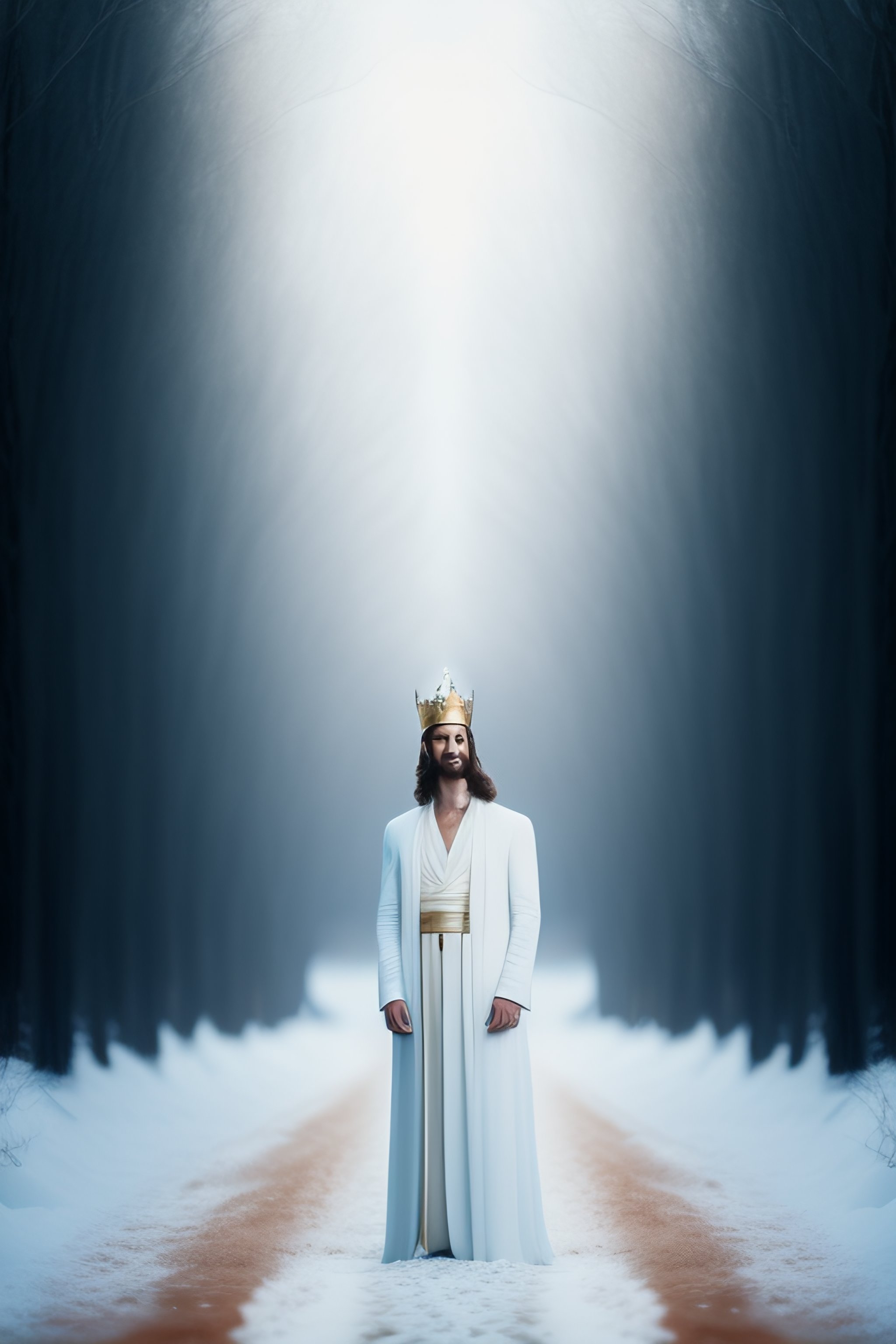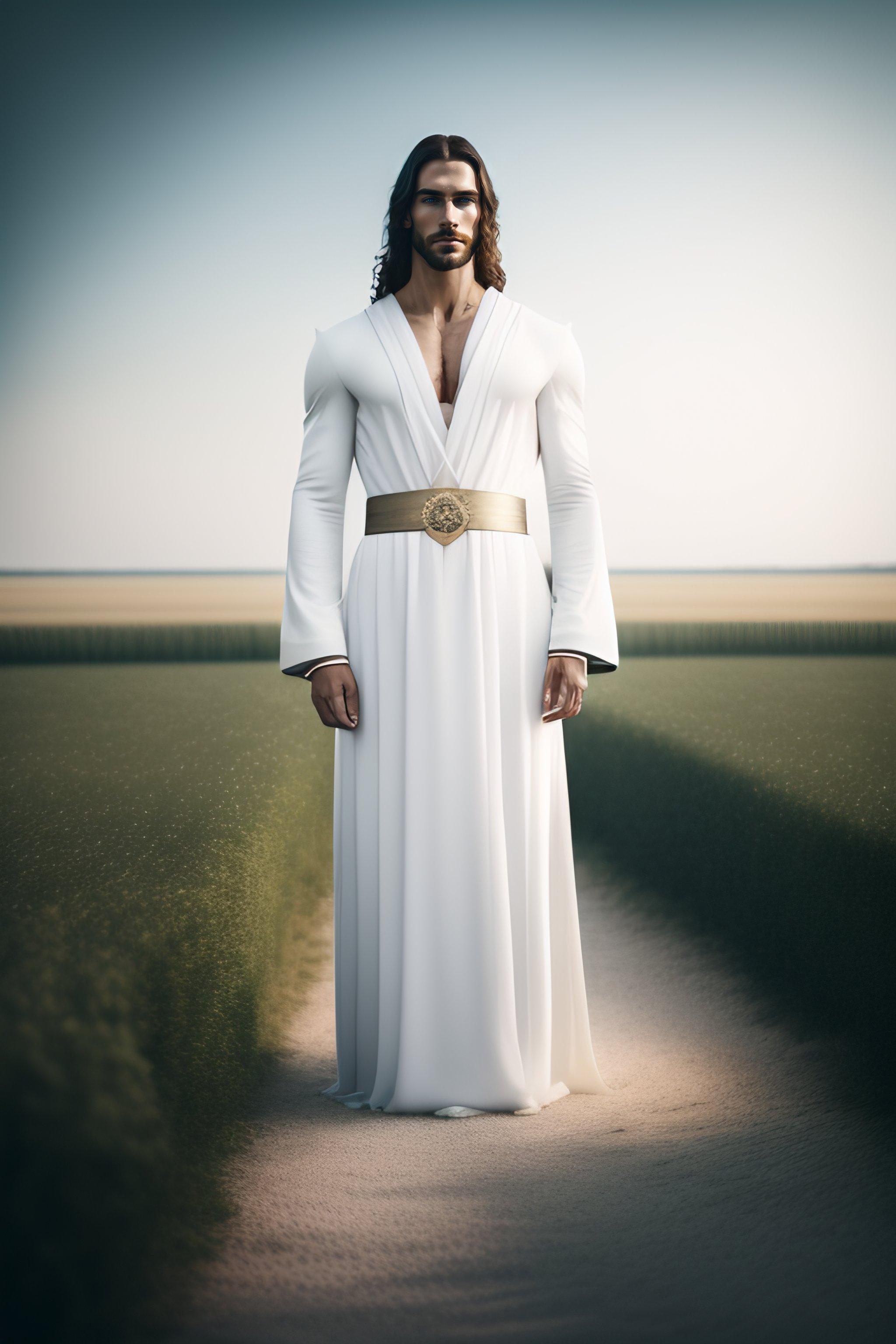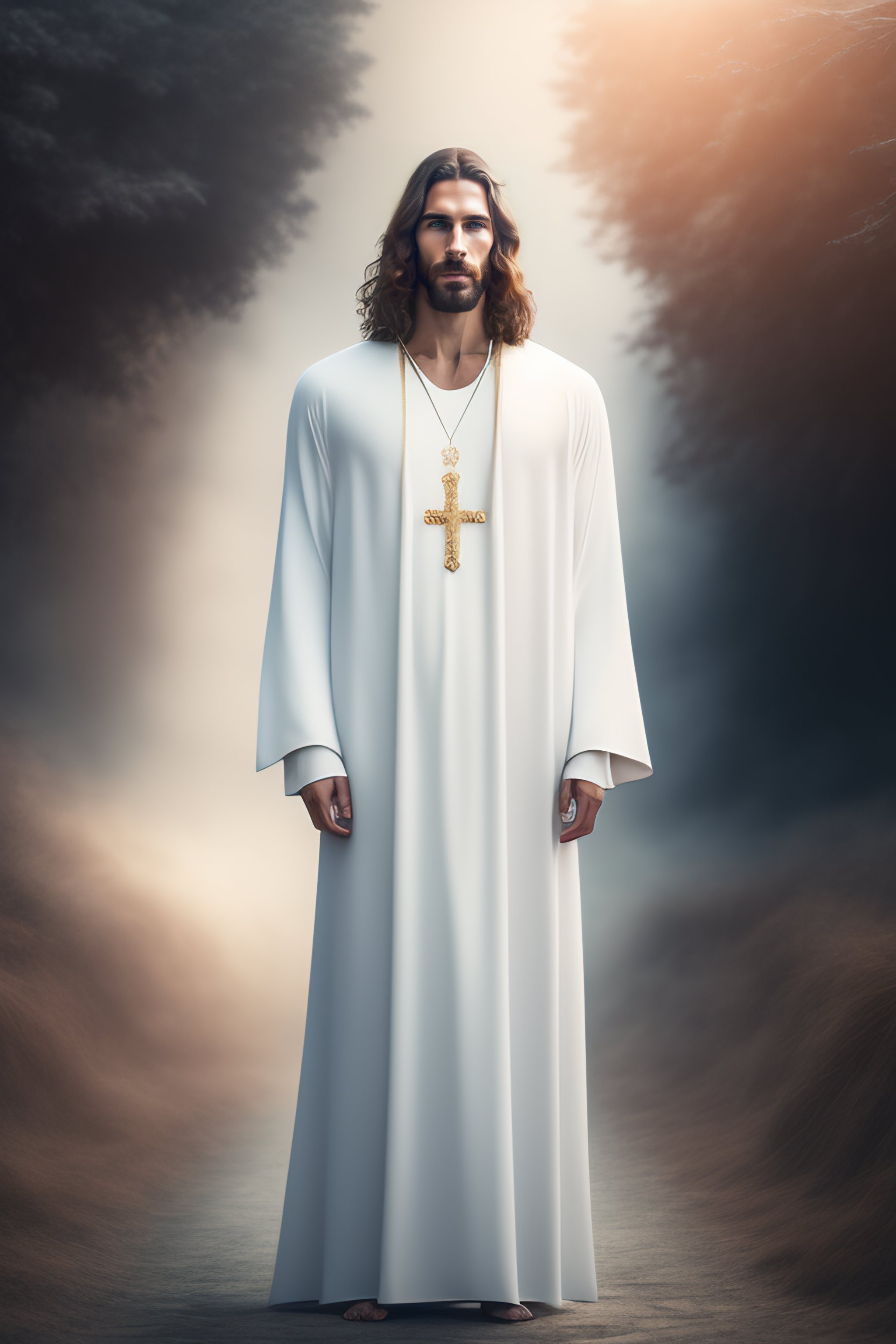Jesus christ, realistic photography, dressed, man, suffering, white long clothes, crown, heaven on the background