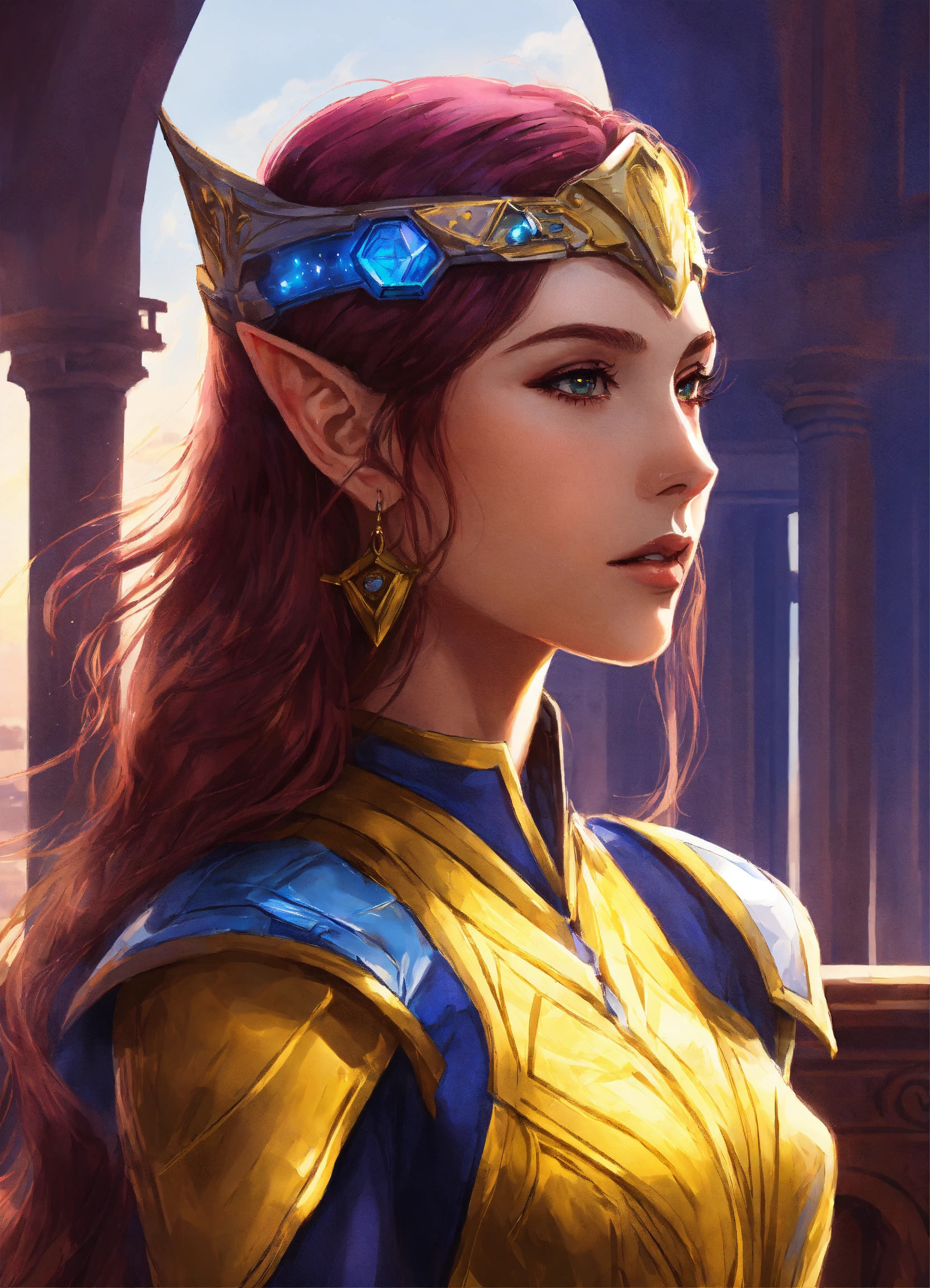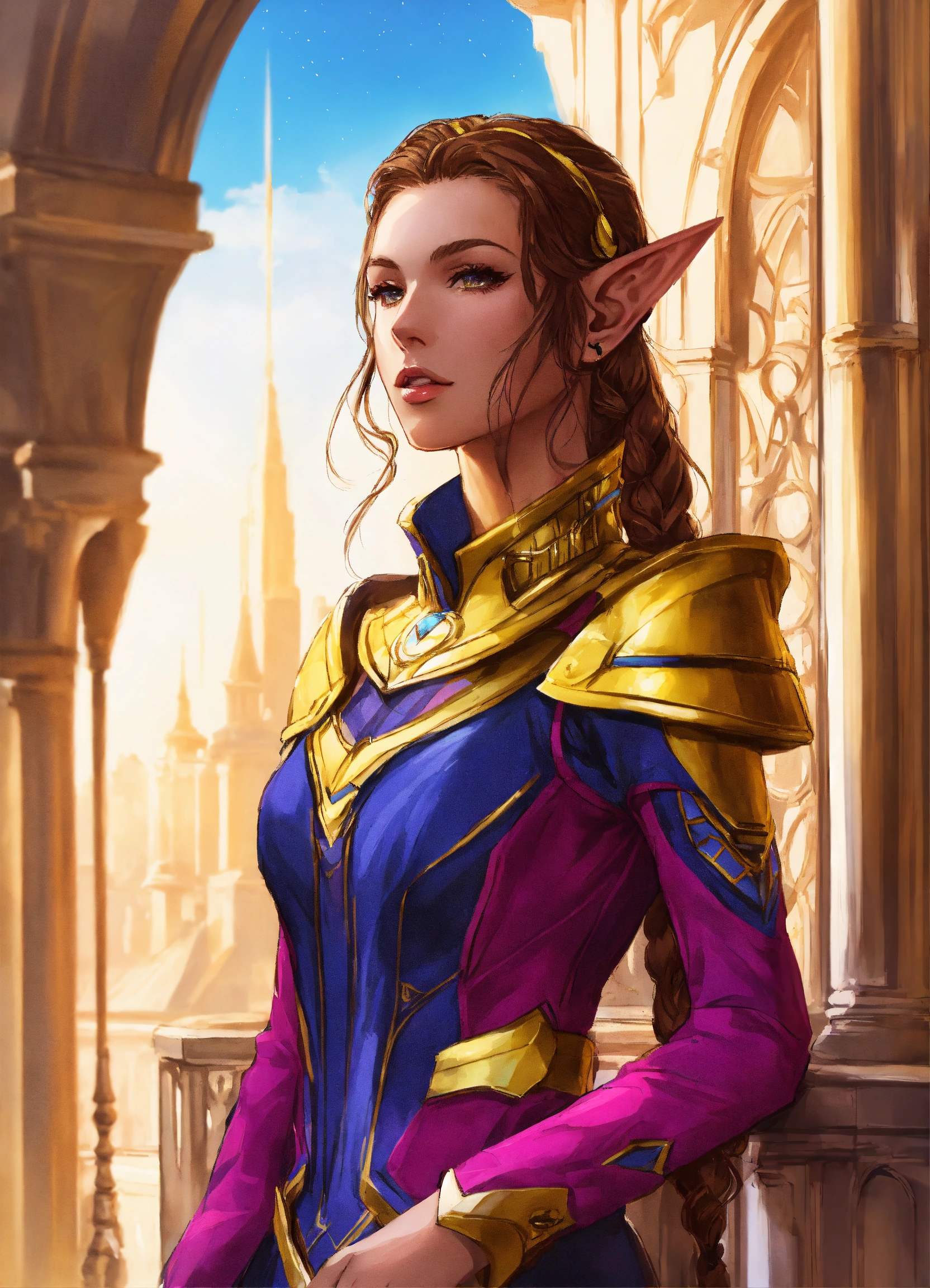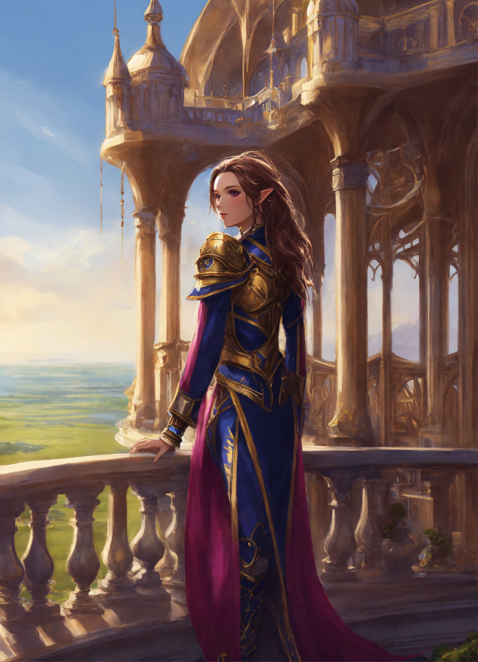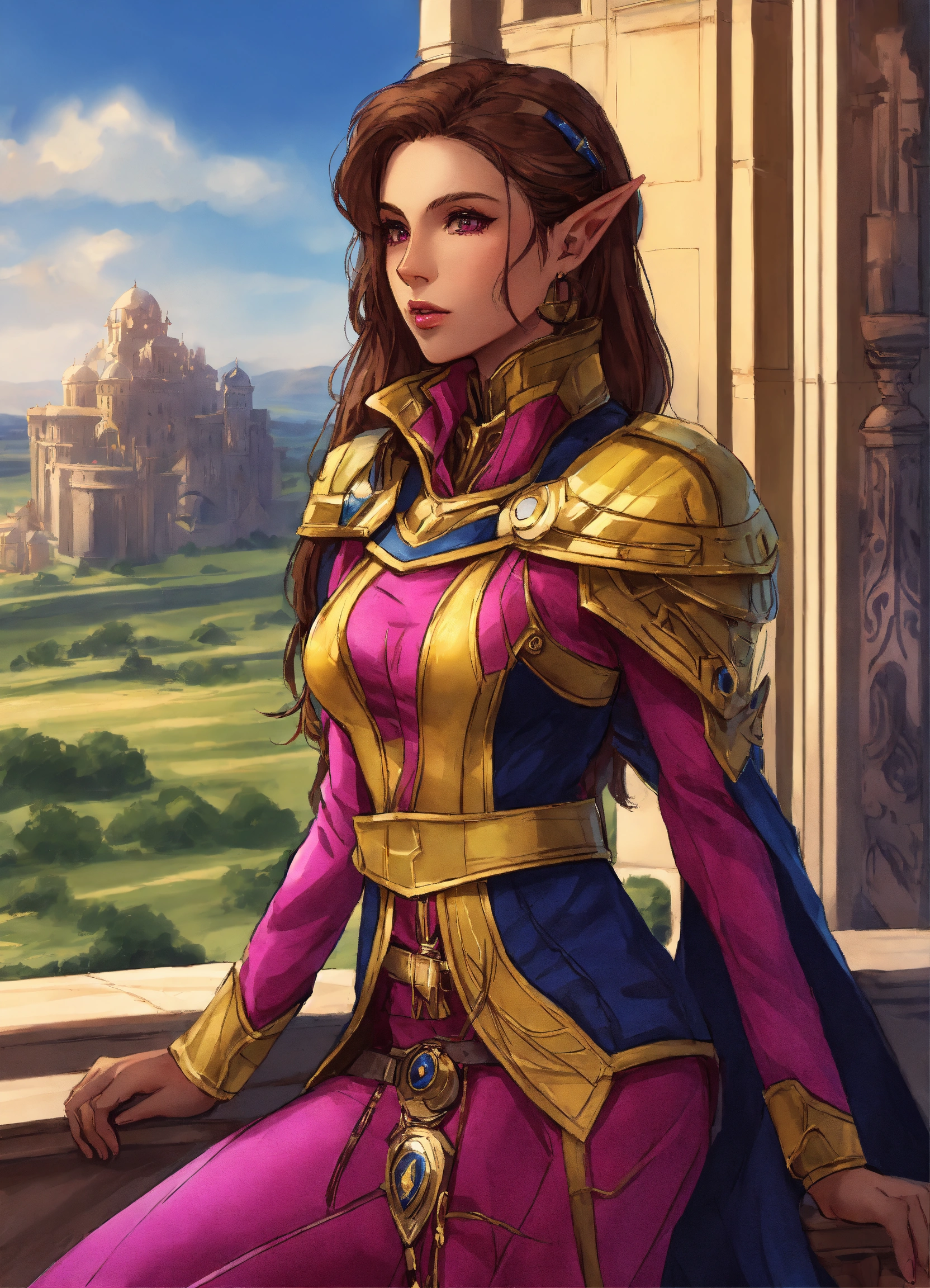 Drawing of an elf, royalty, sci fi, cybernetic, magenta and navy blue and yellow royal sci fi outfit, brown hair, standing on a palace balcony overlooking vast grasslands, beautiful, female high elf, 24 years old, elf ear