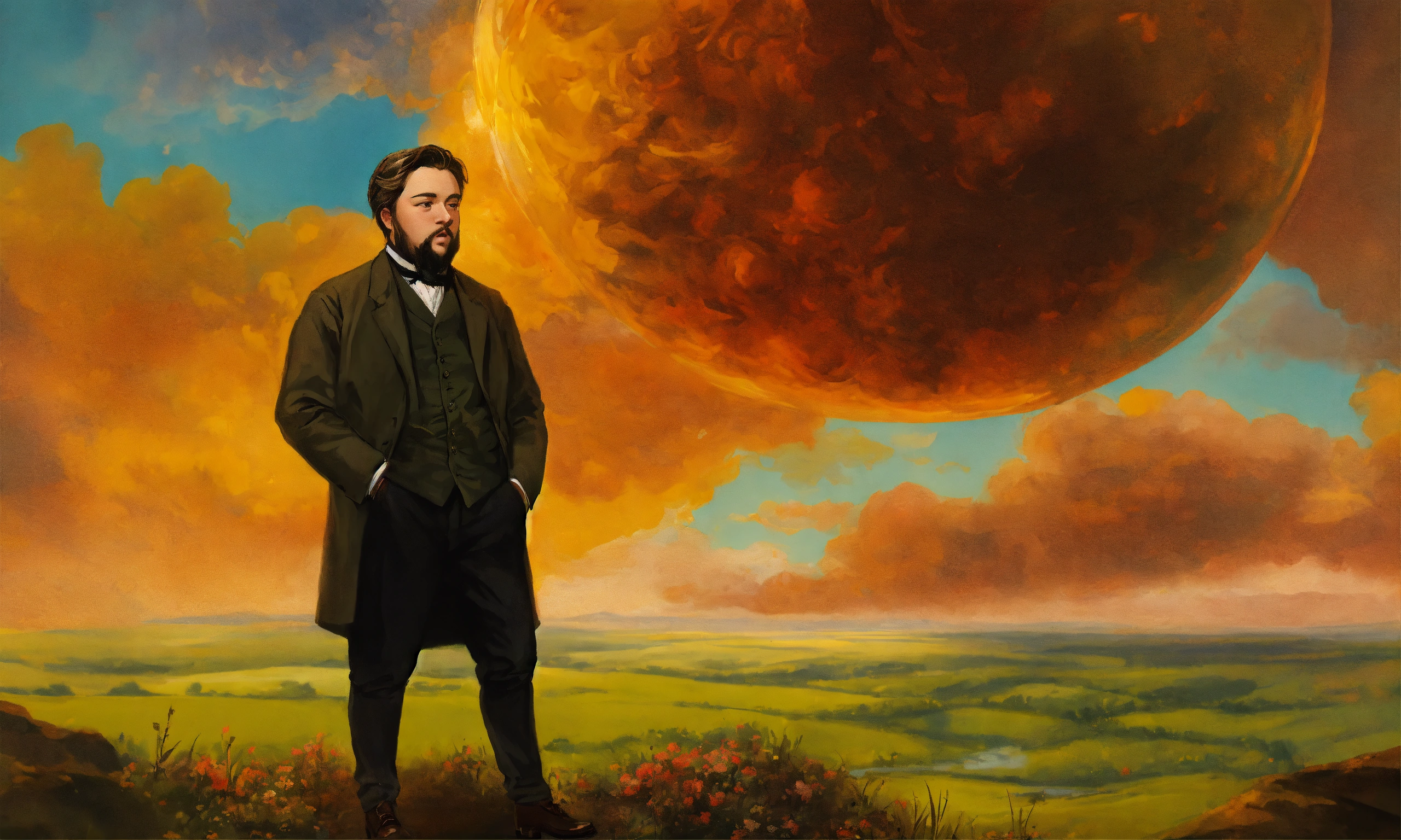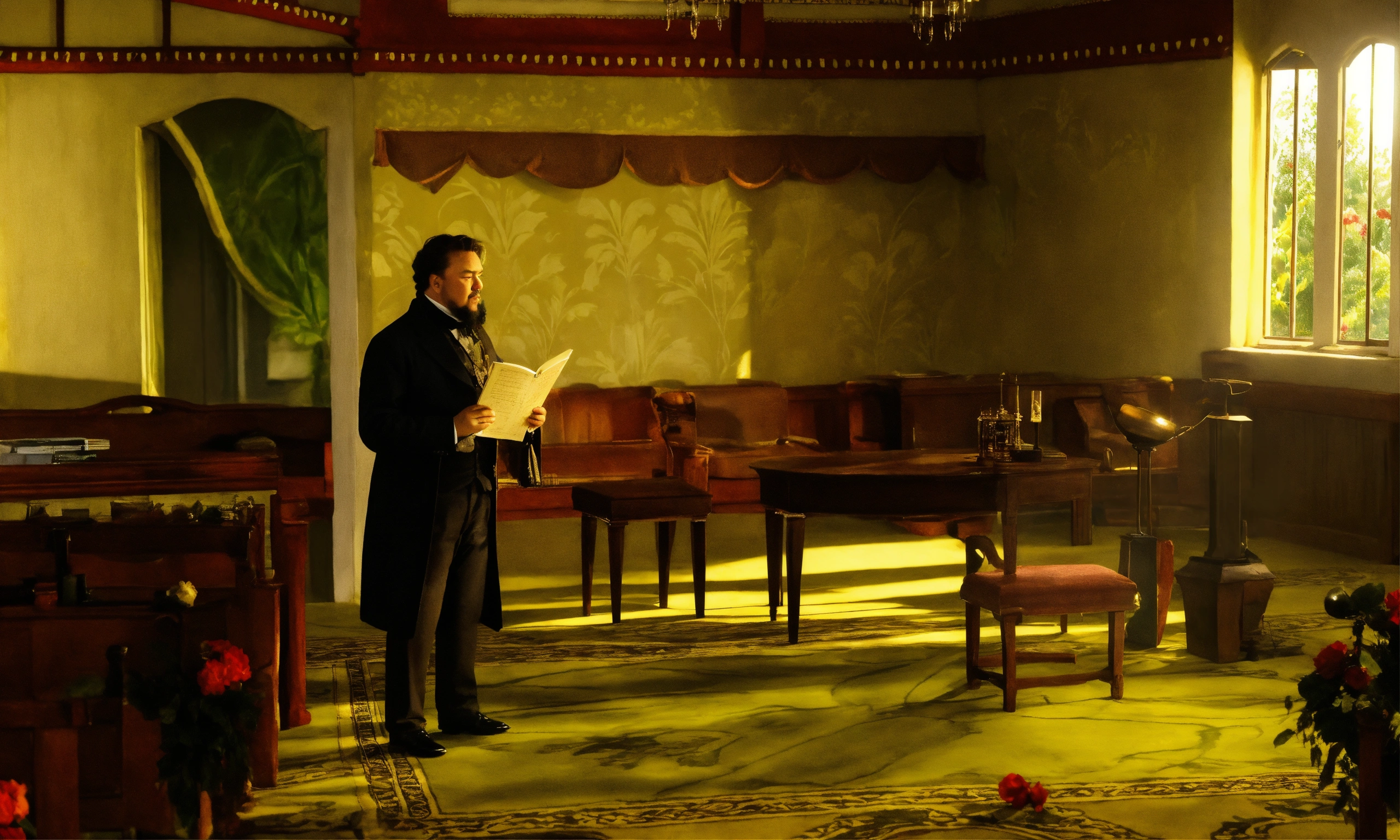 Desenhe uma ilustração vívida da conversão de charles spurgeon. inclua um jovem spurgeon, 15 anos, sentado sob a galeria em uma capela simples, olhando intensamente para um pregador leigo apontando em sua direção. o pregador, um homem comum, expressa fervor enquanto proclama isaías 4522. mostre uma bíblia aberta ou um pergaminho com o versículo visível. inclua detalhes como a neve visível através de uma janela aberta, indicando o clima rigoroso lá fora. certifique-se de que as expressões e o ambiente refletem um momento de revelação espiritual profunda.
