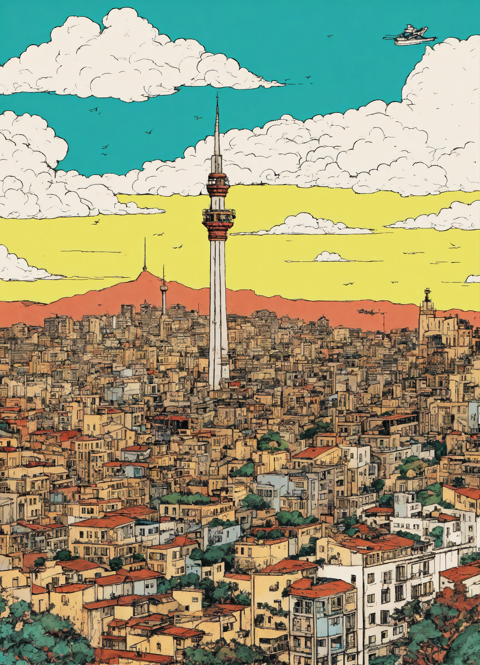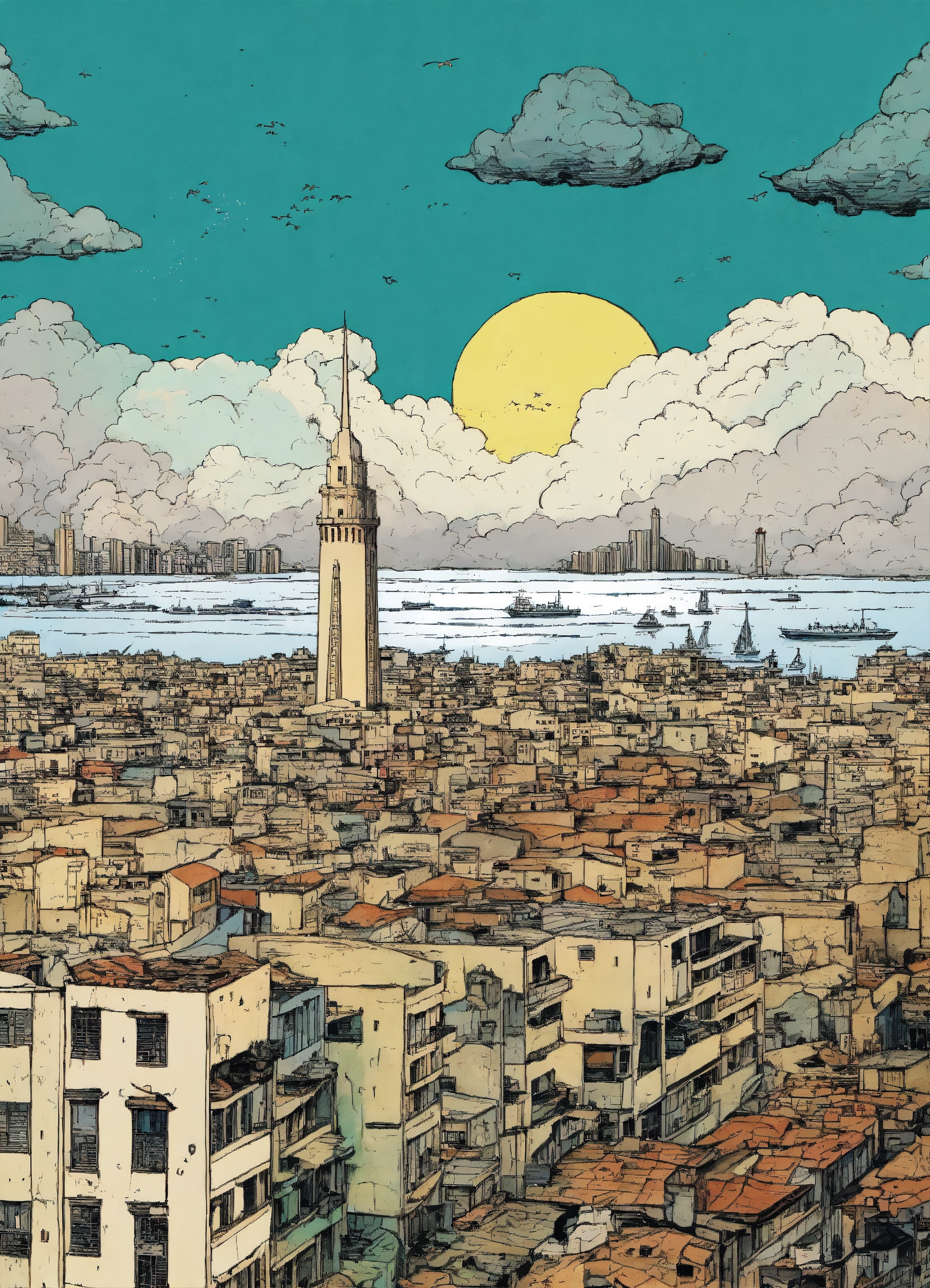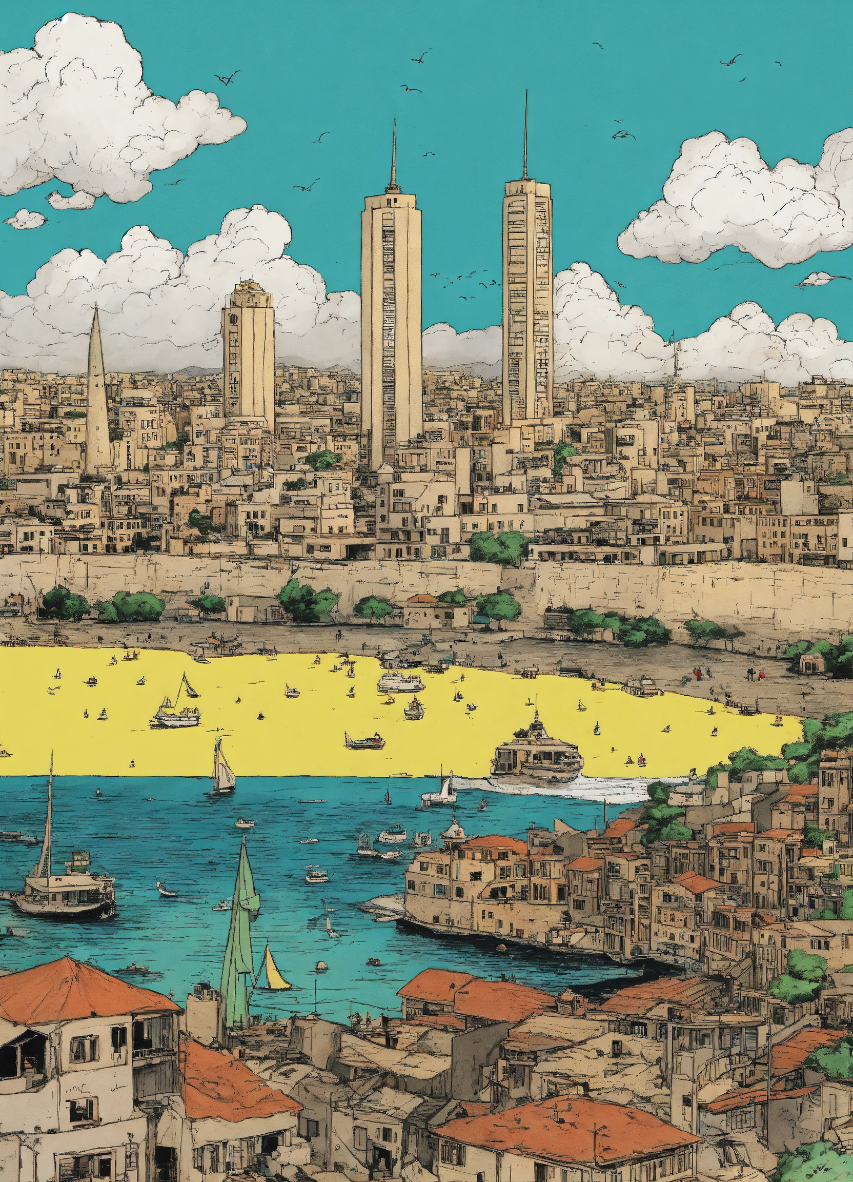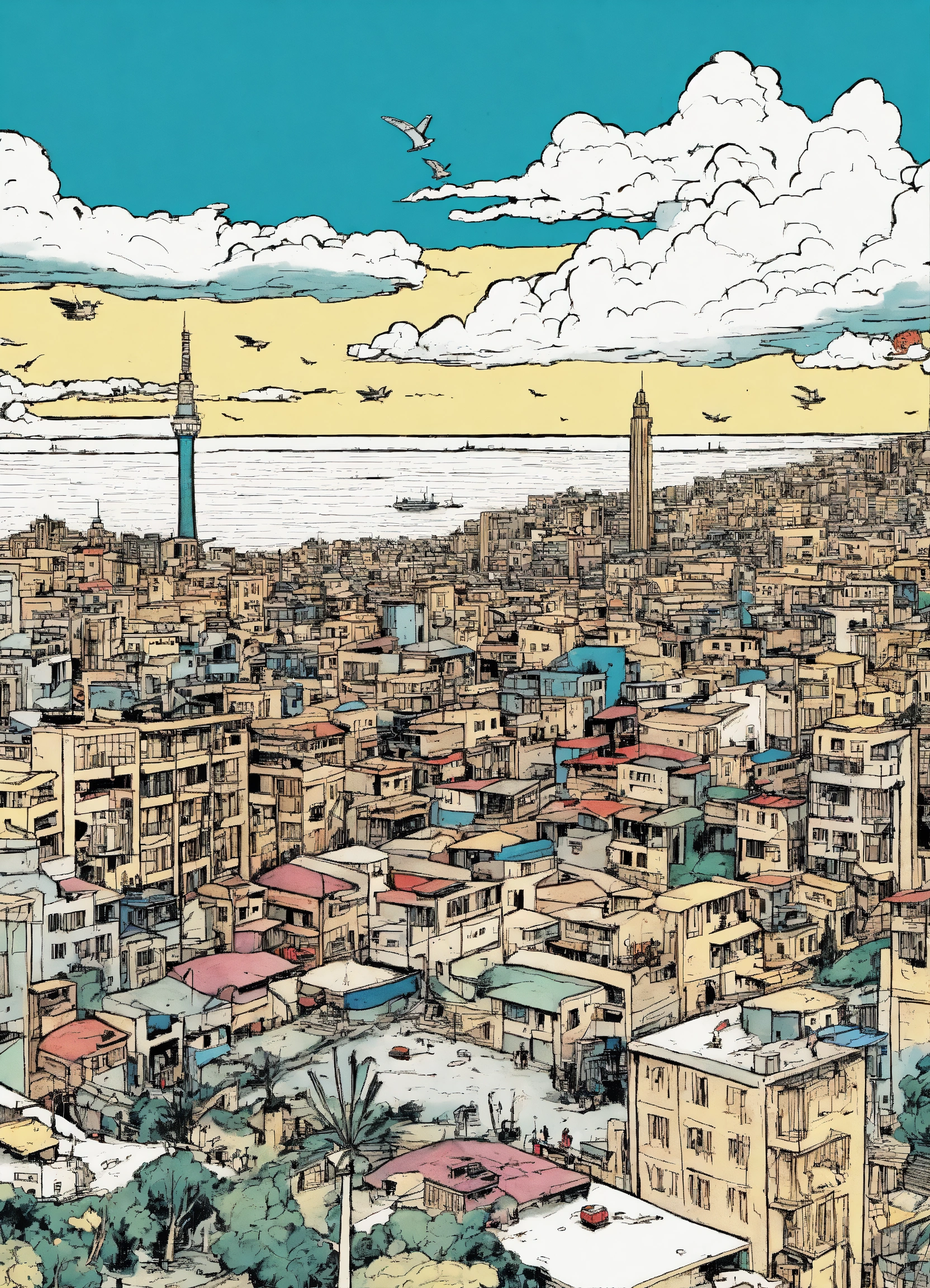 Chaotic stunning beirut city, skyline, illustrated by hergé, style of tin tin comics, pen and ink. vintage 90's anime style, black and white, colorful clouds, symmetric https//images.app.goo.gl/a6ejagpjbhecjsa68