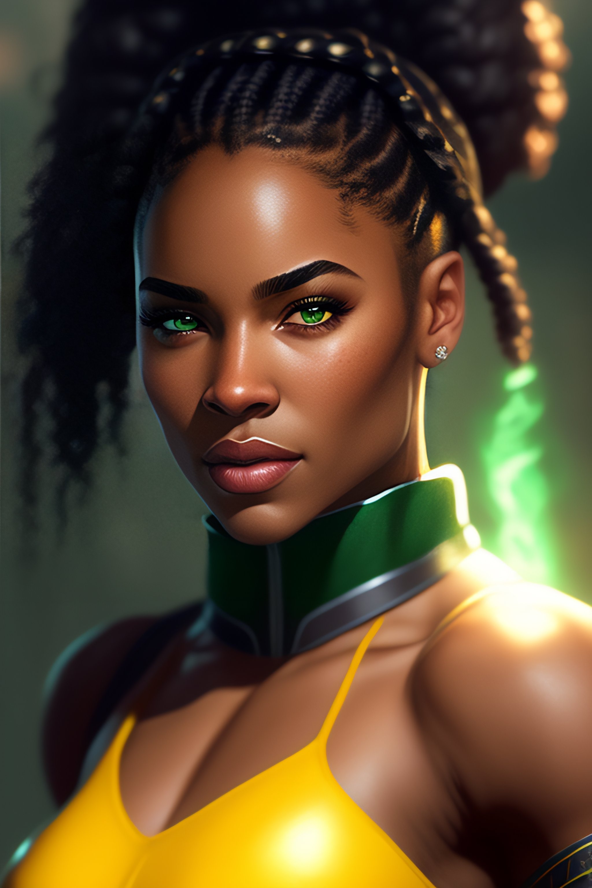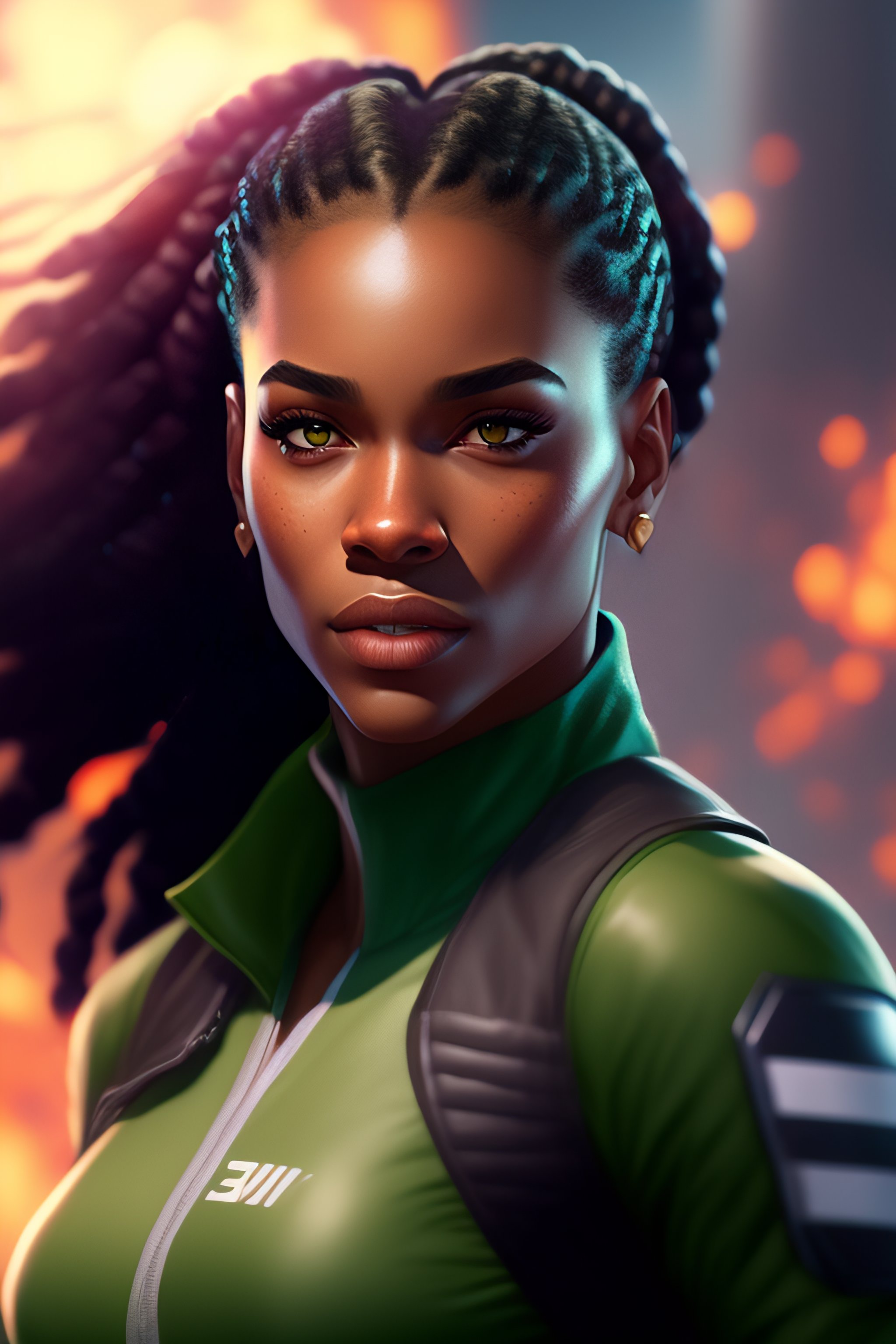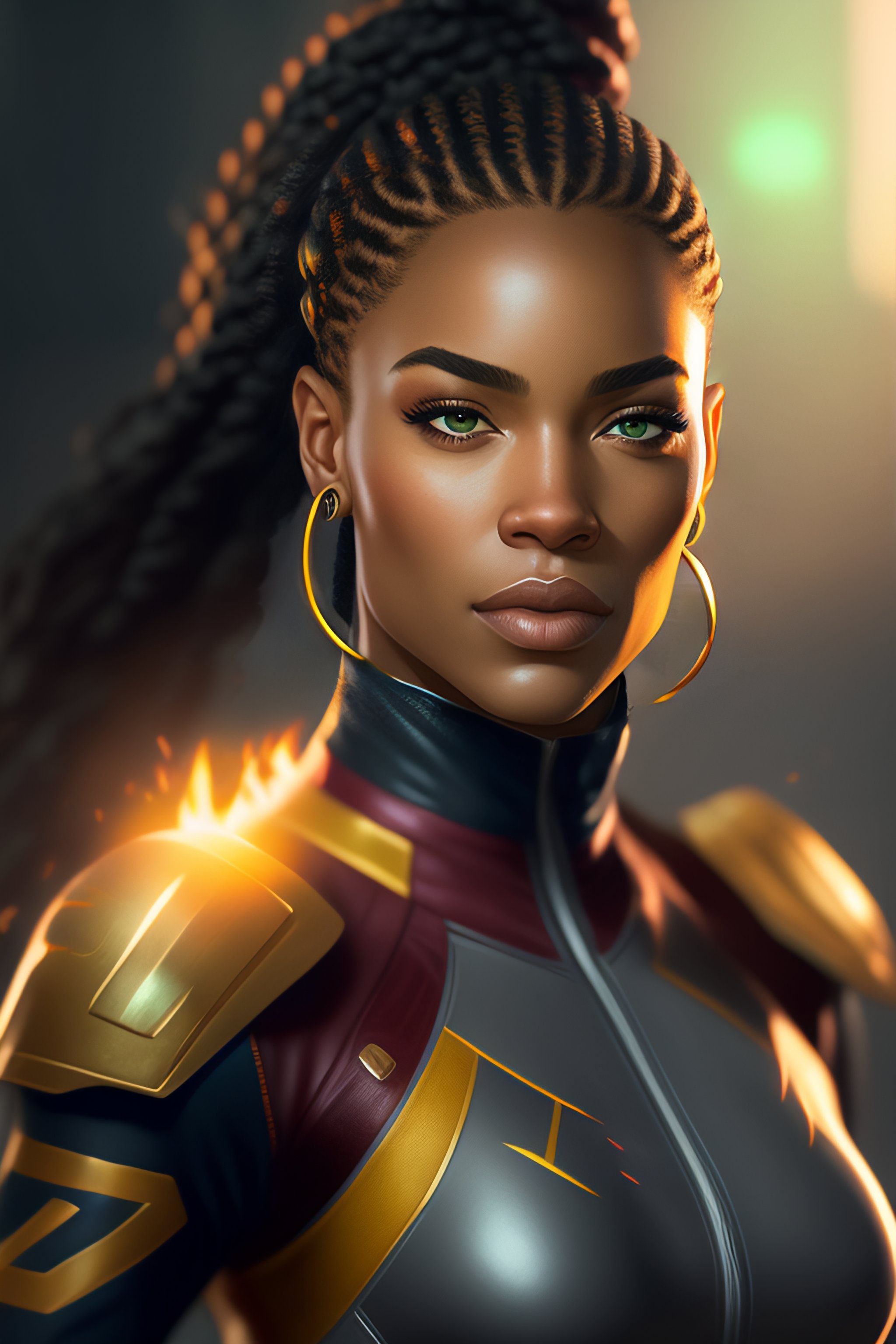 A confident and determined woman with light skin and braided cornrows. her green eyes are bright and full of life, and her smile is infectious. she stands at about 5'6" tall and has a muscular and athletic build. on her left cheek is a scar, given to her by her archenemy. nia is compassionate and caring towards those she loves, but can be reckless and stubborn at times. she is determined to protect her community and use her powers for good. in her free time, nia enjoys training and improving her powers, reading, and spending time with friends. nia has the power of pyrokinesis, the ability to generate and control fire with her mind, as well as enhanced strength and durability. artstation, concept art, sharp focus, by greg rutkowski, craig mullins, artgerm, full body, cinematic, facing camera