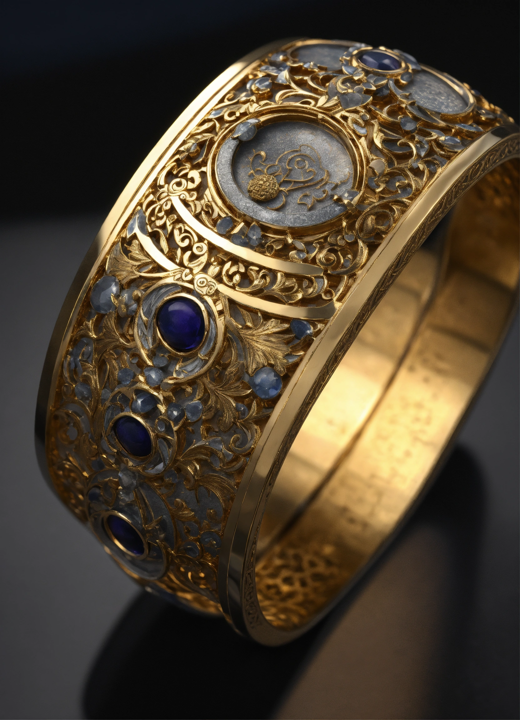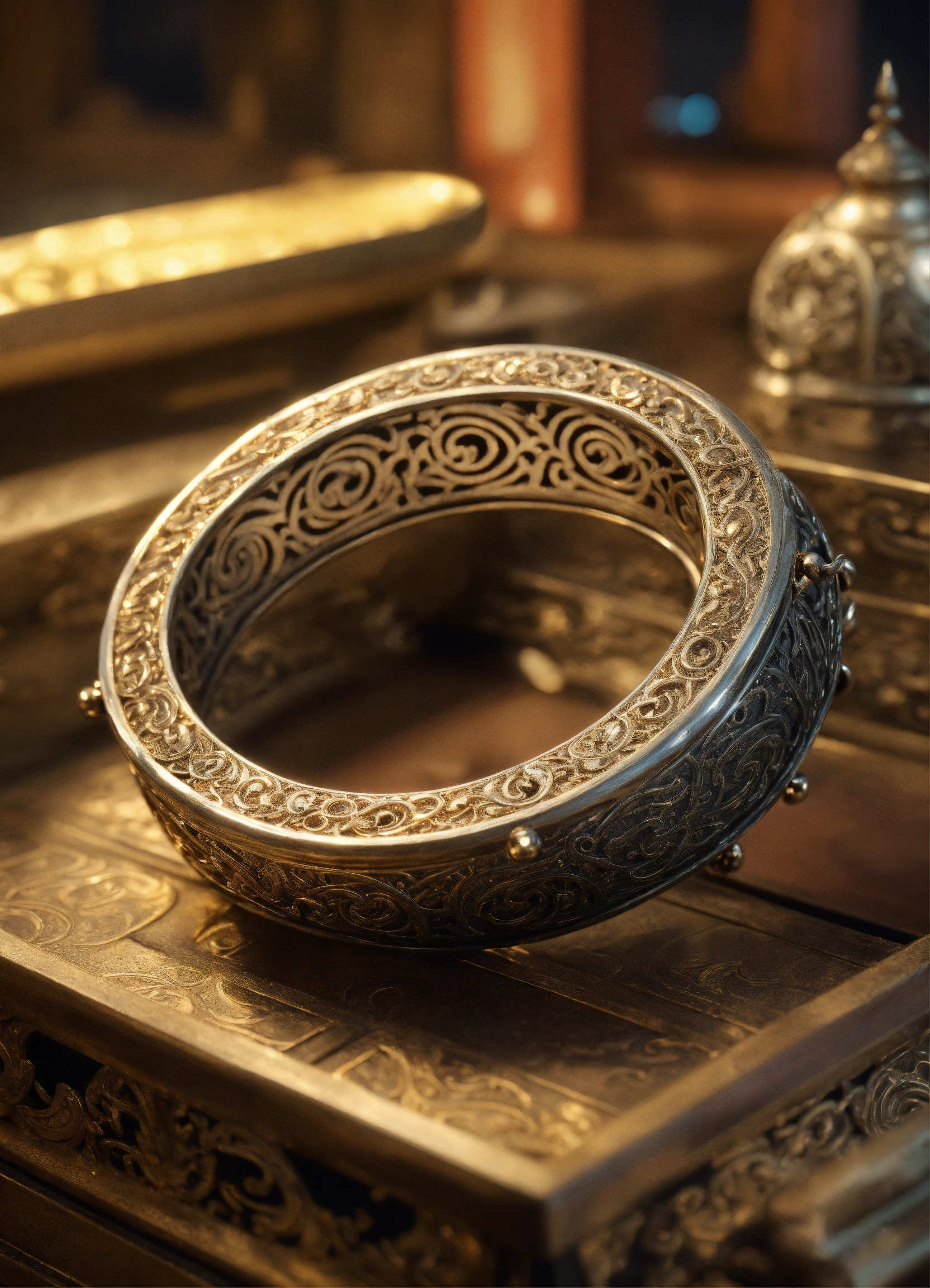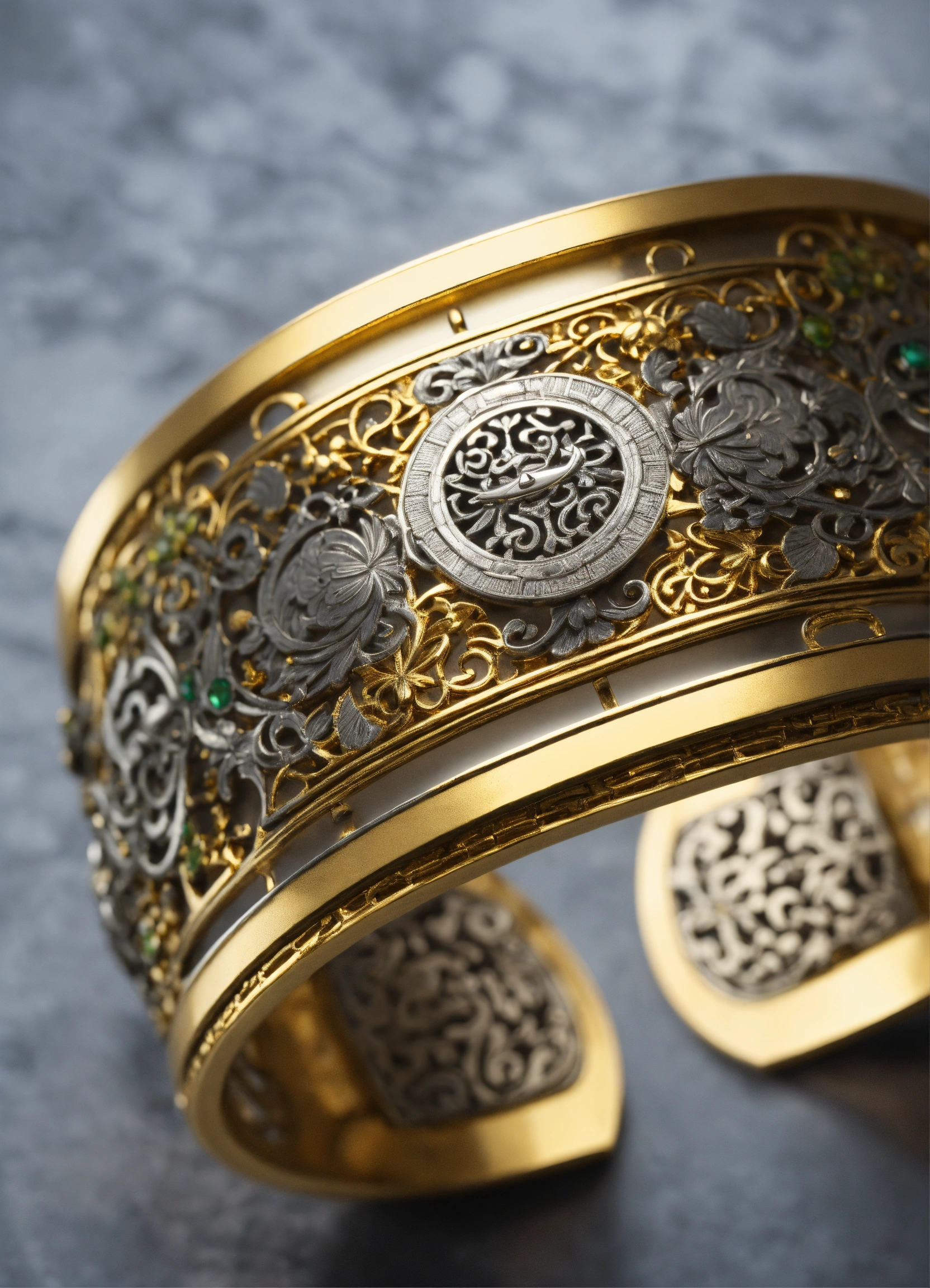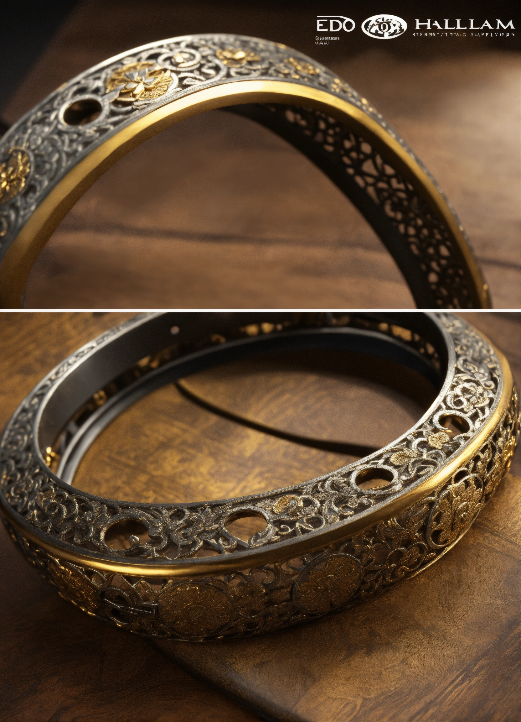 Edo period bracelet, ford hallam style, shibuichi, tsuba, iron, silver, silver material, artstation, concept art, sharp focus, intricate lines and hard edges, symmetry, hyper detailed, intricate, ornate, elegant, dramatic lighting, hypermaximalist, golden ratio, micro details, 3d sculpture, ray tracing