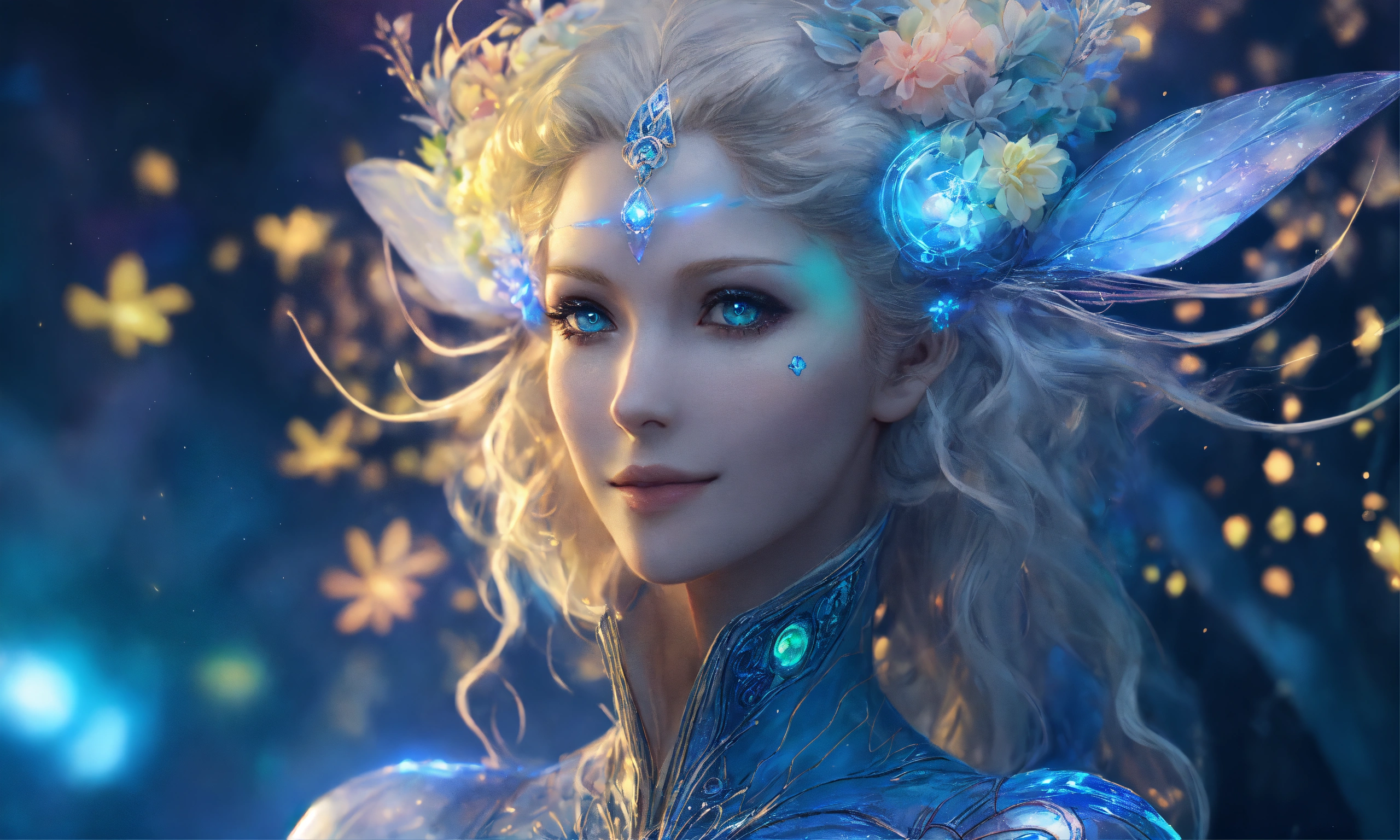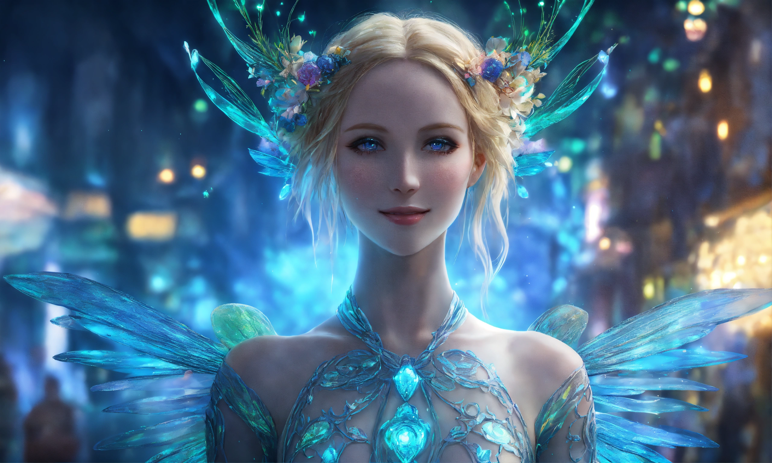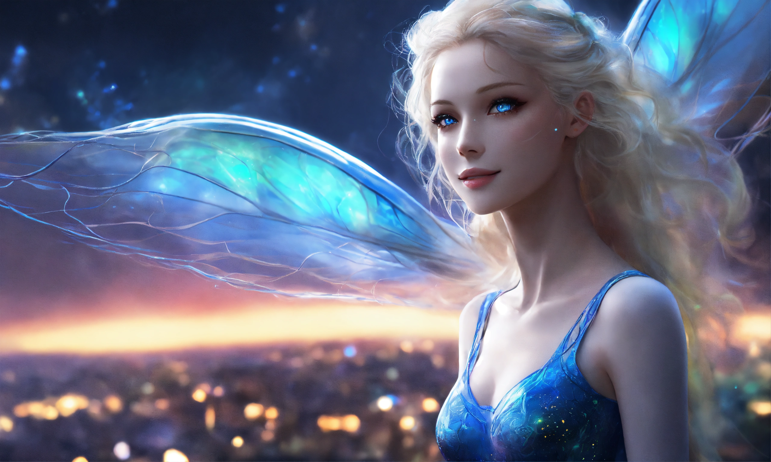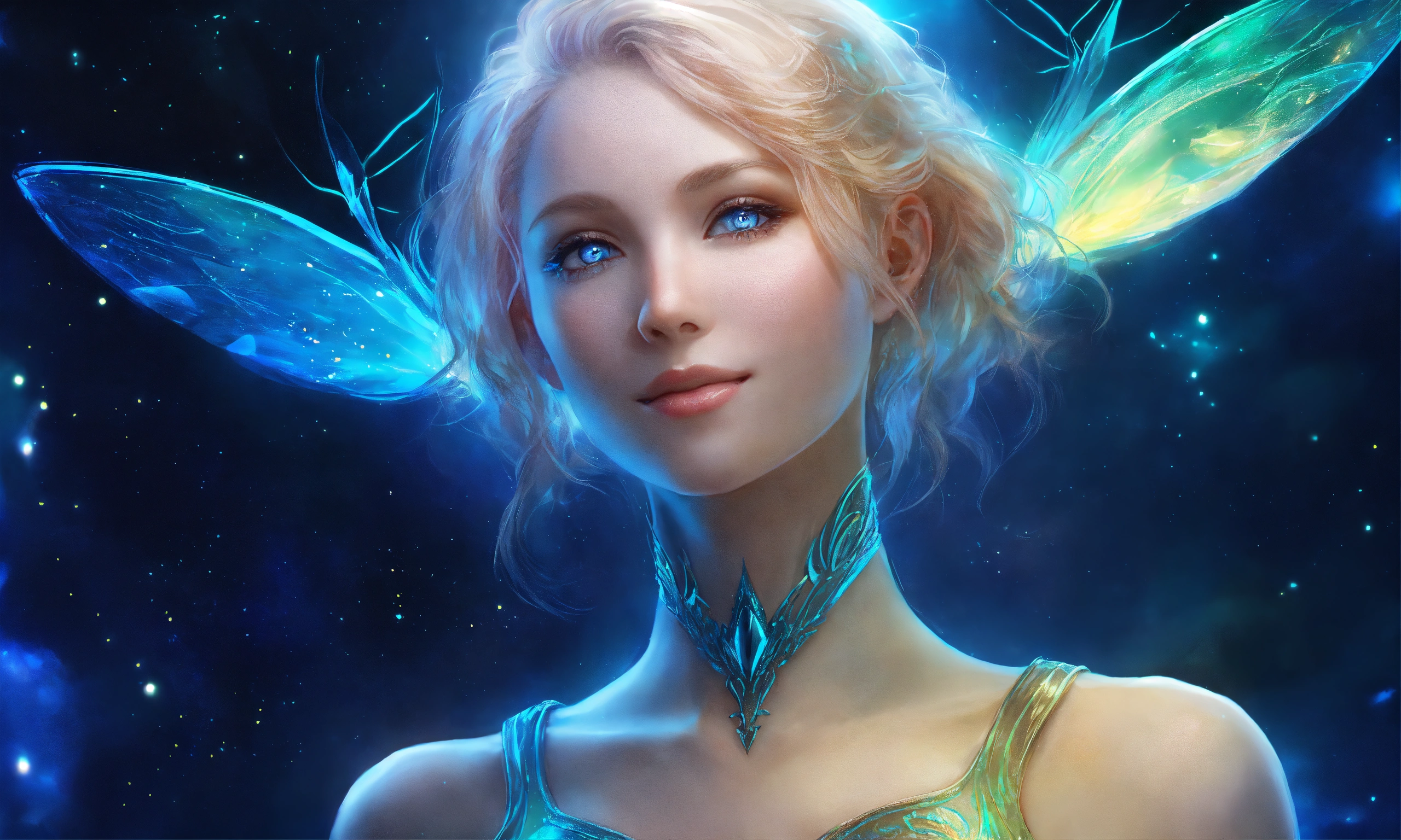 Beautiful full body woman smiling alien with a luminous, ethereal appearance. her skin is a soft, iridescent blue, and she has large, expressive eyes that shimmer like stars. her hair is blond and long, glowing filaments that change color based on her emotions and surroundings. she has delicate, bioluminescent wings that allow her to glide gracefully through the air.