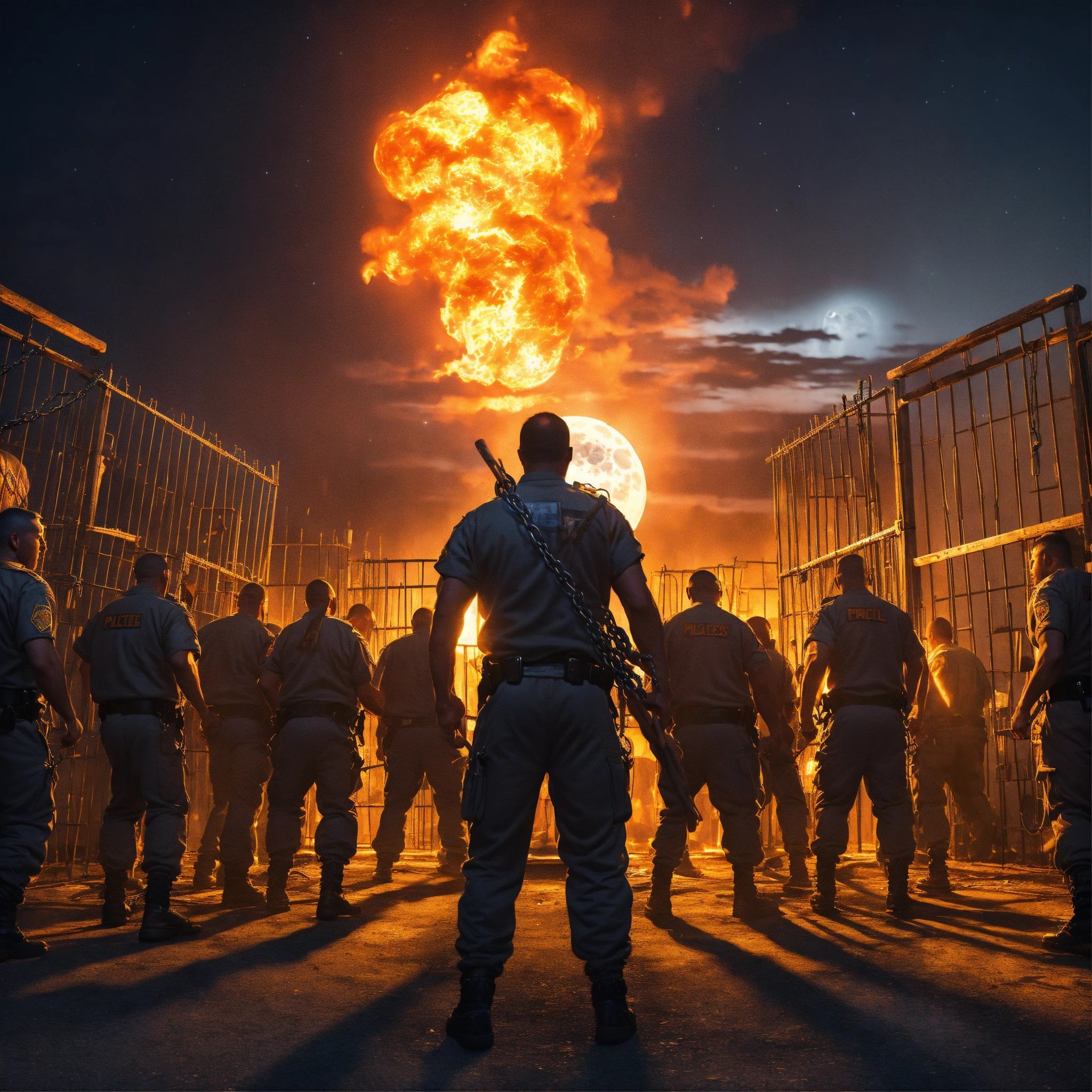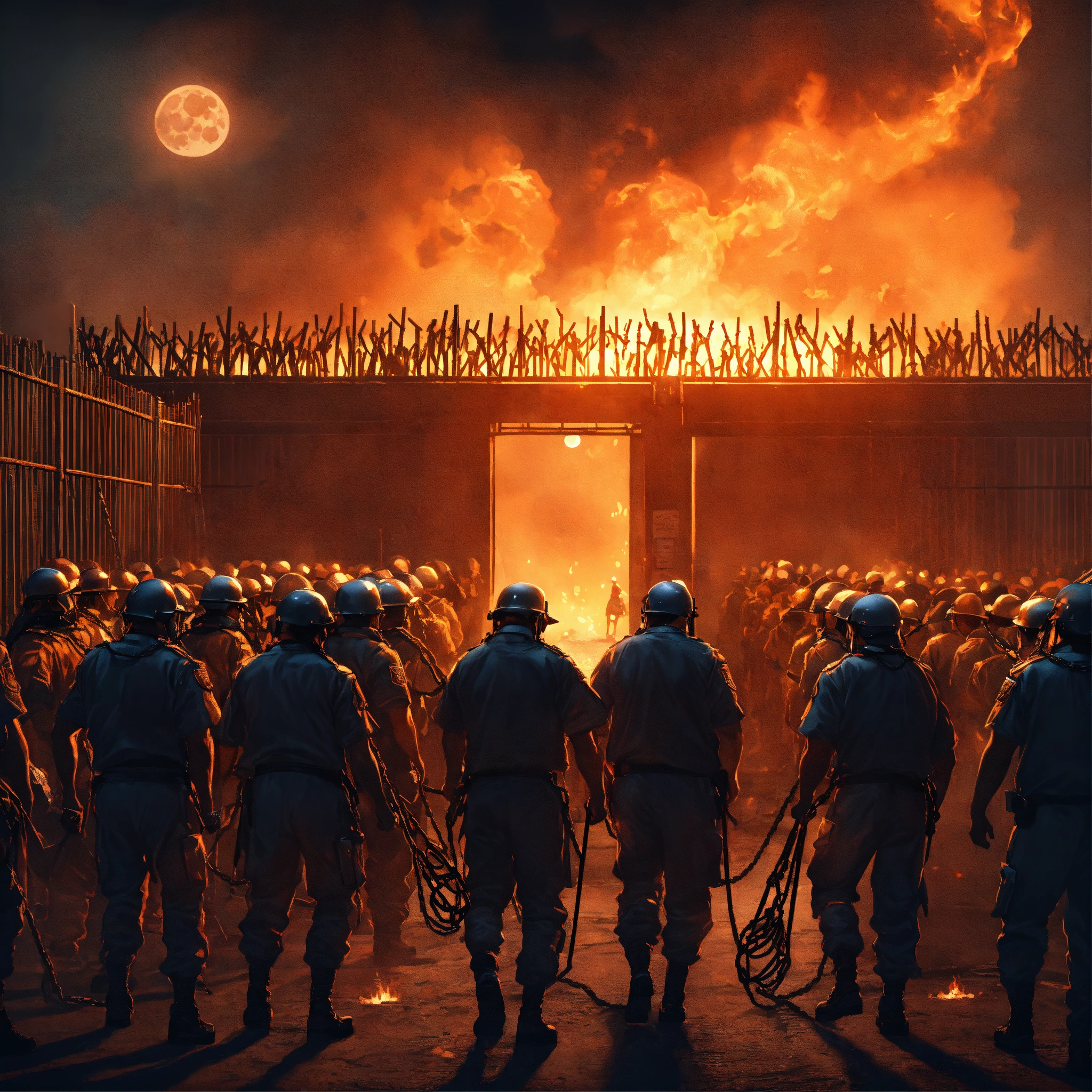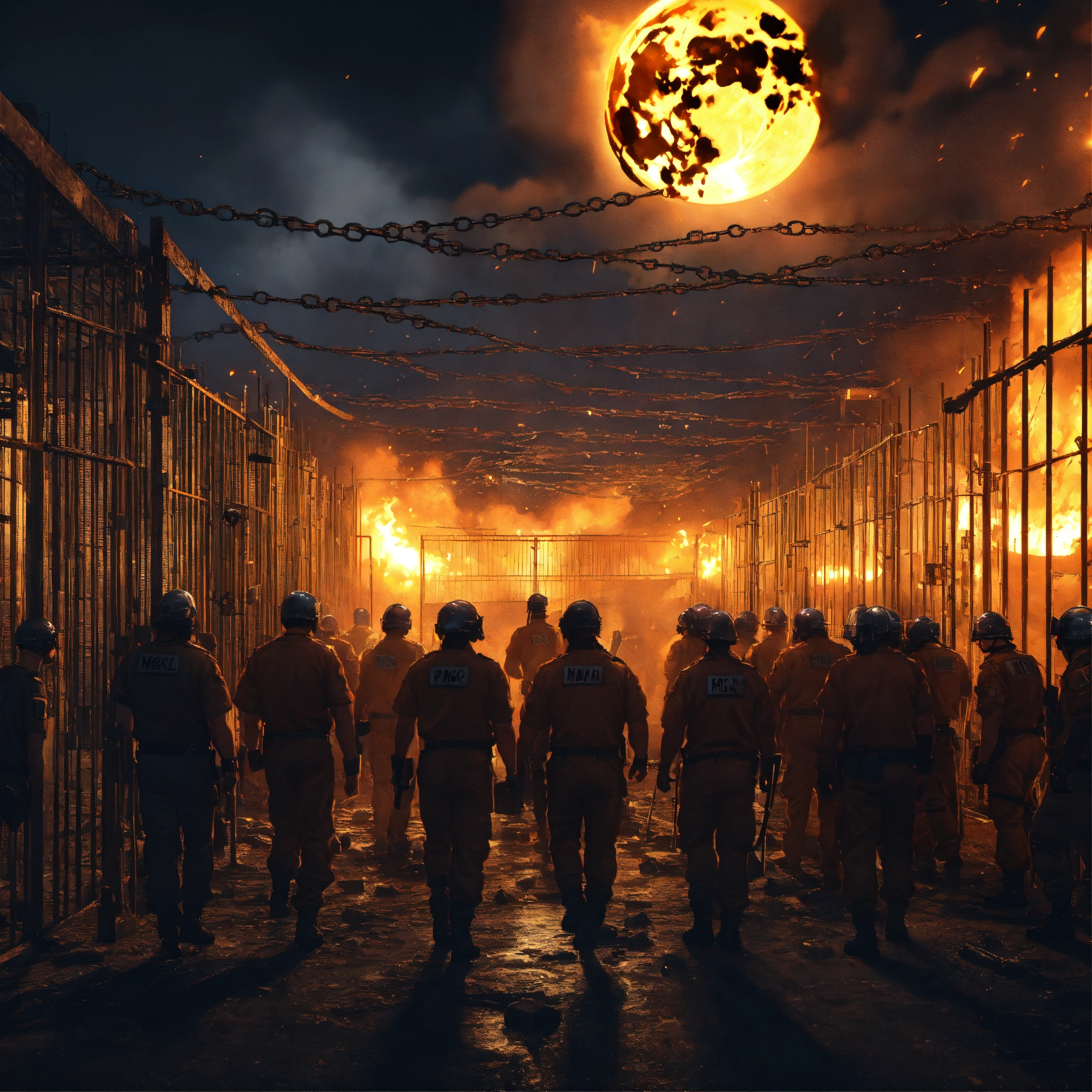 Aereal portrait of a riot in prison, mass of prisoners, violence, prisoners holding sticks and chains, dark sky background, ultra realistic, highly detailed, photorealistic, octane render, 8 k, unreal engine. art by artgerm and jim lee, night time, full moon, flames
