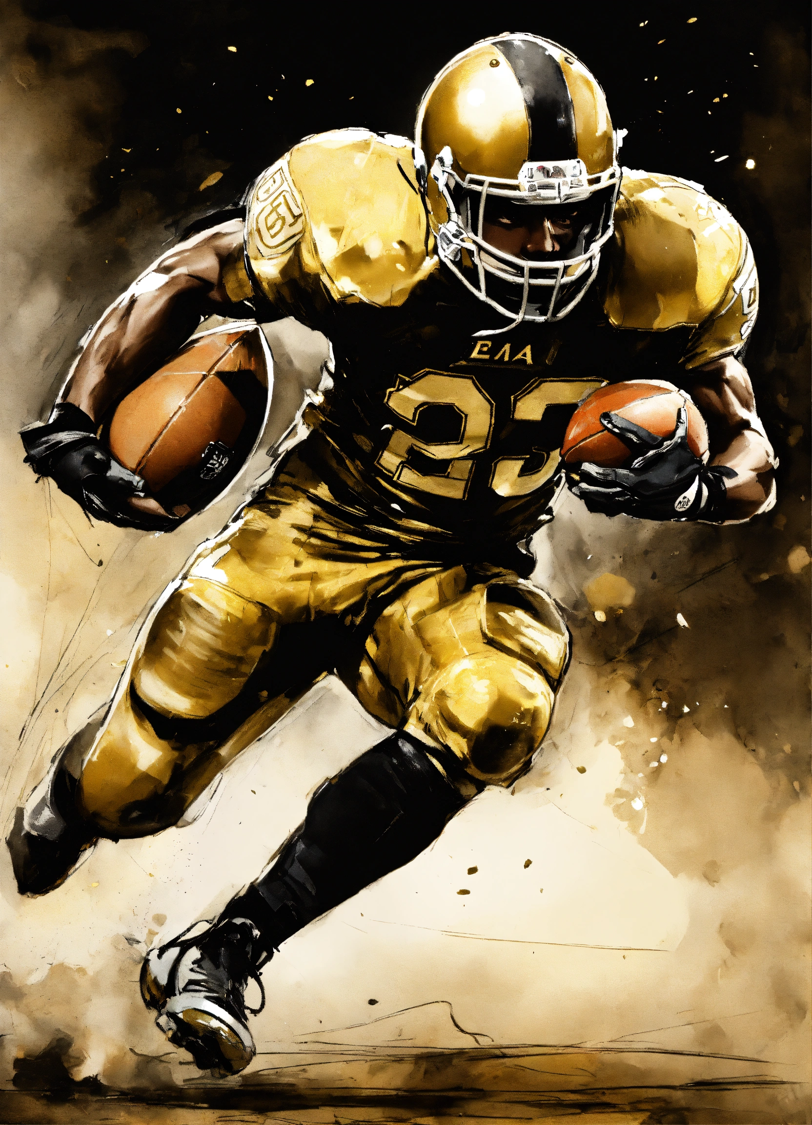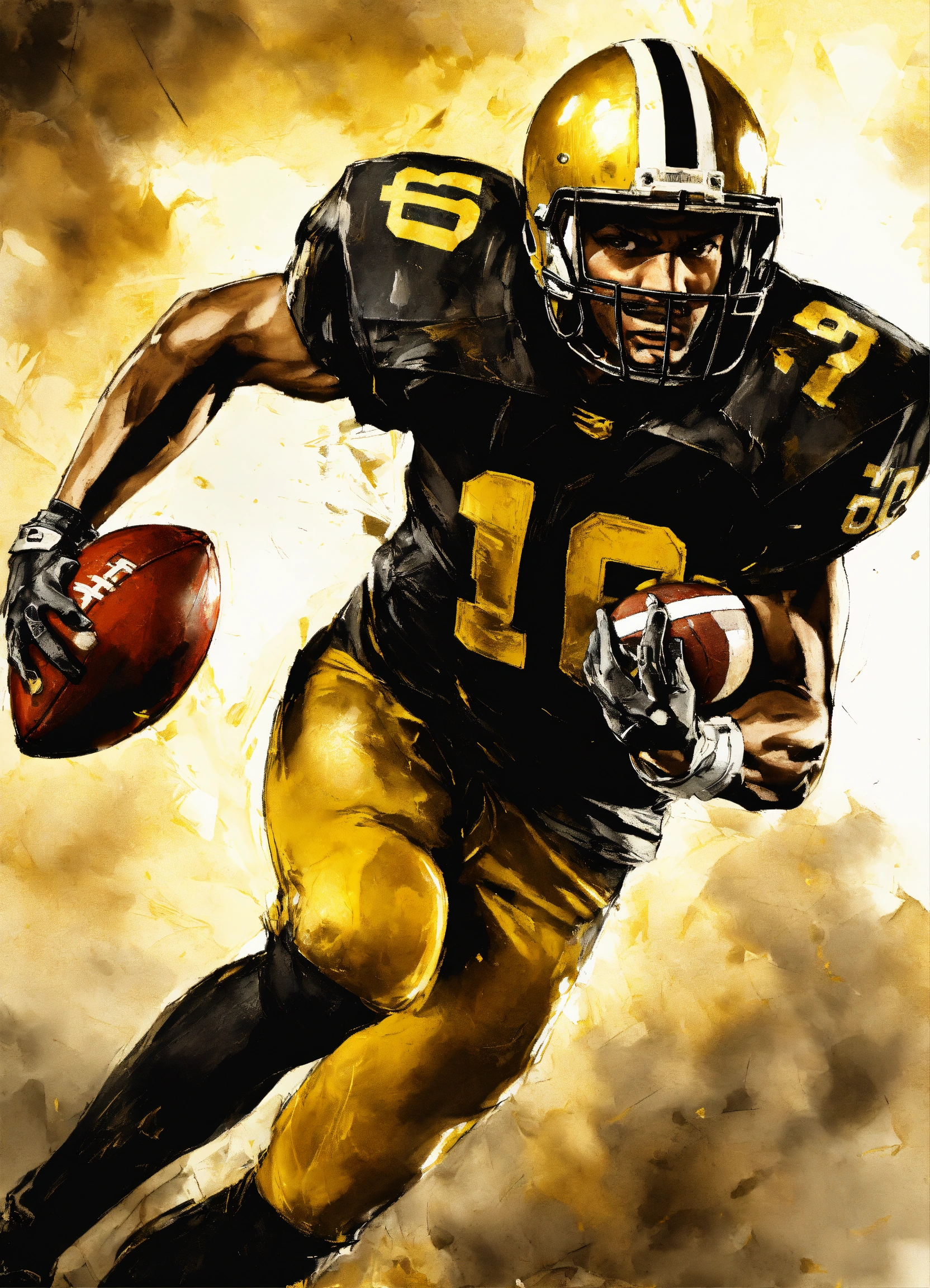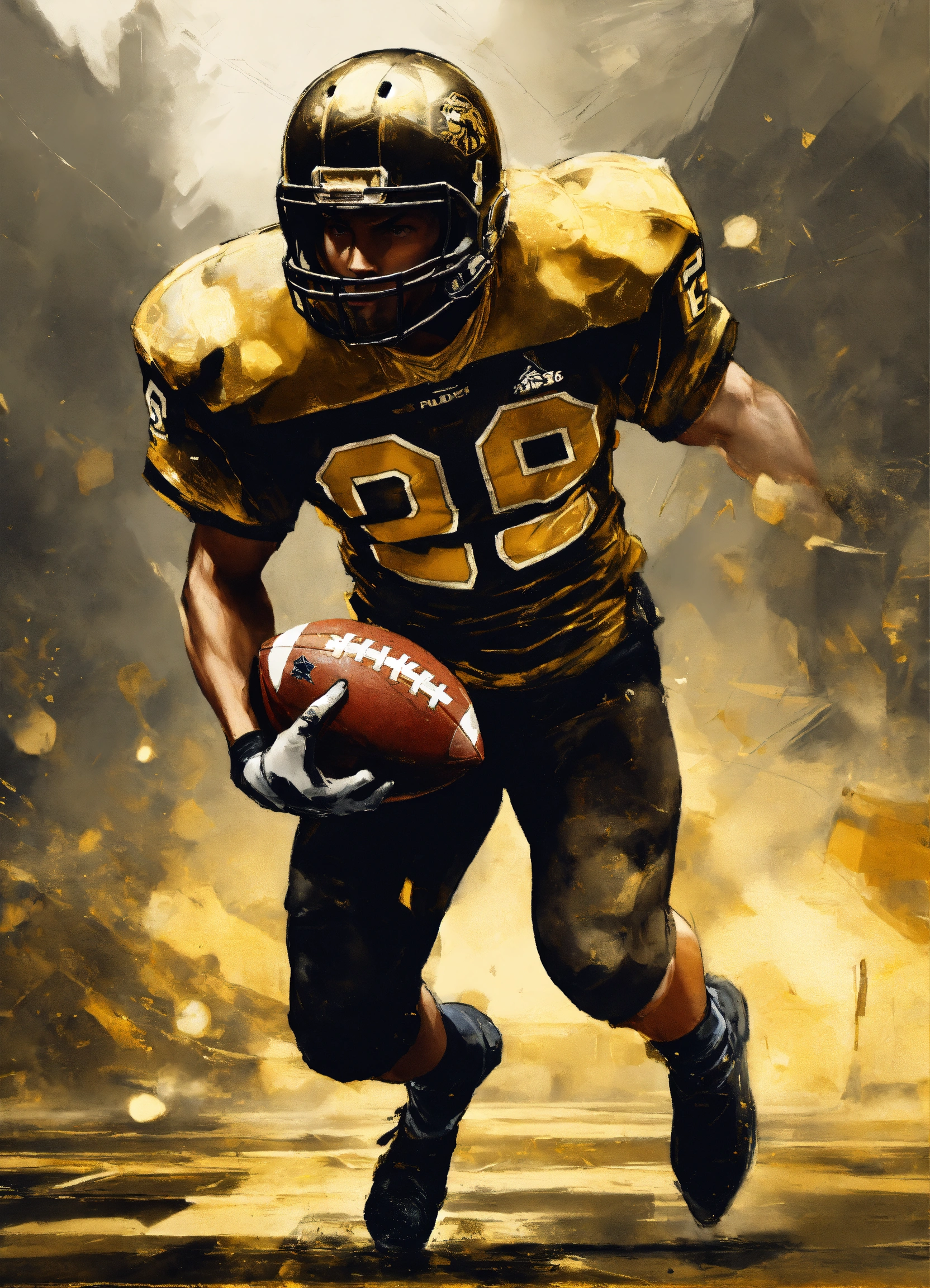 Full photo shot of an american football player carrying a football while running over opponent, yoji shinkawa style, jean-baptiste monge, balanced composition, entirely on a sheet, concept art, studio lighting, old gold, (white1.3), old gold and black, stylize, intricate detail, 32k, transparent background, (black, old gold background1.4), 3d vectors, graphic poster --ar 169 --seed 778899