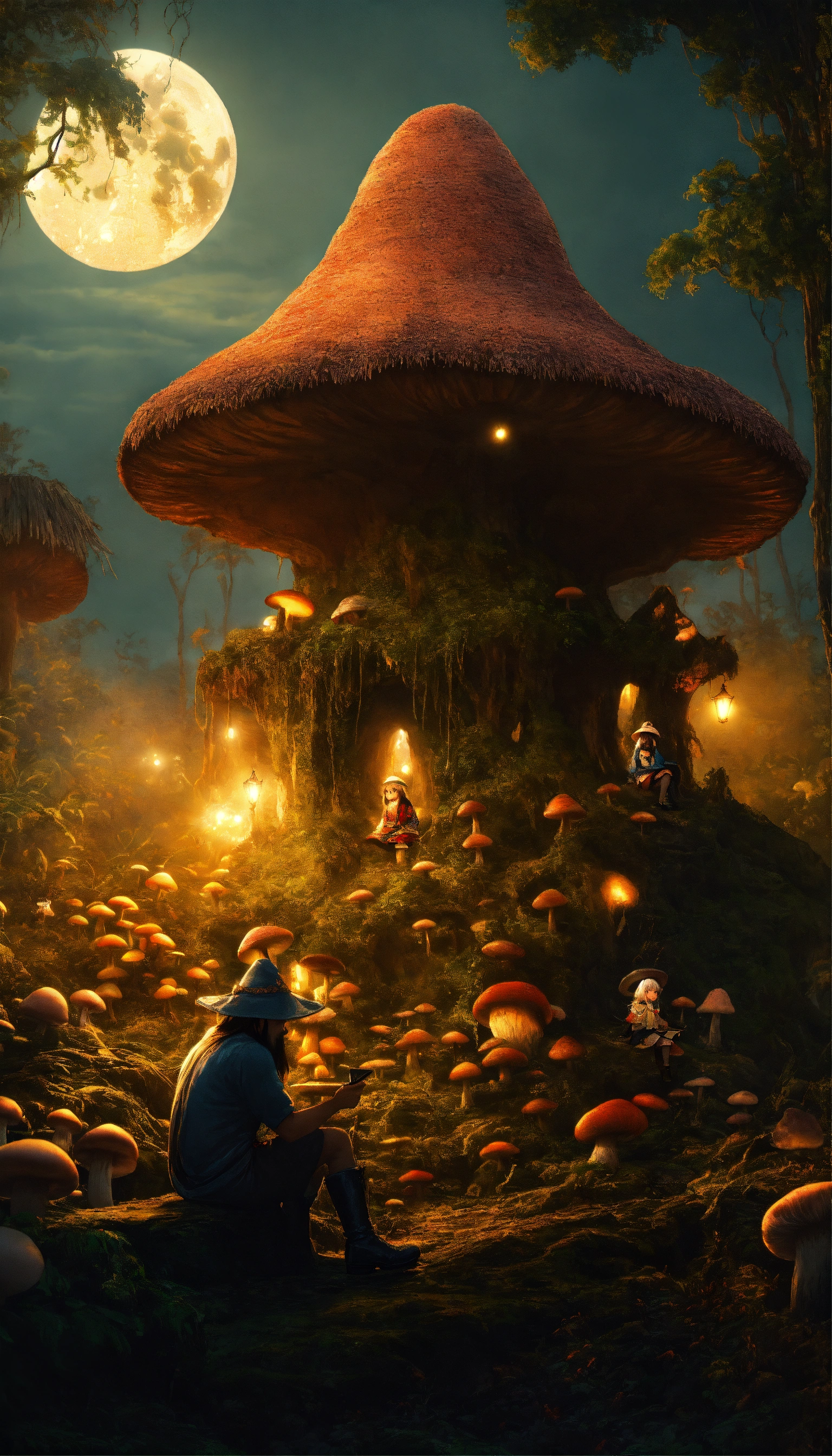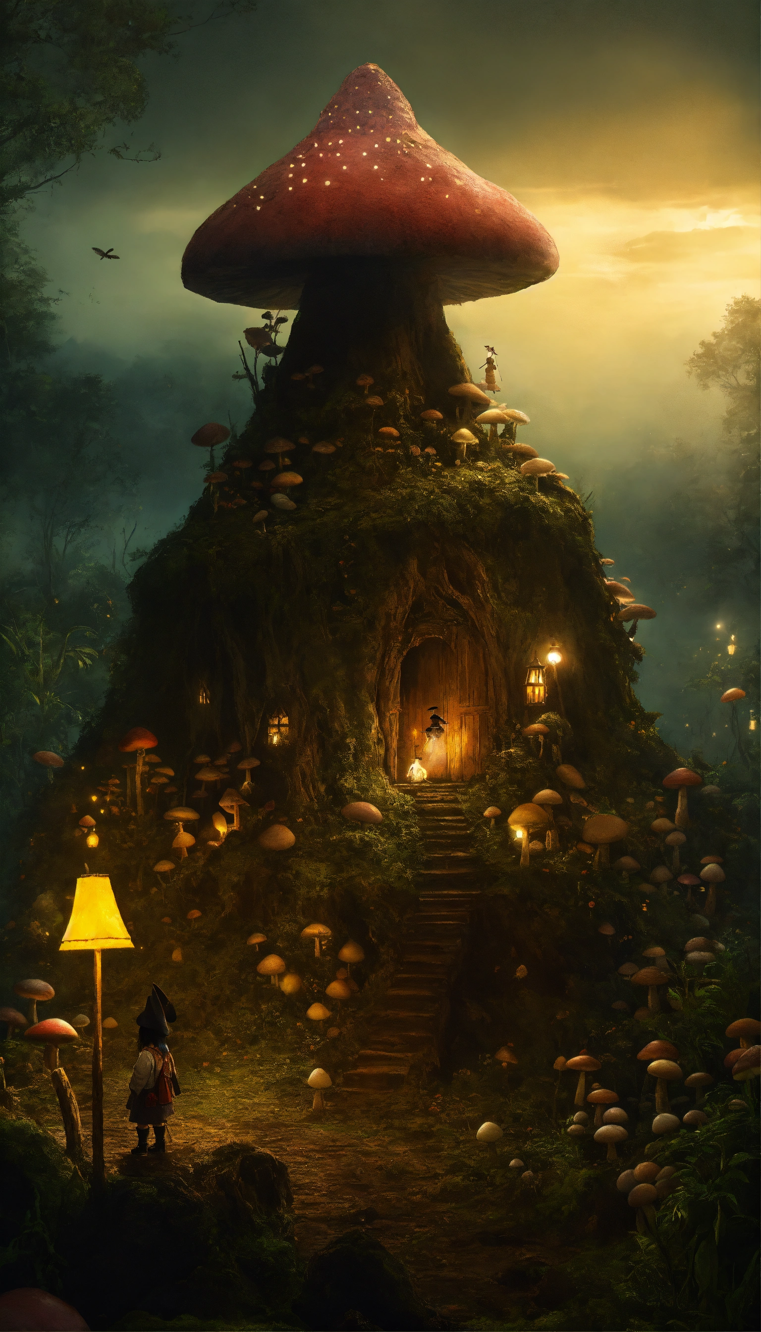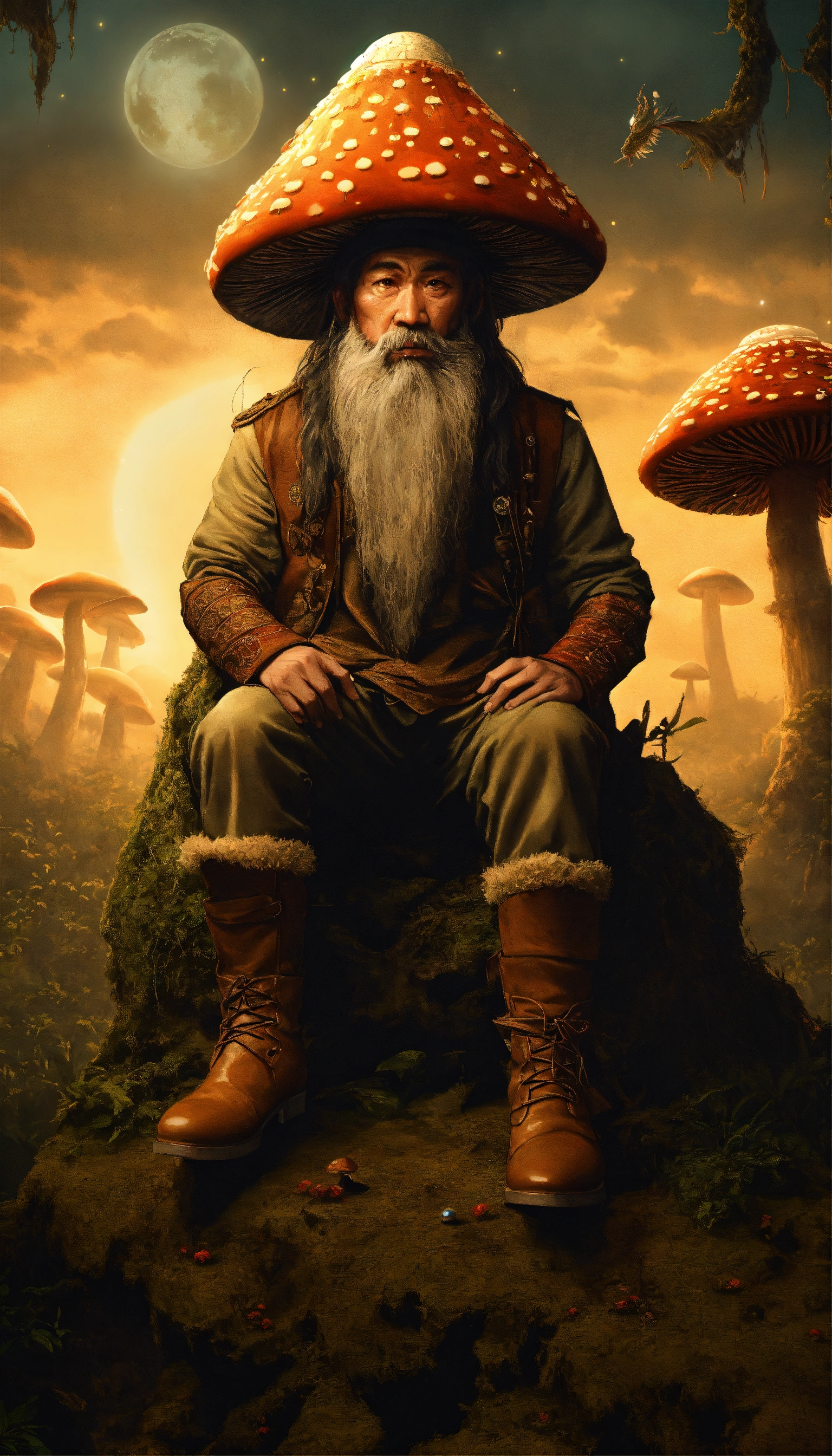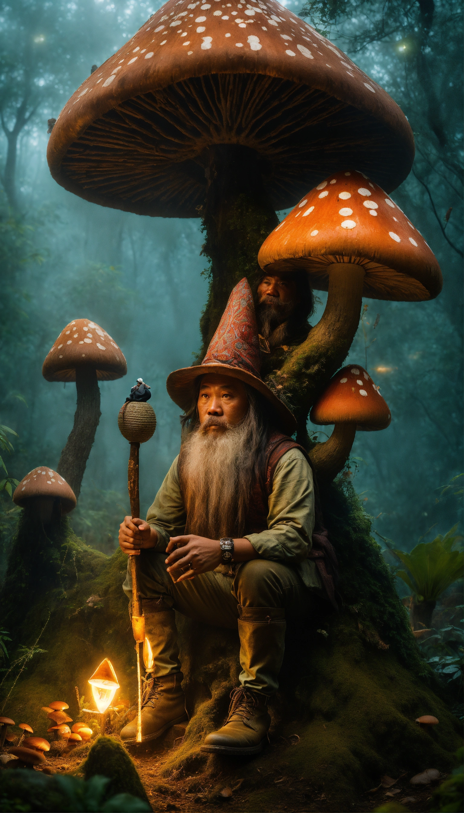 Scary philippines duwende, nuno sa punso, tiny dwarf being with long beard, wearing a salukot hat, wearing pointed boots, sitting on a termite mound, with big mushrooms surrounded the place, night light, foggy weather, intricate, fantasy, with orbs of light, with fairy's on background, trees, and other mythical creature from philippines, cinematic