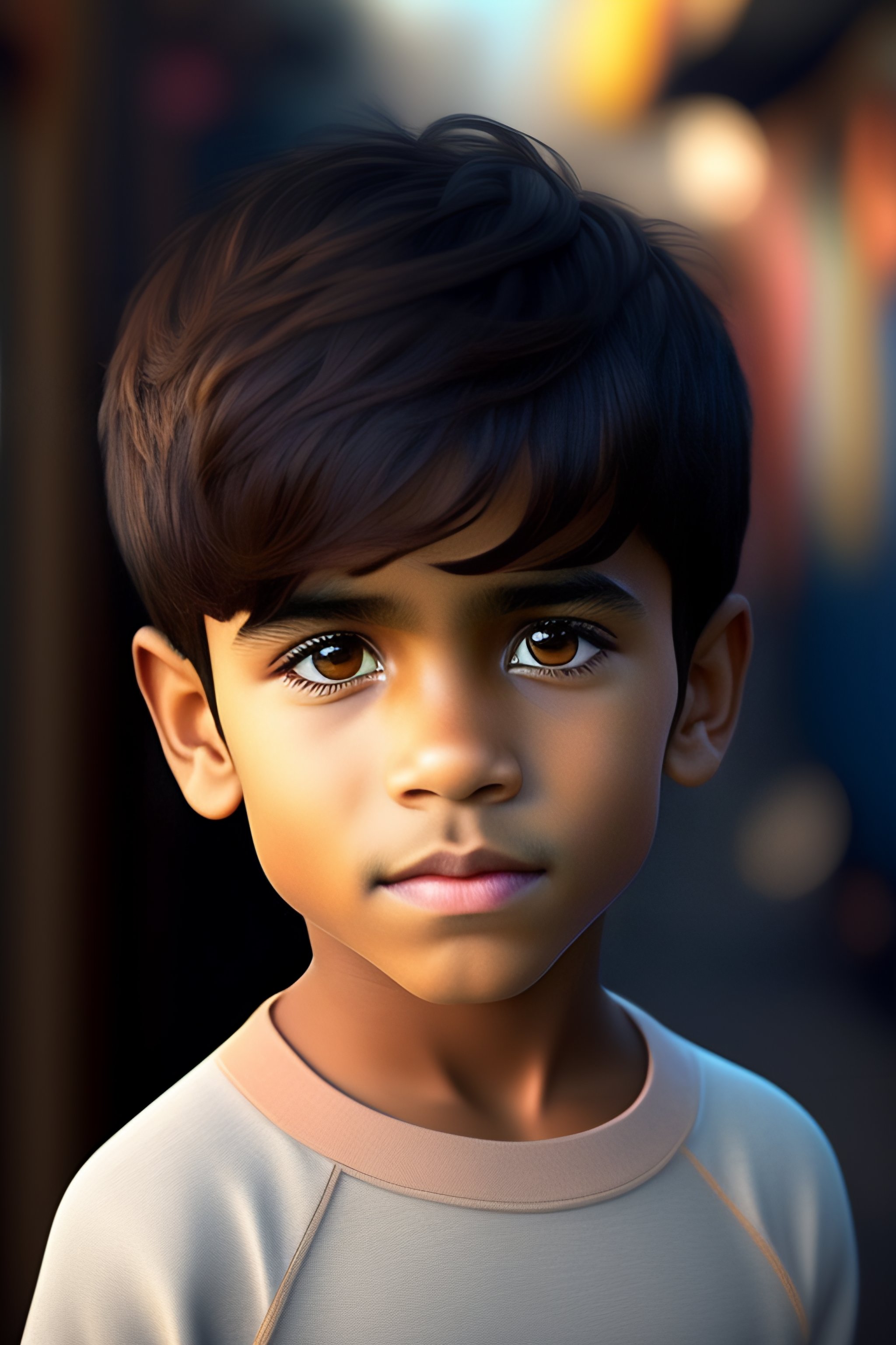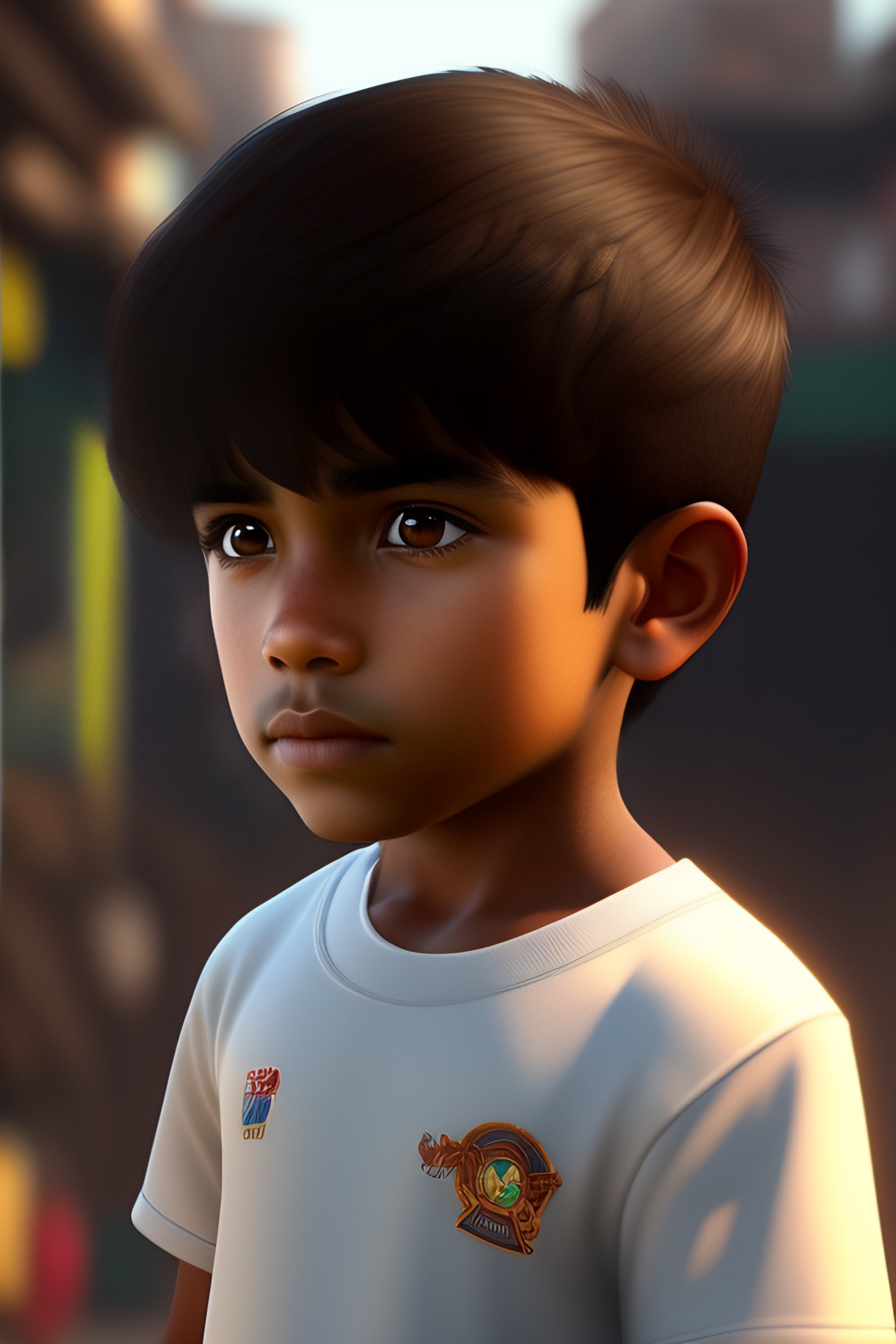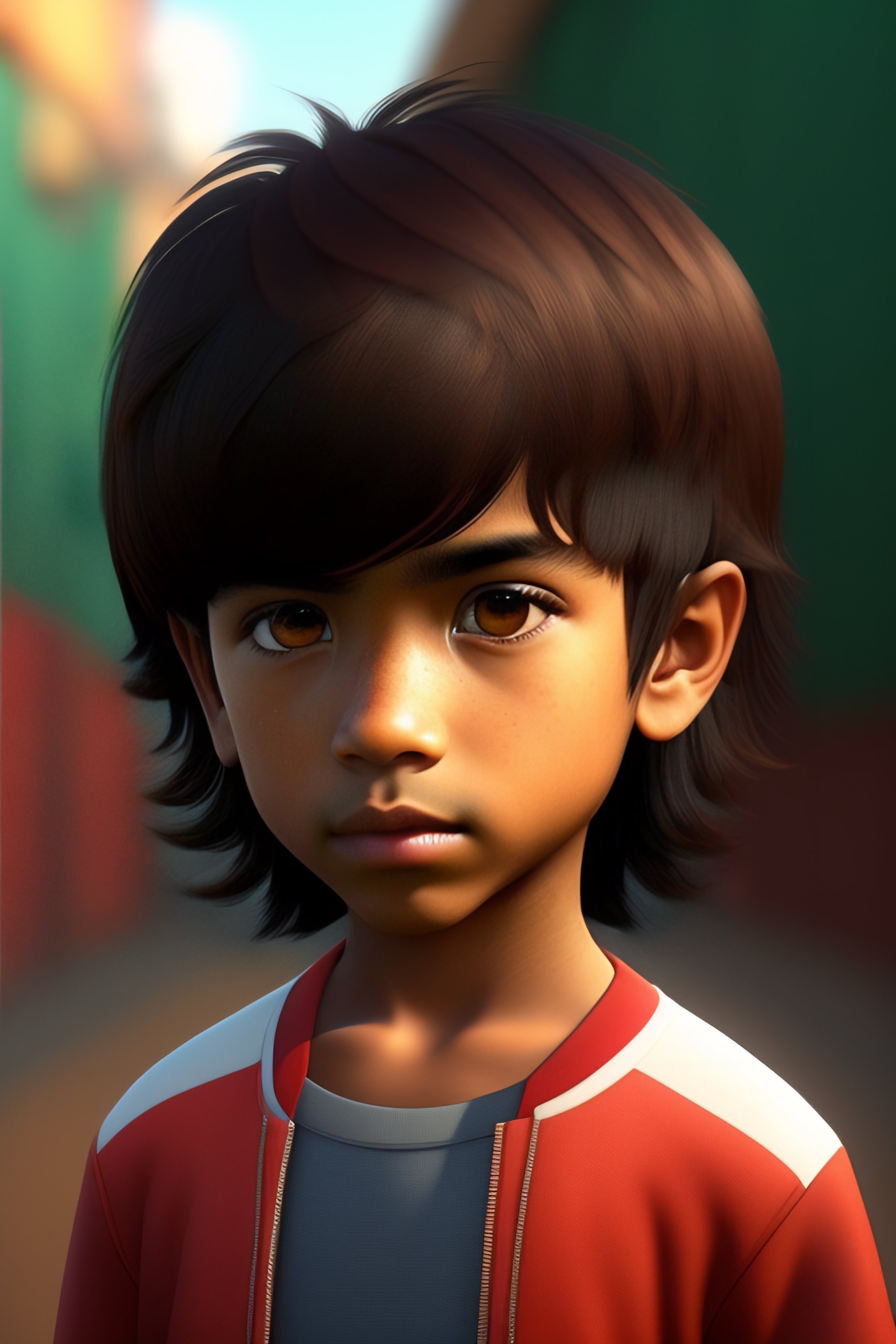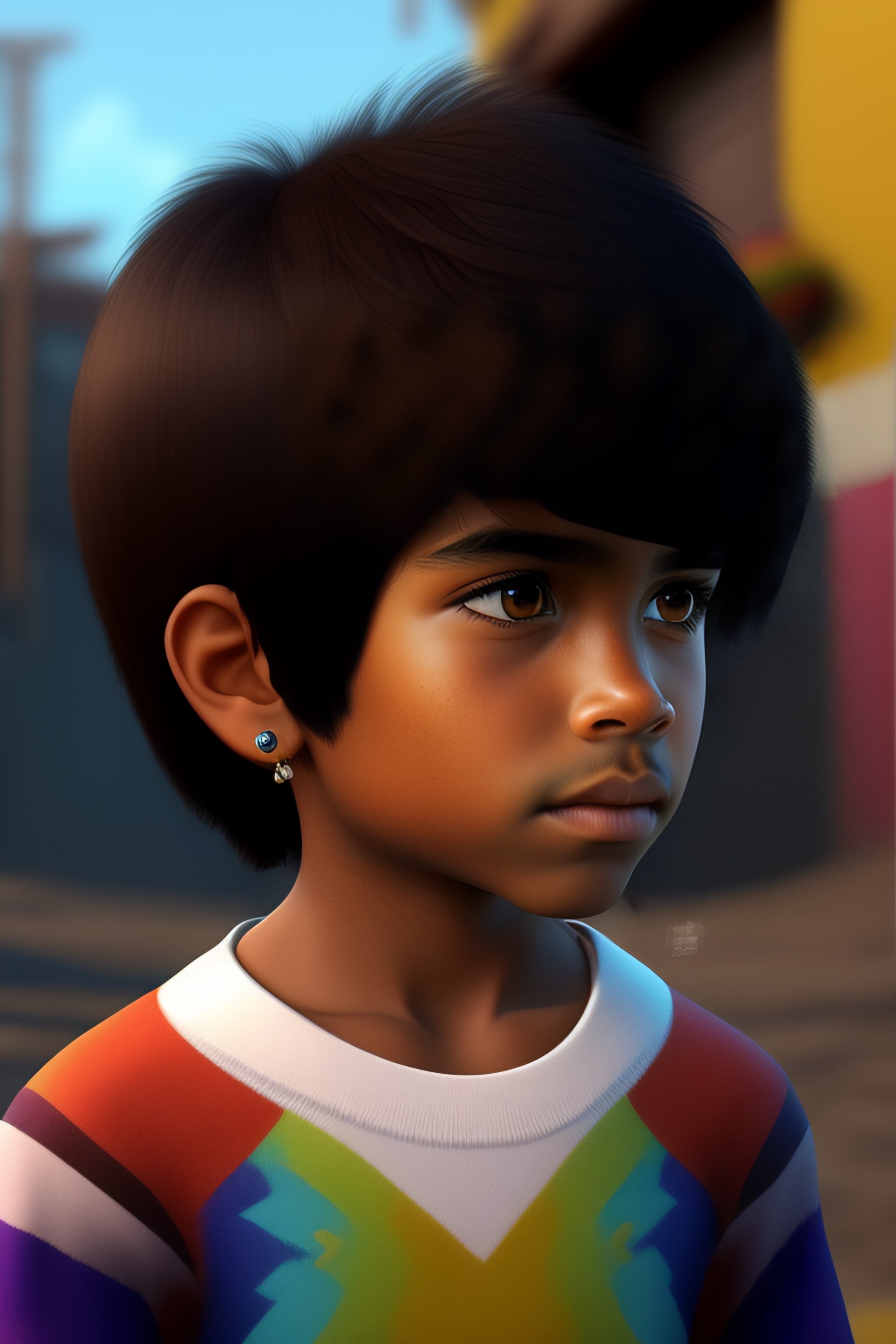 Dark brown boy is straight hair, earring, pixar style, 3d style, disney style, 8k, beautiful, in the favela of brazil, men's messy bangs, (hair cut)