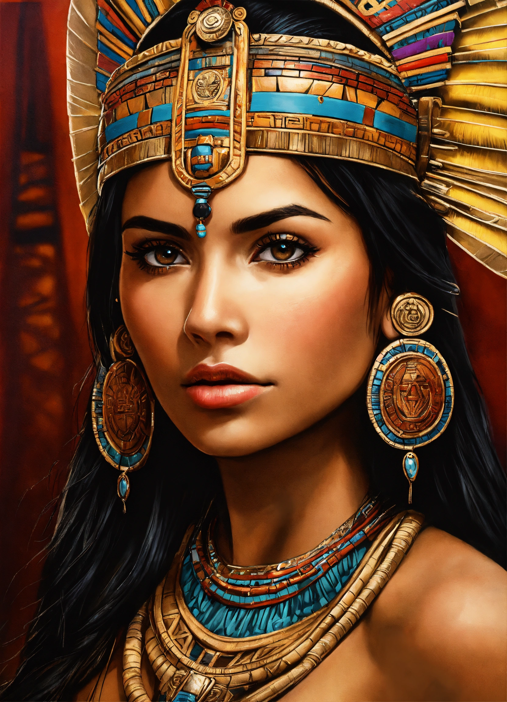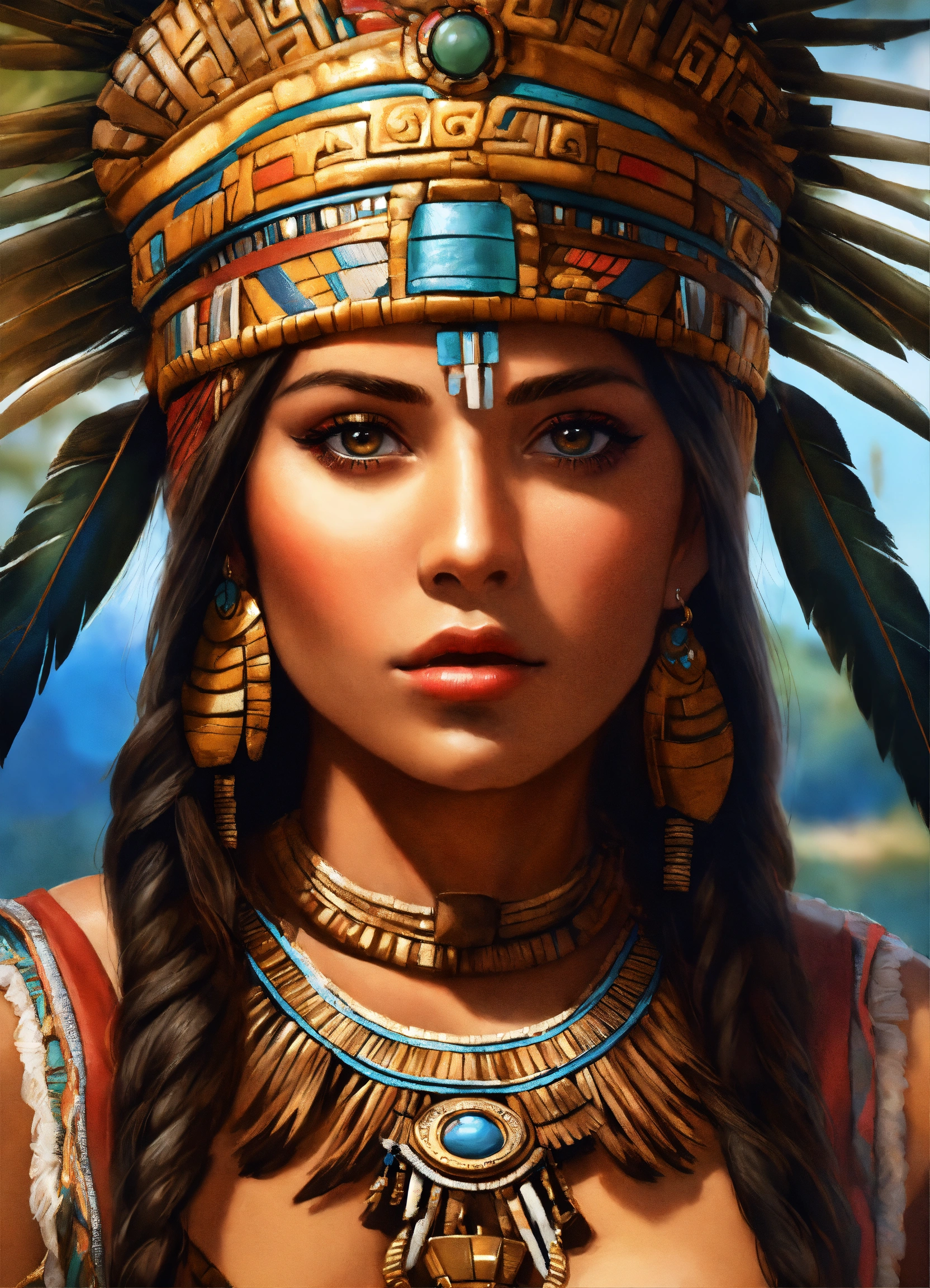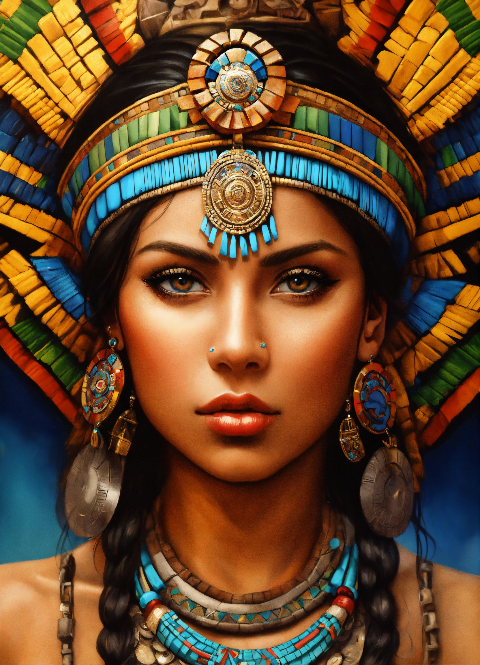 Aztec princess, realistic, portrait, high detail, high resolution, airbrush style, beautiful, latina, photo realism, mesmerizing stare.mayan