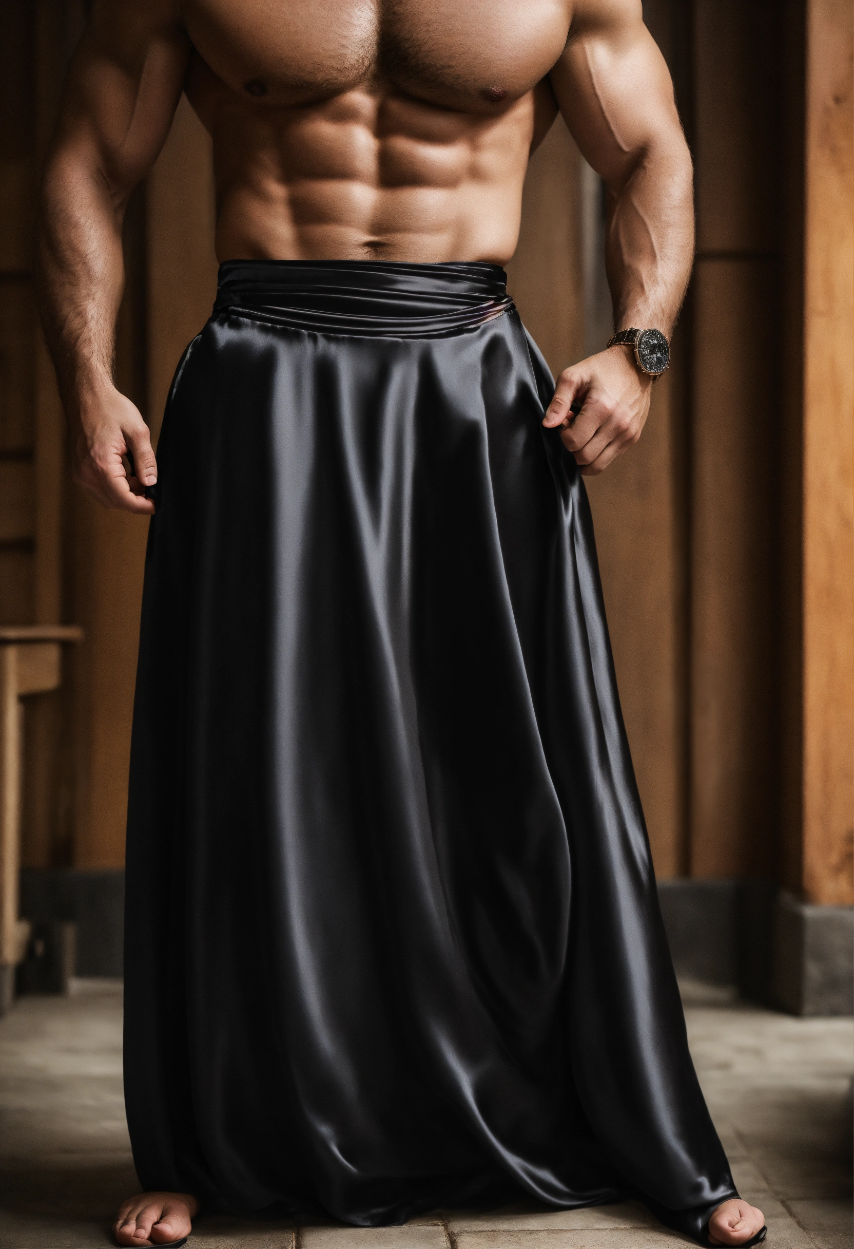 Close up long black clingy figure higging shiny satin pencil maxi skirt worn by toned caucasian man. manly body straining through skirt fabric. skirt pulled tight, taut. bu lge. close up, view from waist down.