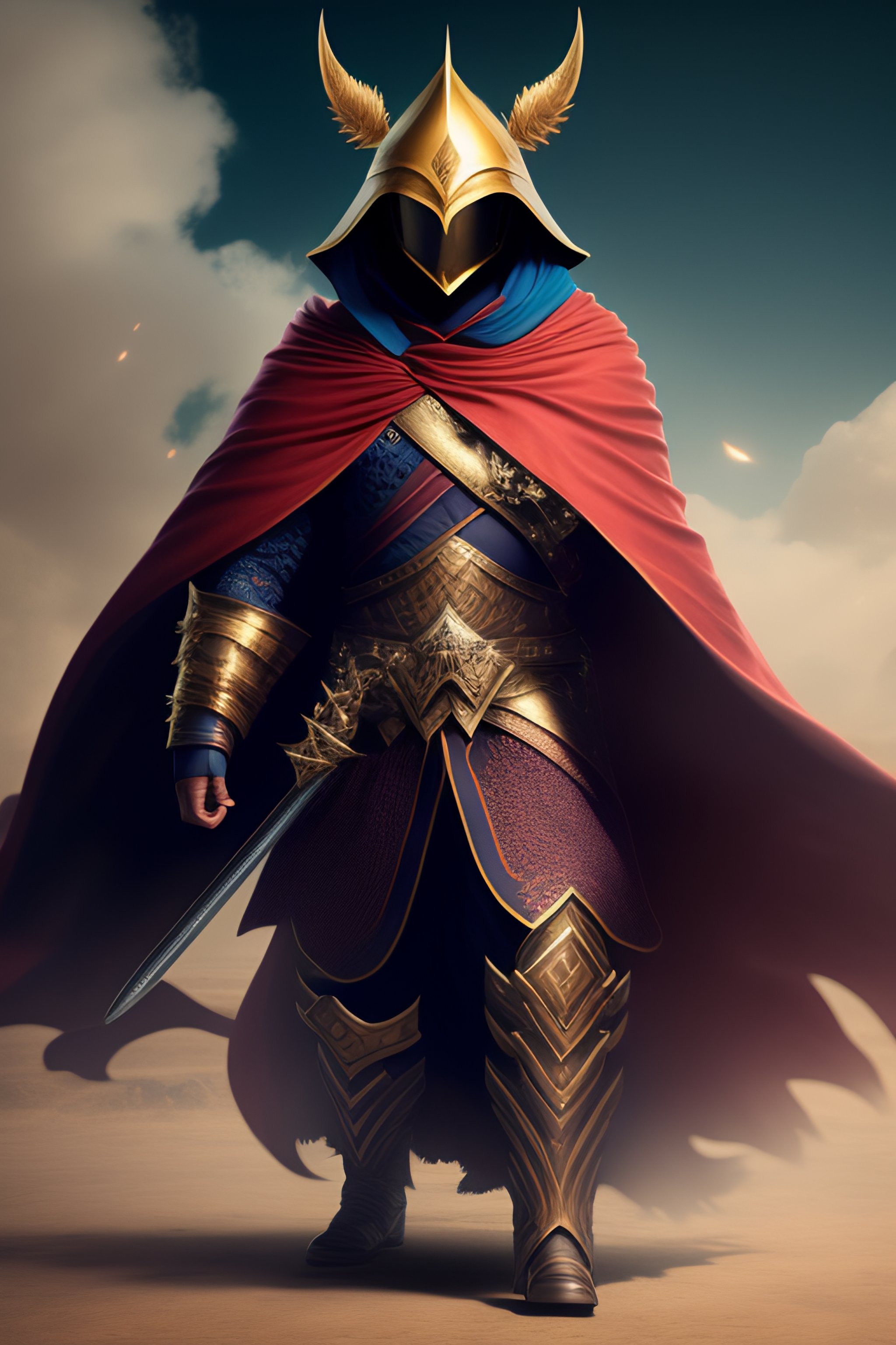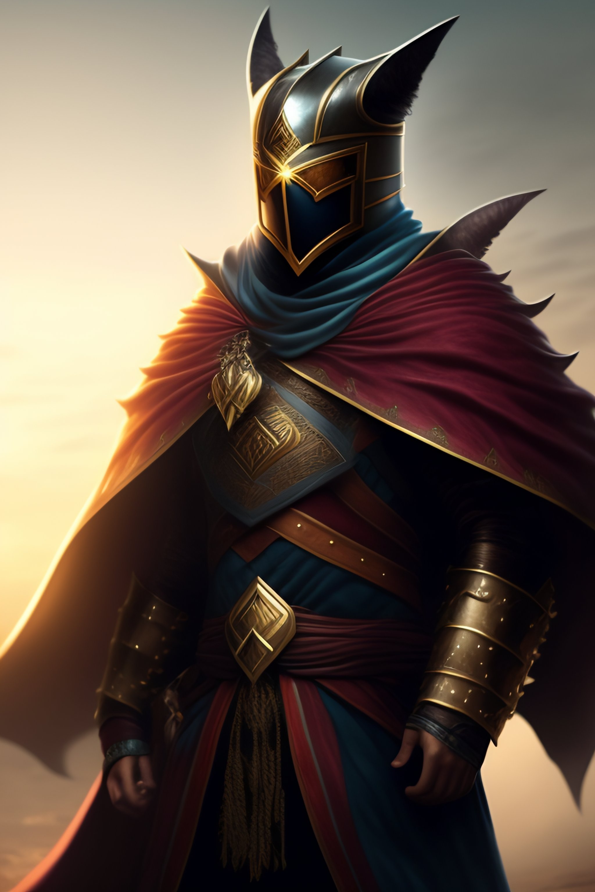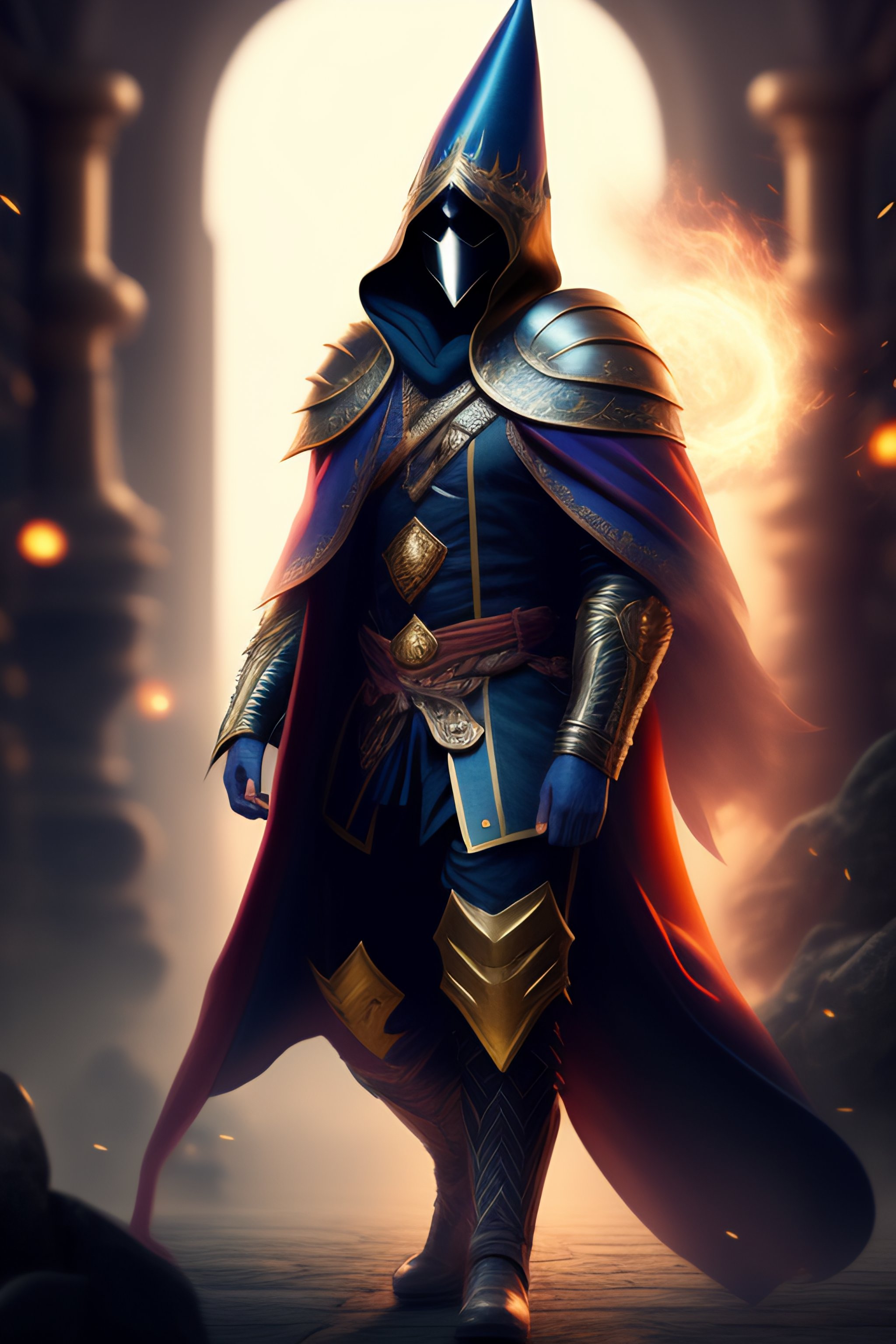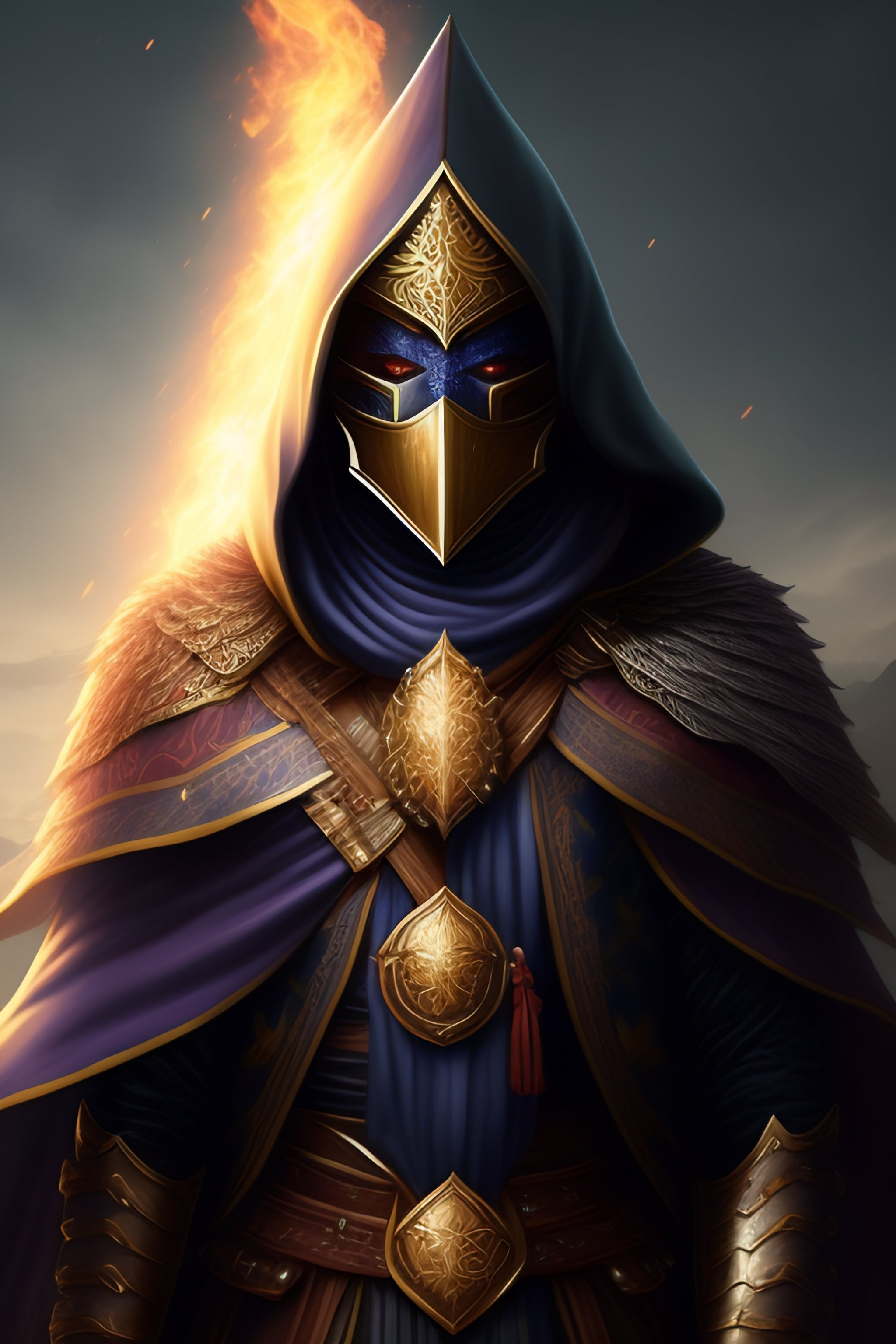 Mysterious masked wizard with many smbols on clothing and metal armor