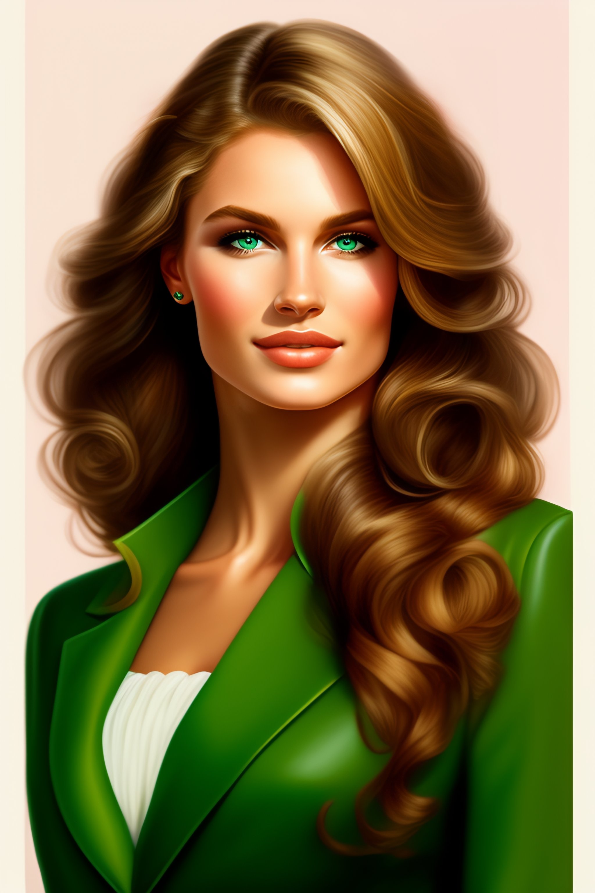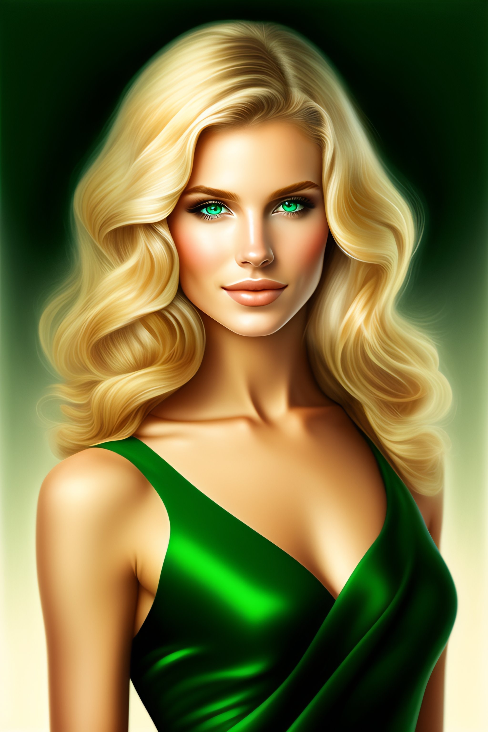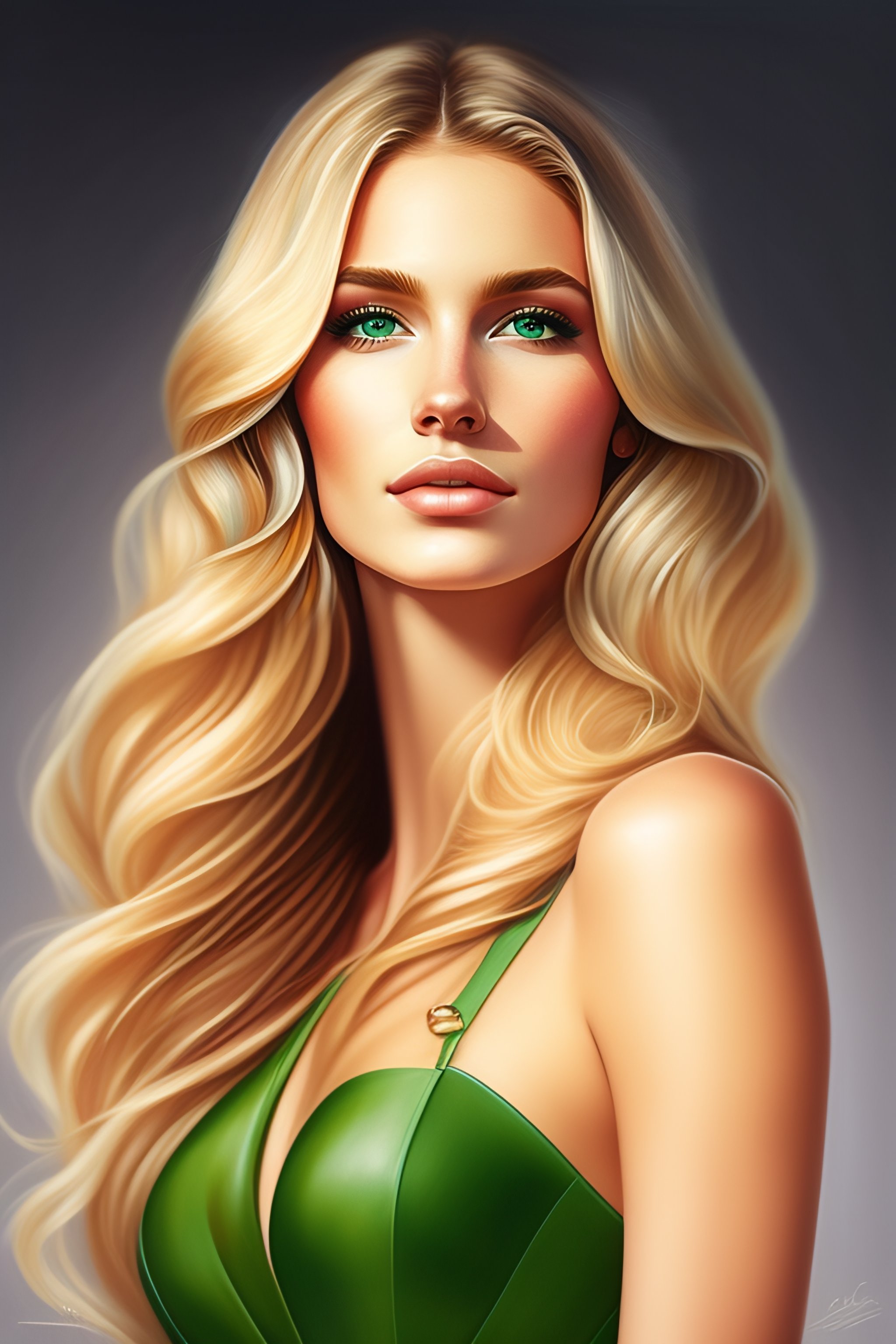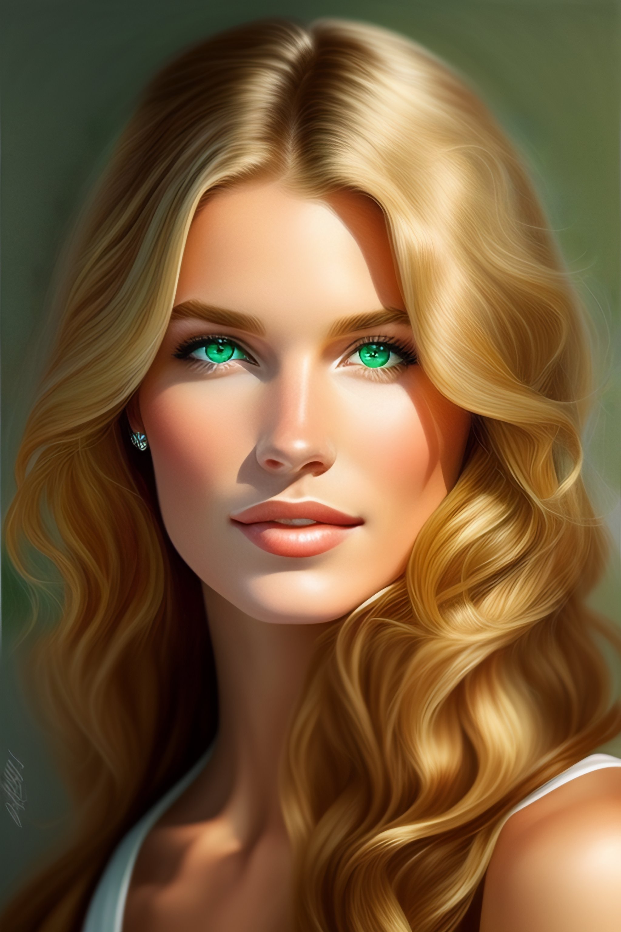 Portrait waist-length blonde girl with shoulder-length wavy hair, green eyes, european appearance. drawing style