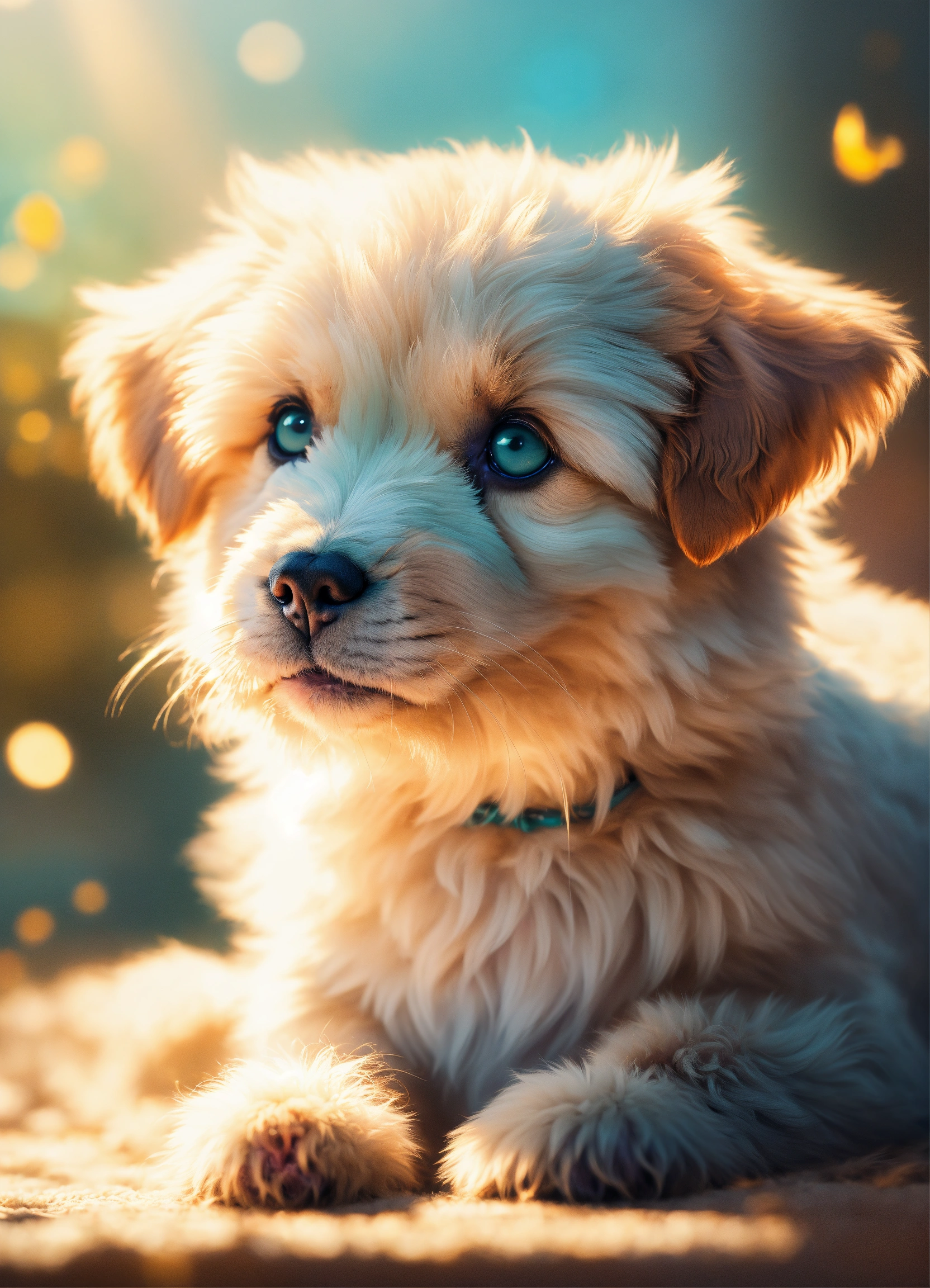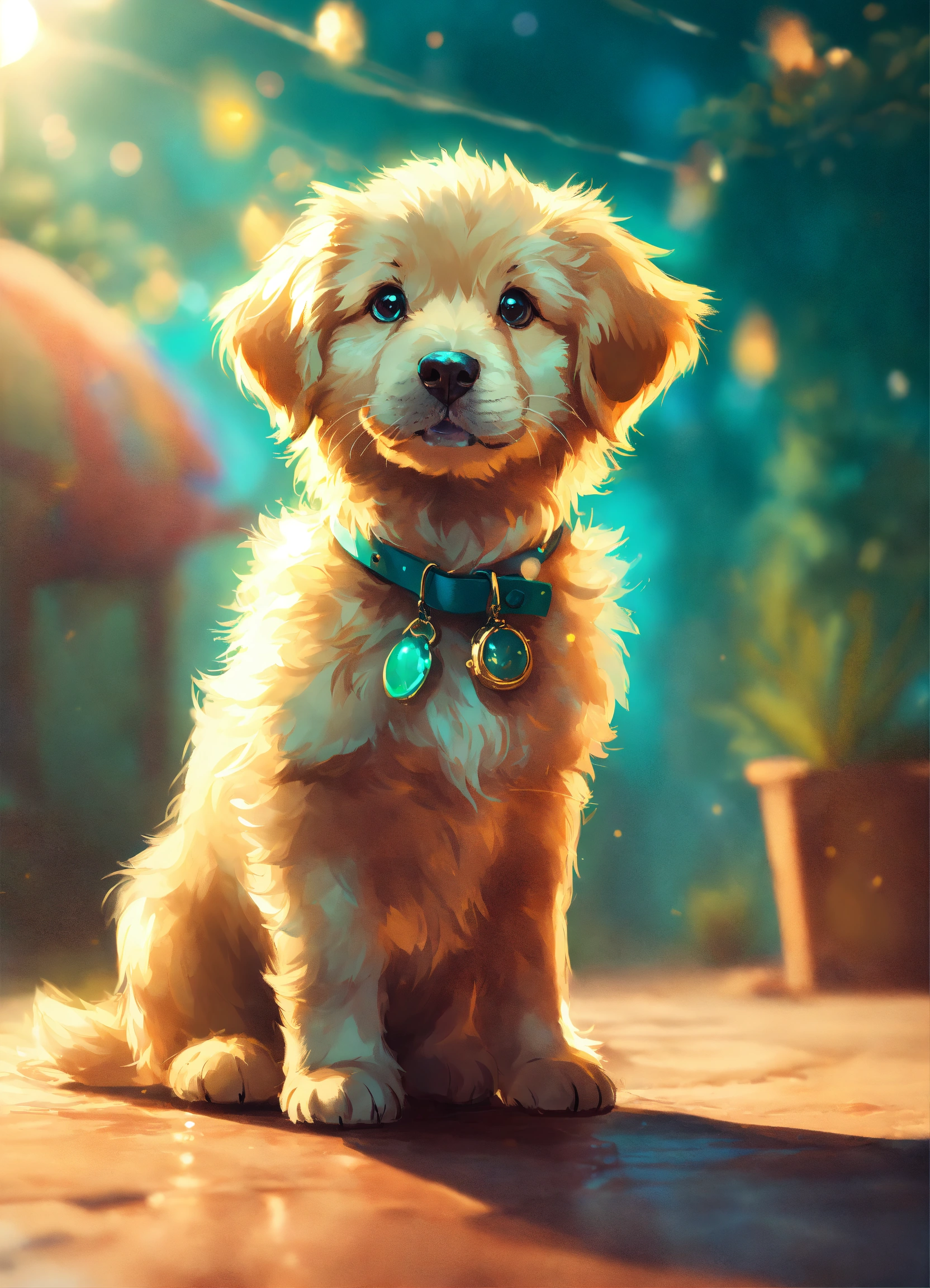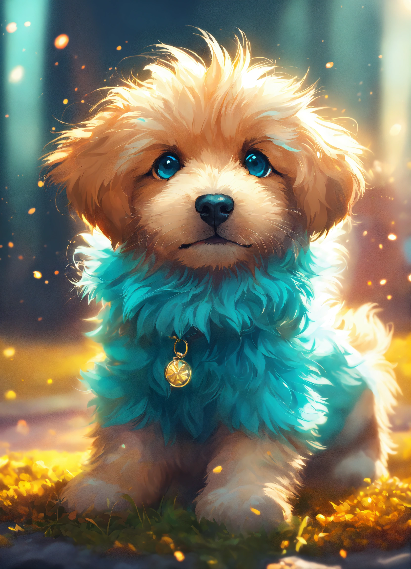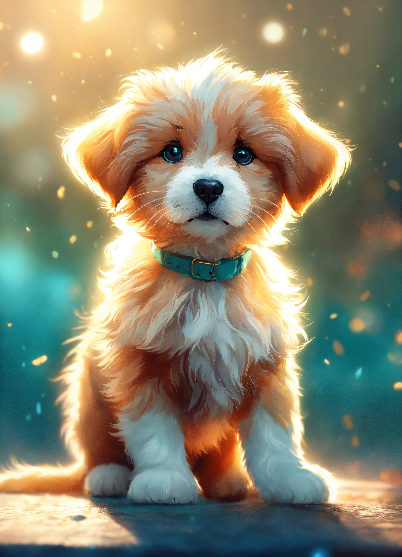 Very cute illustration for a cute puppy, digital art, highly detailed, rim light, exquisite lighting, clear focus, very coherent, details visible, soft lighting, character design, concept, atmospheric, fluffy, vibrant colors, trending on artstation, foggy, sun flare, light teal