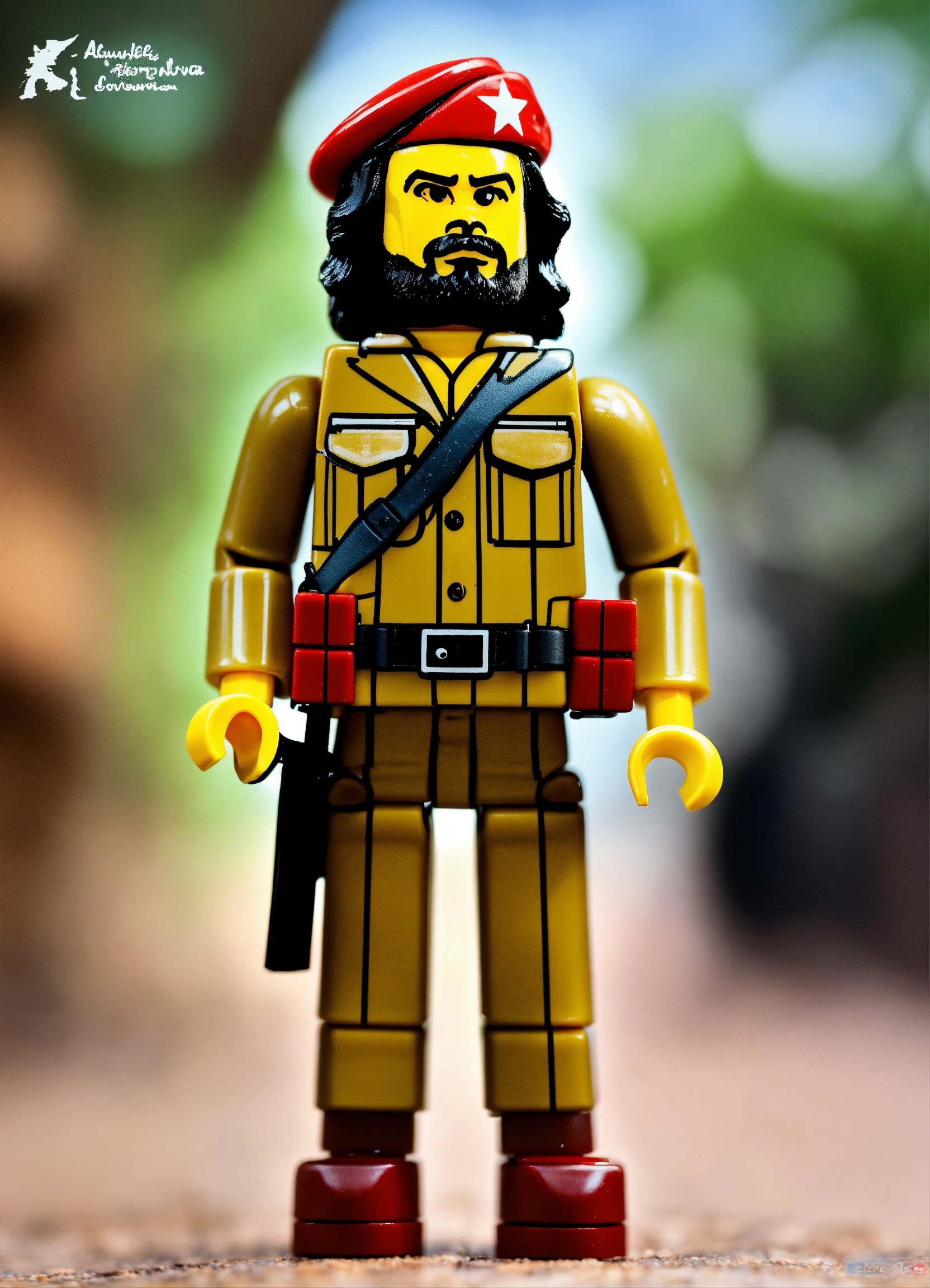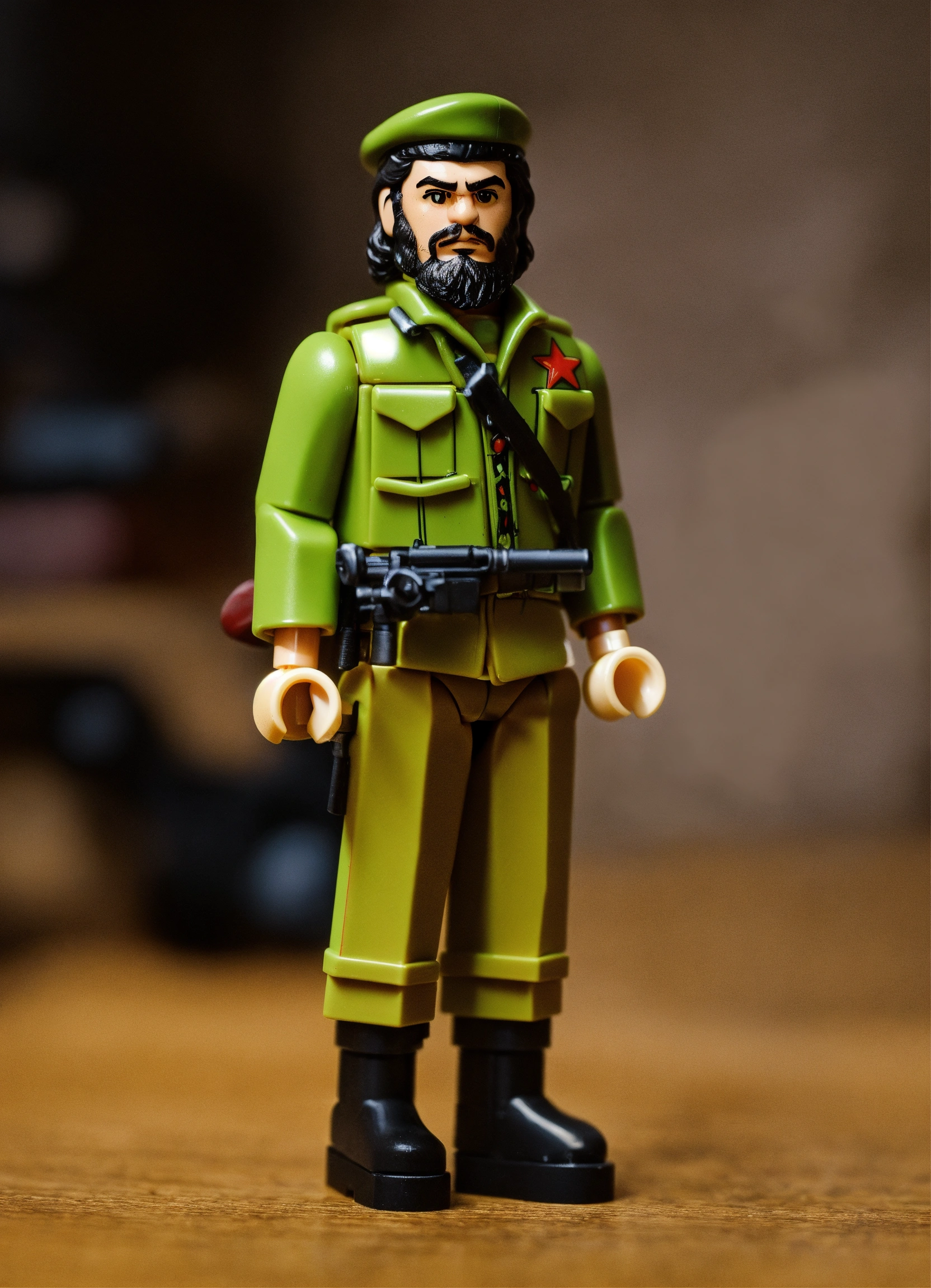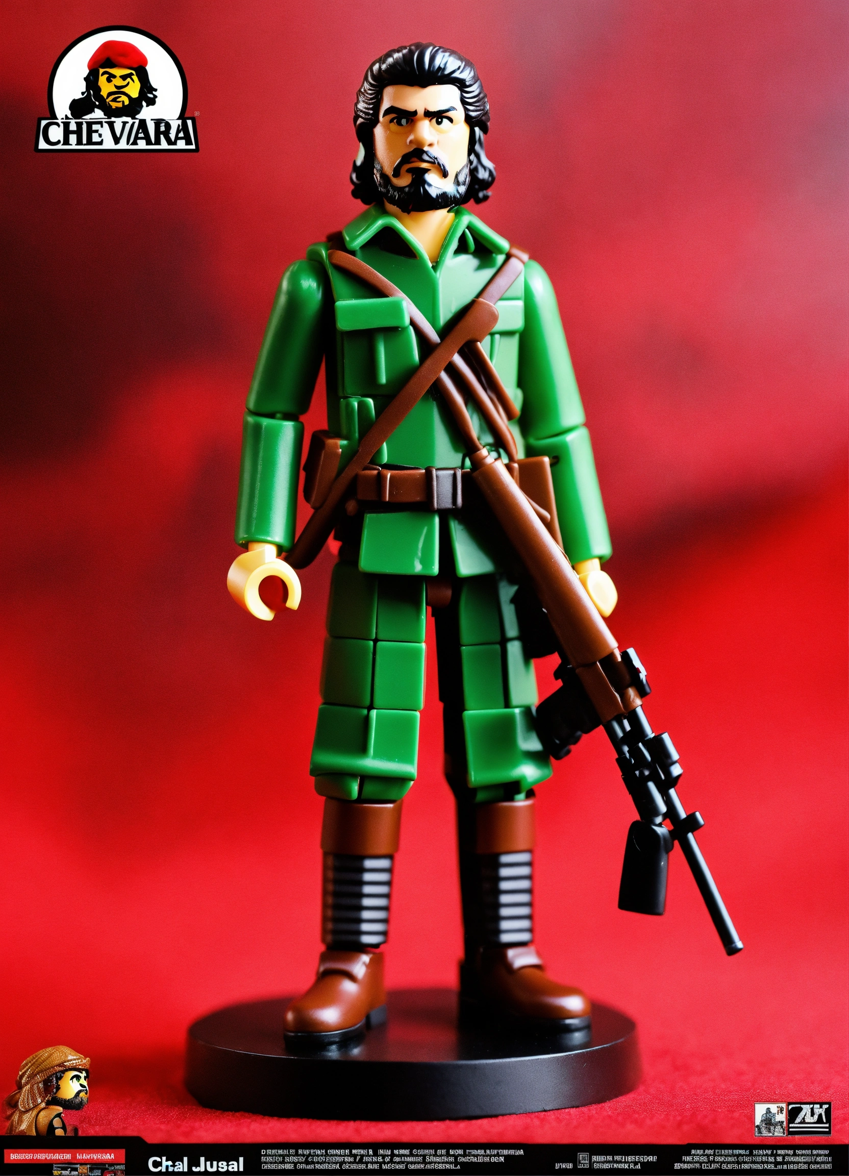 Design an action figure toy inspired by lego figures based on the iconic che guevara. the toy should intricately capture che's essence and historical significance, incorporating fine details such as his iconic beret wit red star, beard, and determined gaze. the primary goal is to create a meticulously designed and visually stunning toy that not only pays homage to che guevara but also conveys a powerful message of revolution and social change. this action figure should be a must-have item for collectors and a conversation starter for anyone interested in the historical and cultural impact of che guevara.