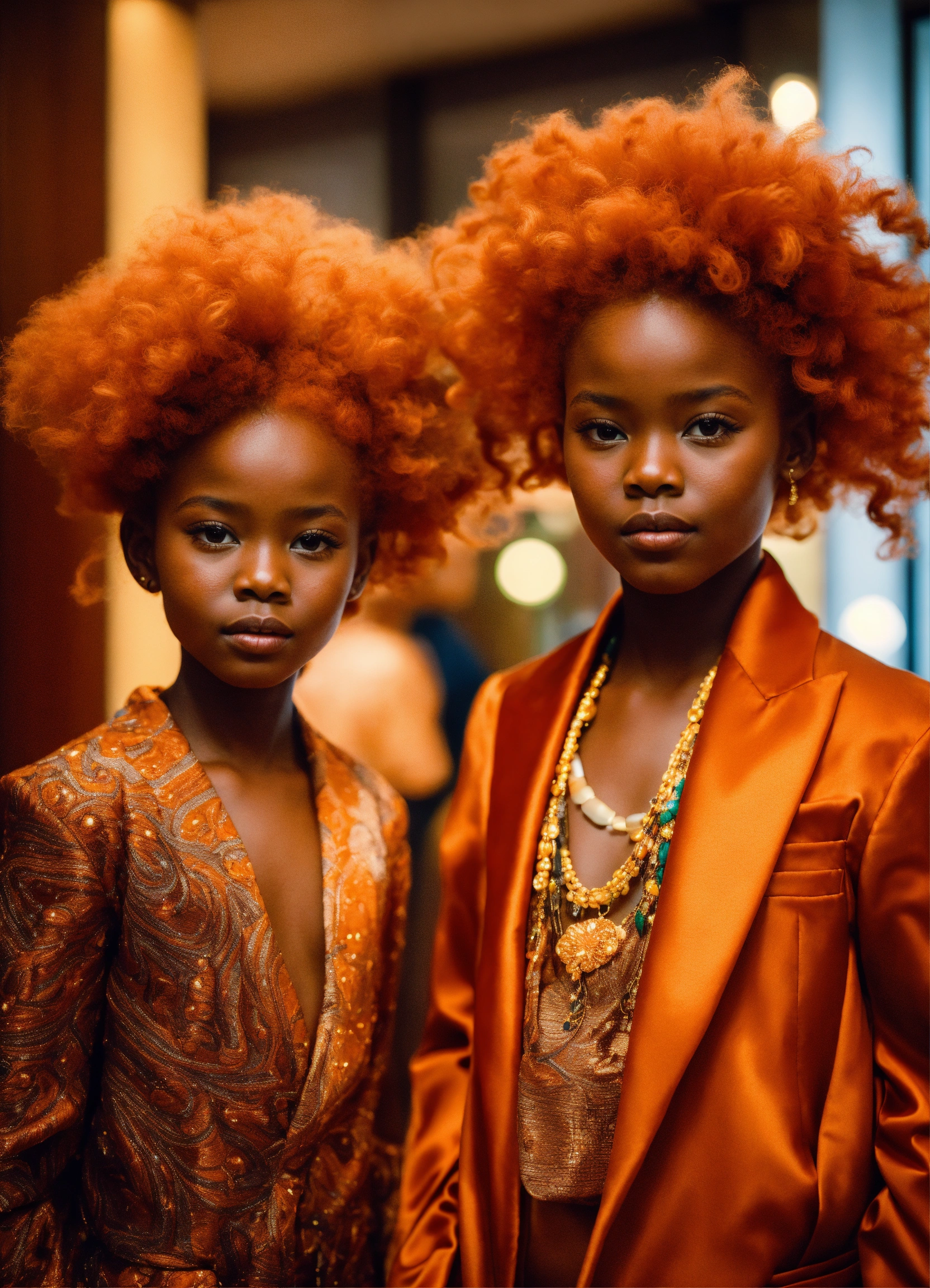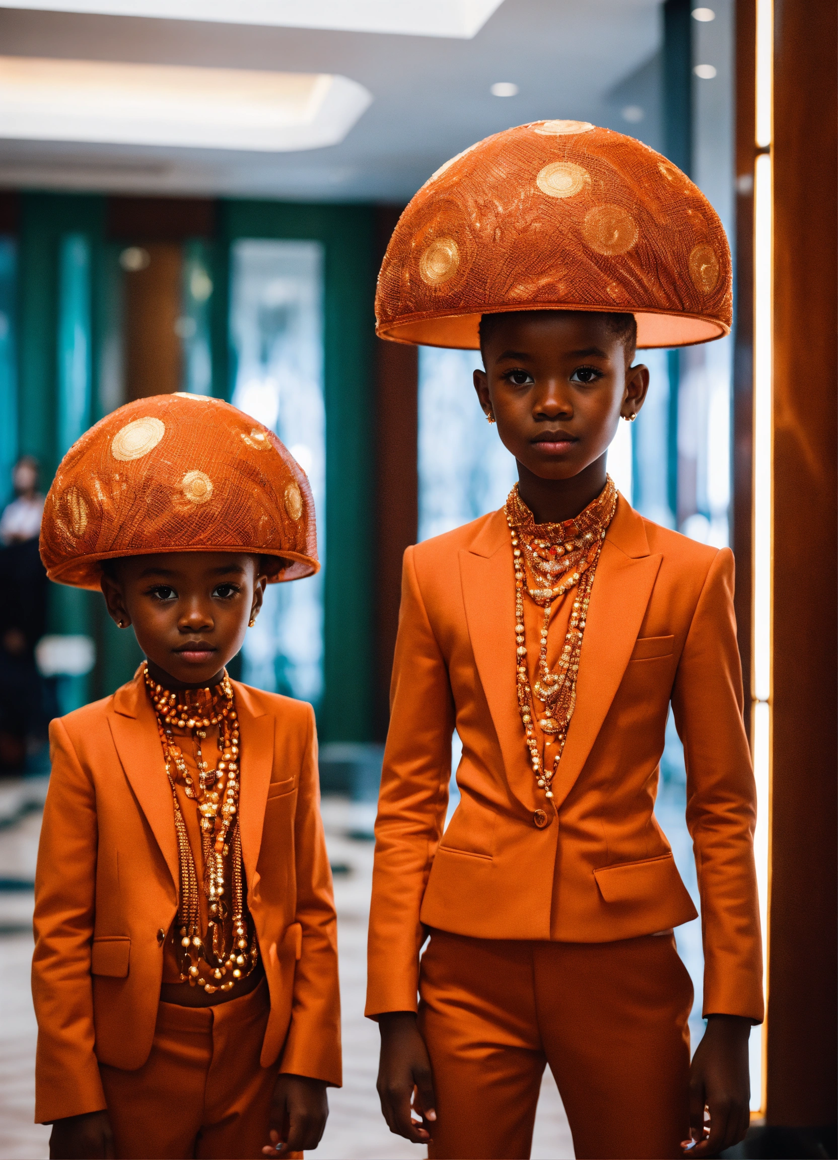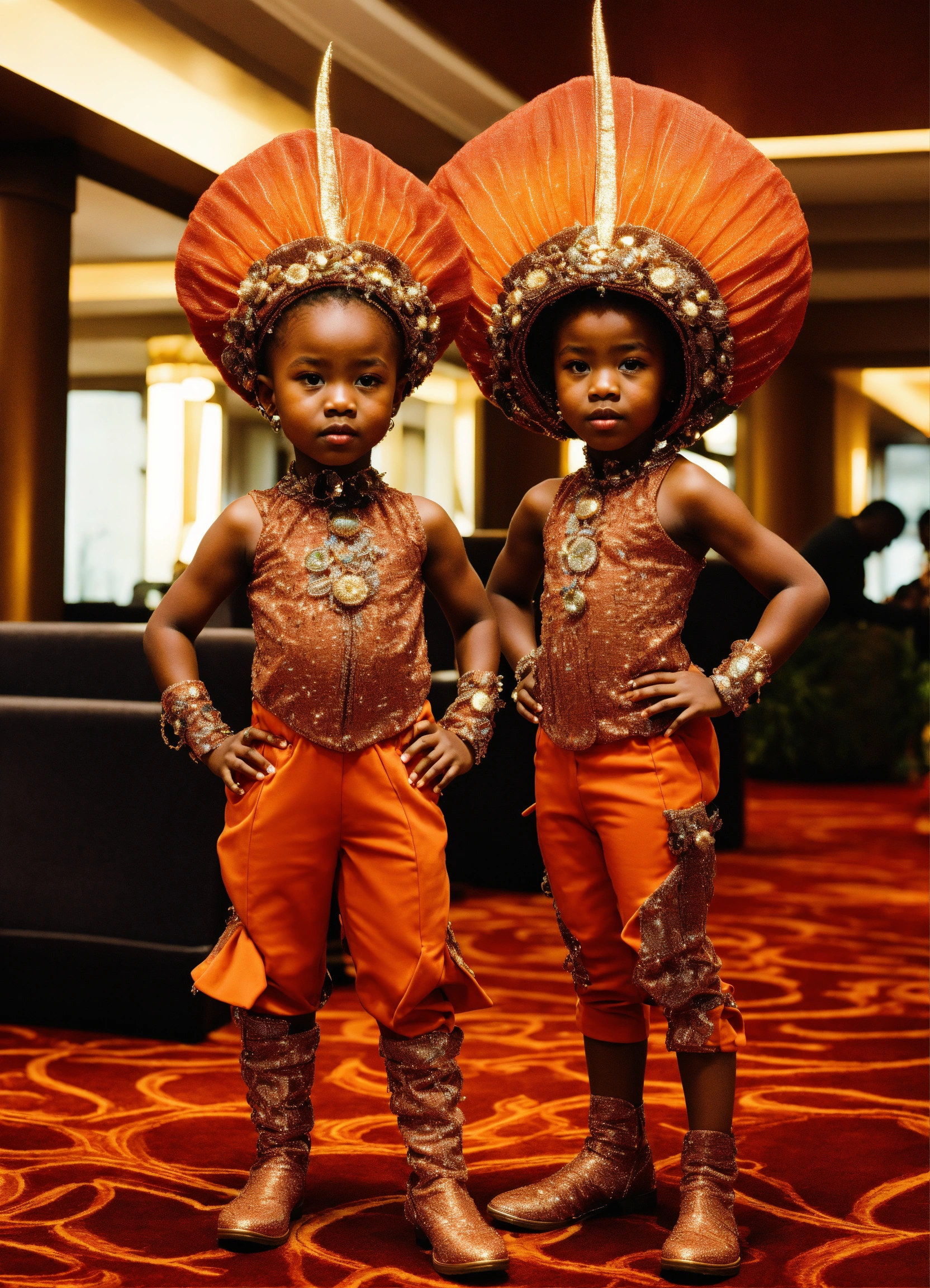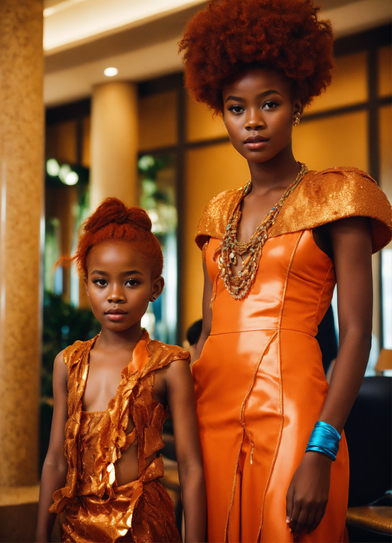 Two pretty human looking aliens children with dark orange skin, reddish orange hair, african features, dressed in haute couture. in hotel lobby. with child