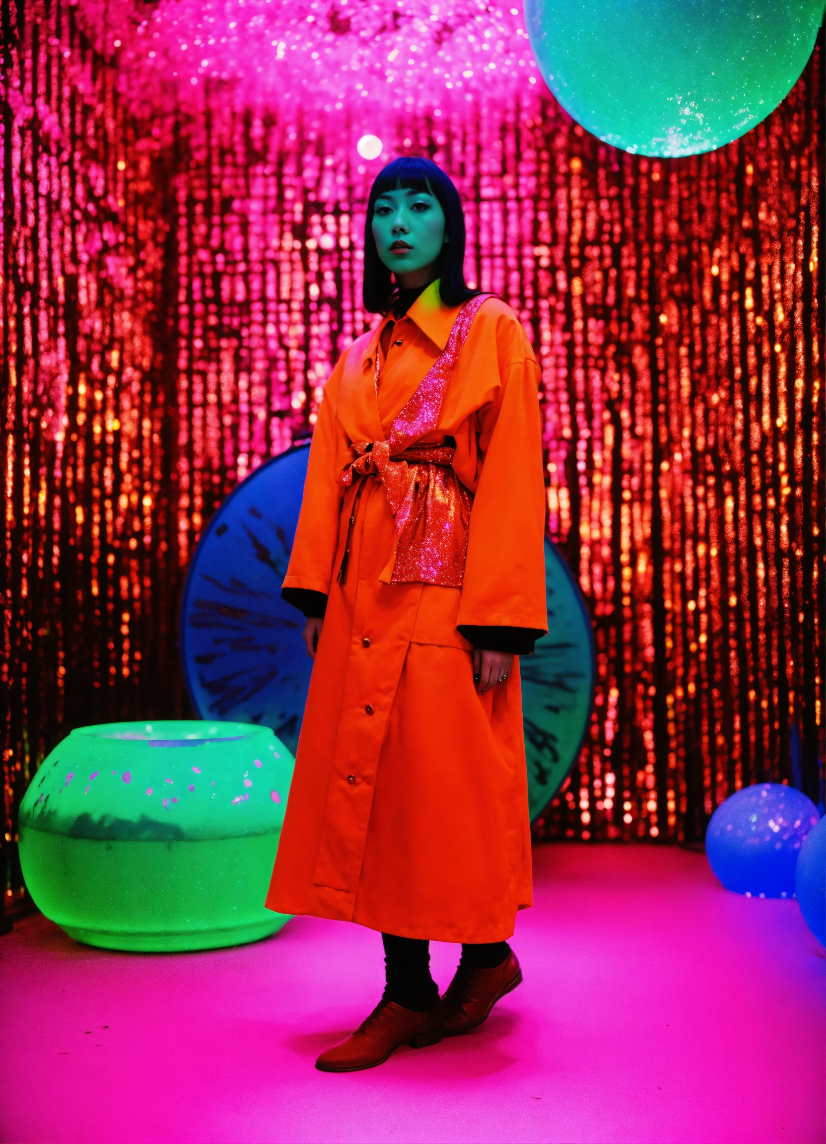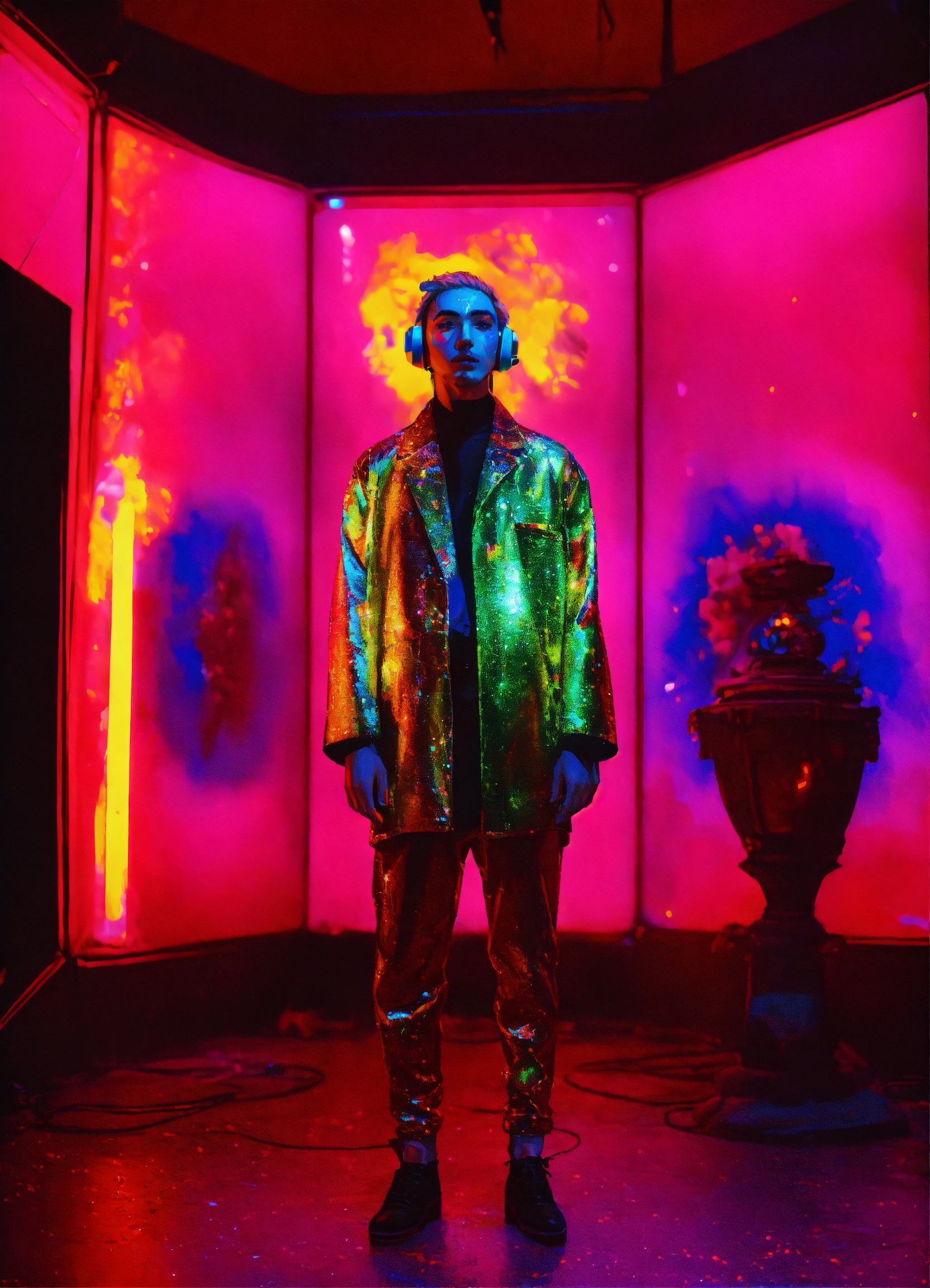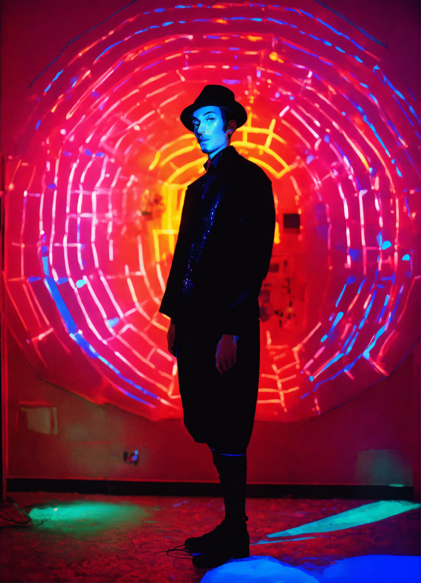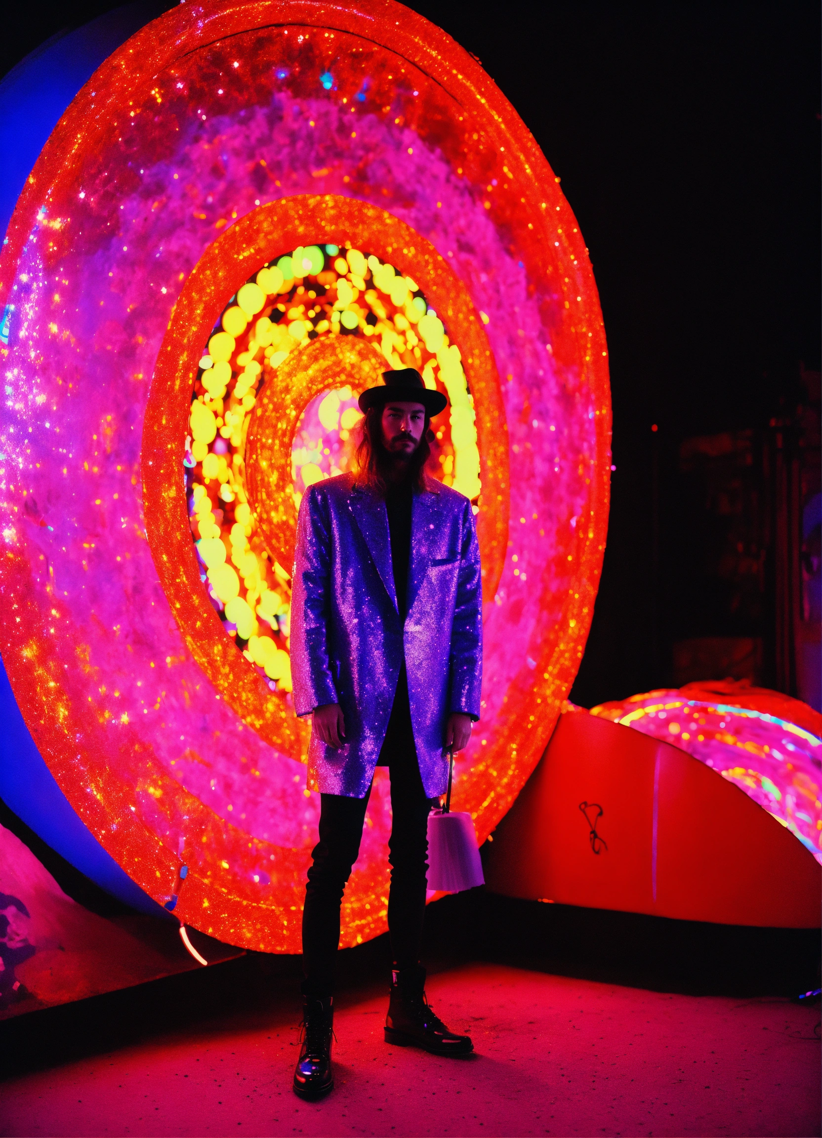 Full body portrait fashion, of cosmic bahpomet dmt black light glitter neon drum and bass kyoto, 35mm film, art by salvador dali and holy mountain