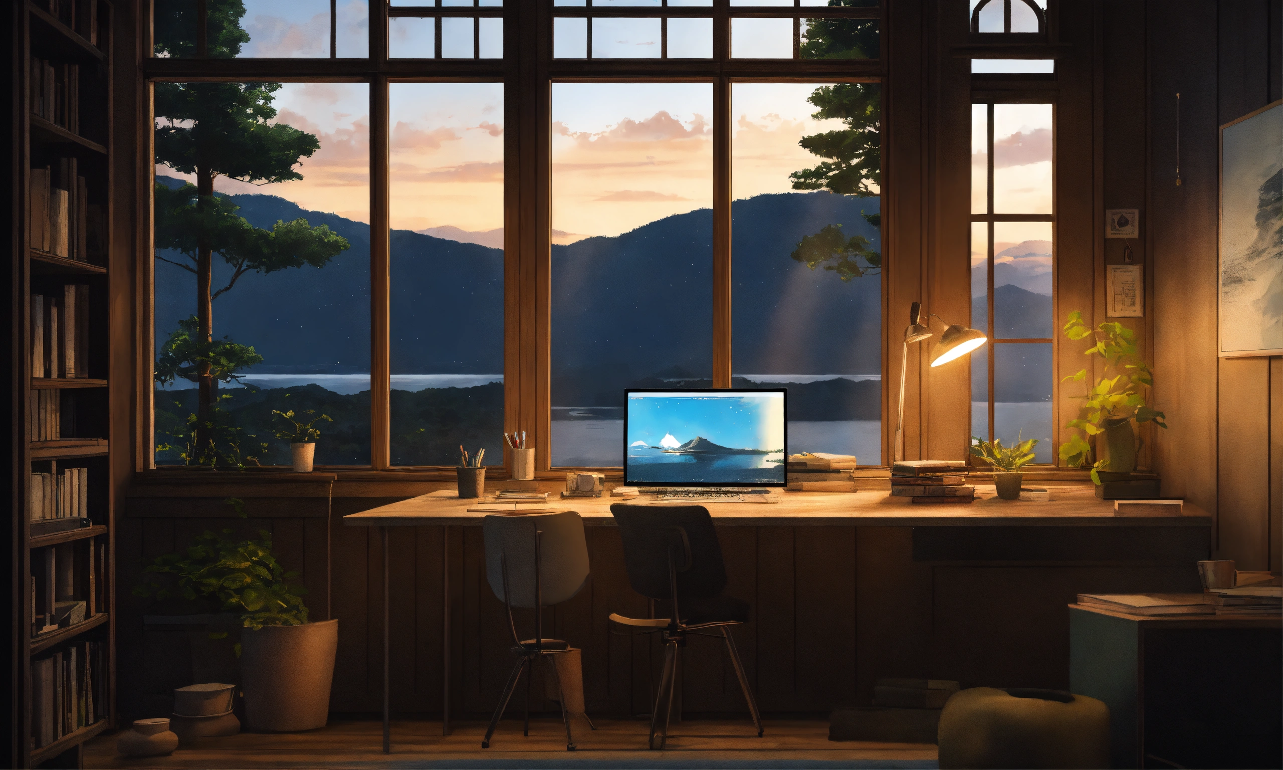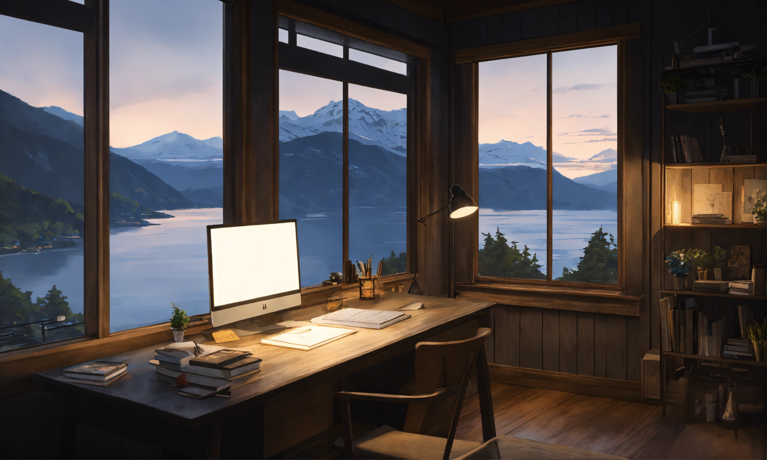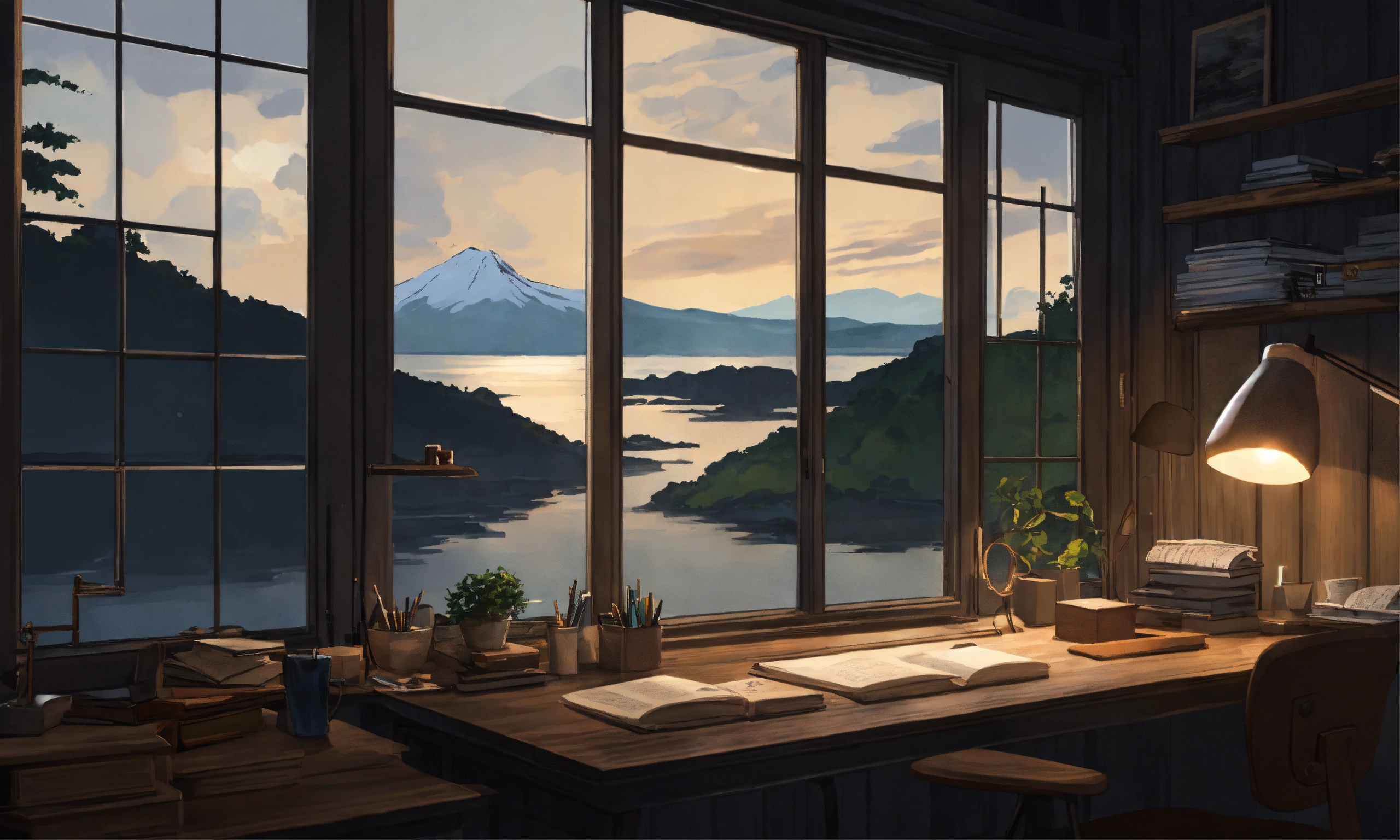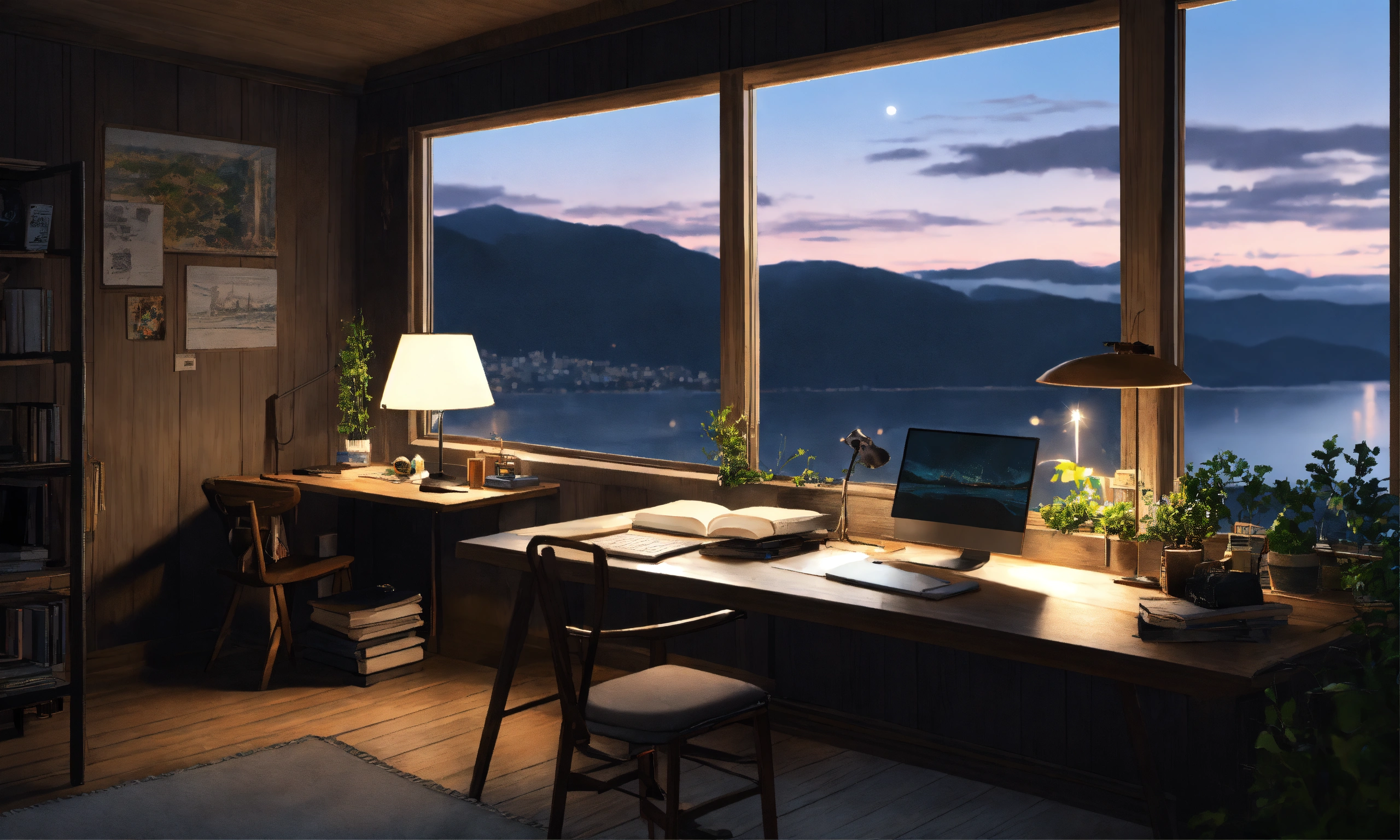 Study desk against very big window in forrest house, studio ghibli, anime, dark grey washed wooden walls, grey washed acrylic tones, view of fjord in the night, night time, image point of view at study desk, minimalistic, lofi artwork, zoomed in on study desk