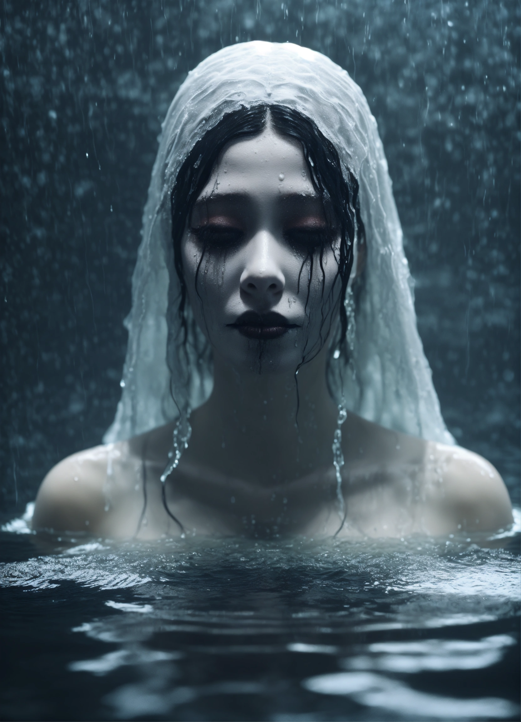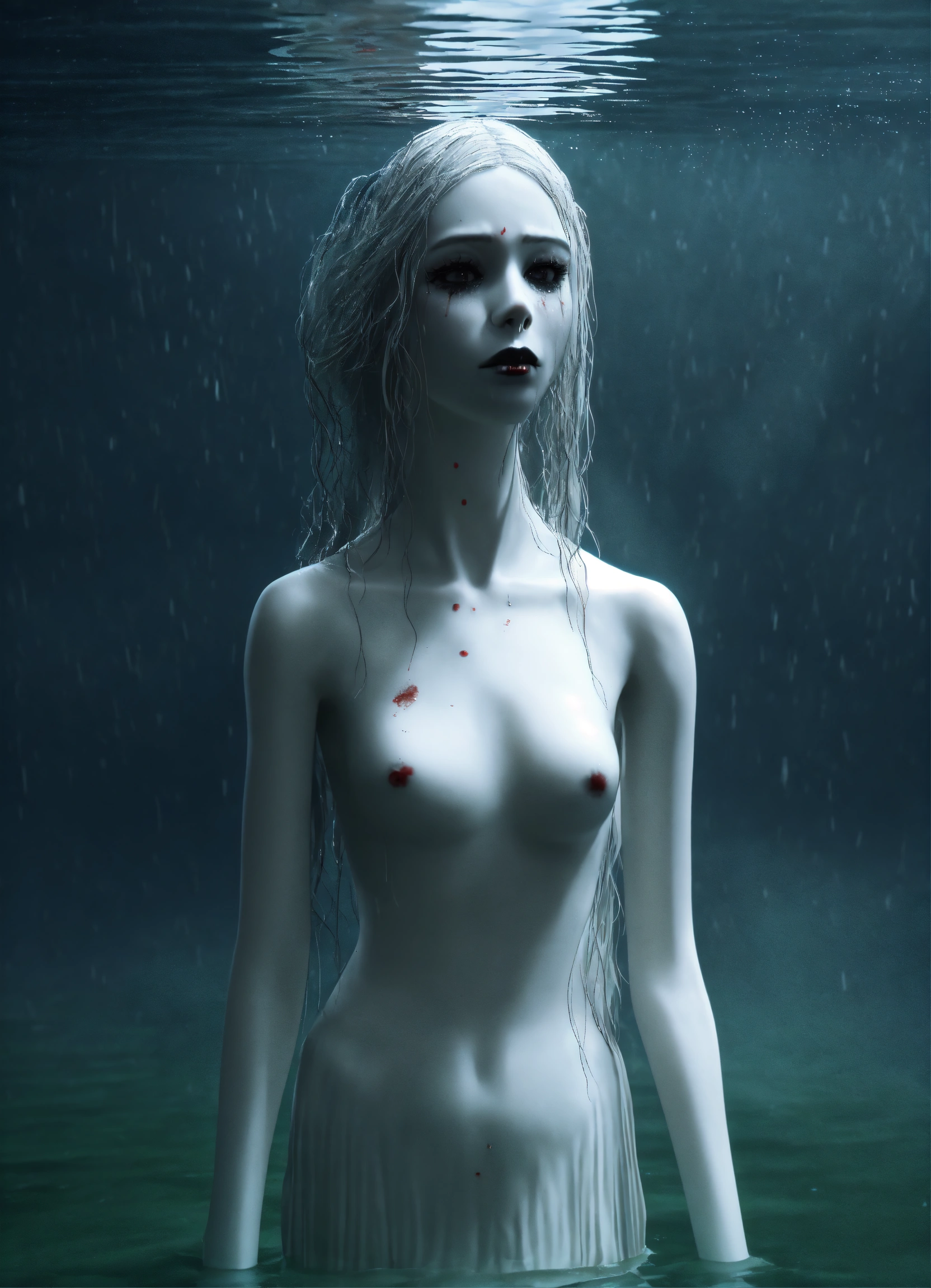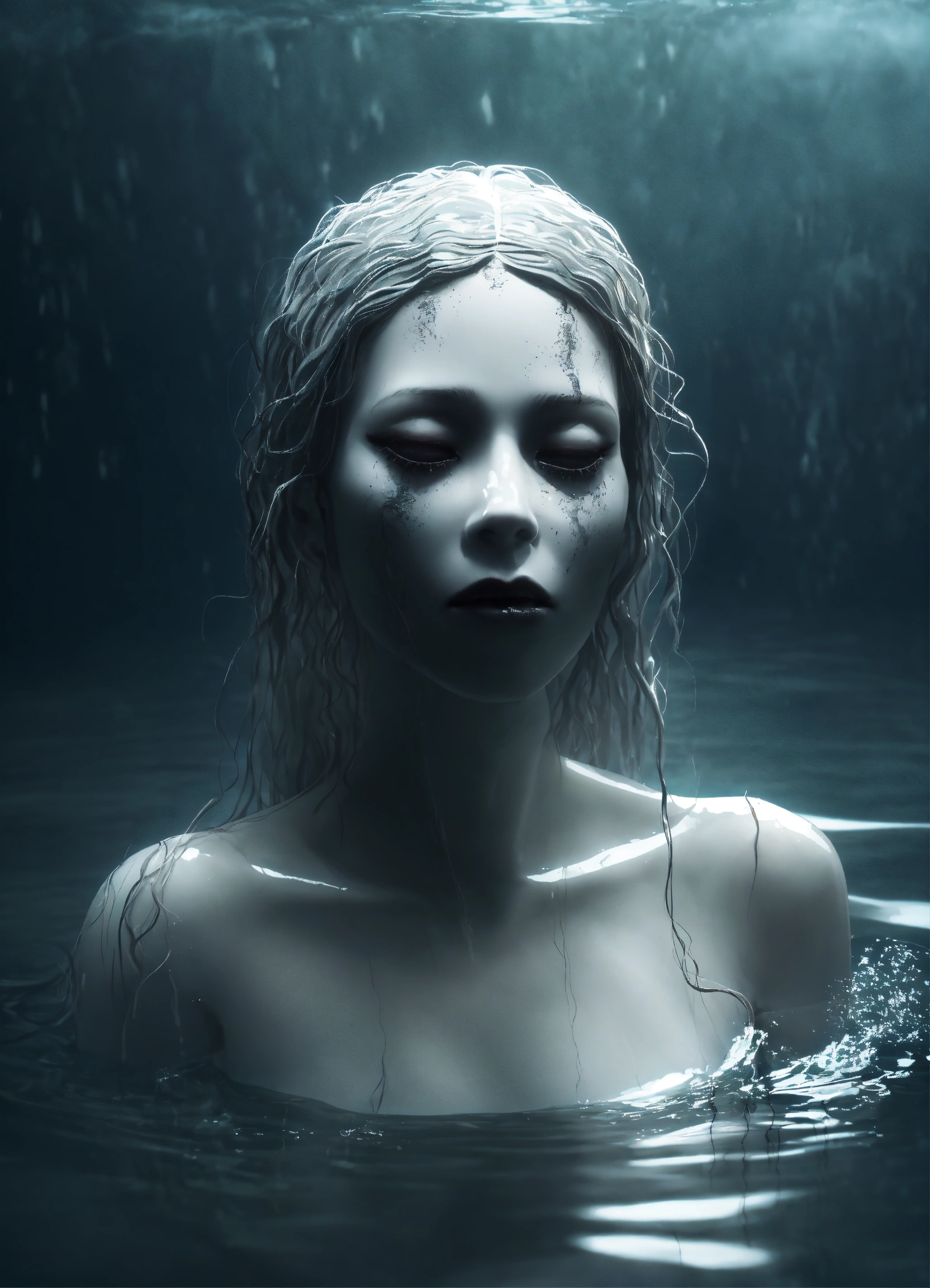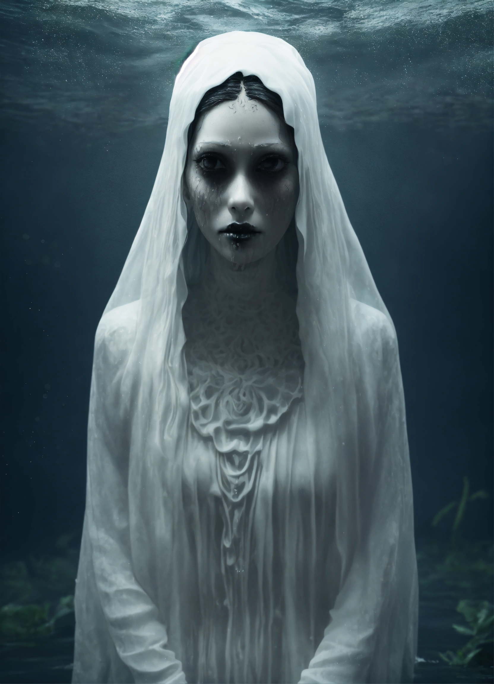 A scary la llorona in white in water. only the head and shoulders peep out of the water. she has no eyes, only black. she has black lips. pale mangled face she is wet. 3d model. dark. mist.