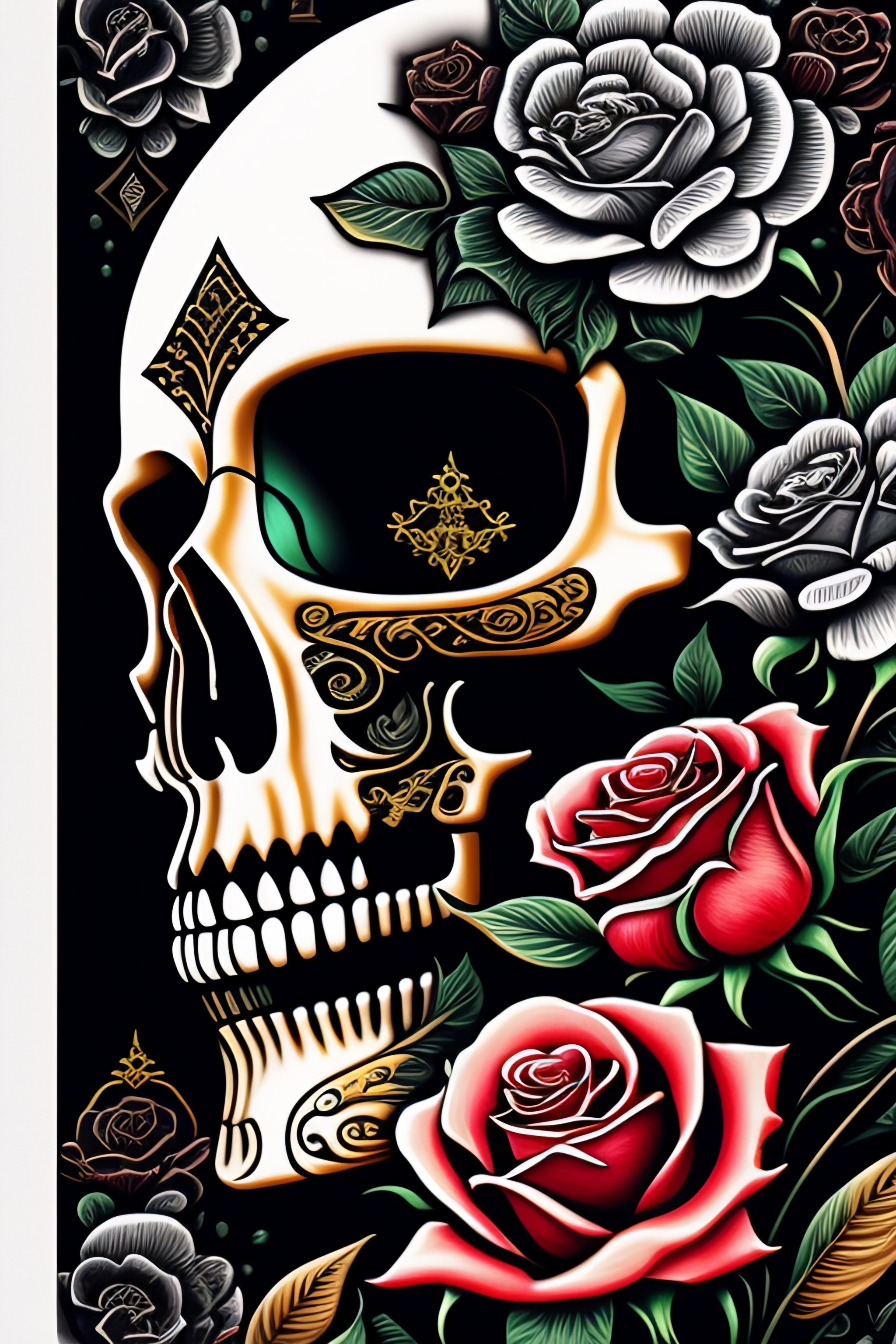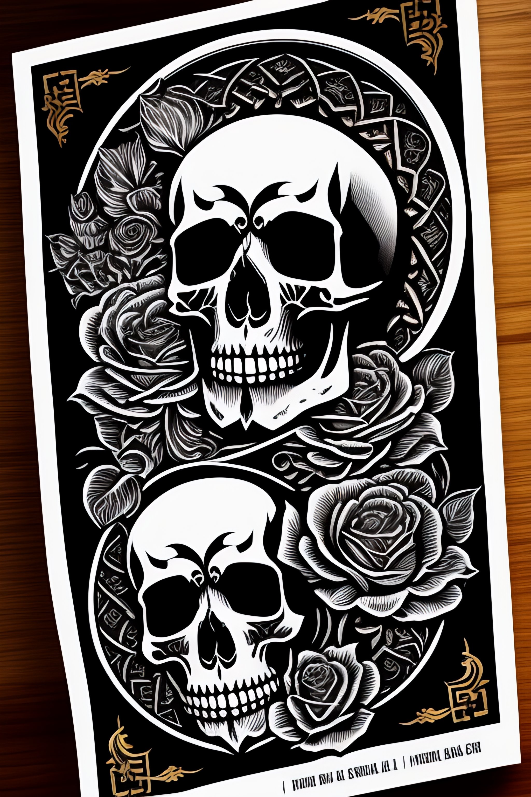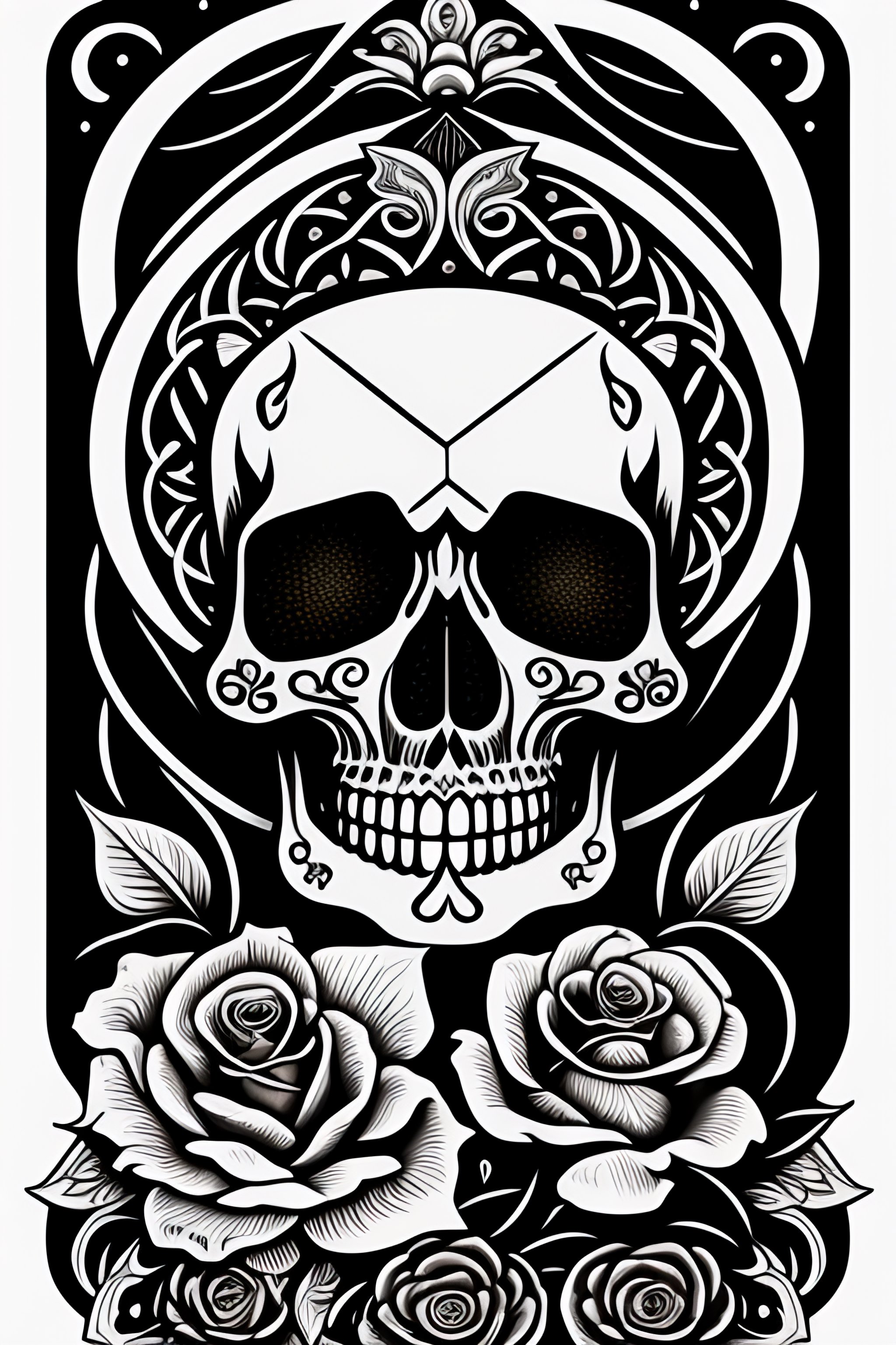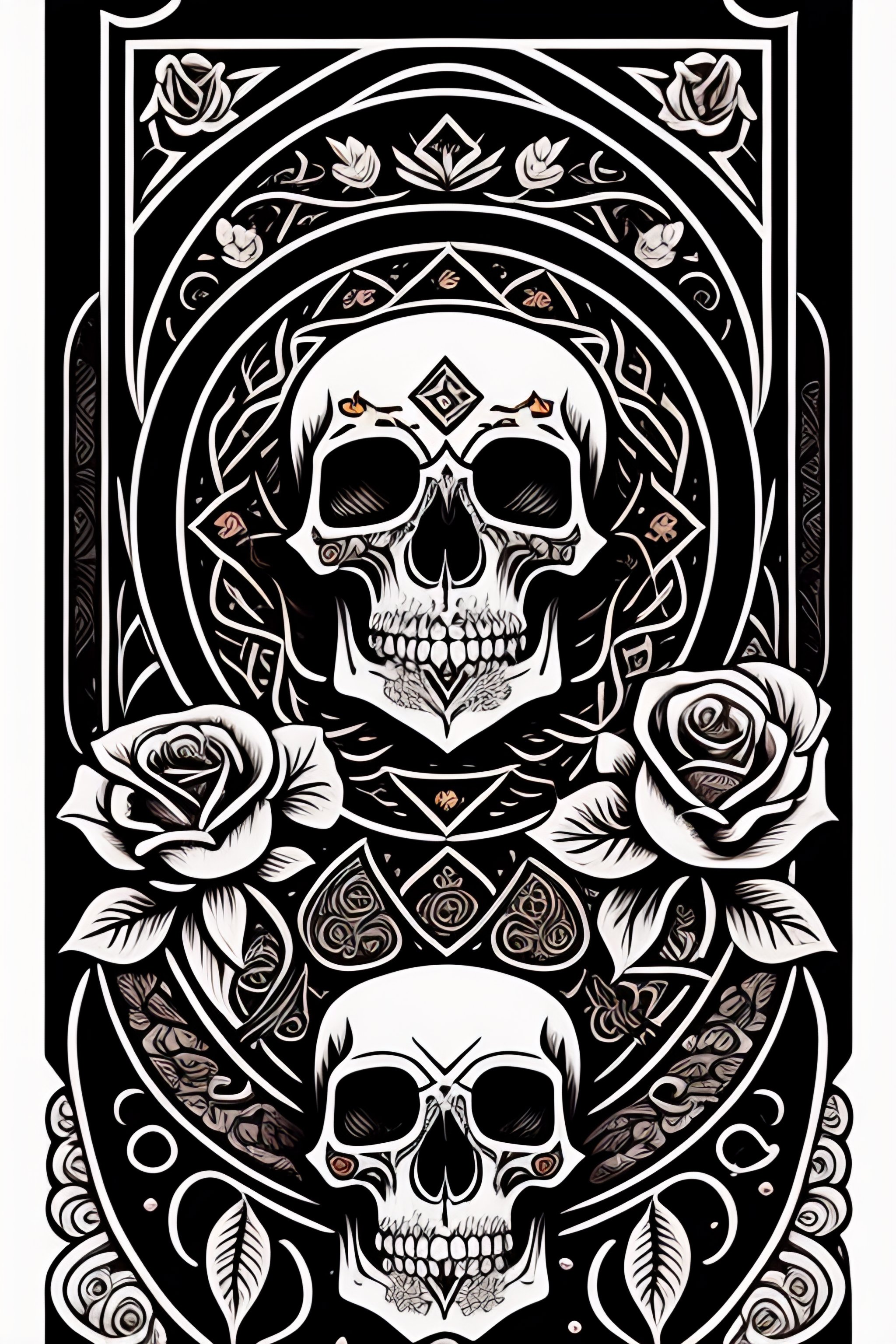 Skull, roses, tarot card, line drawing, clean clear lines, coloring book style, matte, intricate details, asian style art
