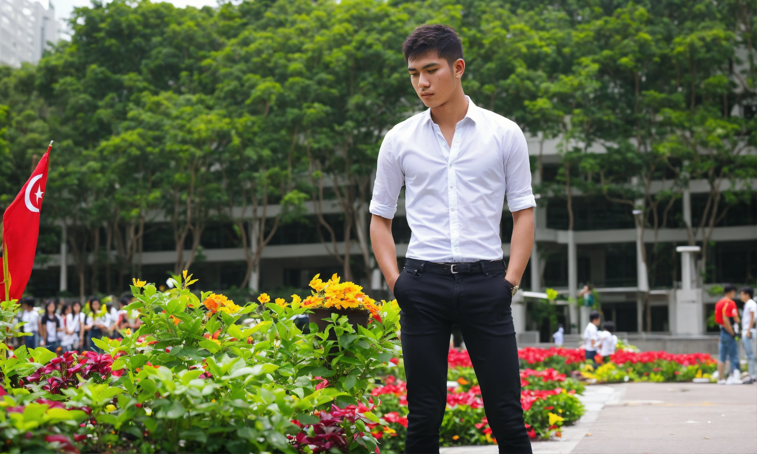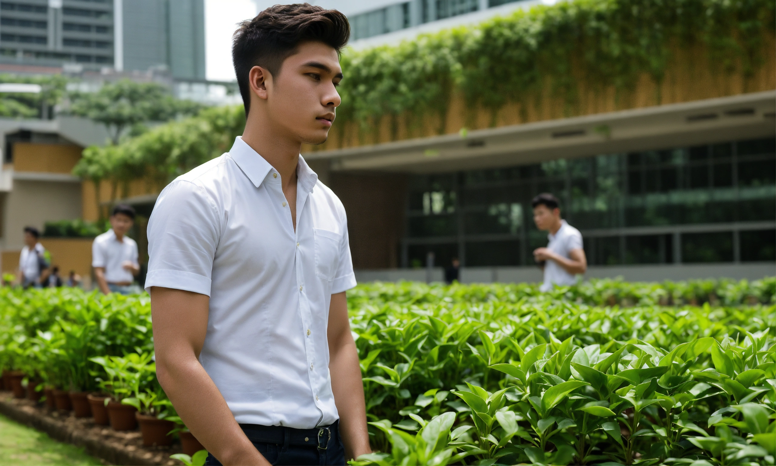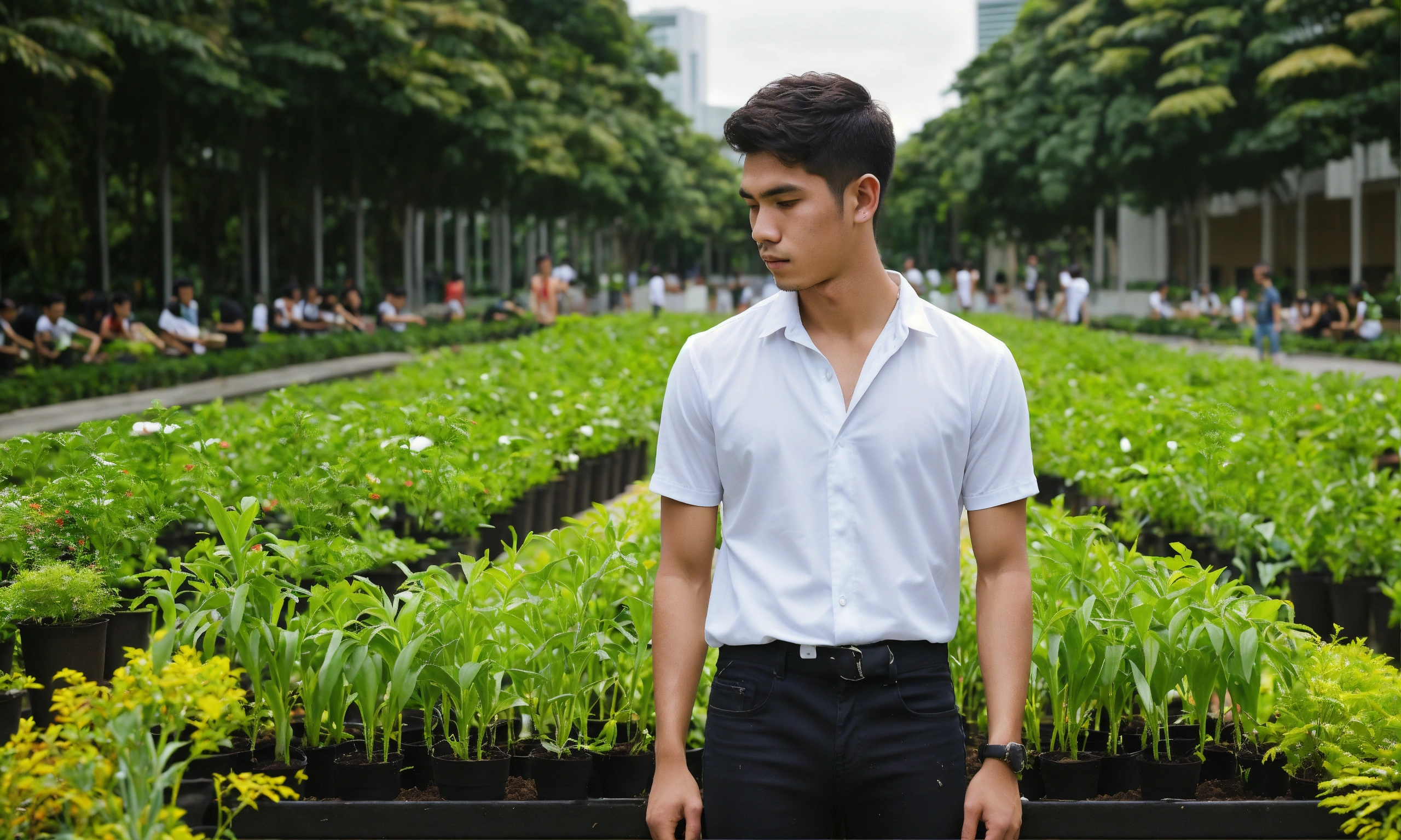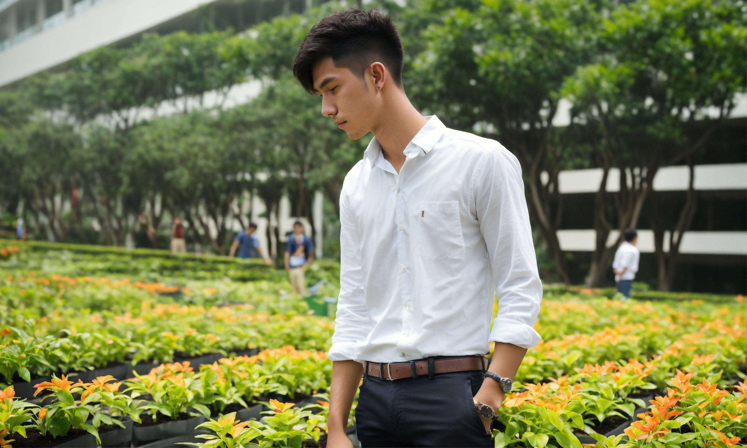 A 21 year old handsome man, in a white shirt, black jeans, against the background of singapore management university as the background, there are other students there as well. he just stood up from planting plants. looking down at plants hands on his hips. he's not looking at the camera. his hands are slightly soiled from planting.