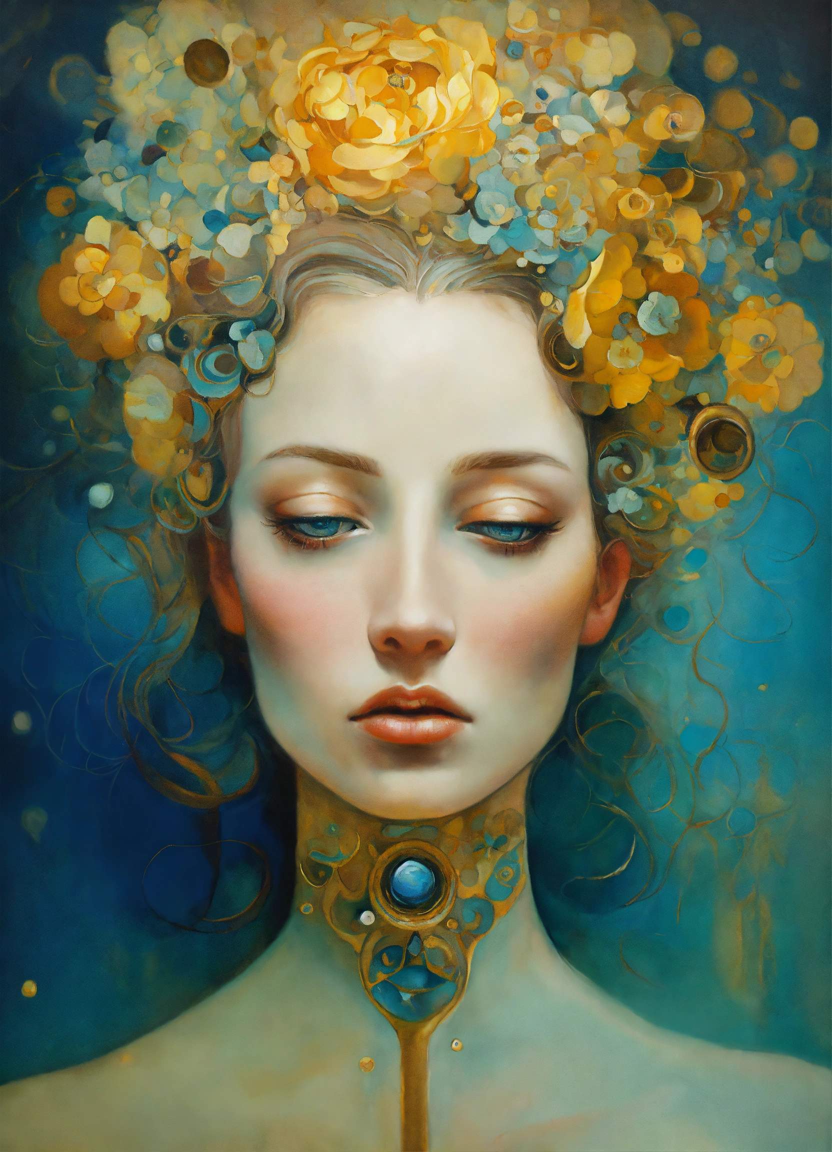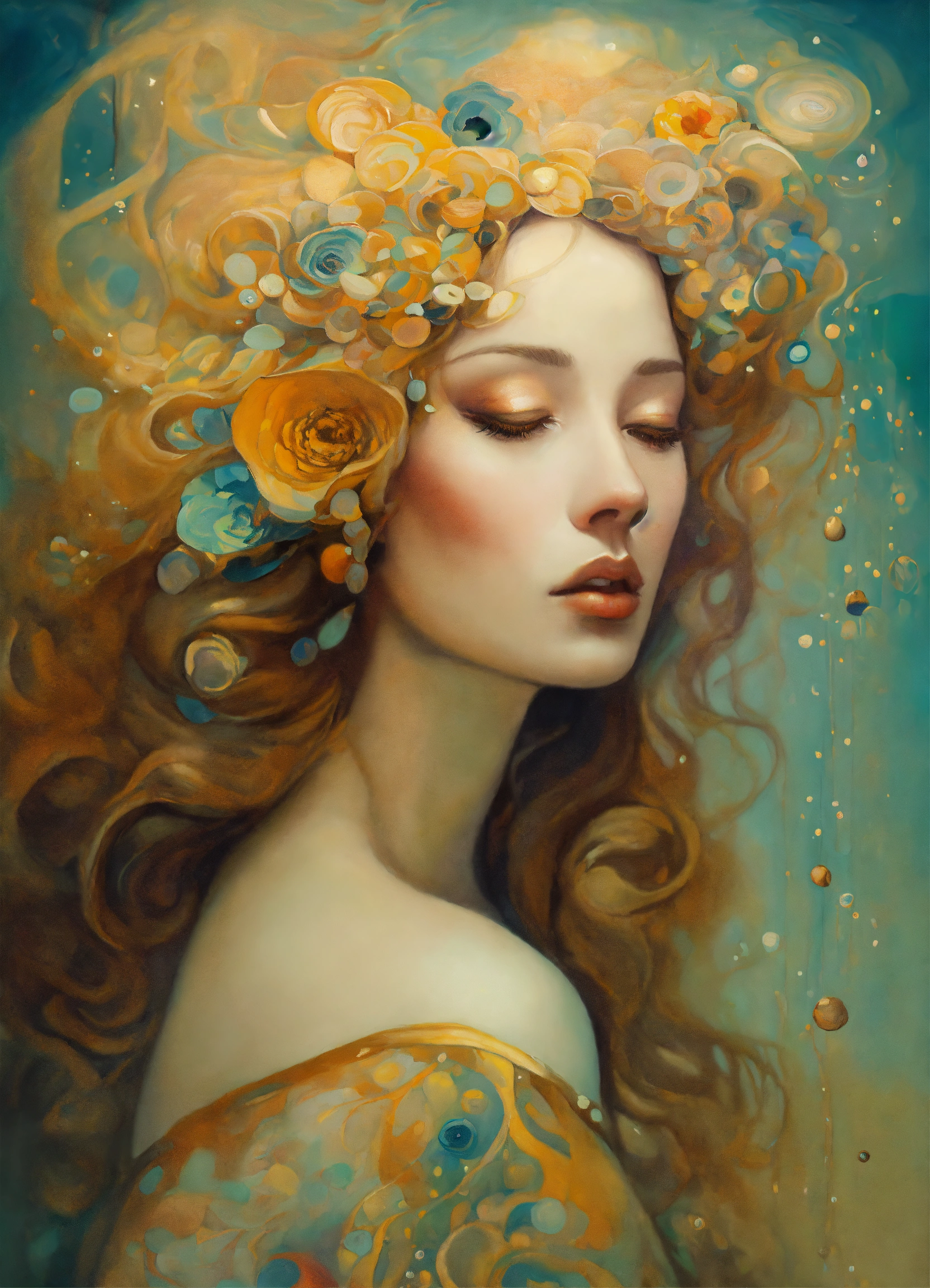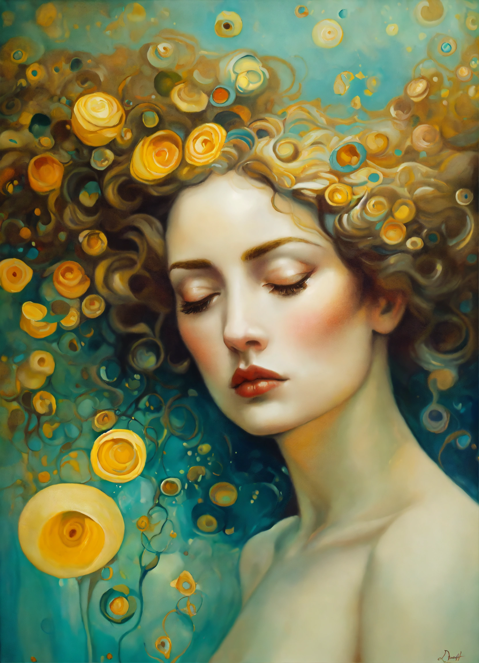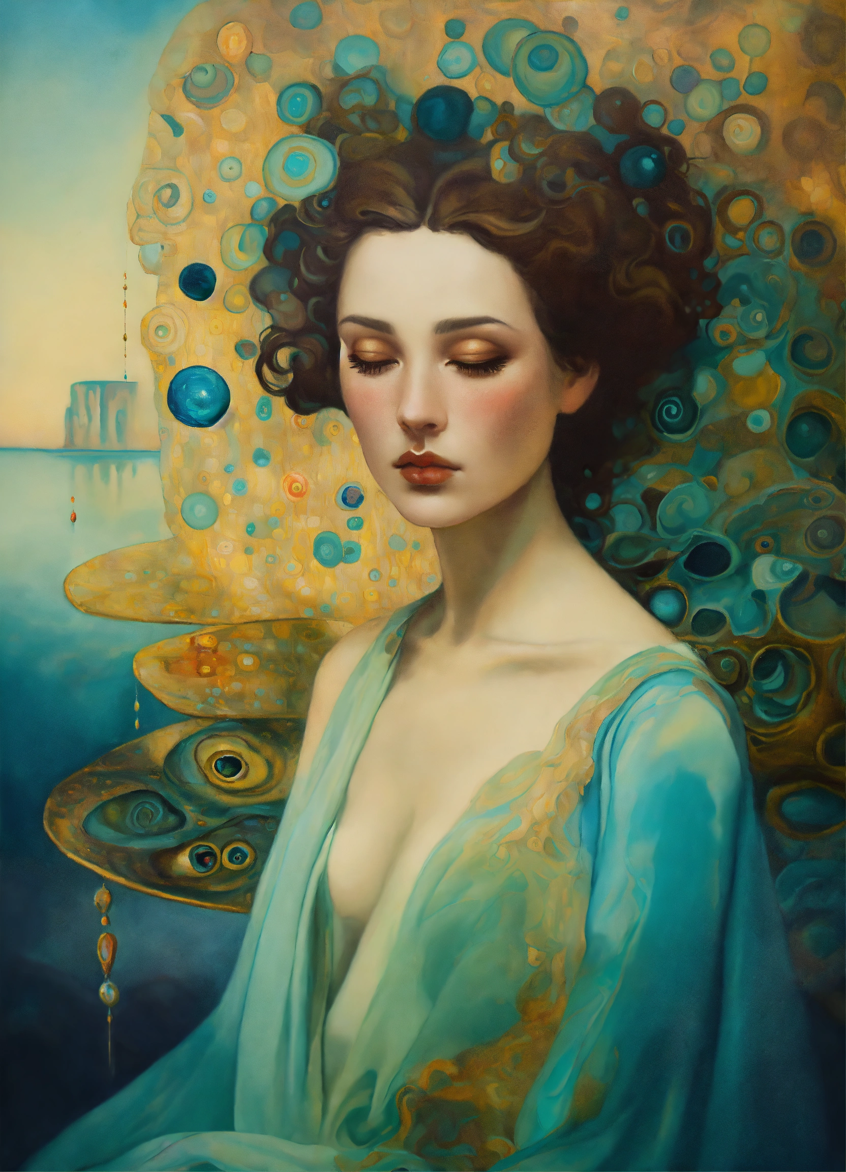 Oil painting surreal figure, by salvador dali, by gustav klimt, sad, romantic, breathtaking, by anna dittman, by gustav klimt