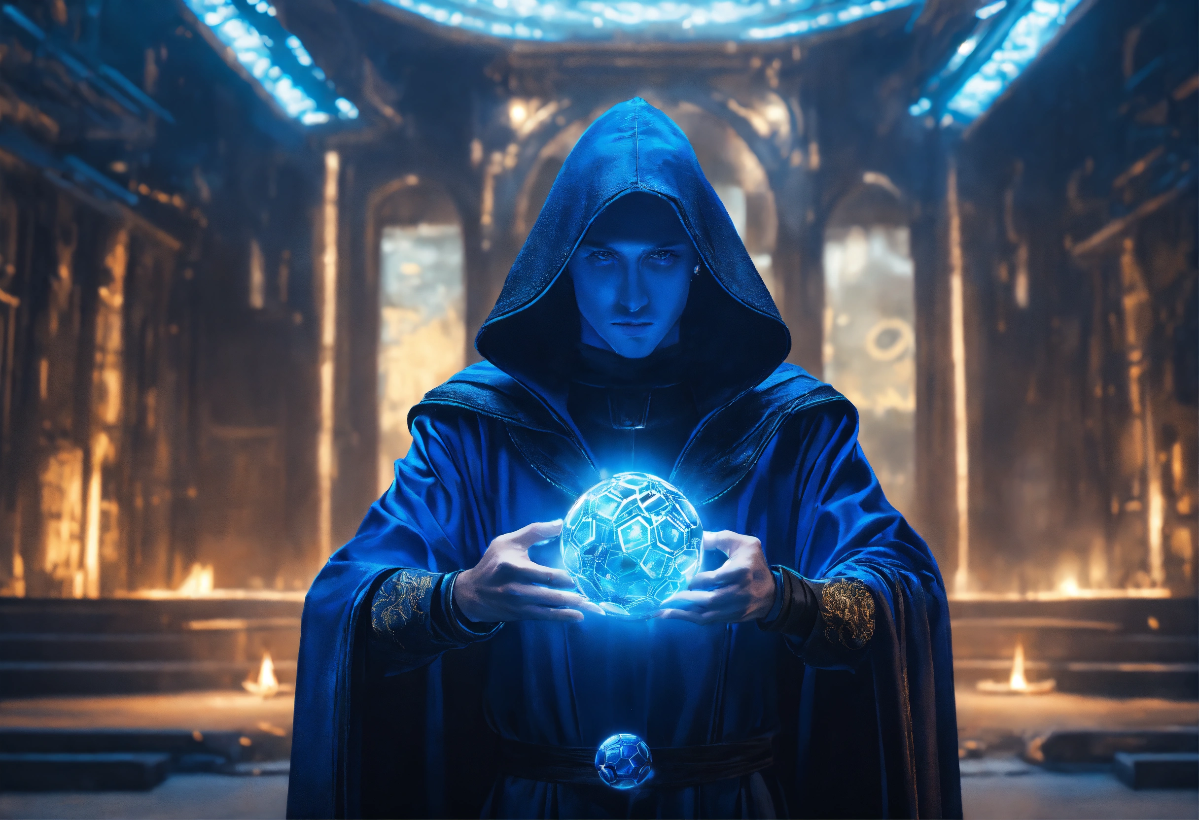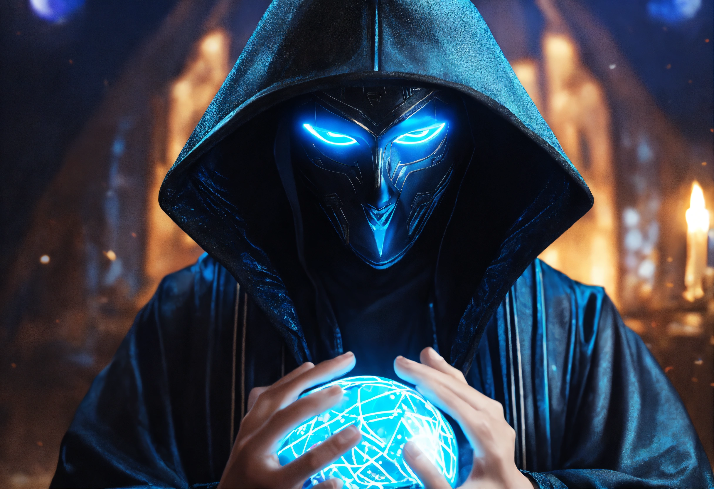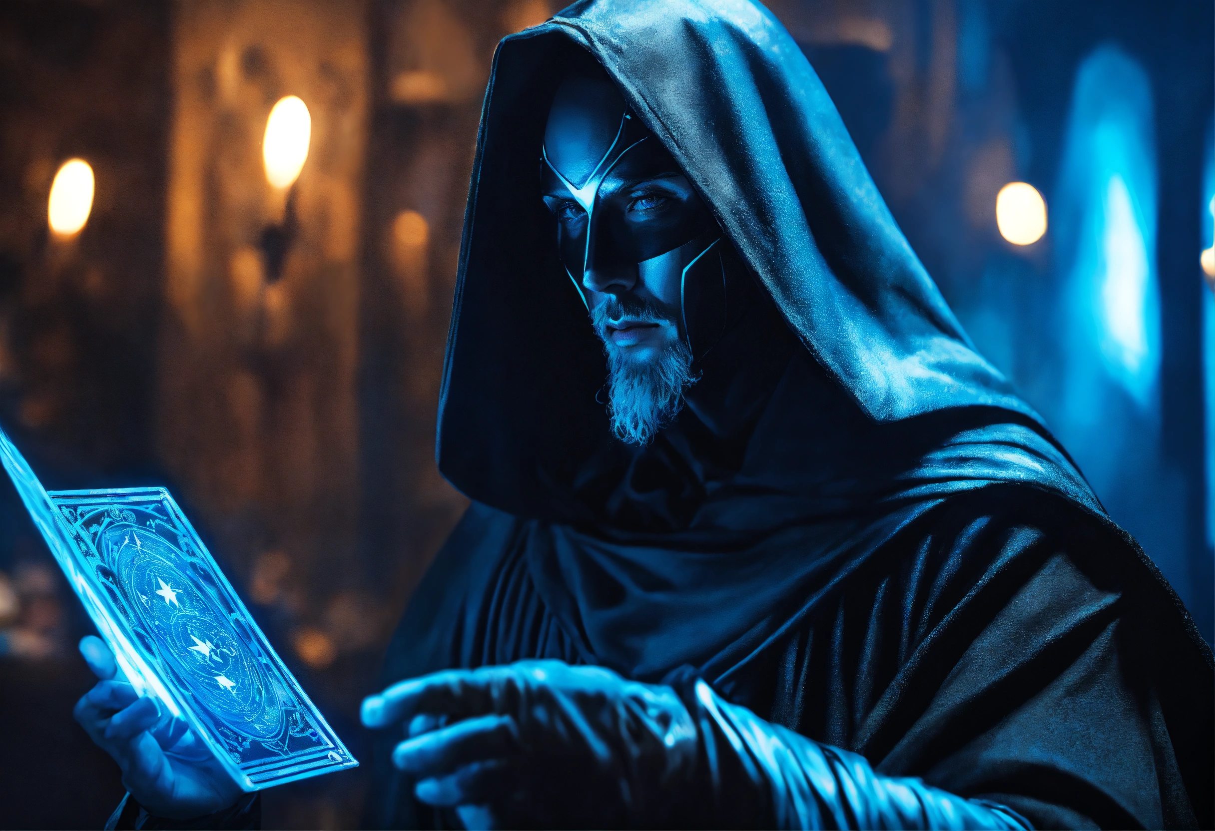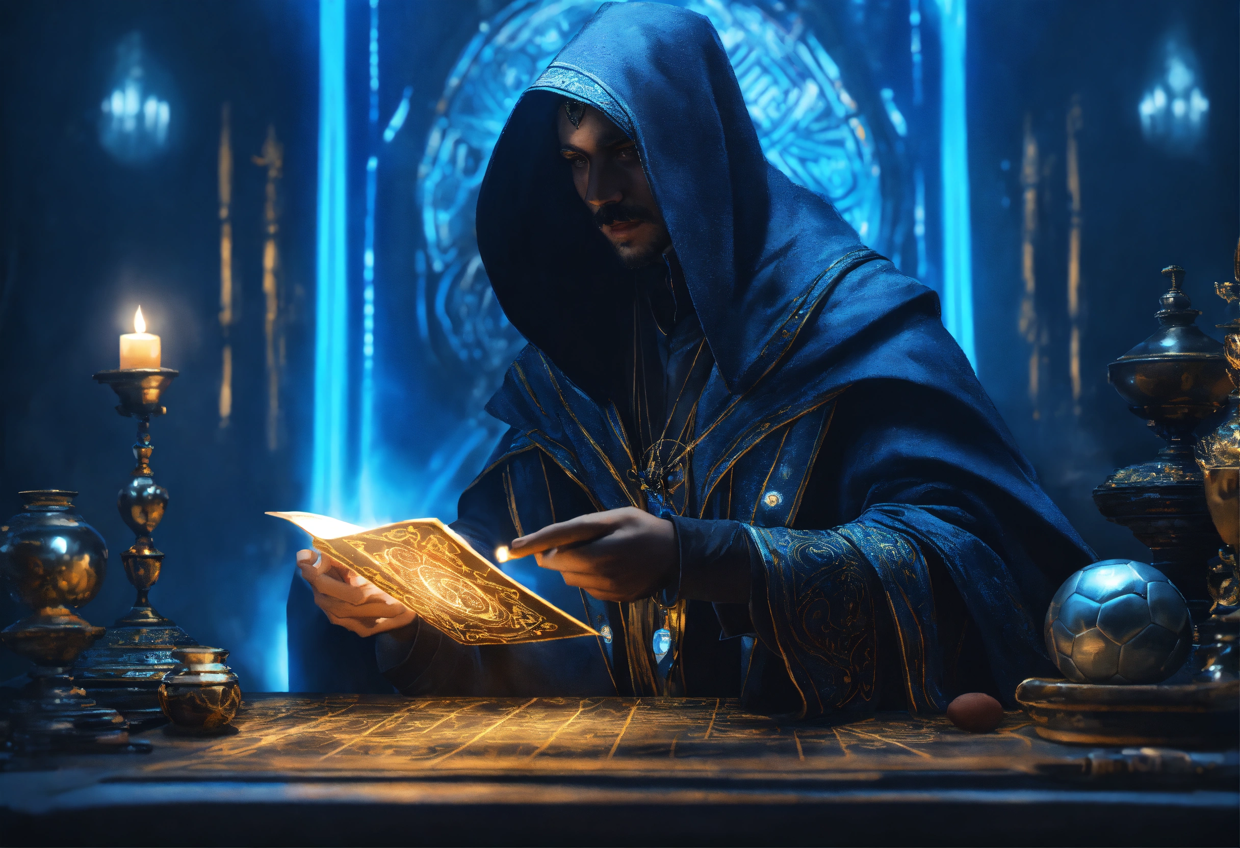 A black and blue cloaked half masked sorcerer casting a spell, soccer betting, fortune teller, psychic, futuristic background, cyberpunk style, 8k, hyper realistic