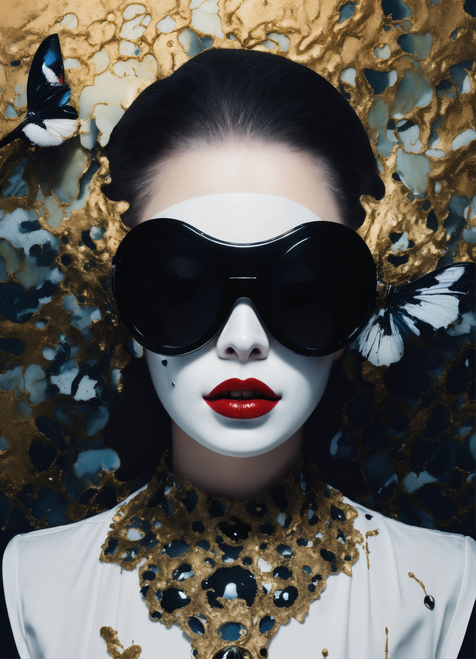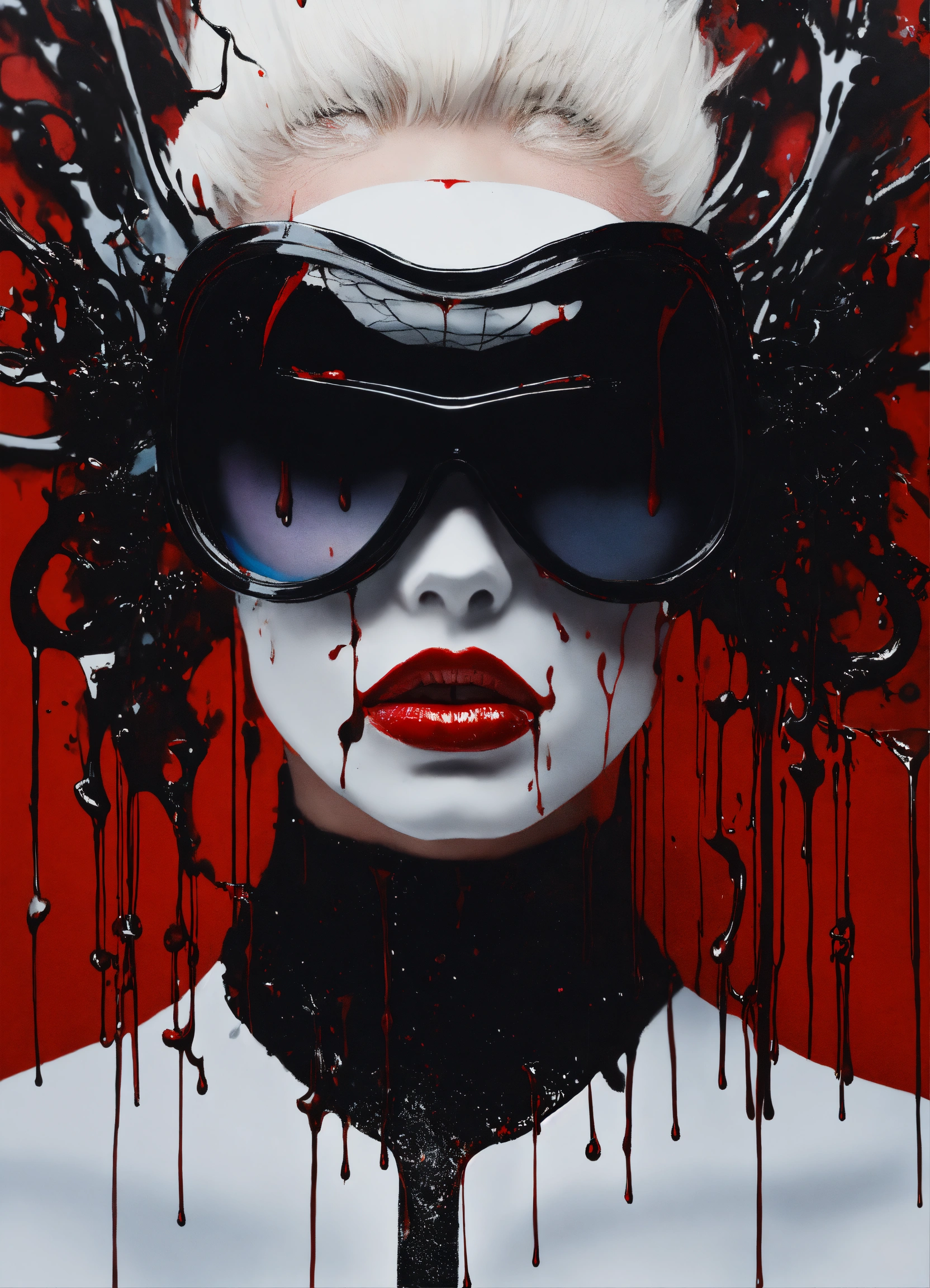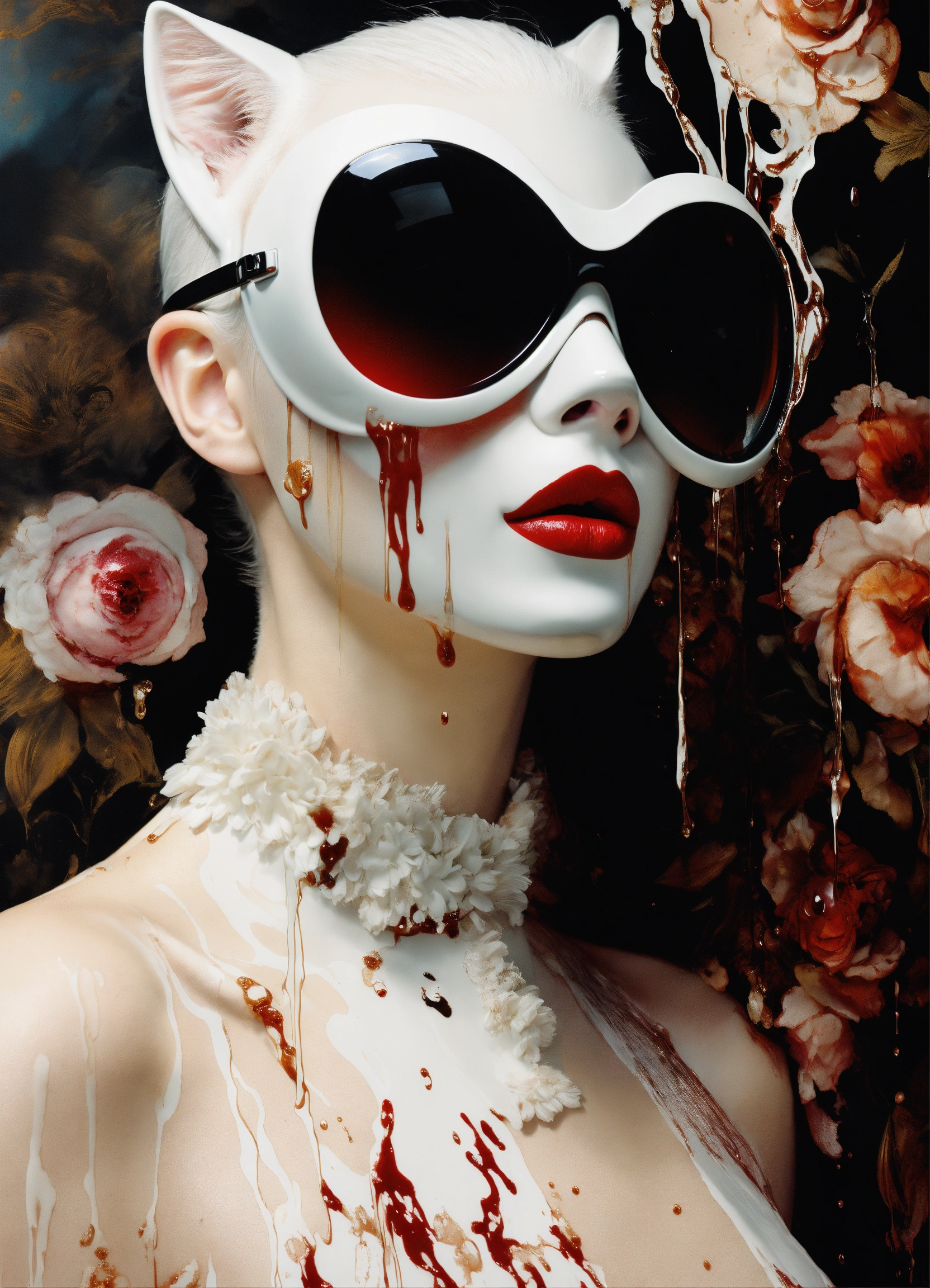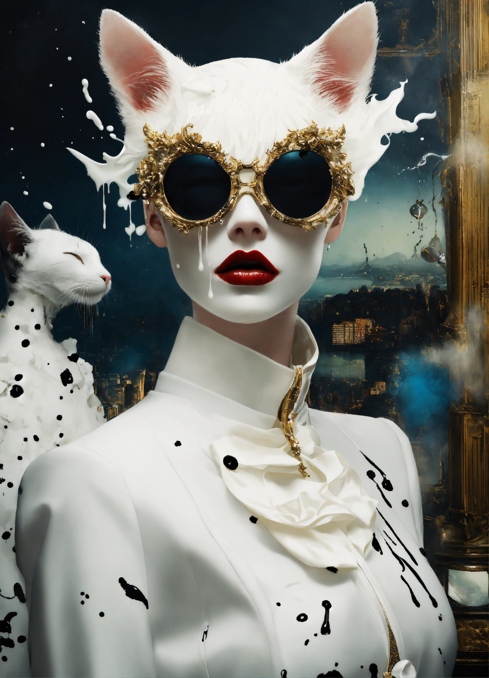 Close-up photography, a white cat woman mask with drip mess of full of black paint splatter dripping, pop prada air hostess with sunglasses, an attractive, 80 degree view, art by sergio lopez, natalie shau, james jean and salvador dali