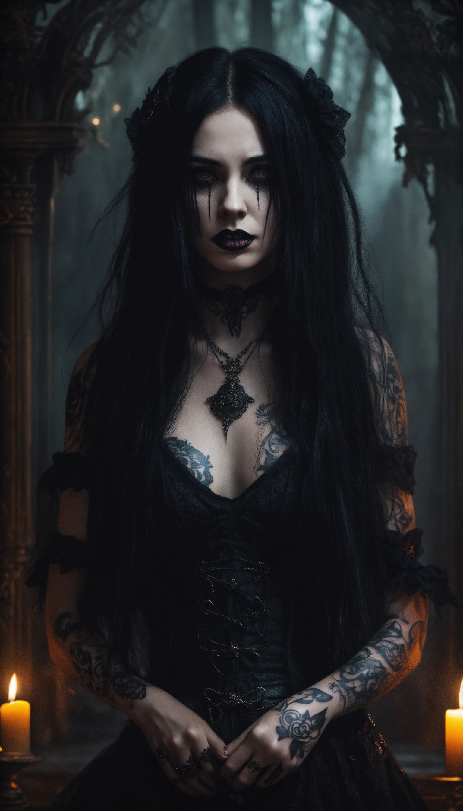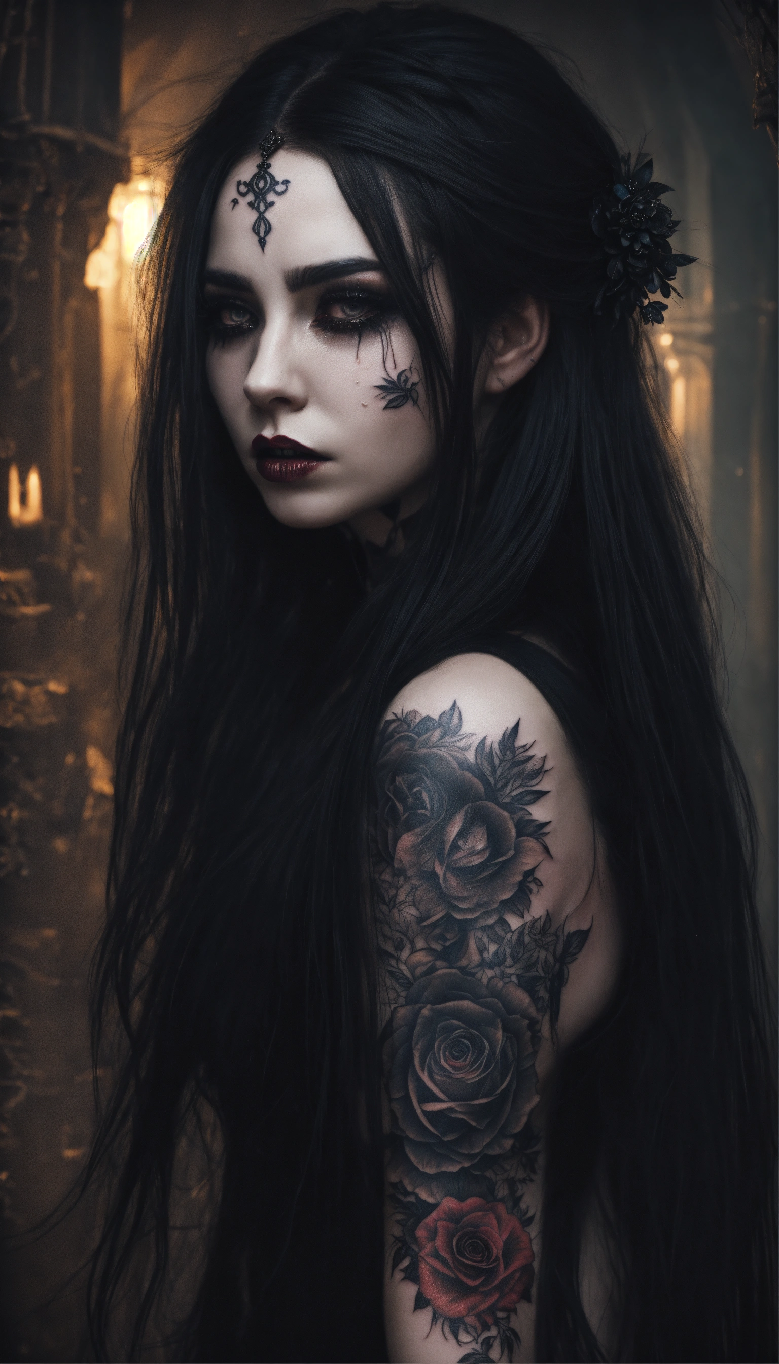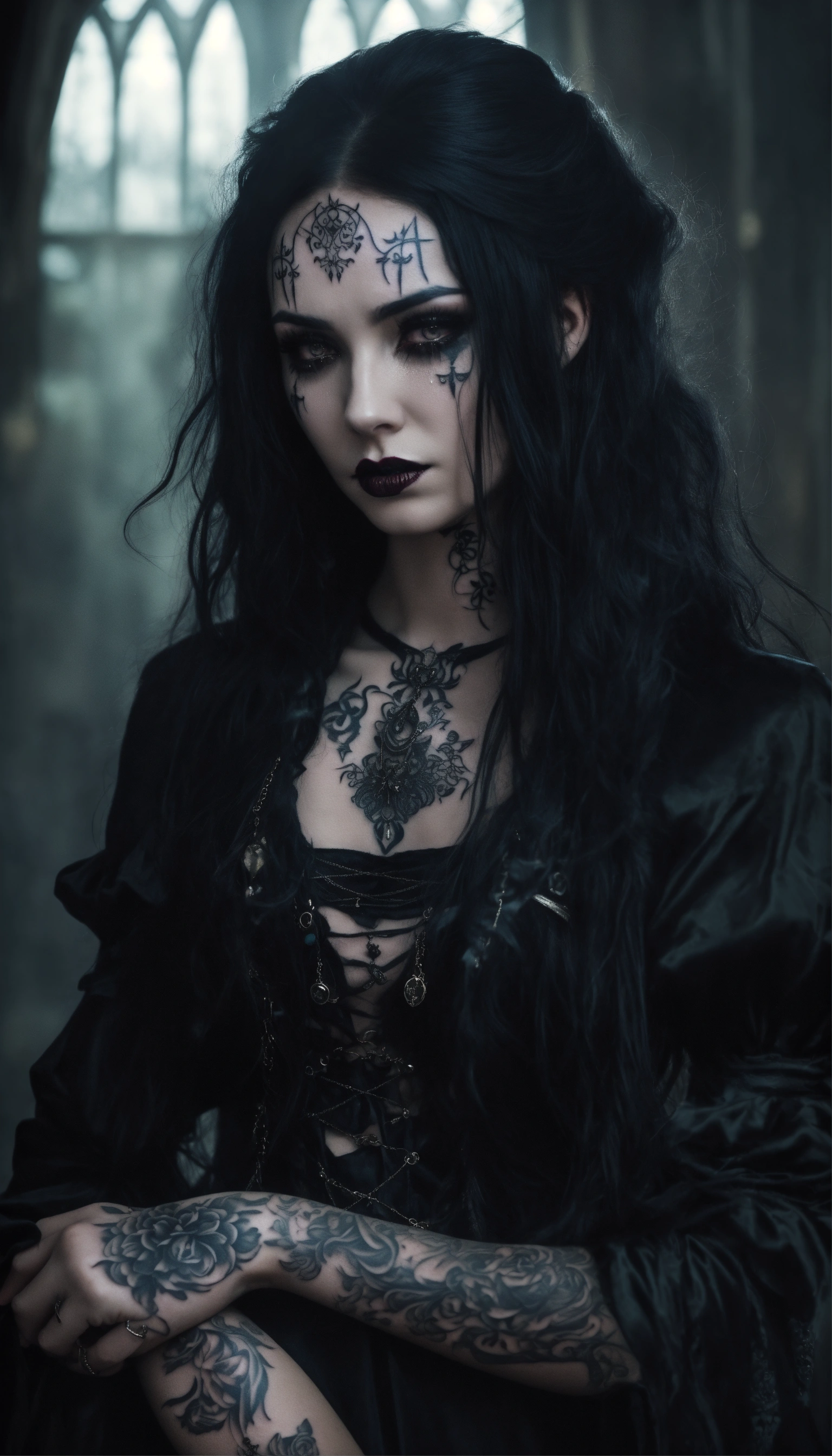 A scary girl, full body, pale skin, long crazy black hair, dark eyes, a dark and mysterious appearance, facial tattoos, gothic aura, crying