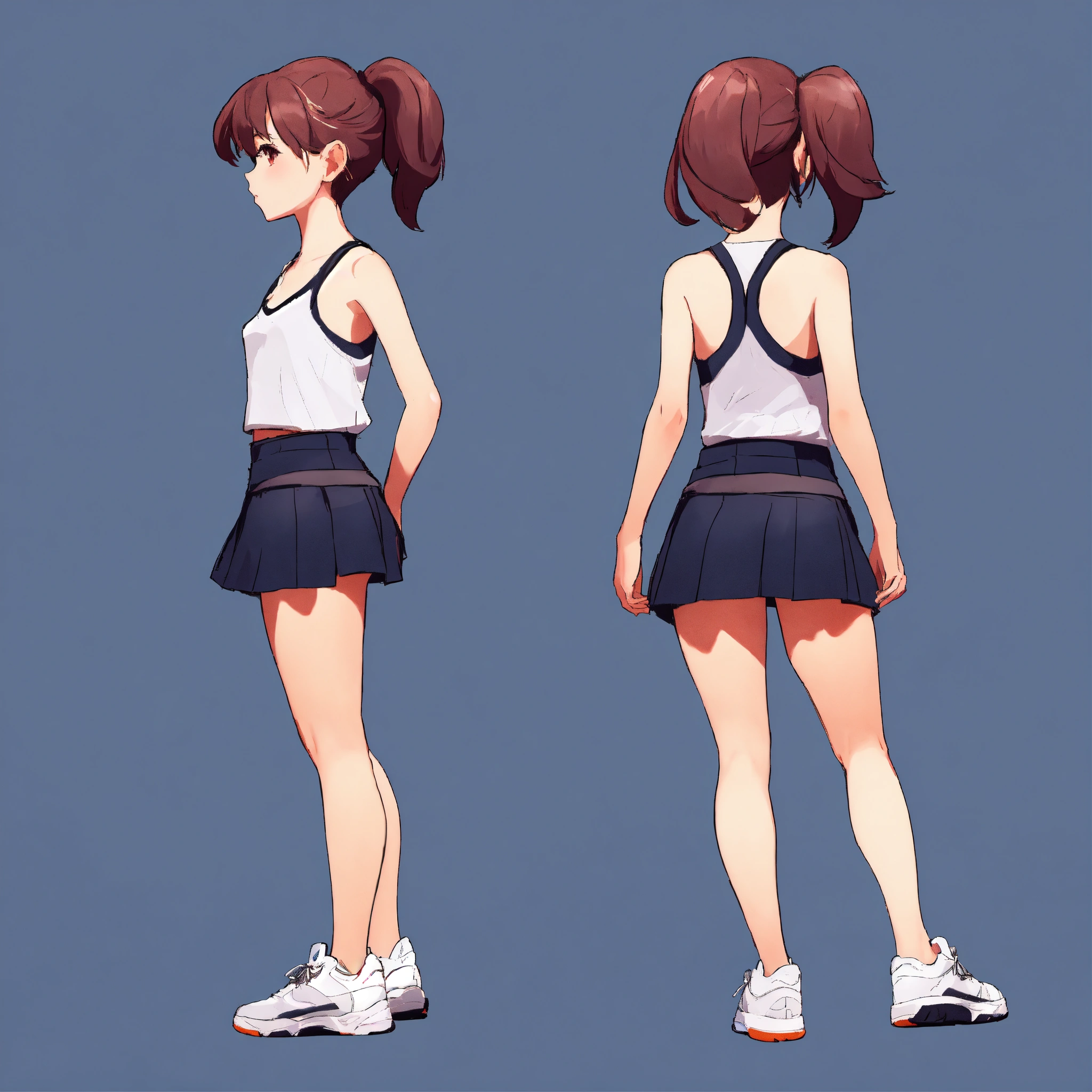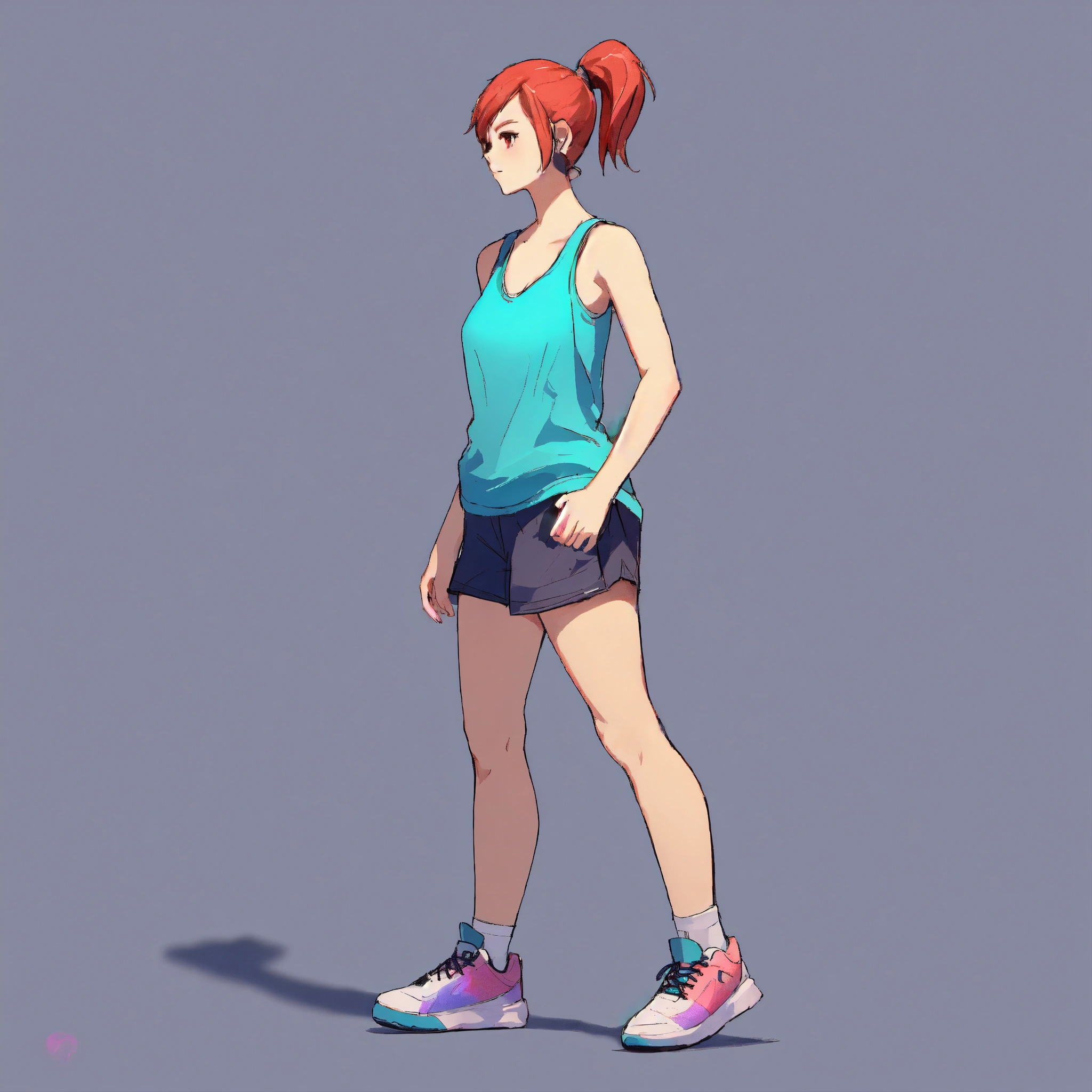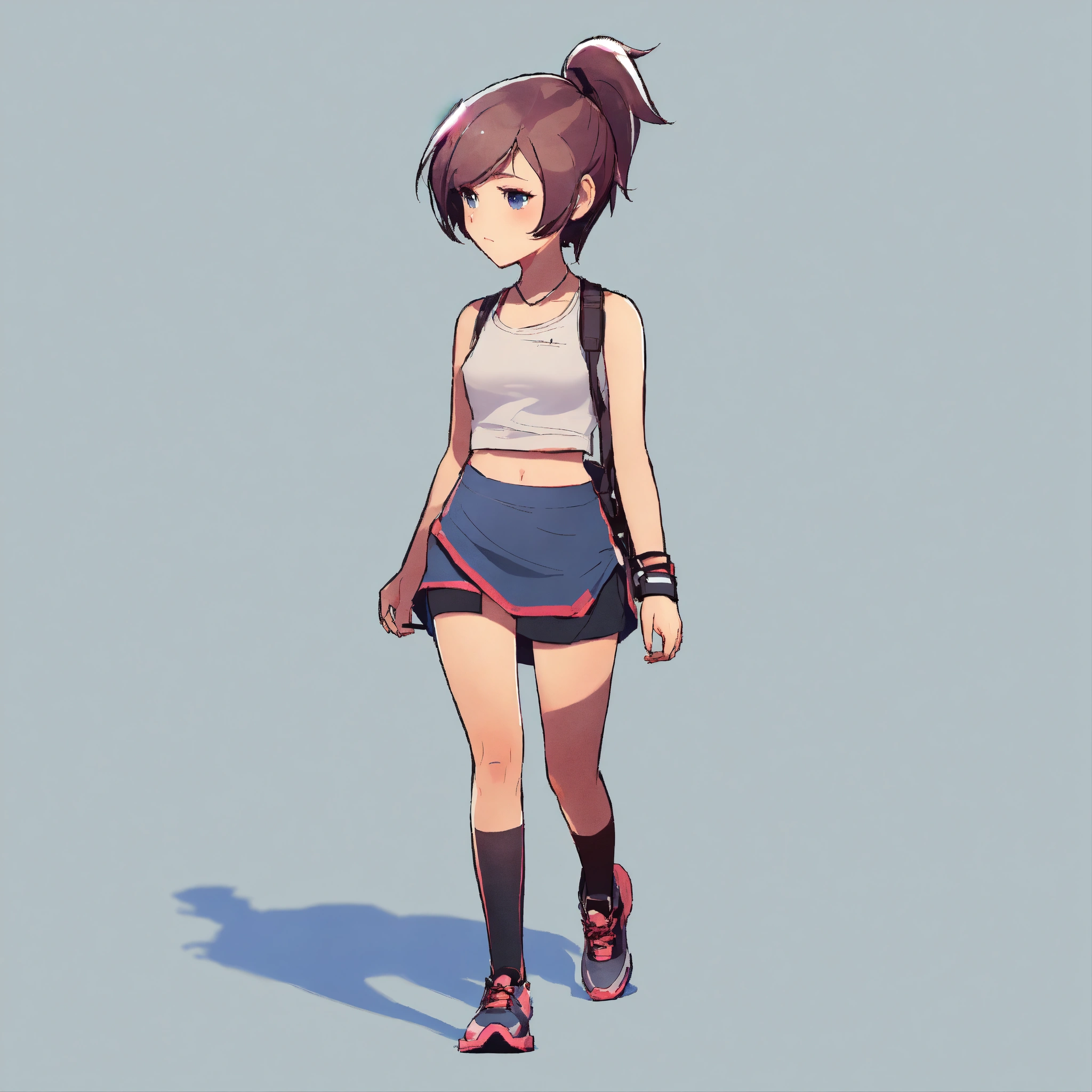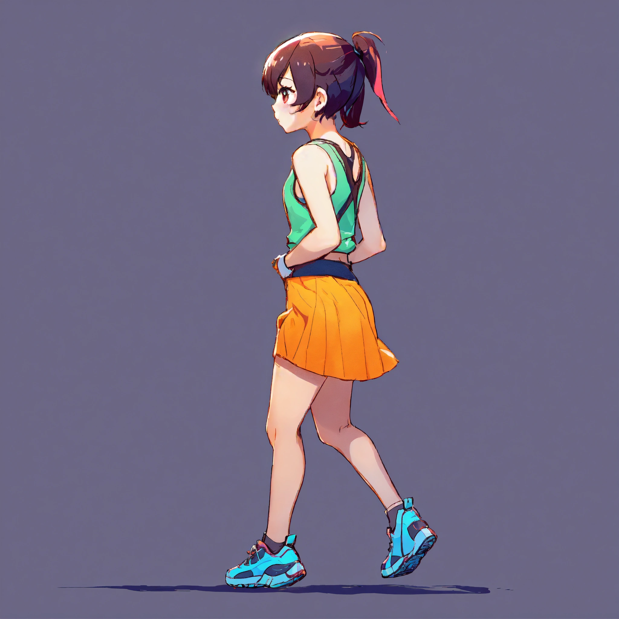 Short haired girl with ponytail wearing tank top and short skirt, walking, game art, full body view, side view, chibi proportions, blank background, bright cool colors. no outlines, trending on artstation