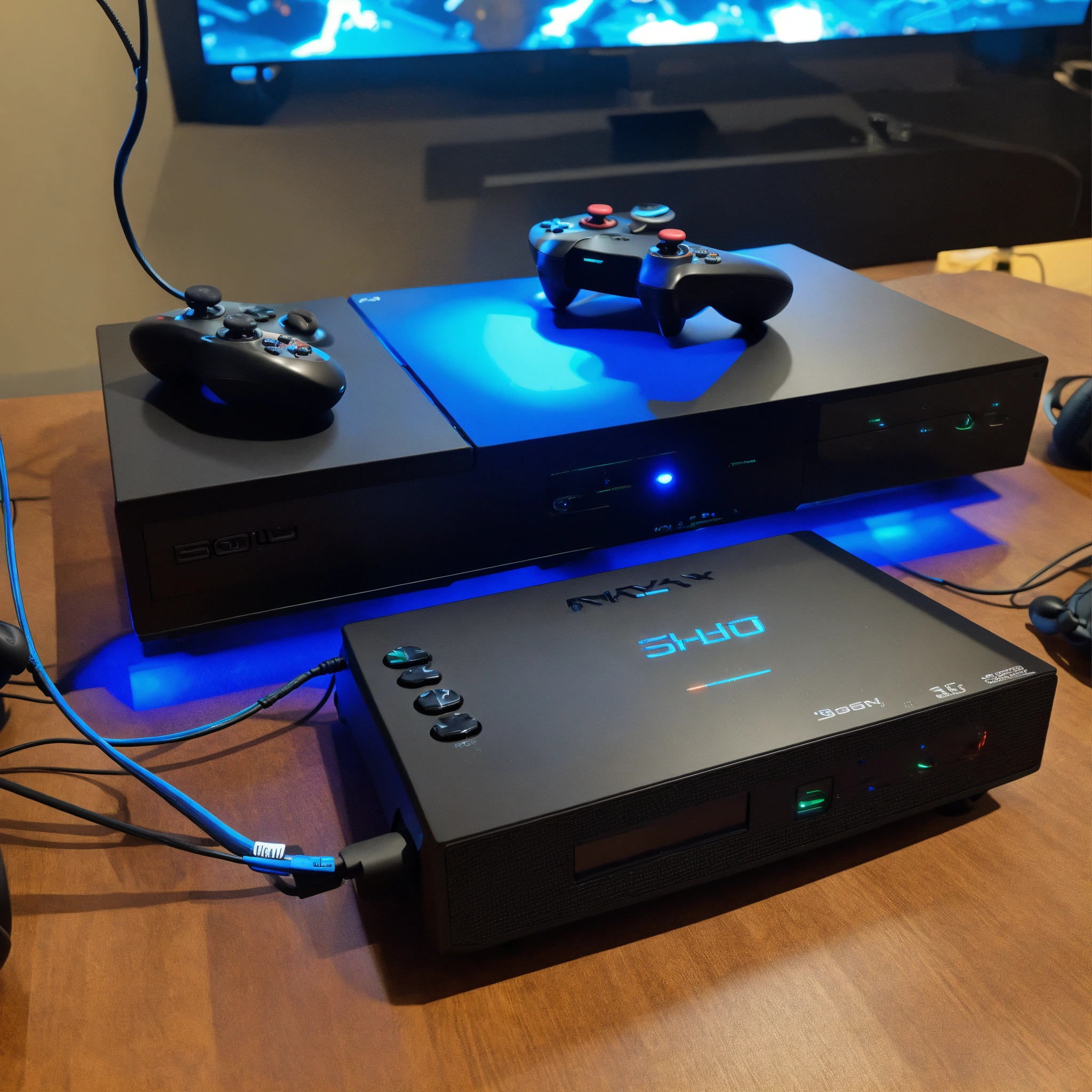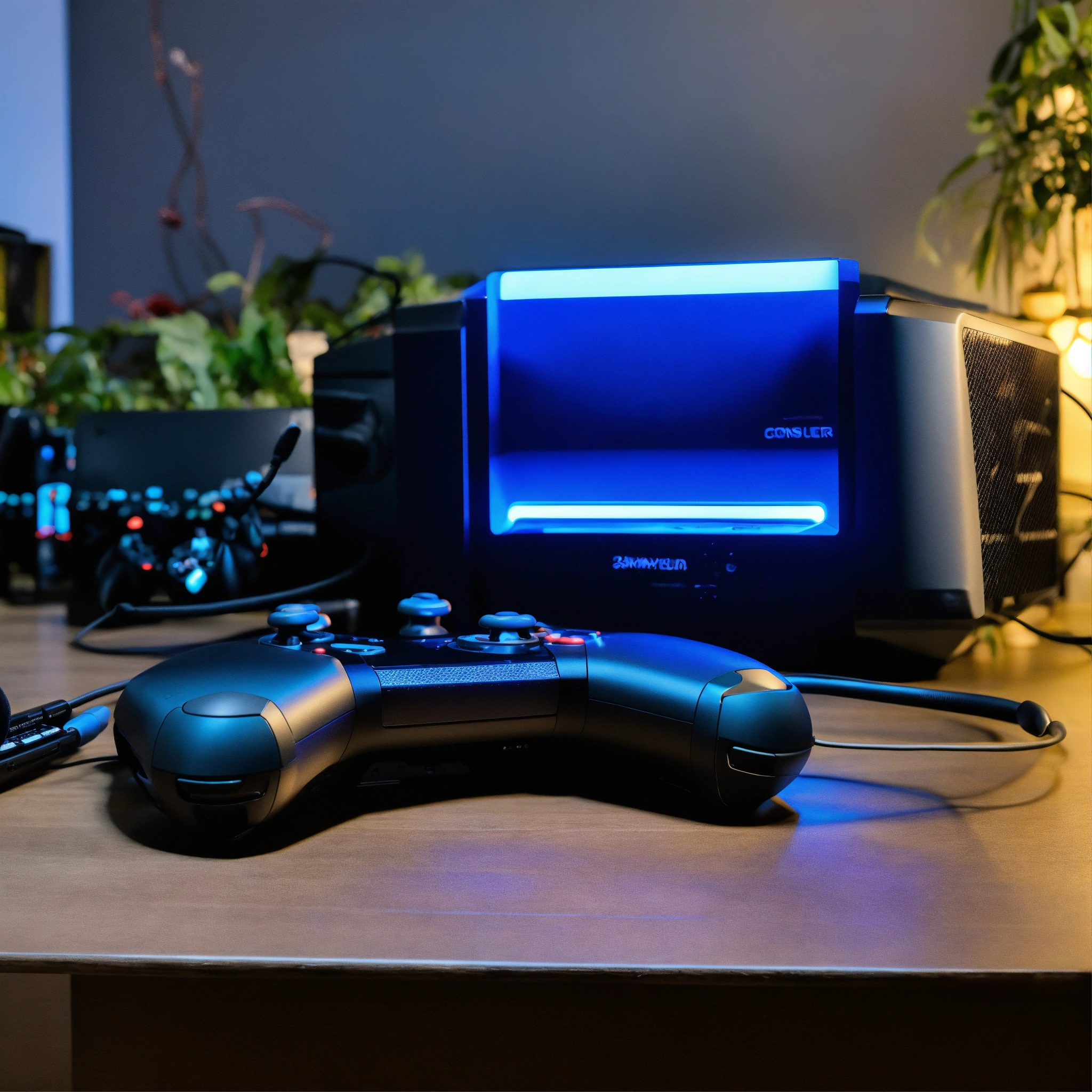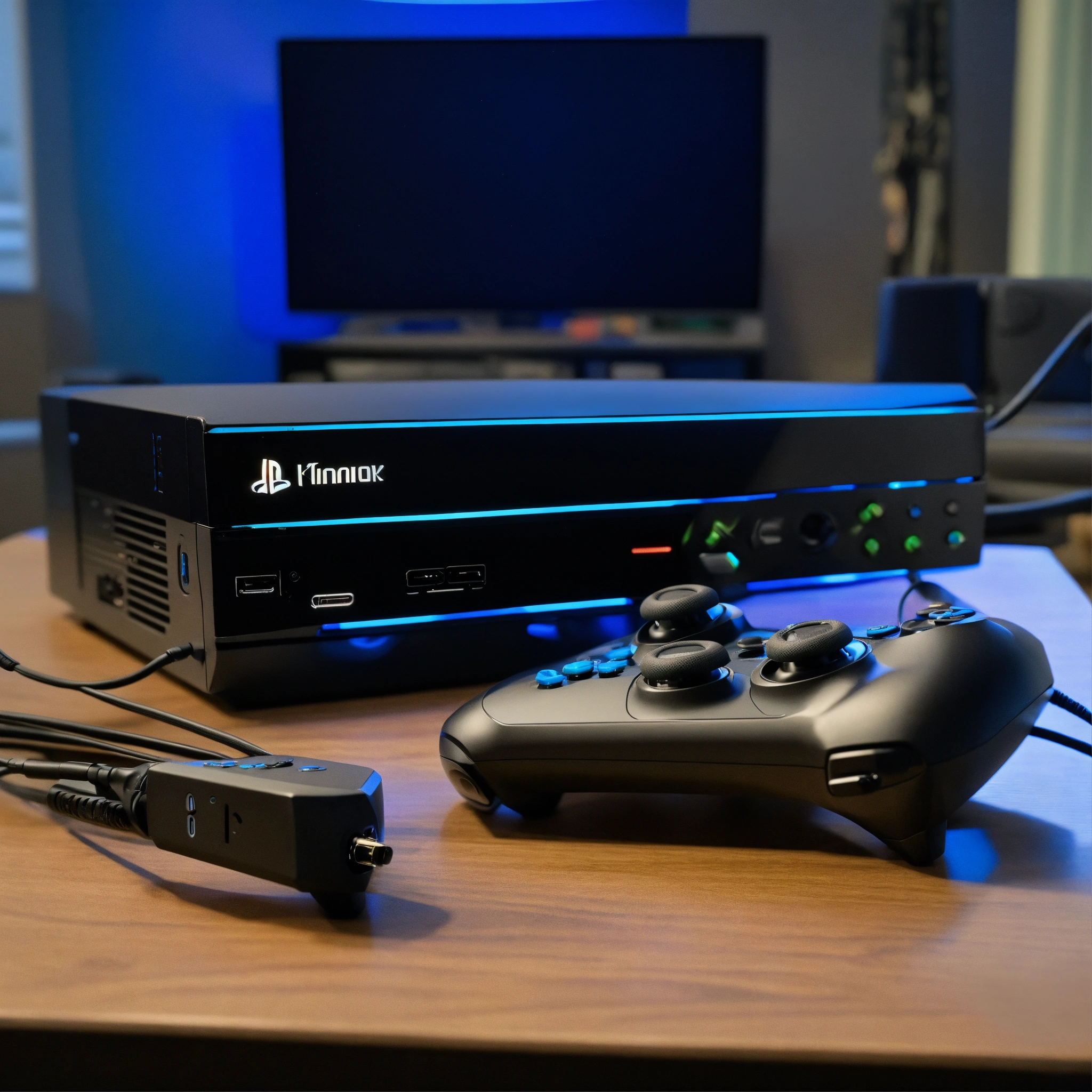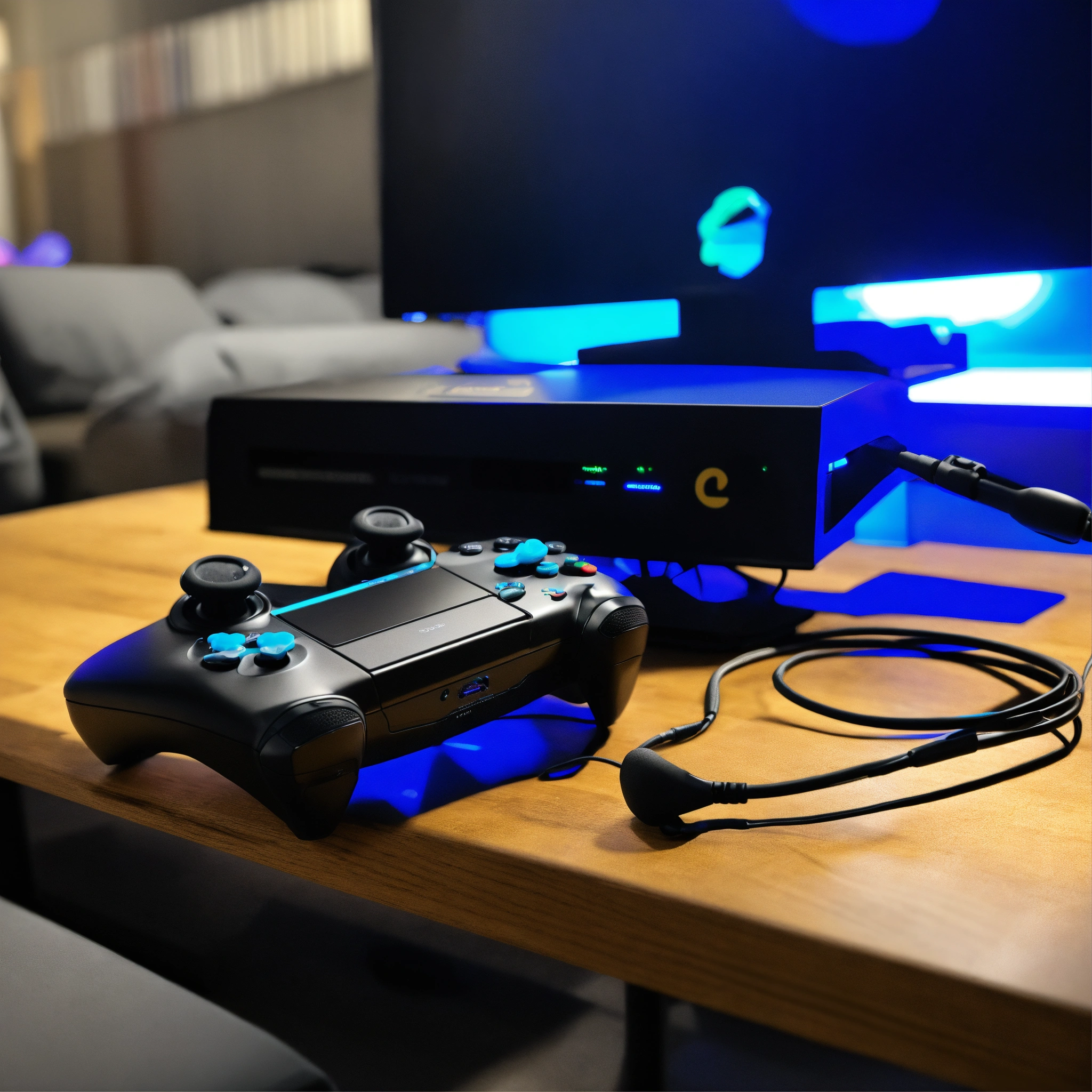 A photo of a gaming console, the console is black and has a blue light on the front, the console is on a table with a controller and a headset