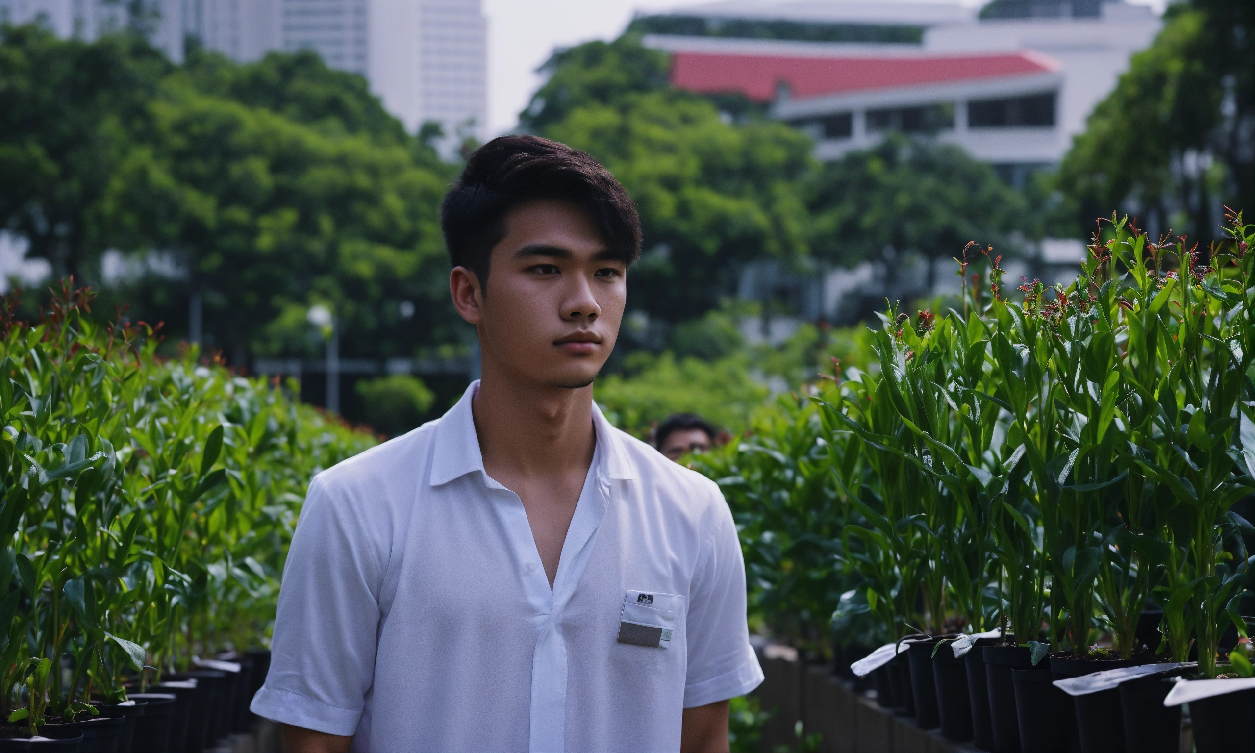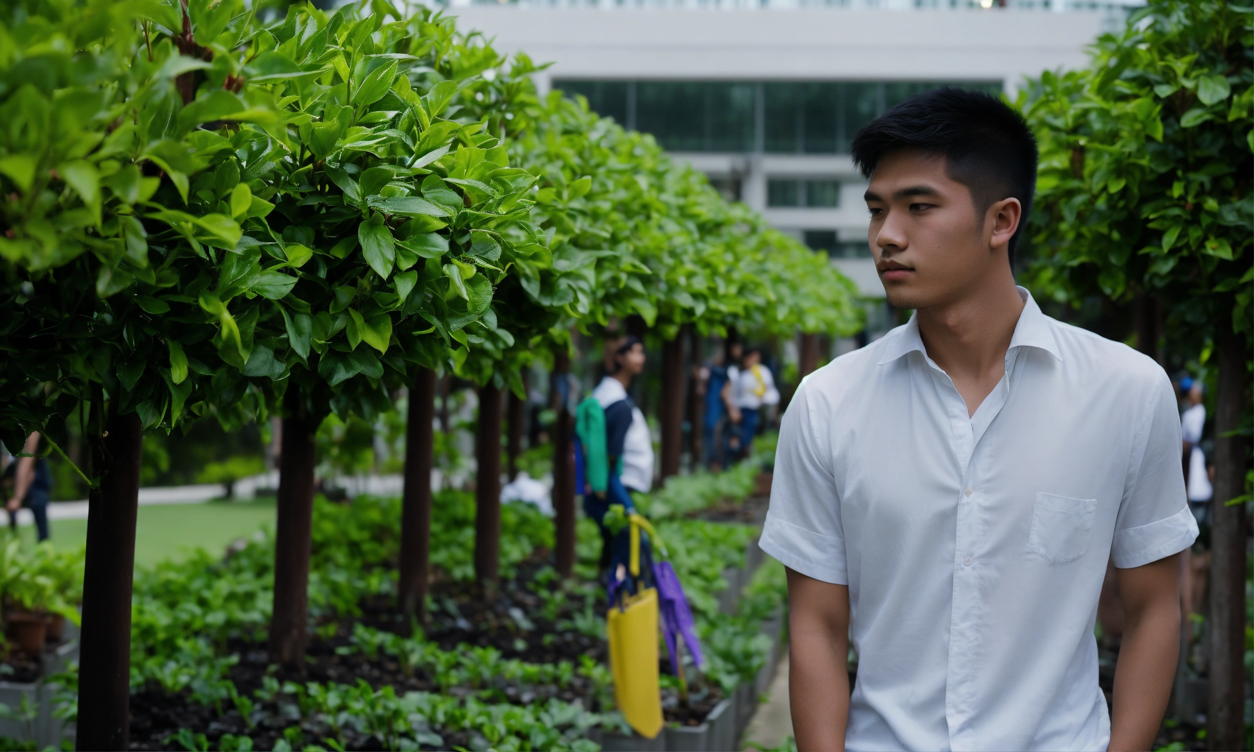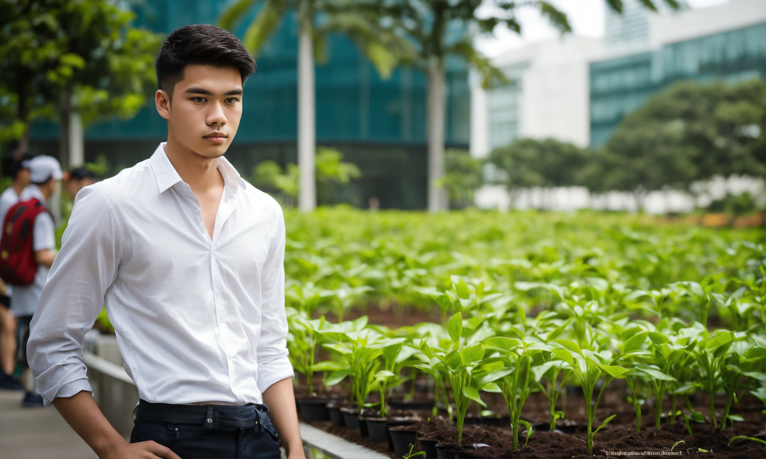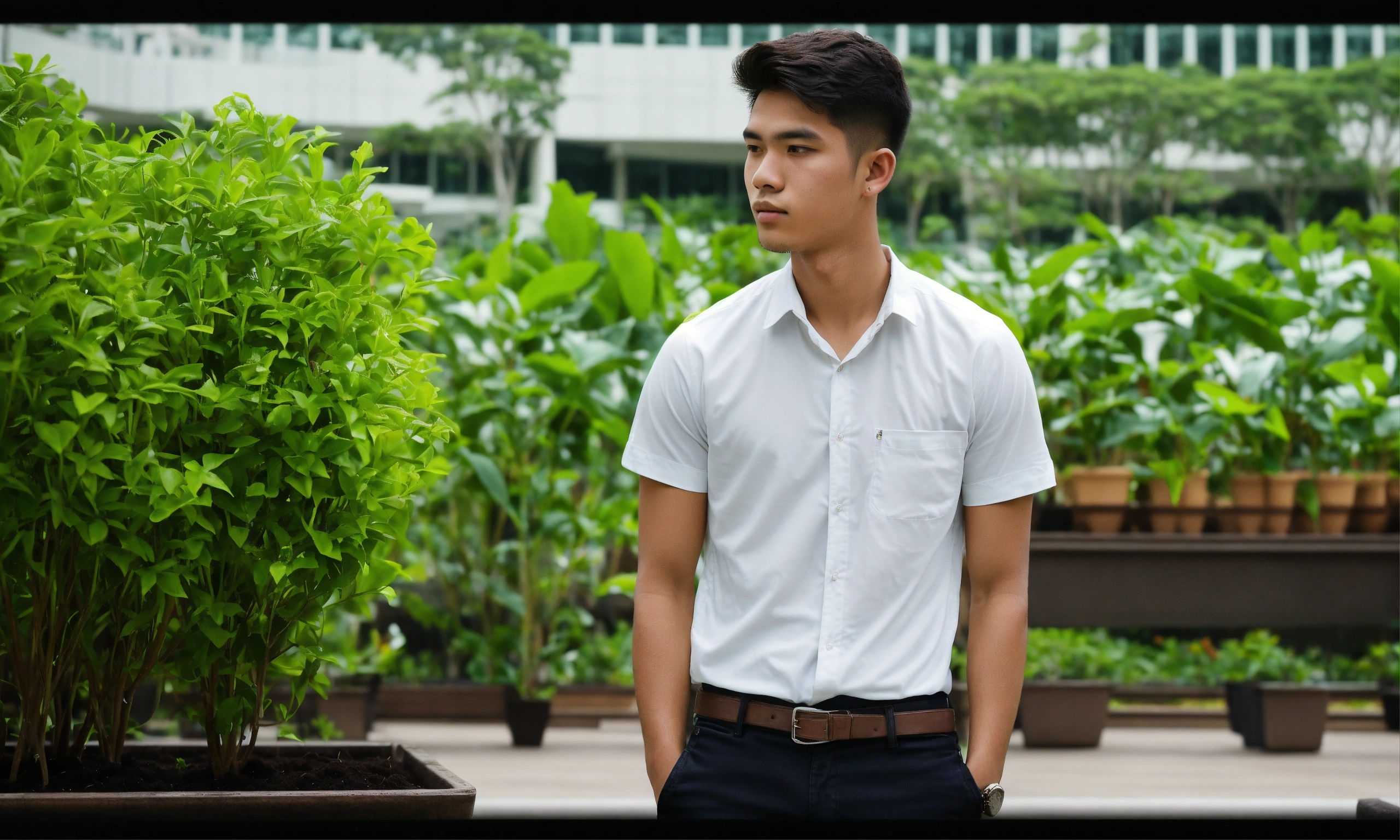 A 21 year old handsome man, in a long white shirt, black jeans, against the background of singapore management university as the background, there are other students there as well. he just stood up from planting plants. looking down at plants with a look that he doesnt really like doing this. he's not looking at the camera.