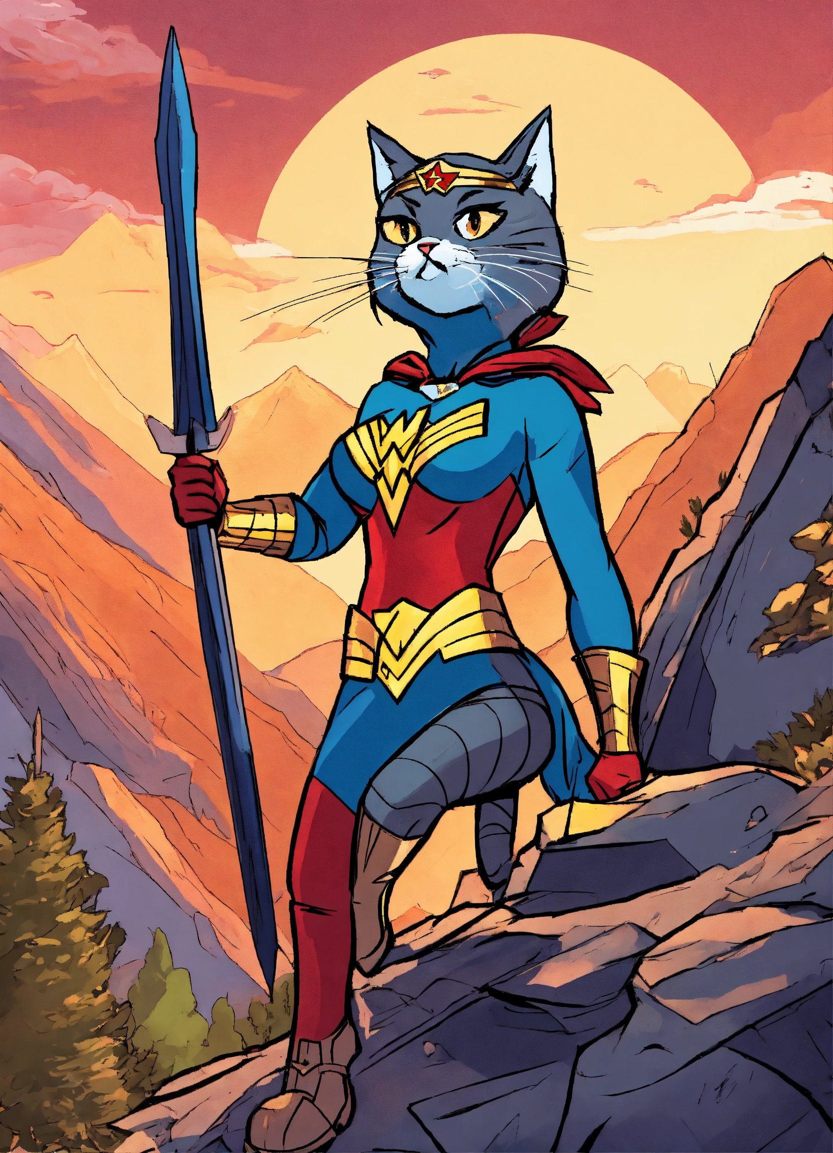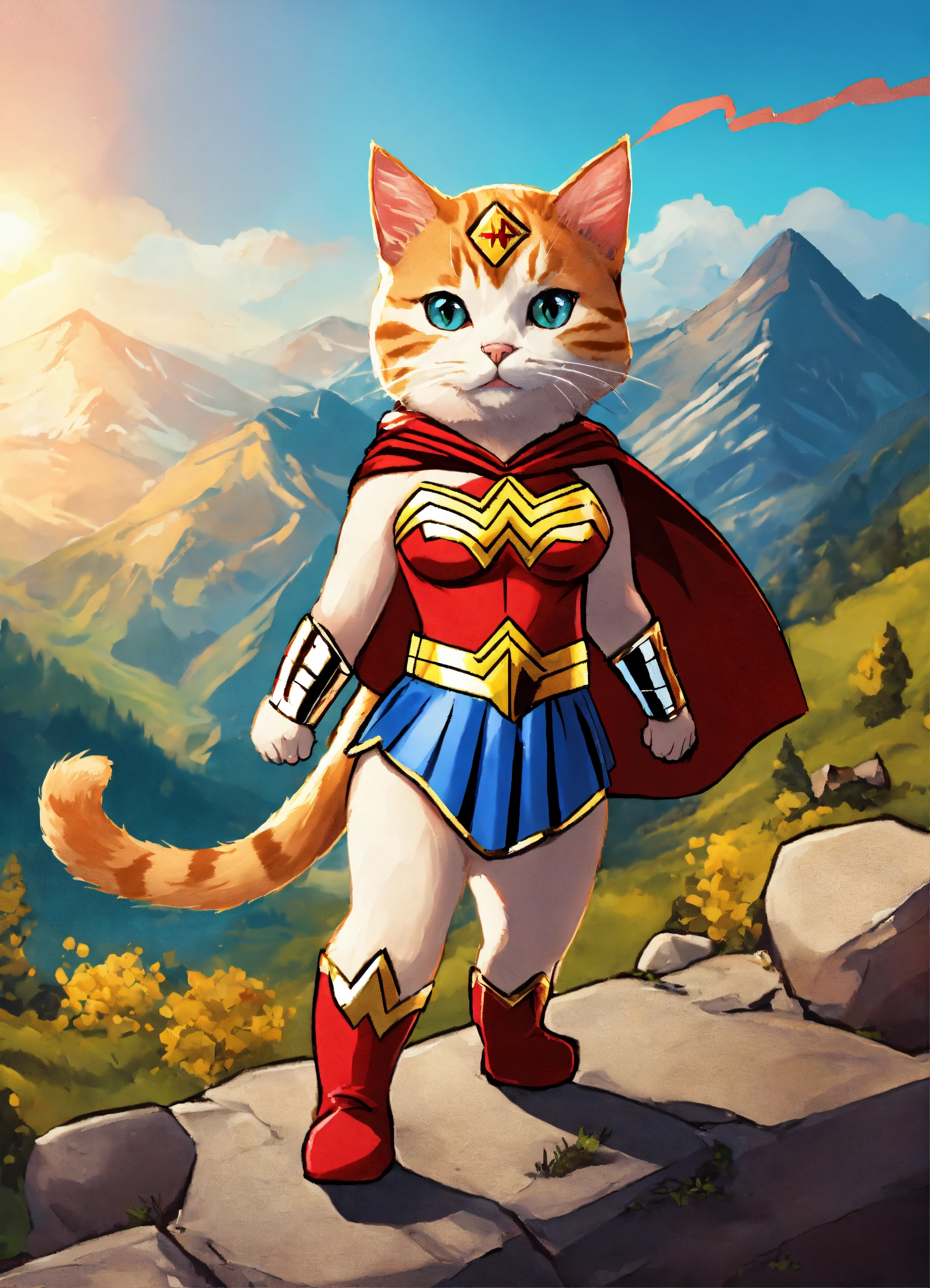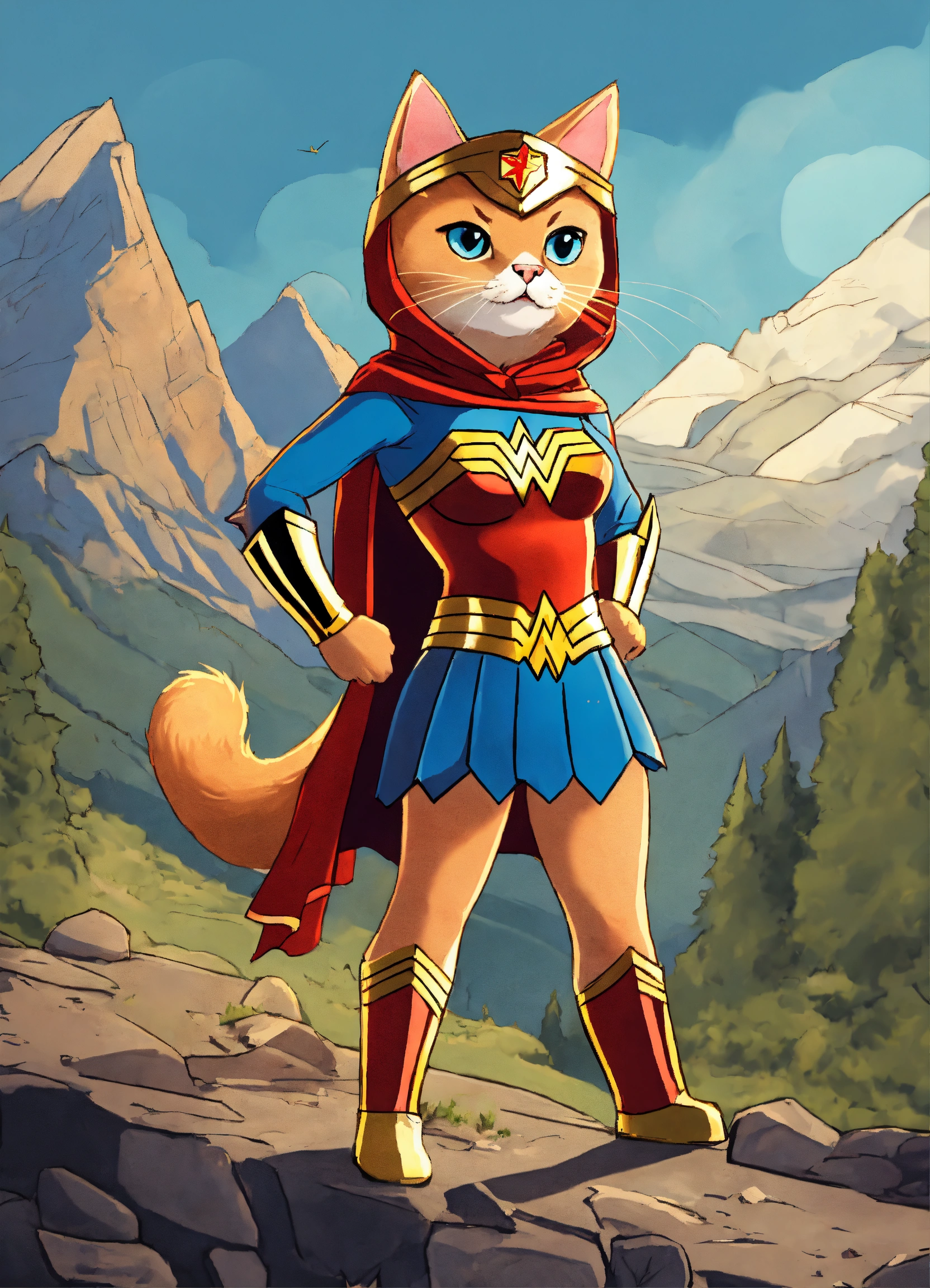 A cat wearing a wonder woman suit in the mountains fighting crime cartoonish