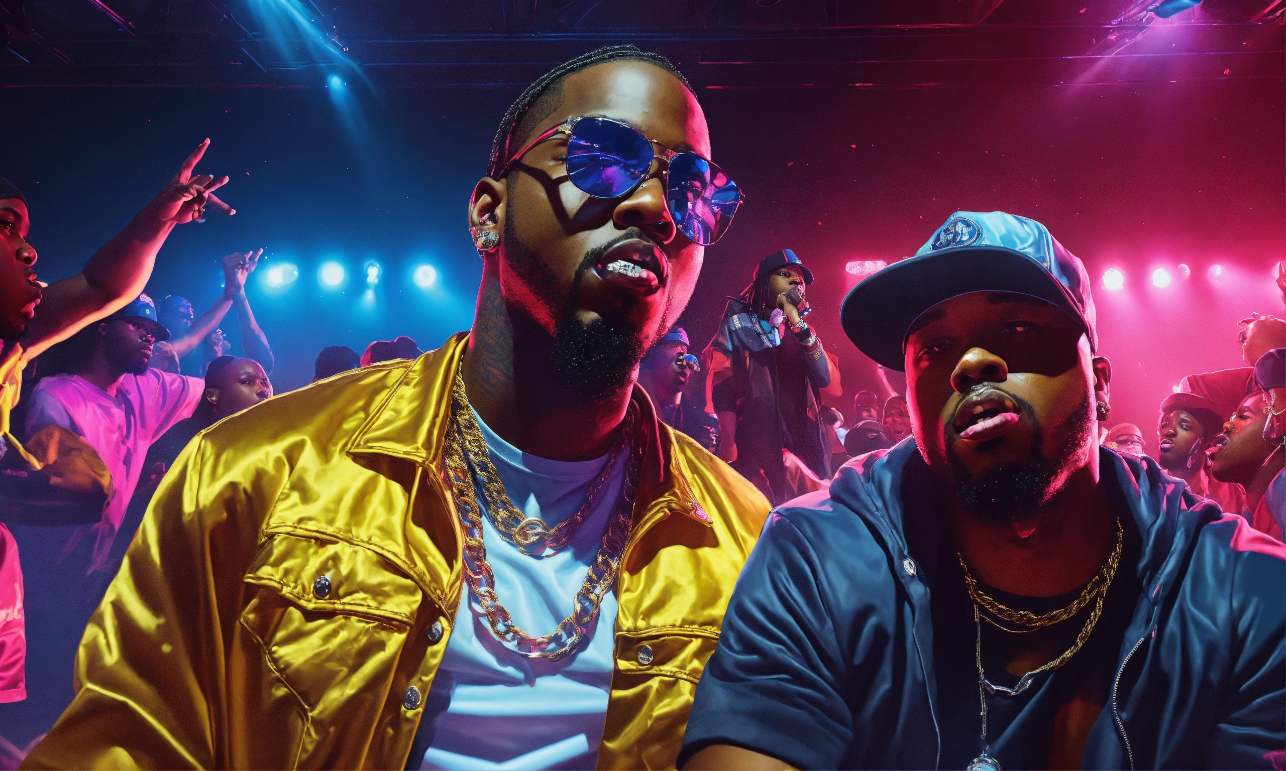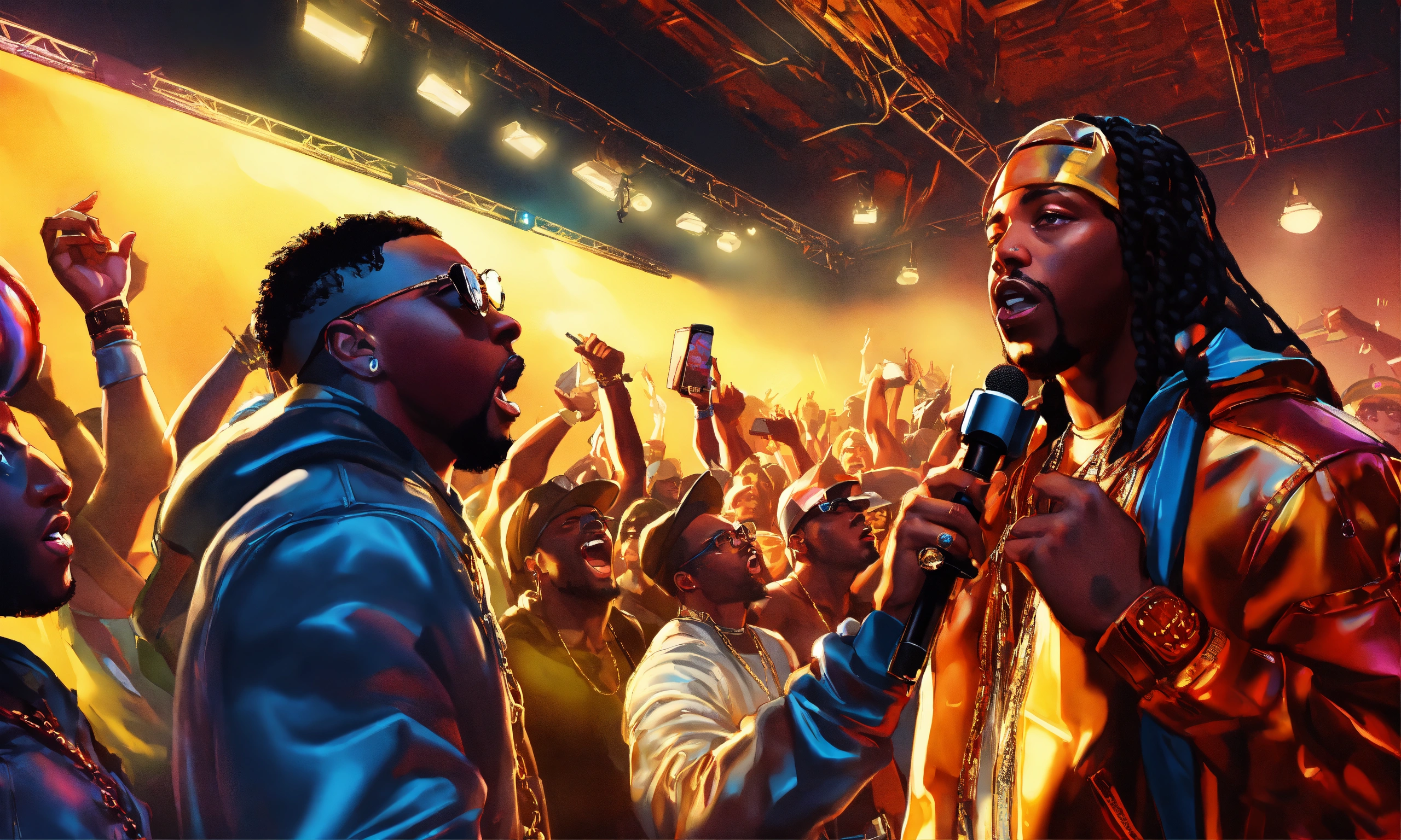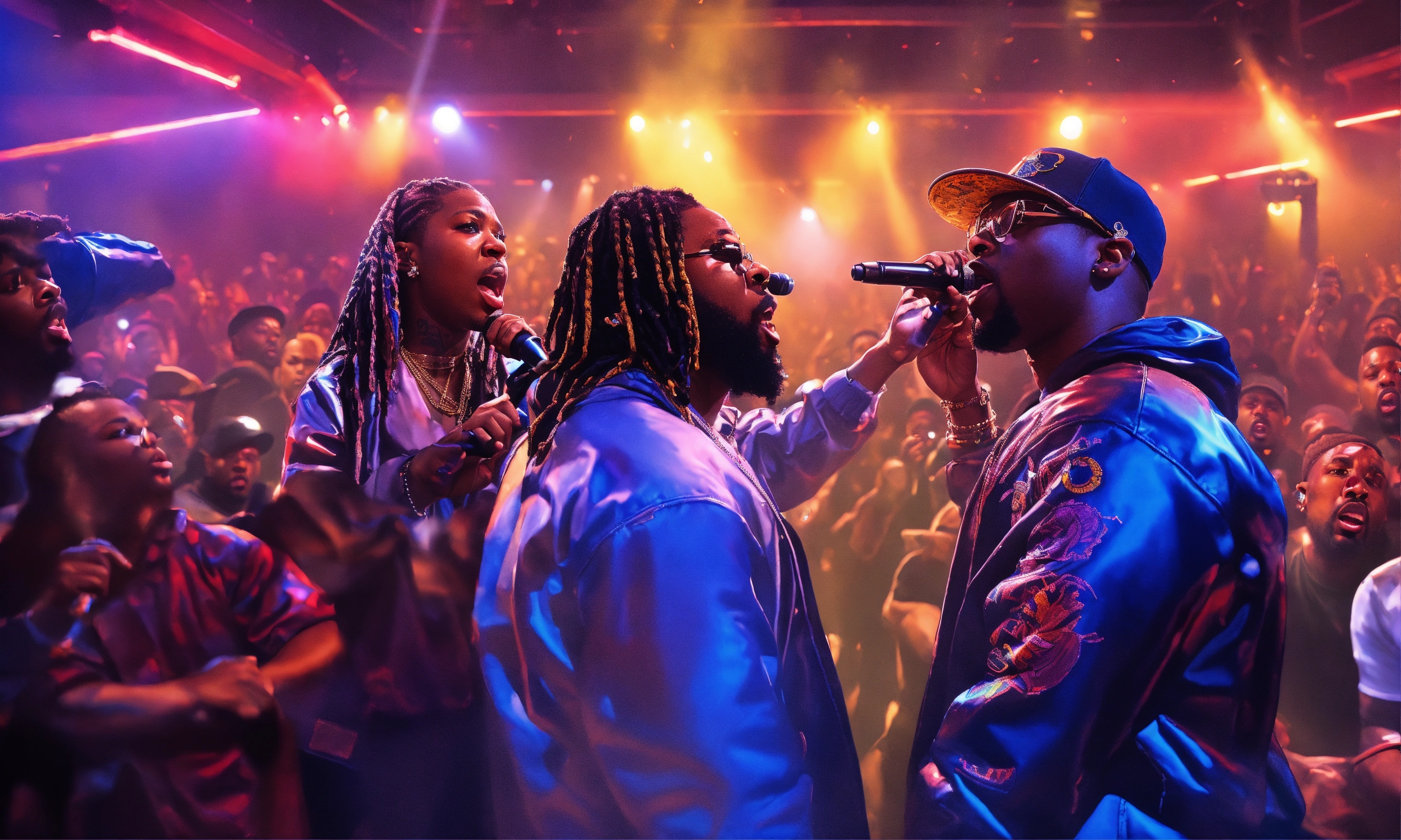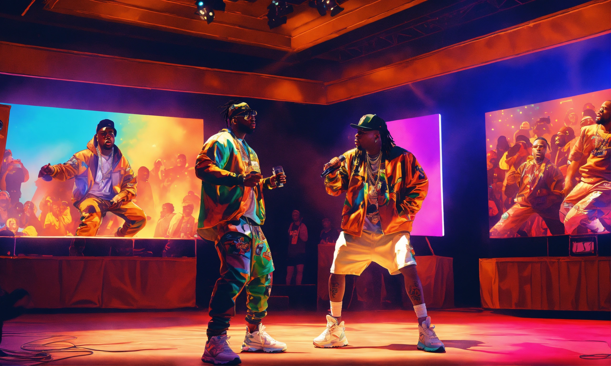 Sky view pop art, hyperrealist portrait of battle rapper "geechi gotti " vs " remy ma" in a url rap battle league battling another rapper on stage cheering in background, fancy interior fantasy art, photo realistic, dynamic lighting, art station, poster, volumetric lighting, very detailed faces, 4 k, award winning