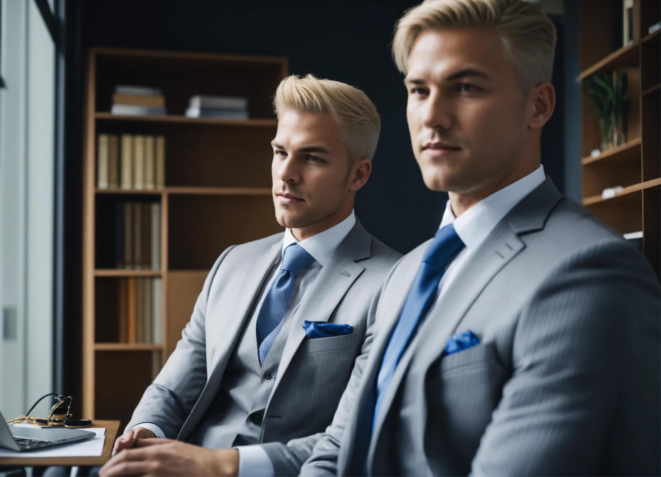 Two blonde male businessmen in light grey pinstripe vested suit