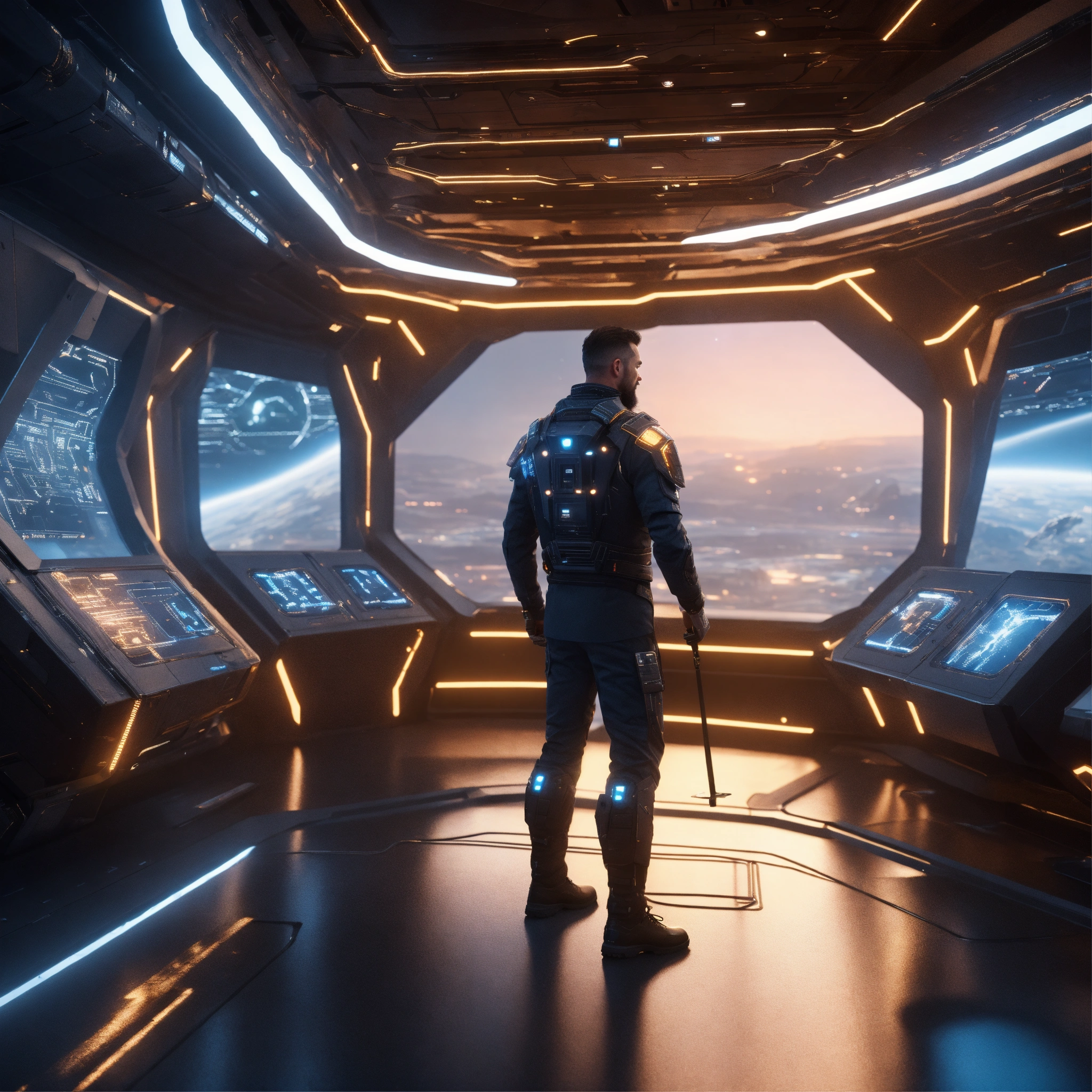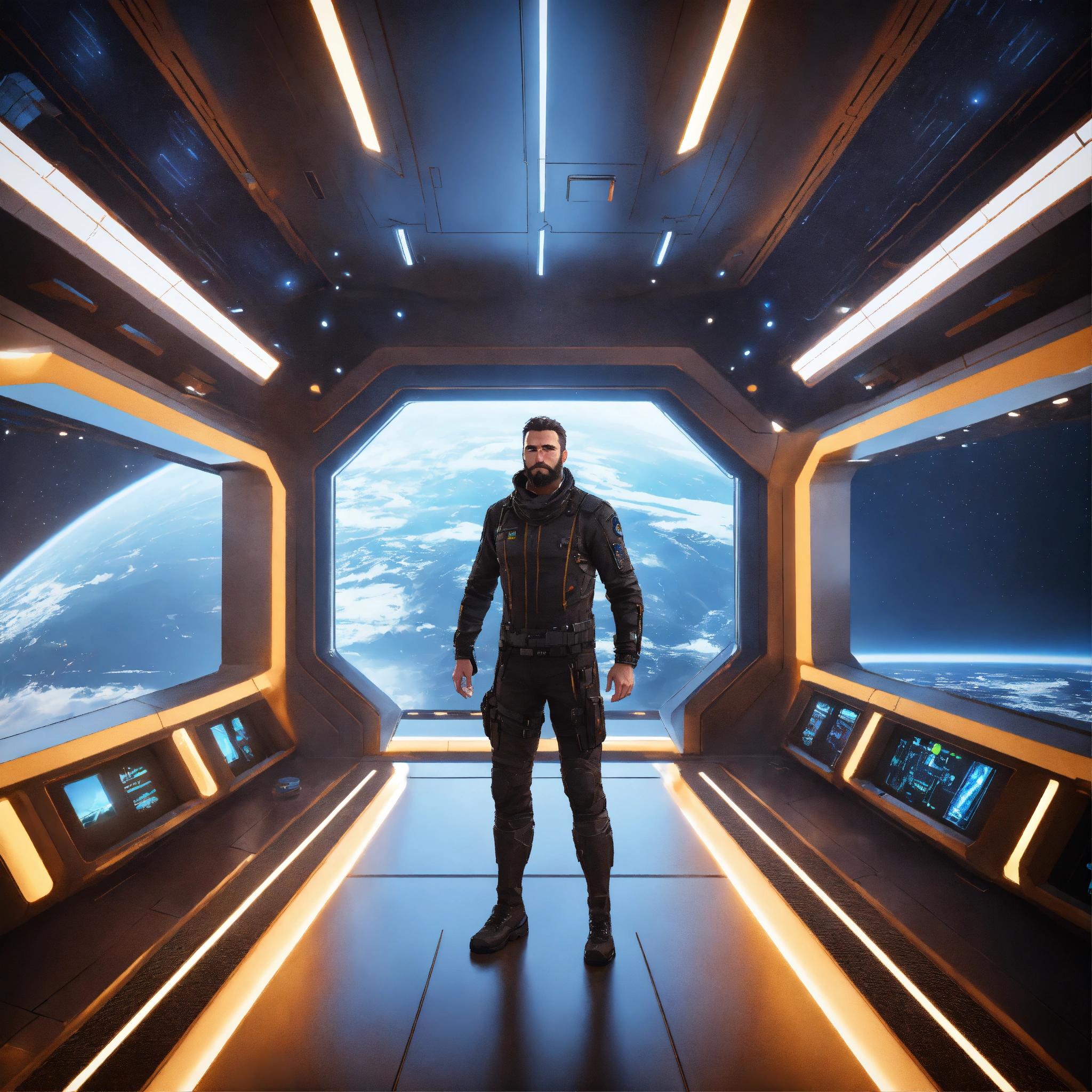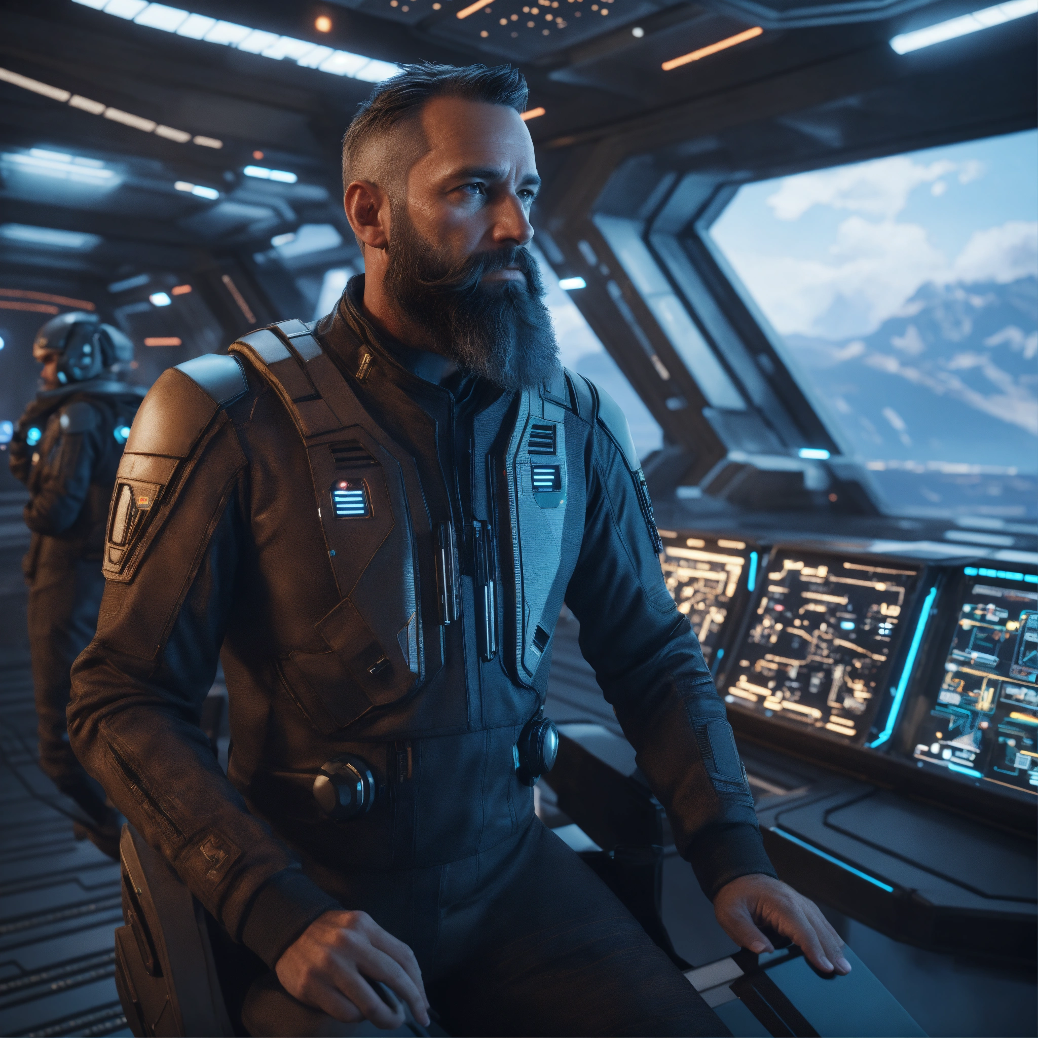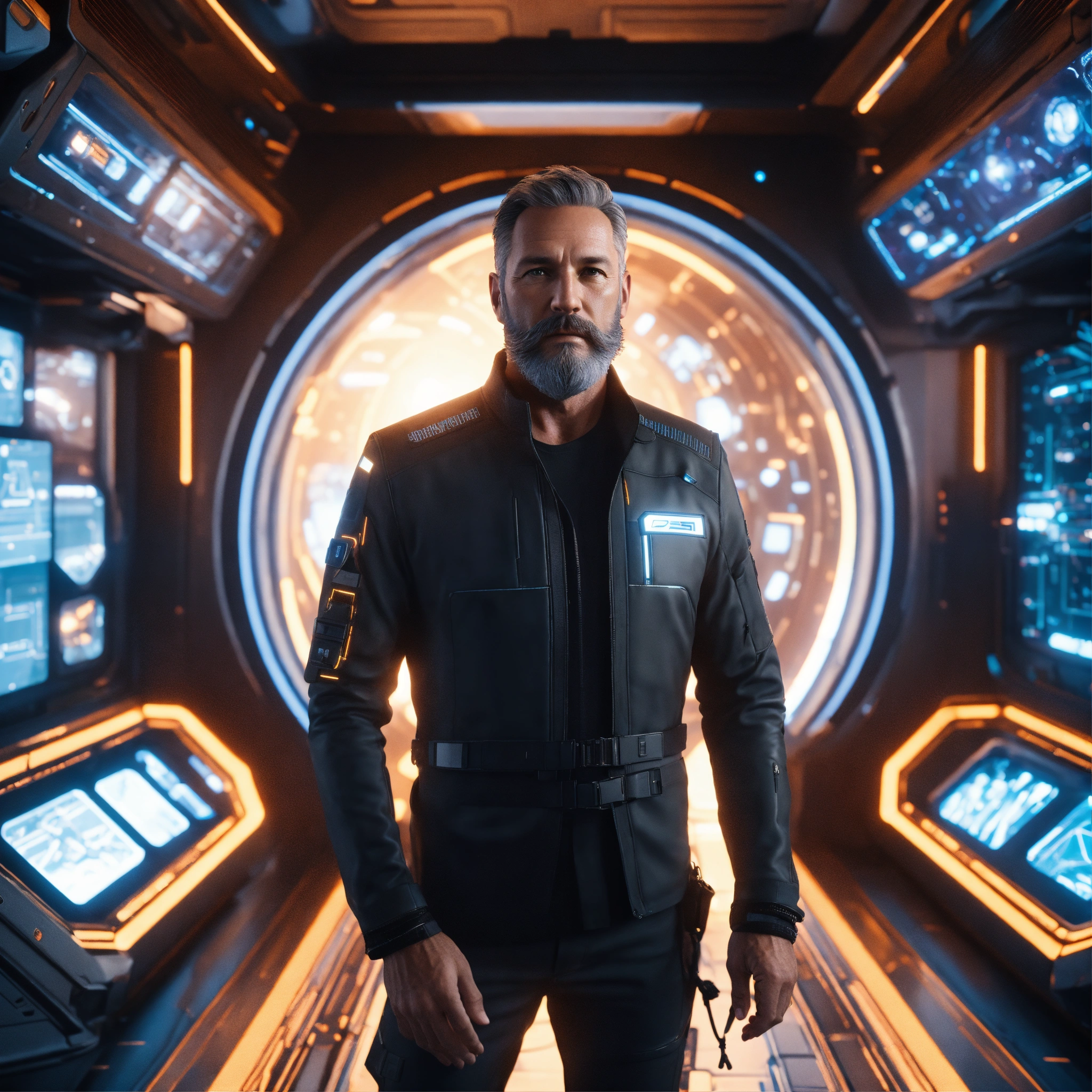 45 year old masculine man with trim beard boarding a luxurious hi tech space port, realistic, futuristic, sci-fi, 8k, unreal engine