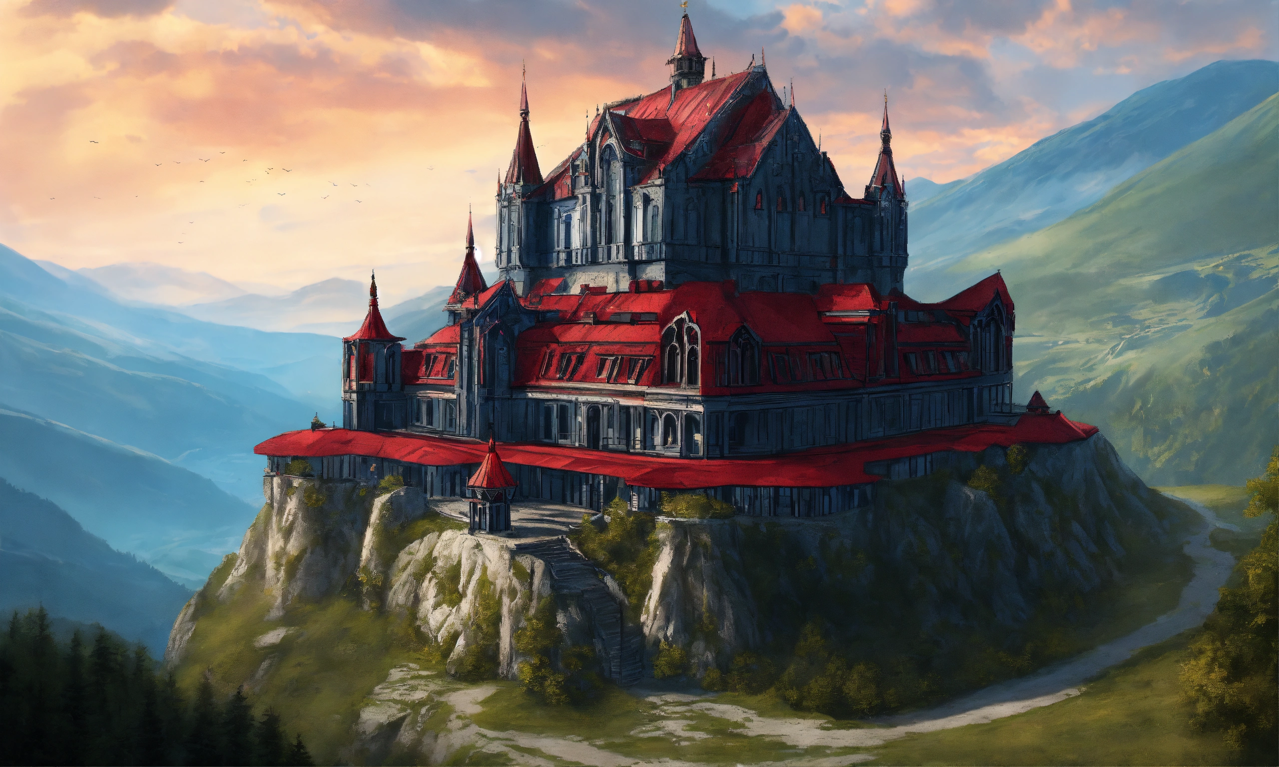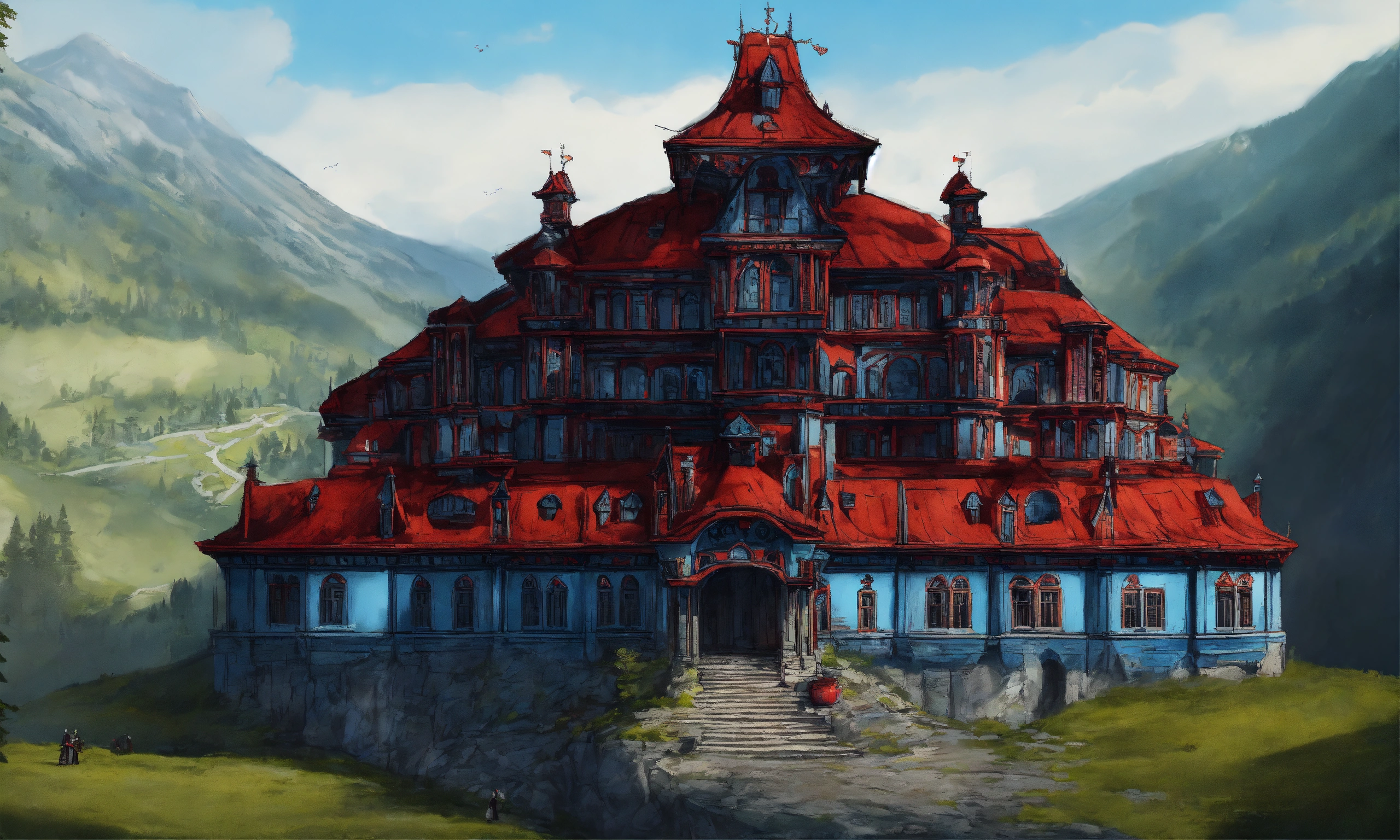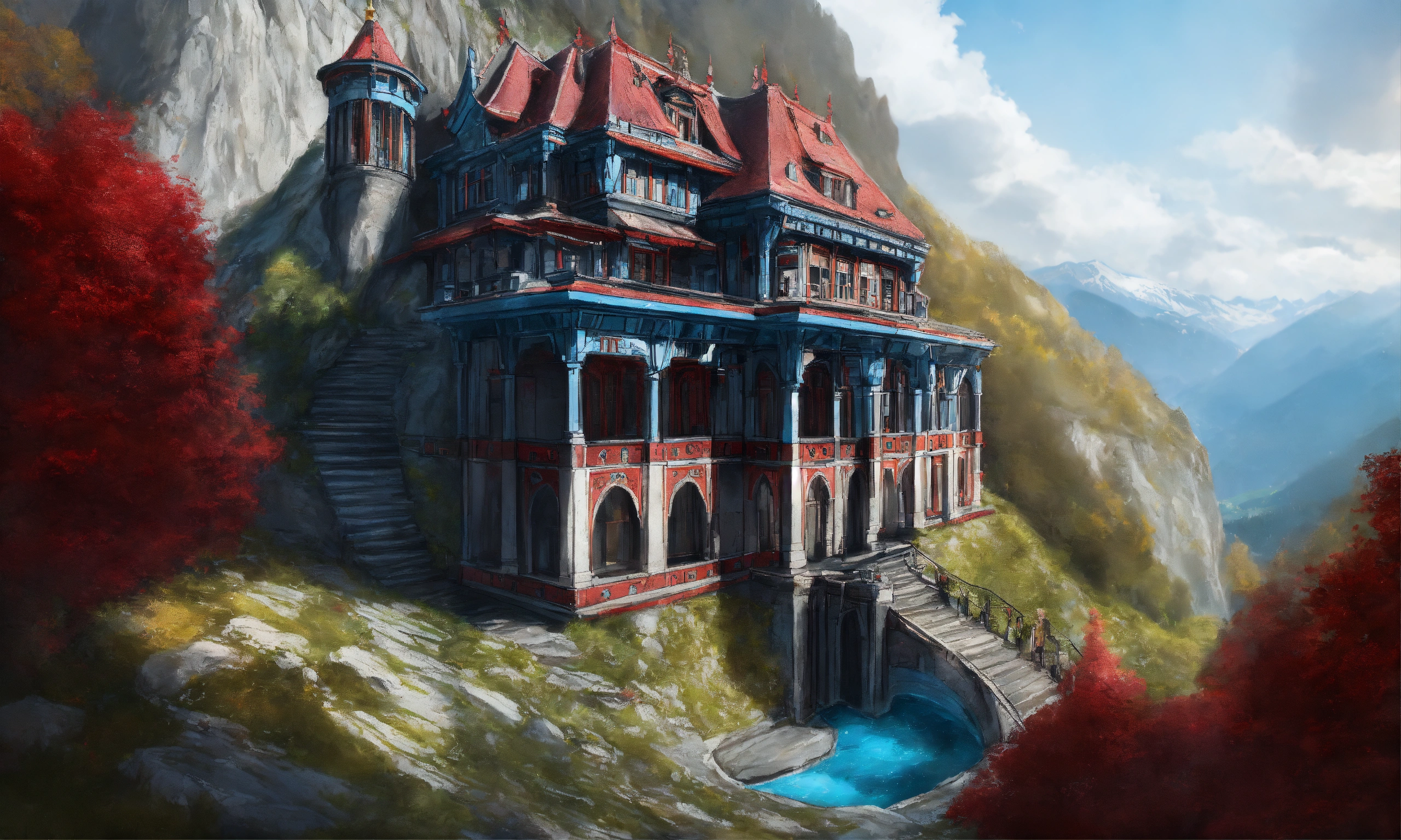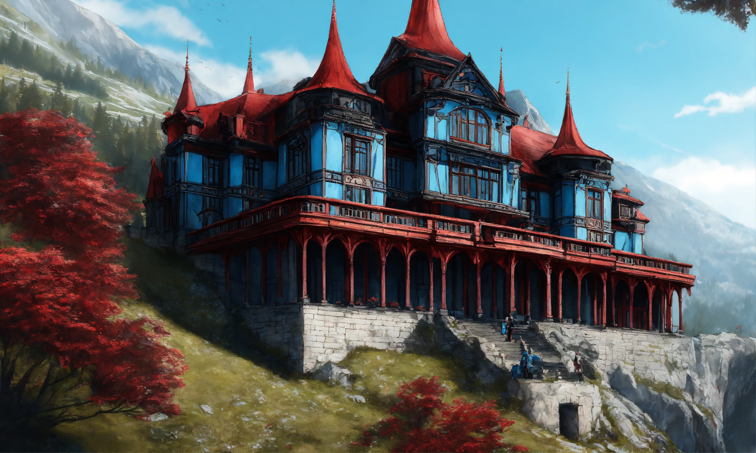 Drawing of an elegant high elf sci fi black and crimson and light blue palace built into a mountainside in romania, elf architecture, beautiful day, immensely detailed, high definition