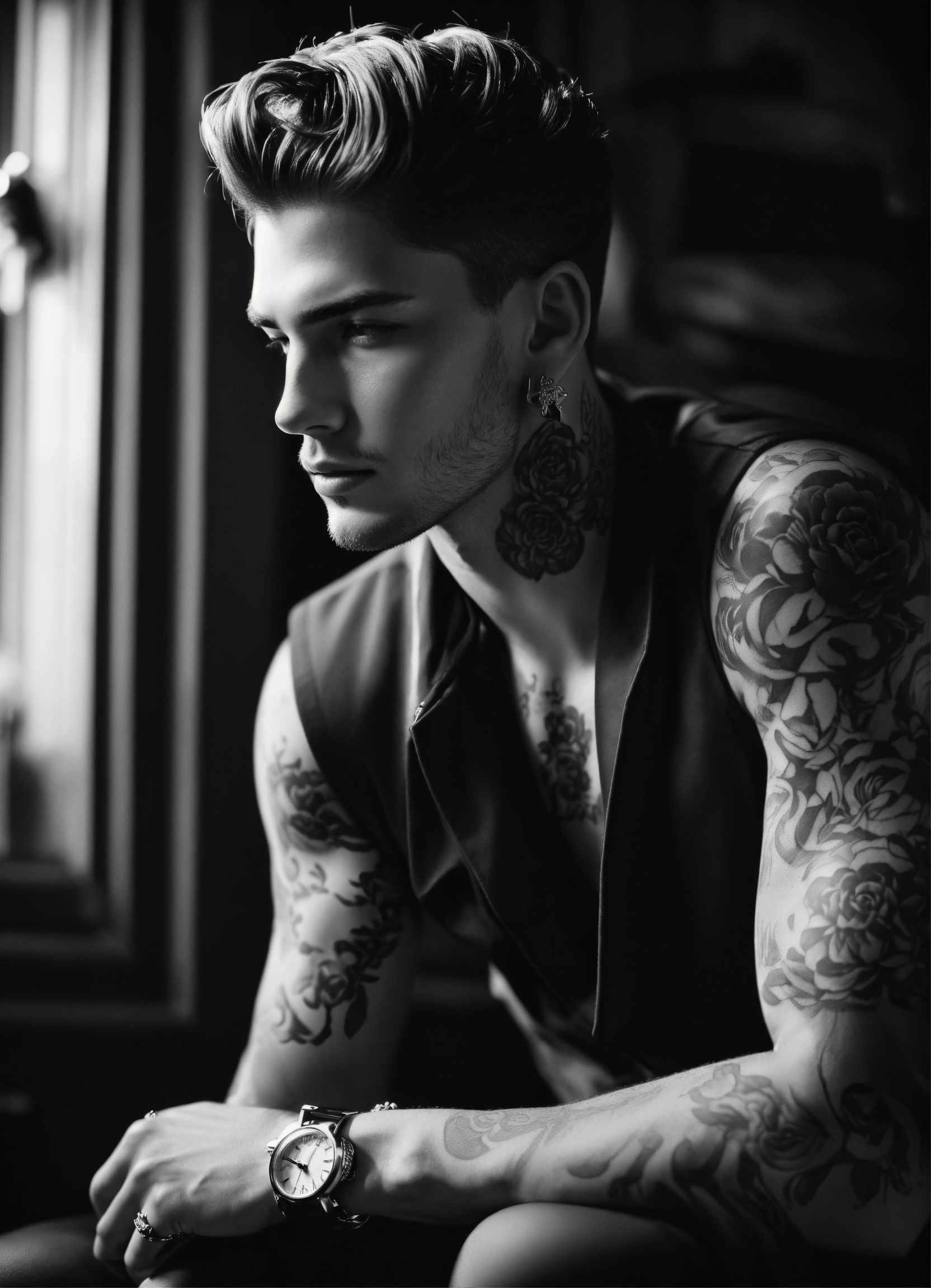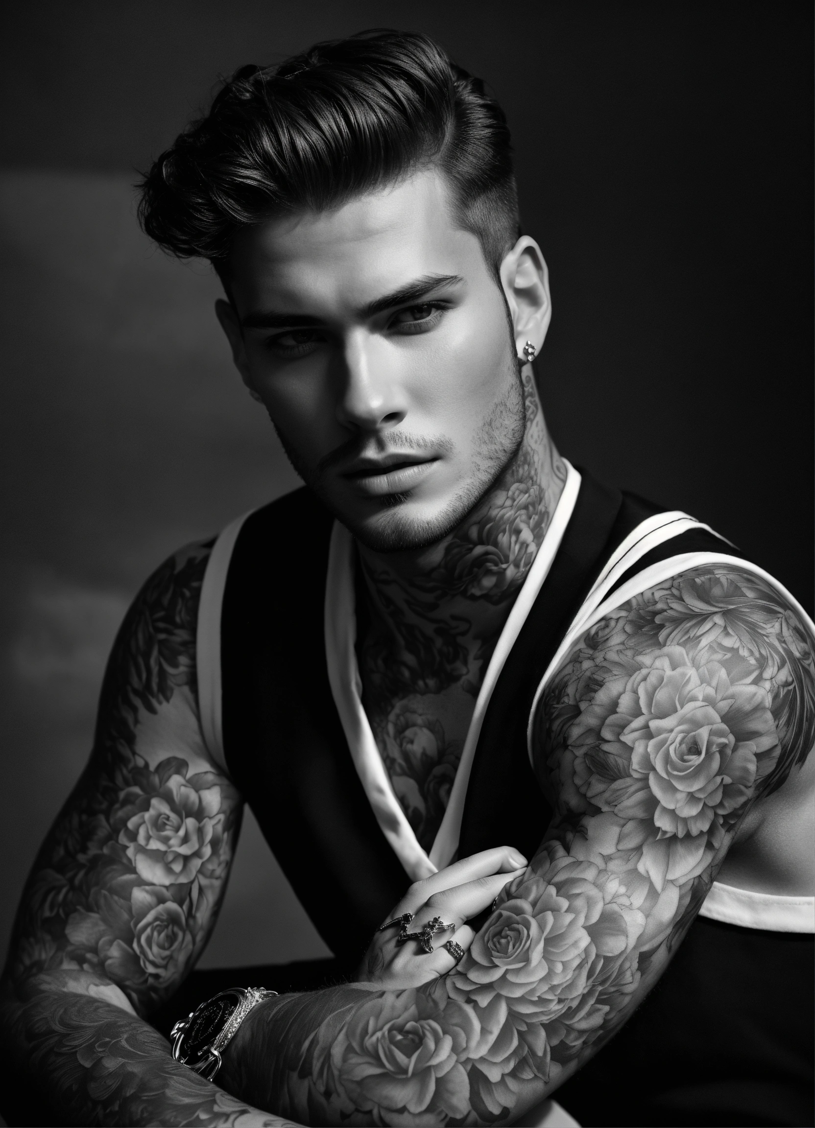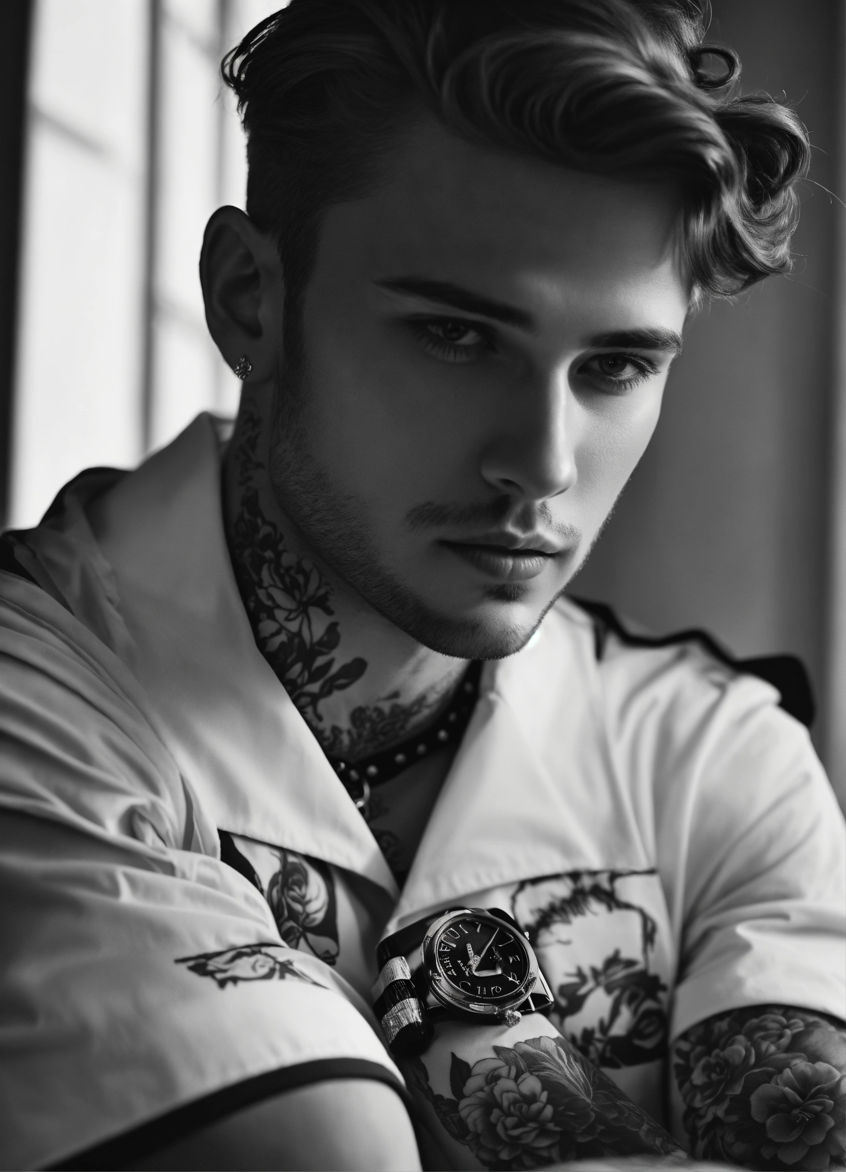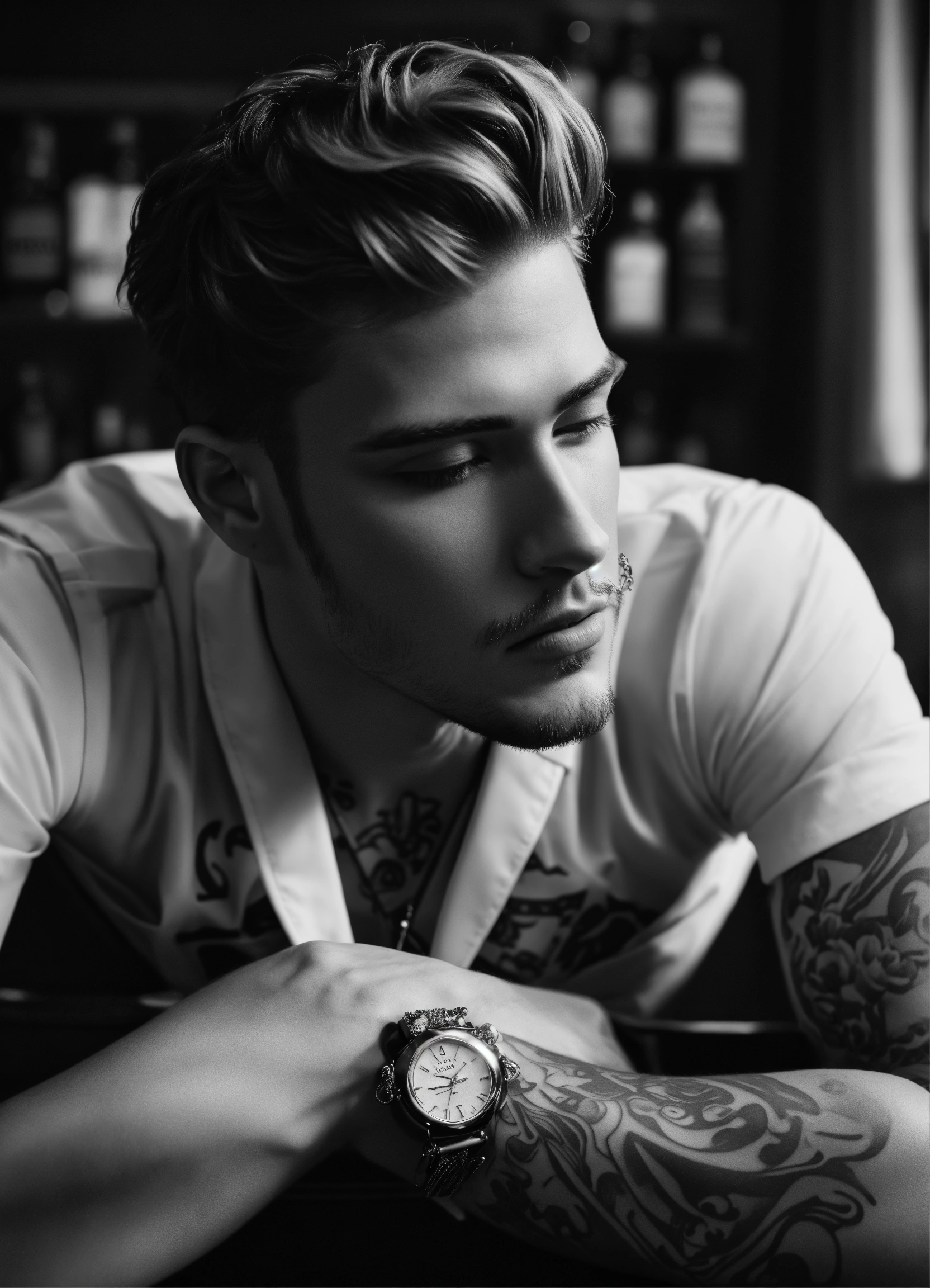 Prada inspired, fashionist, blackandwhite photography, handsome young sailor, tatooed, parfume commercial
